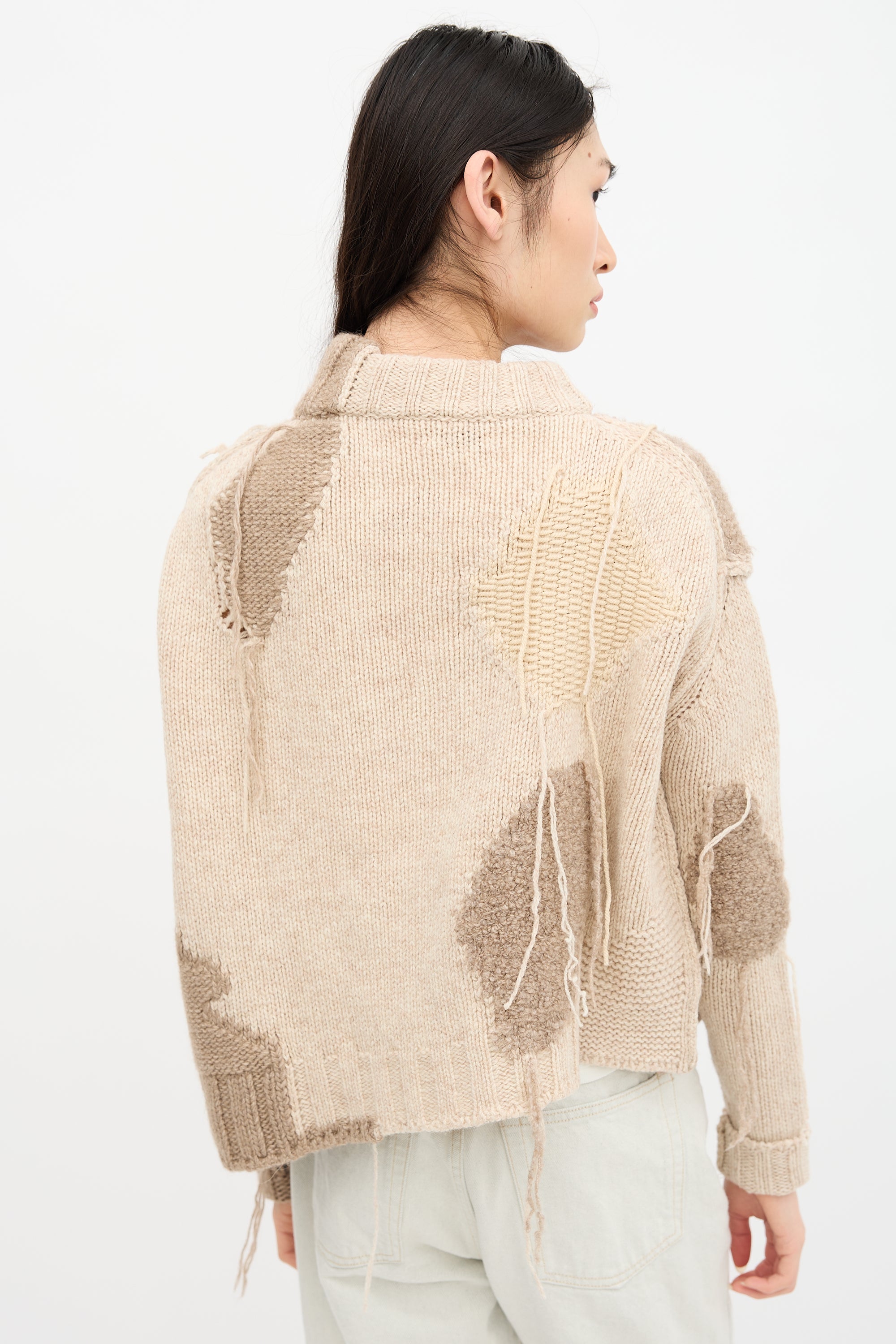 Pre-owned Acne Studios Fall 2017 brown oversized wool blend Ovira Patch sweater featuring asymmetrical mock neckline and hem, tonal patchwork intarsia, and intentional distressing.