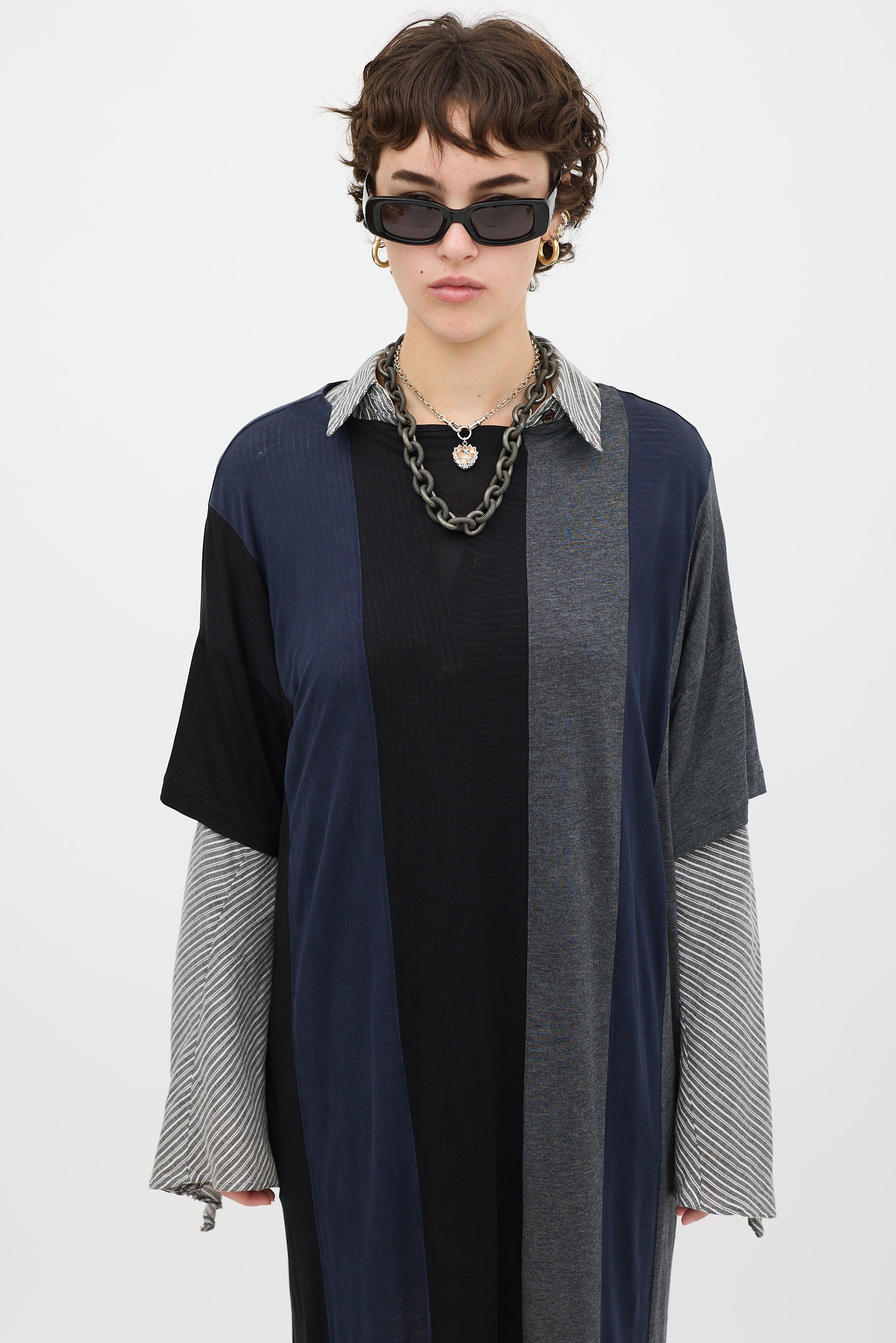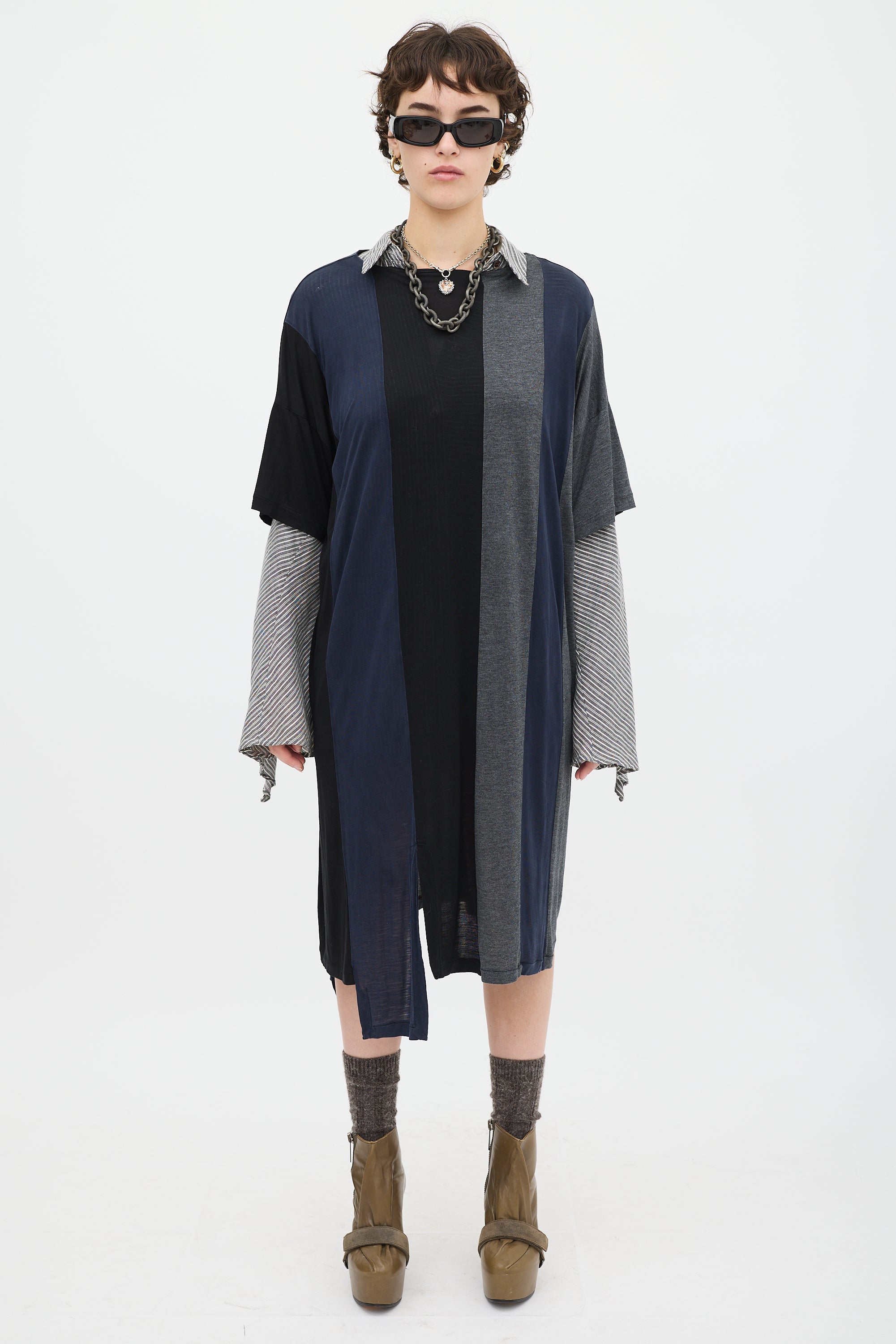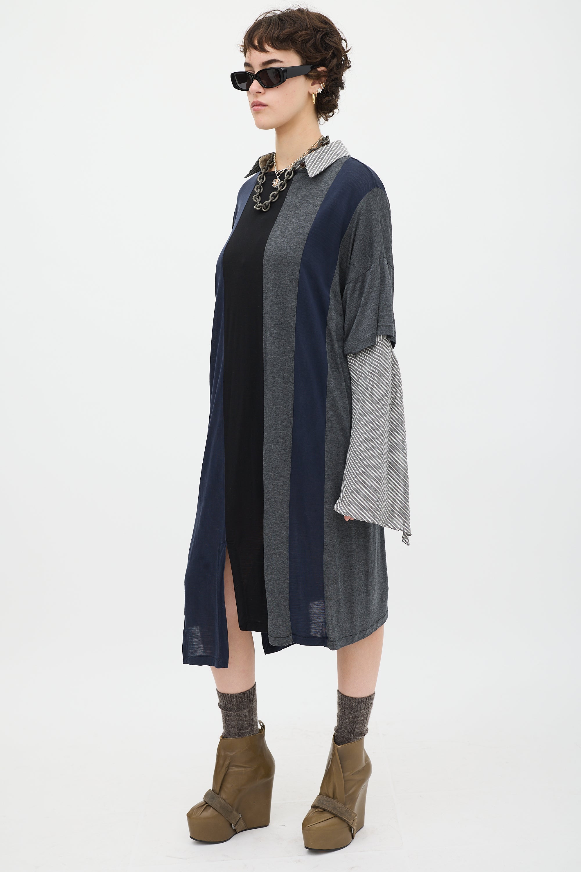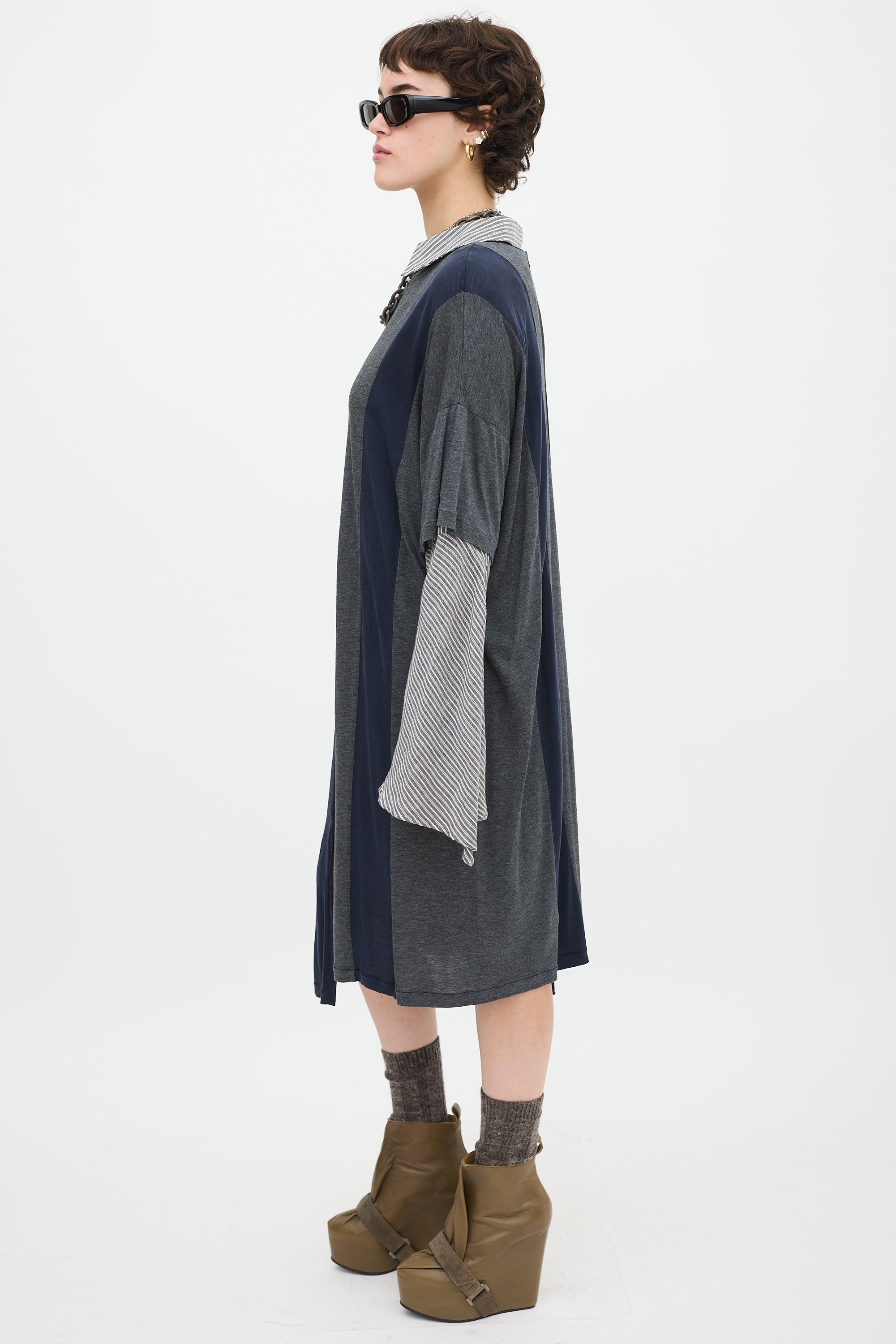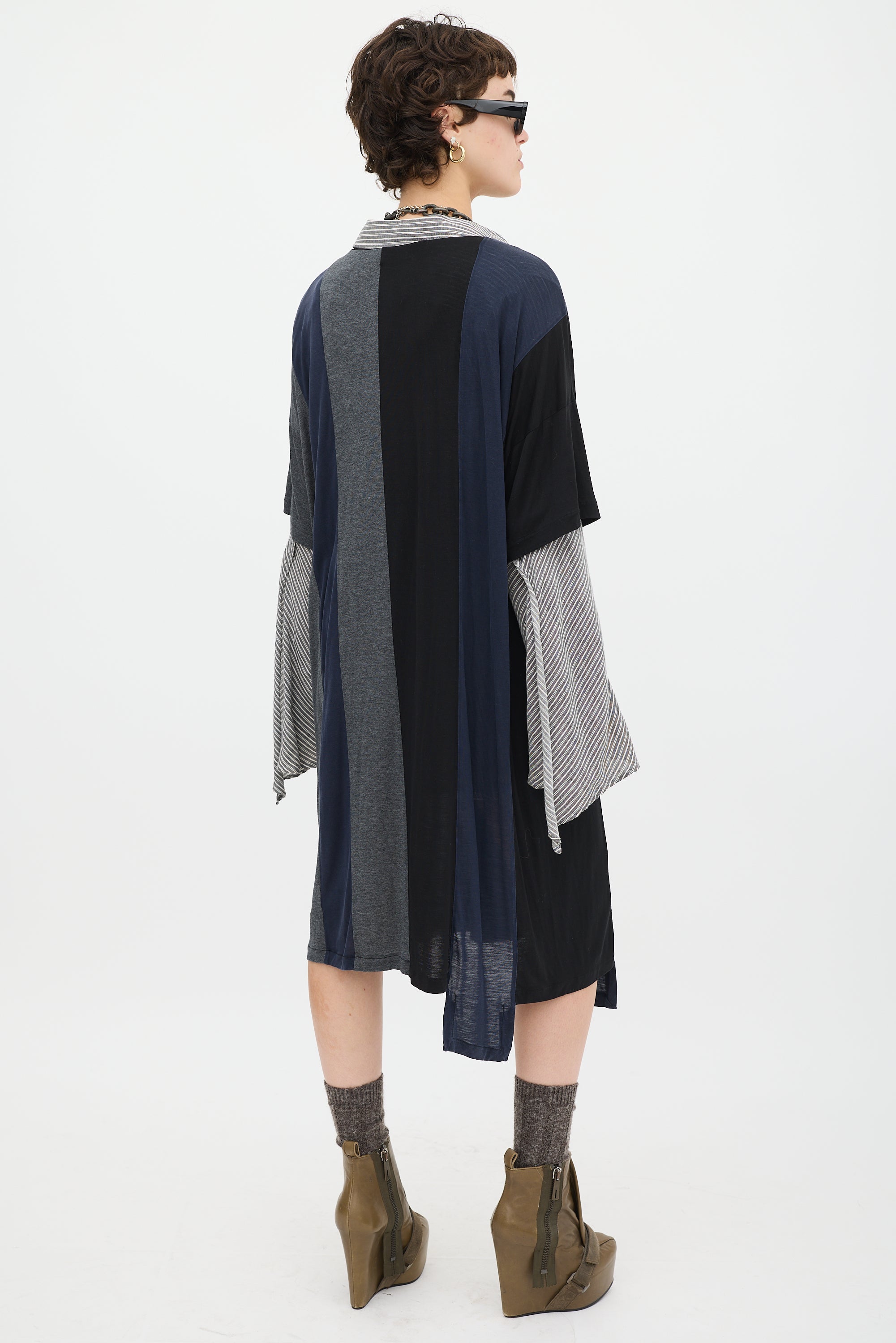 Pre-owned Acne Studios navy, black, and dark grey Fiya Panel midi T-shirt dress featuring a bateau neckline, dropped shoulders, short sleeves, loose fit, front slit, and uneven hem.