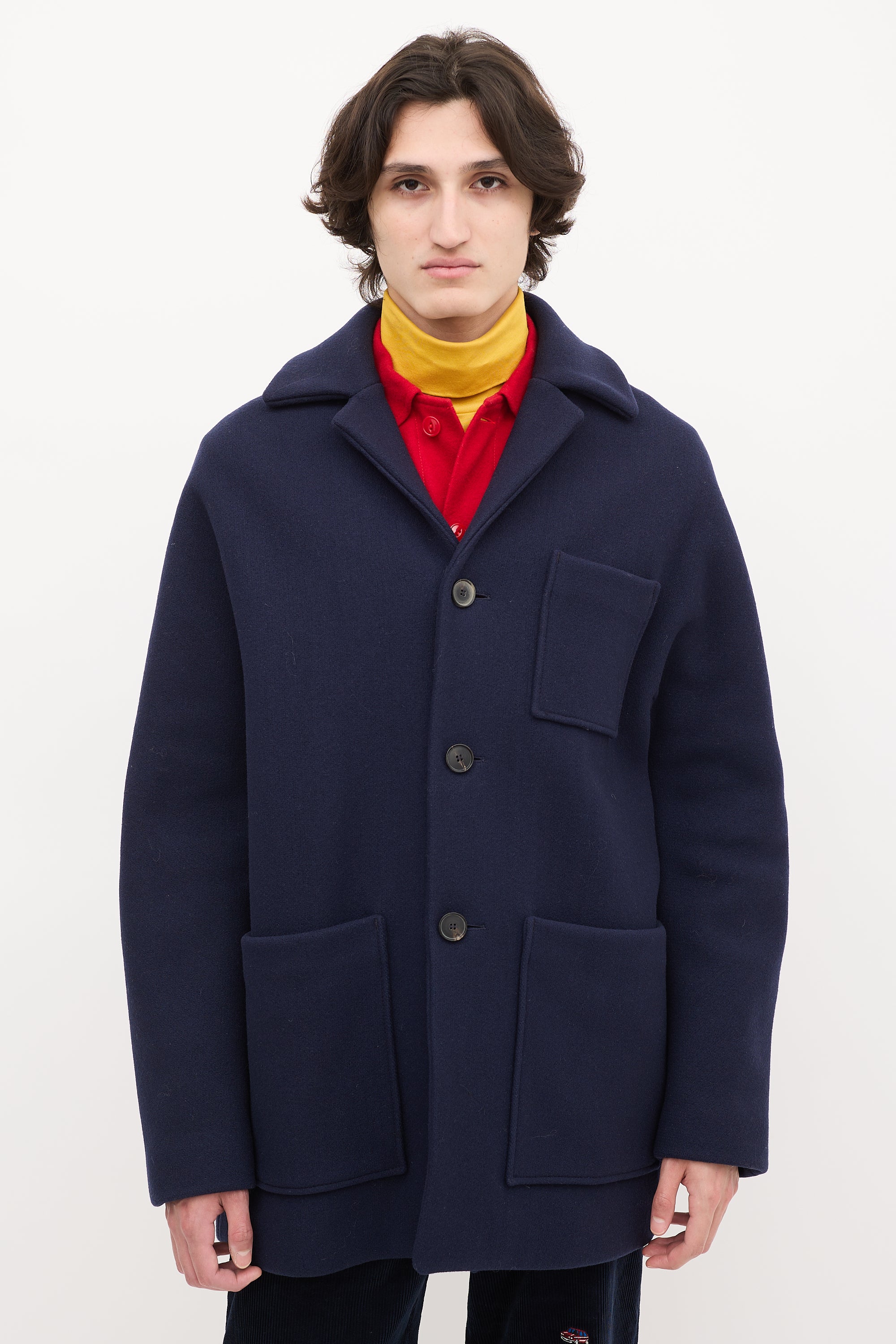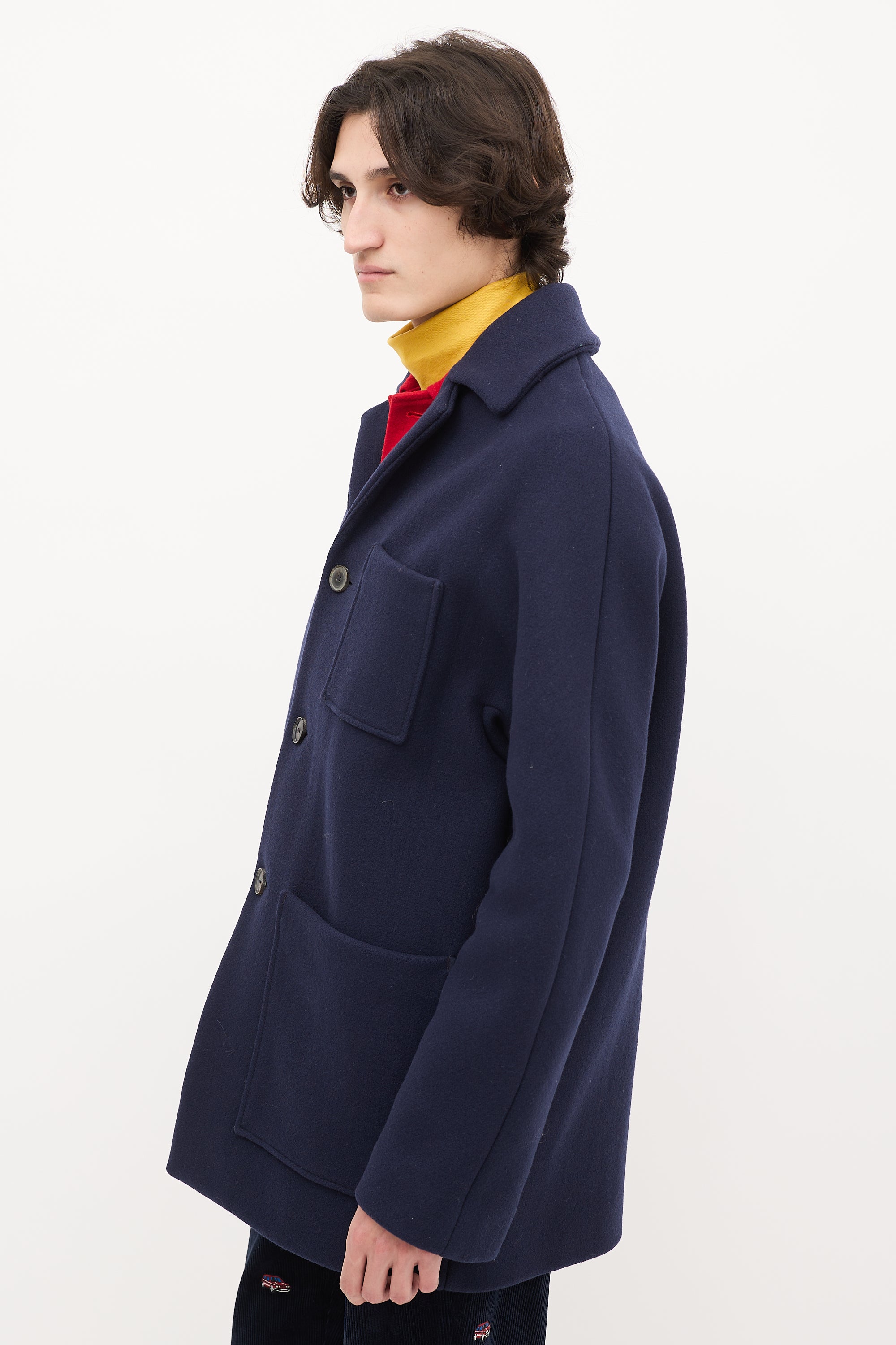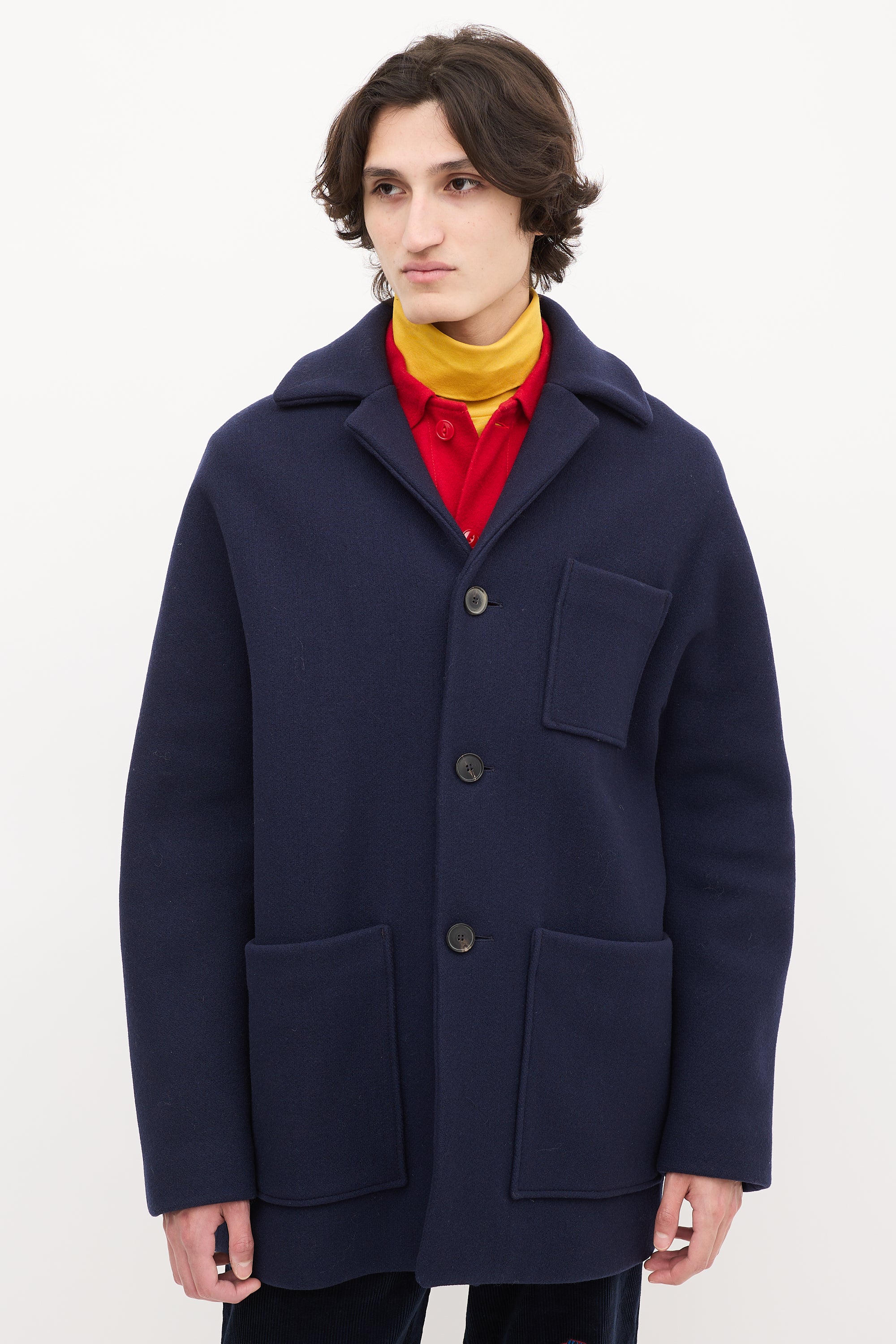 Pre-owned Acne Studios navy wool and nylon blend mid length coat featuring a notched collar, button up front closure, three front pockets, and one interior pocket. Unlined.