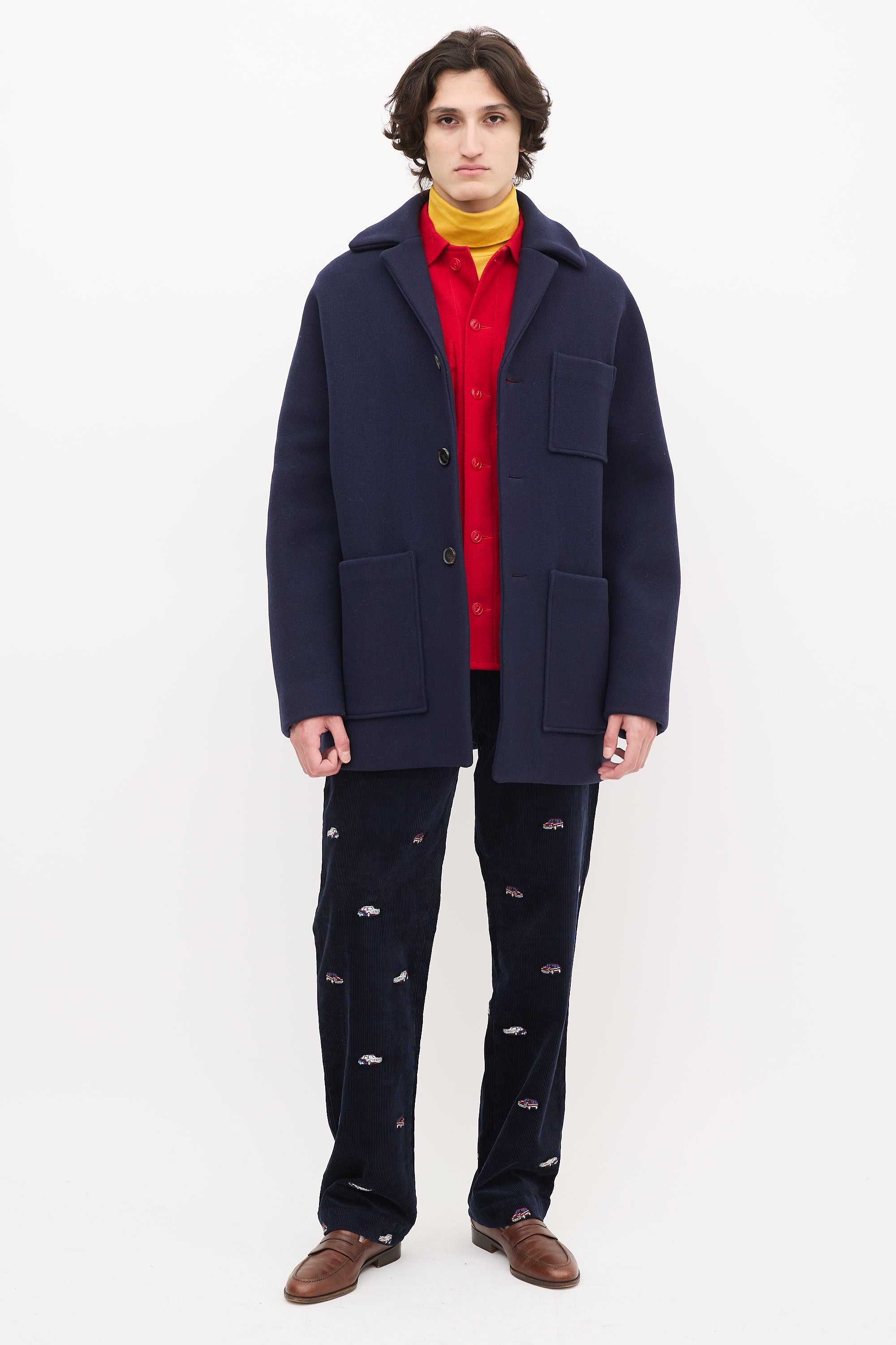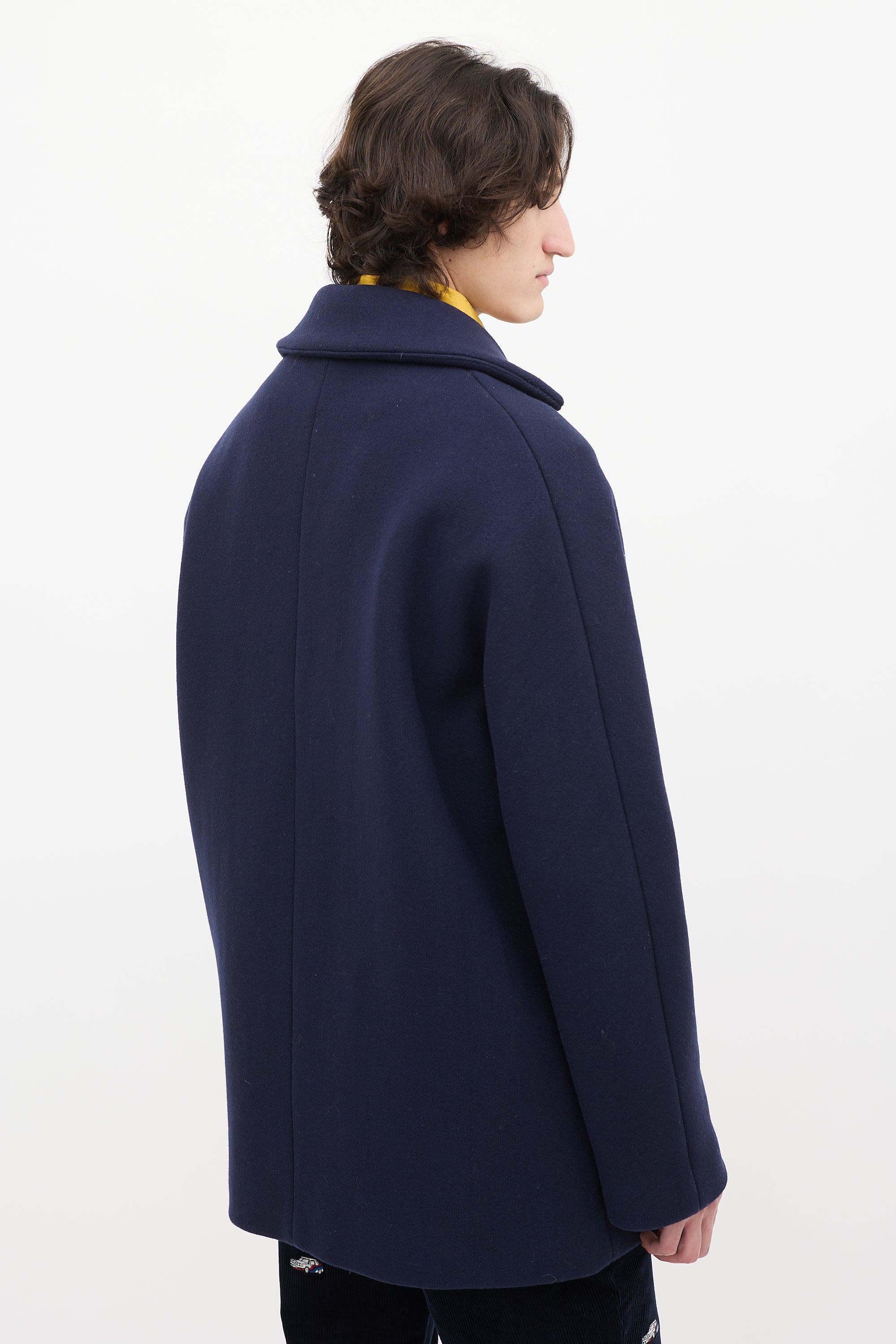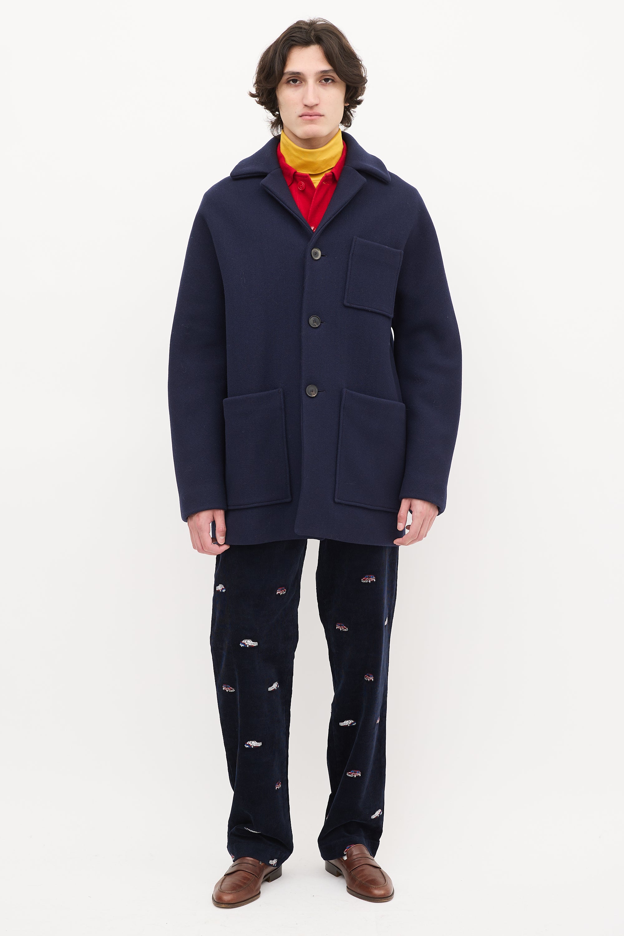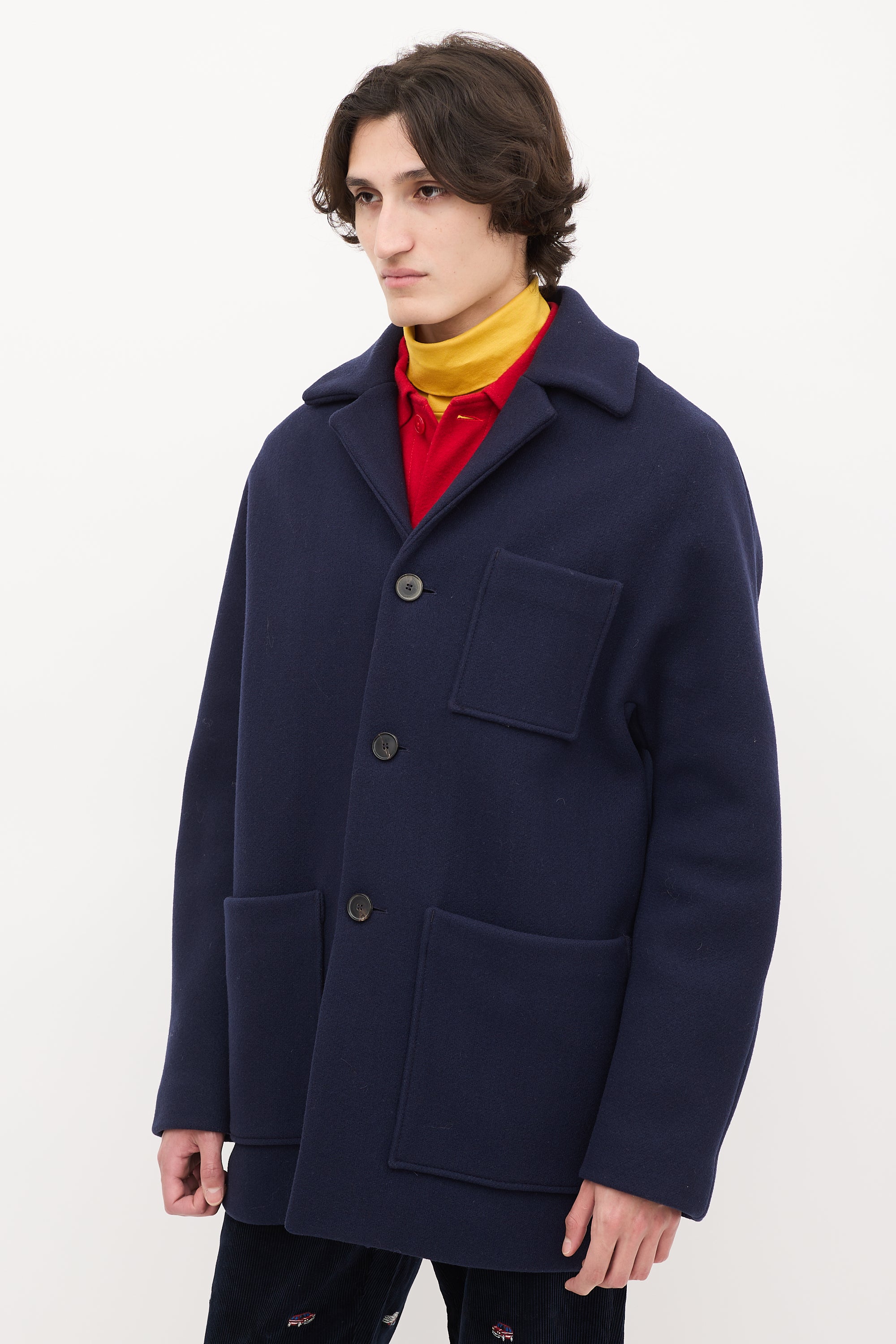 Pre-owned Acne Studios navy wool and nylon blend mid length coat featuring a notched collar, button up front closure, three front pockets, and one interior pocket. Unlined.