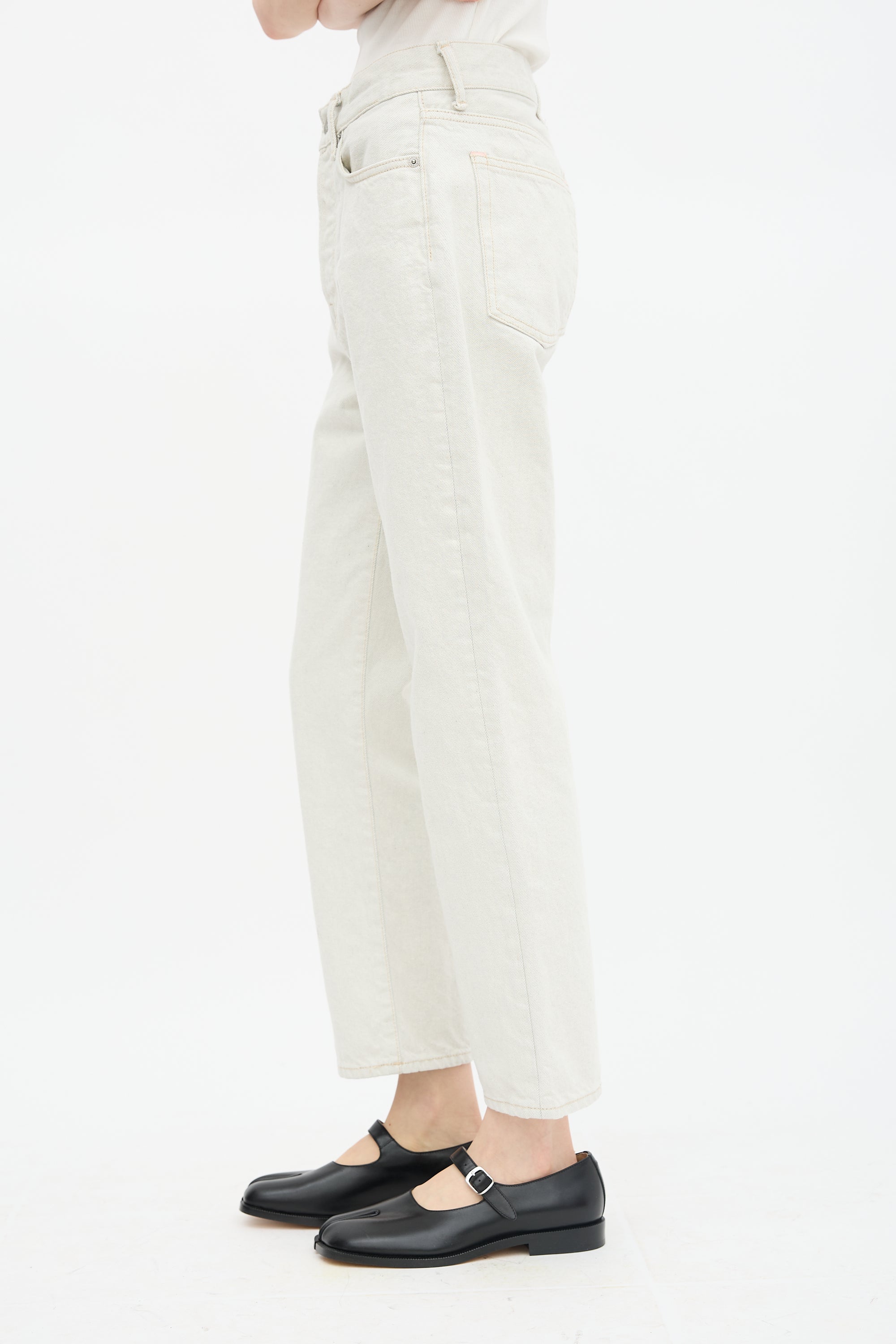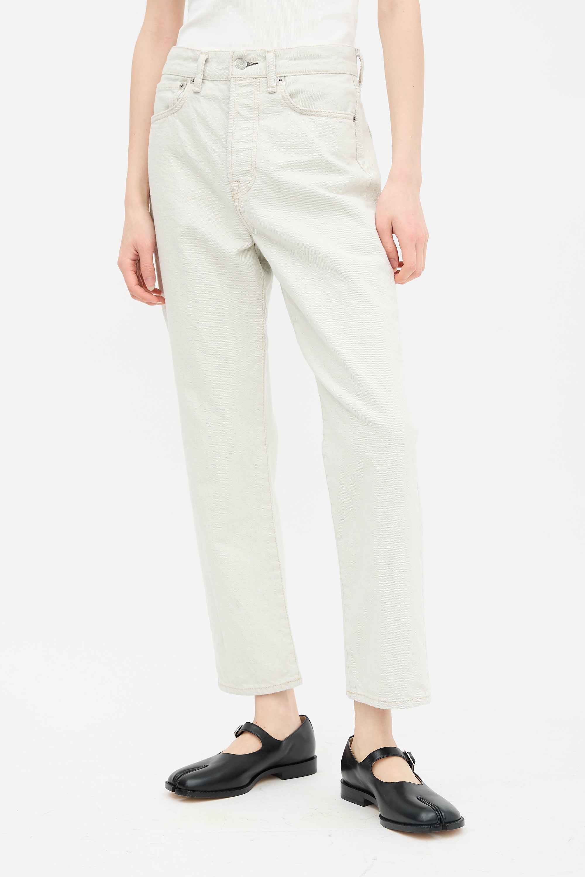 Pre-owned Acne Studios white jeans featuring high rise, button fly, five pocket styling, pink Jacron, and straight leg.