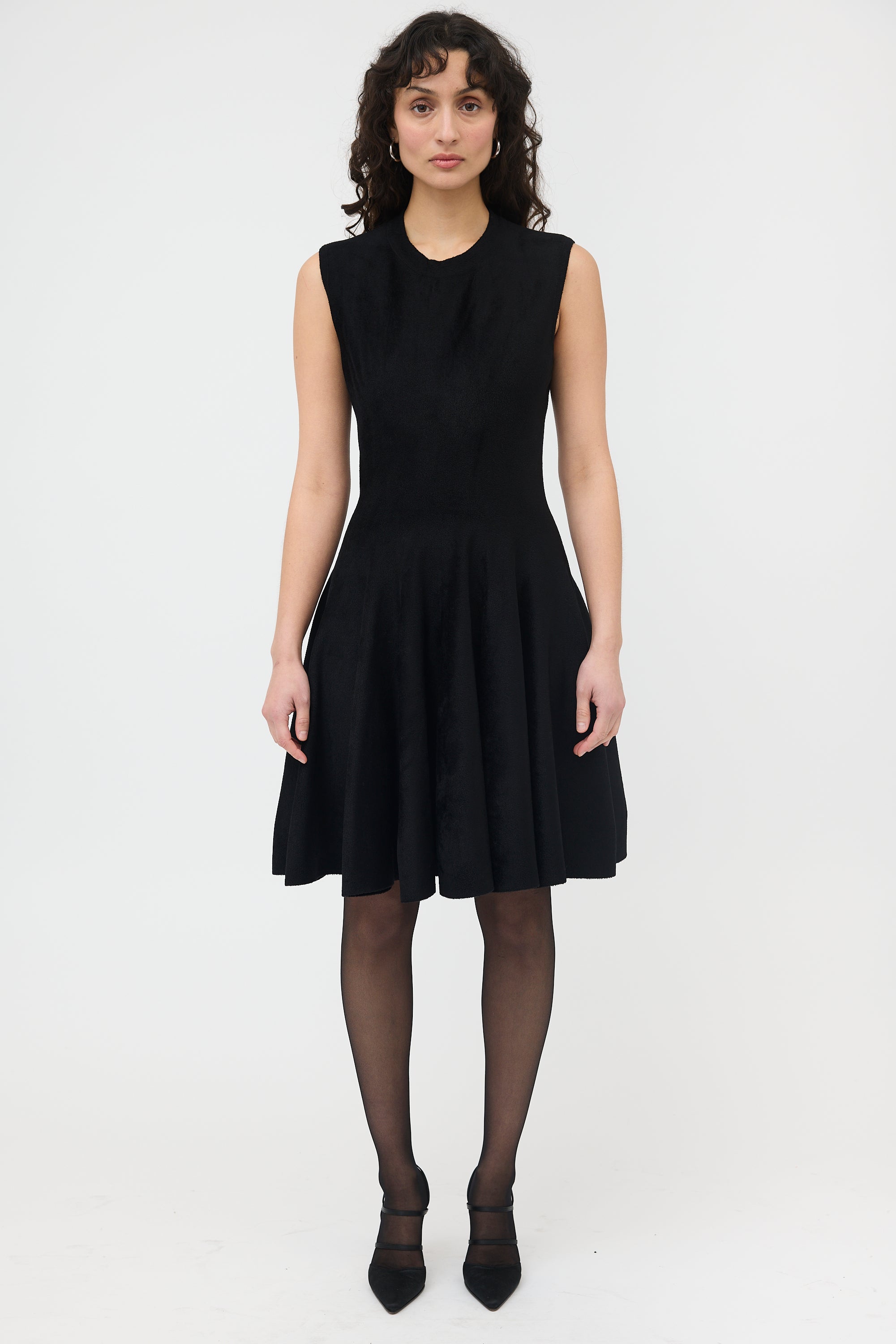 Pre-owned Alaïa black chenille dress featuring a crew neckline, concealed back zip, and flounce skirt.