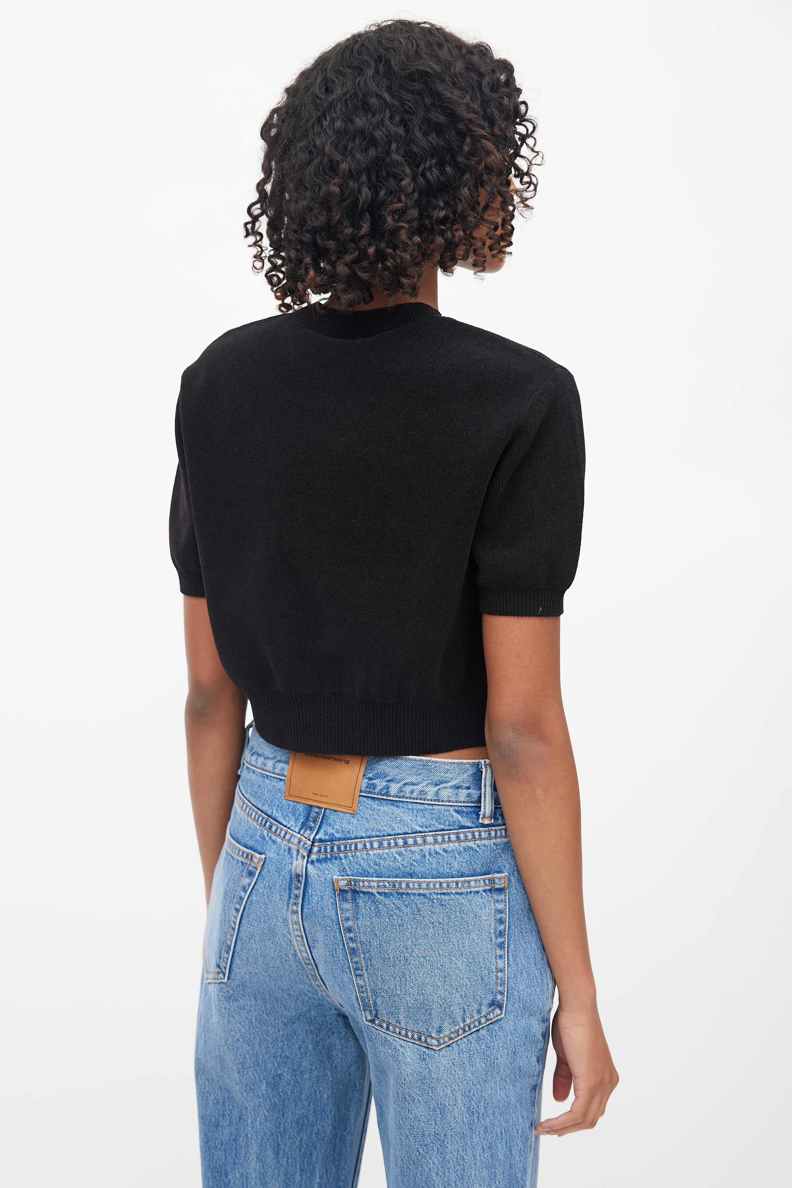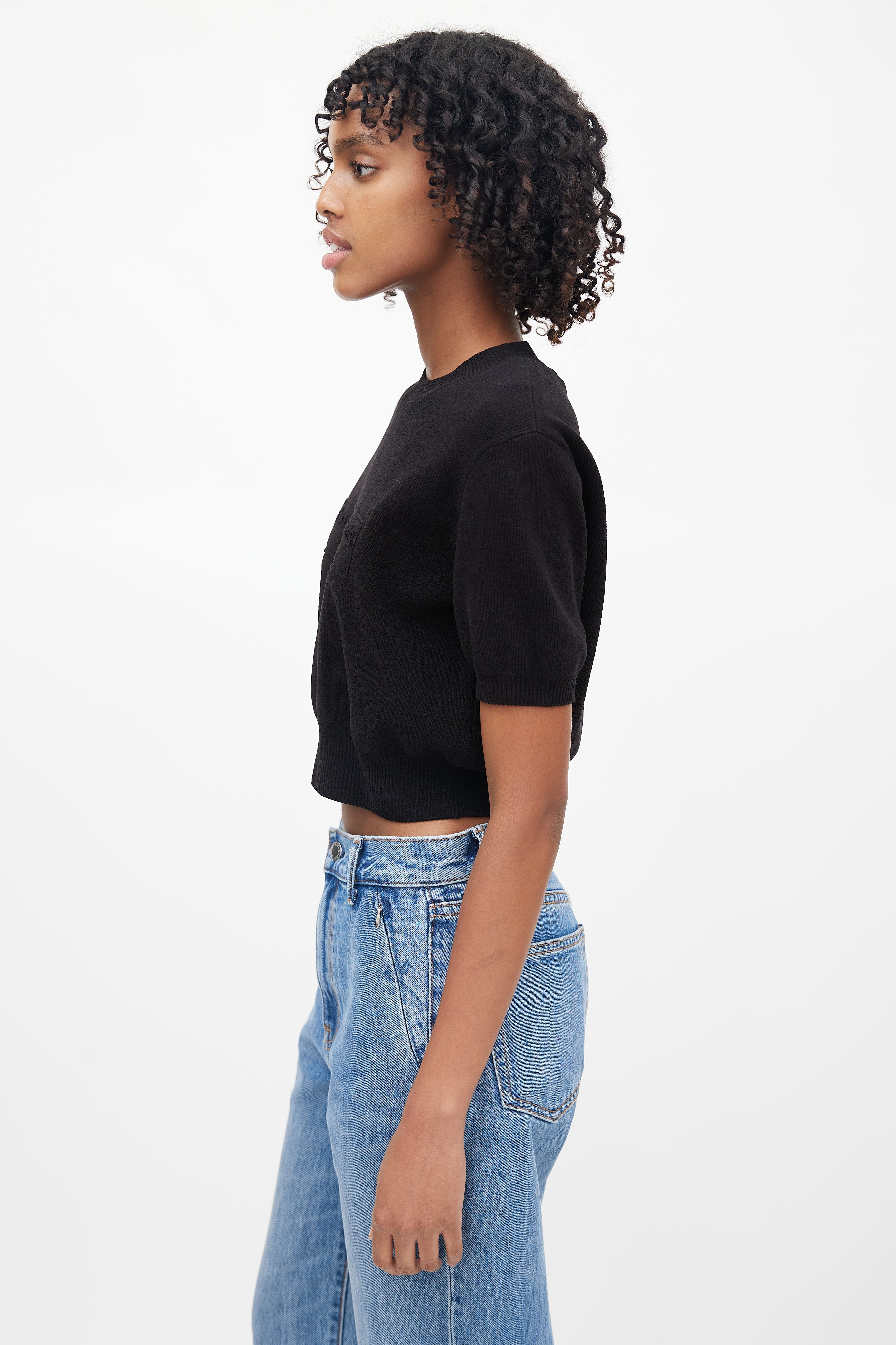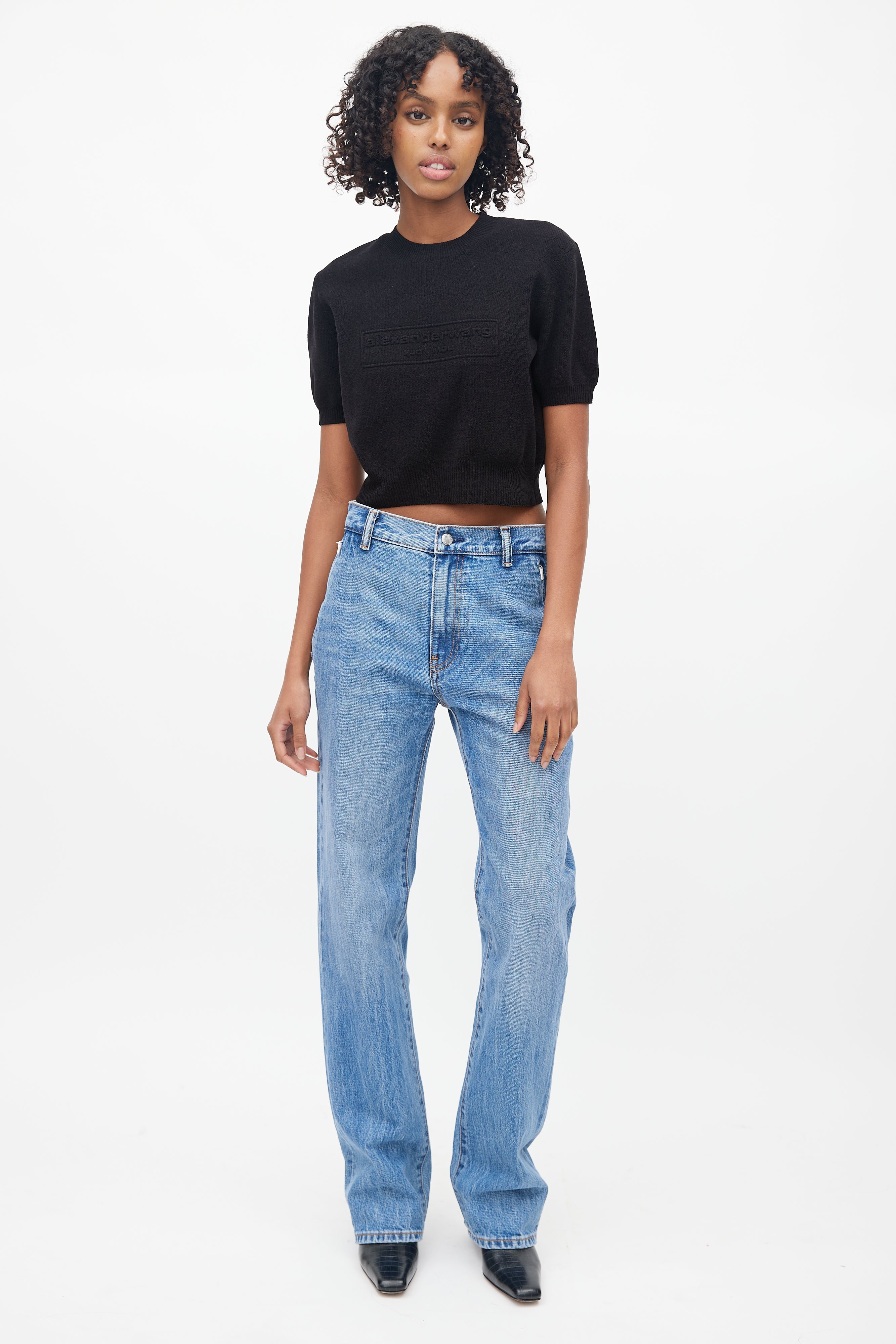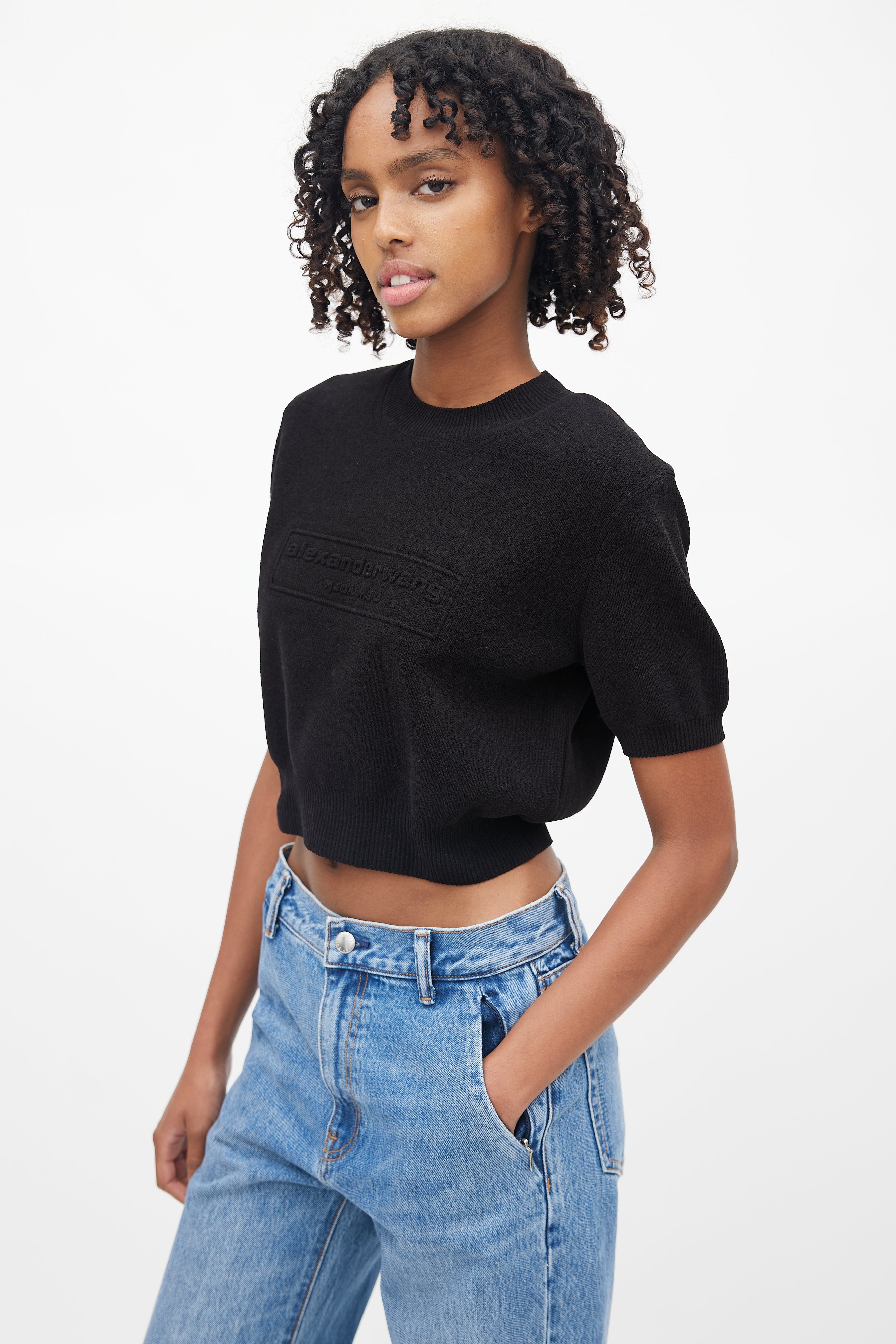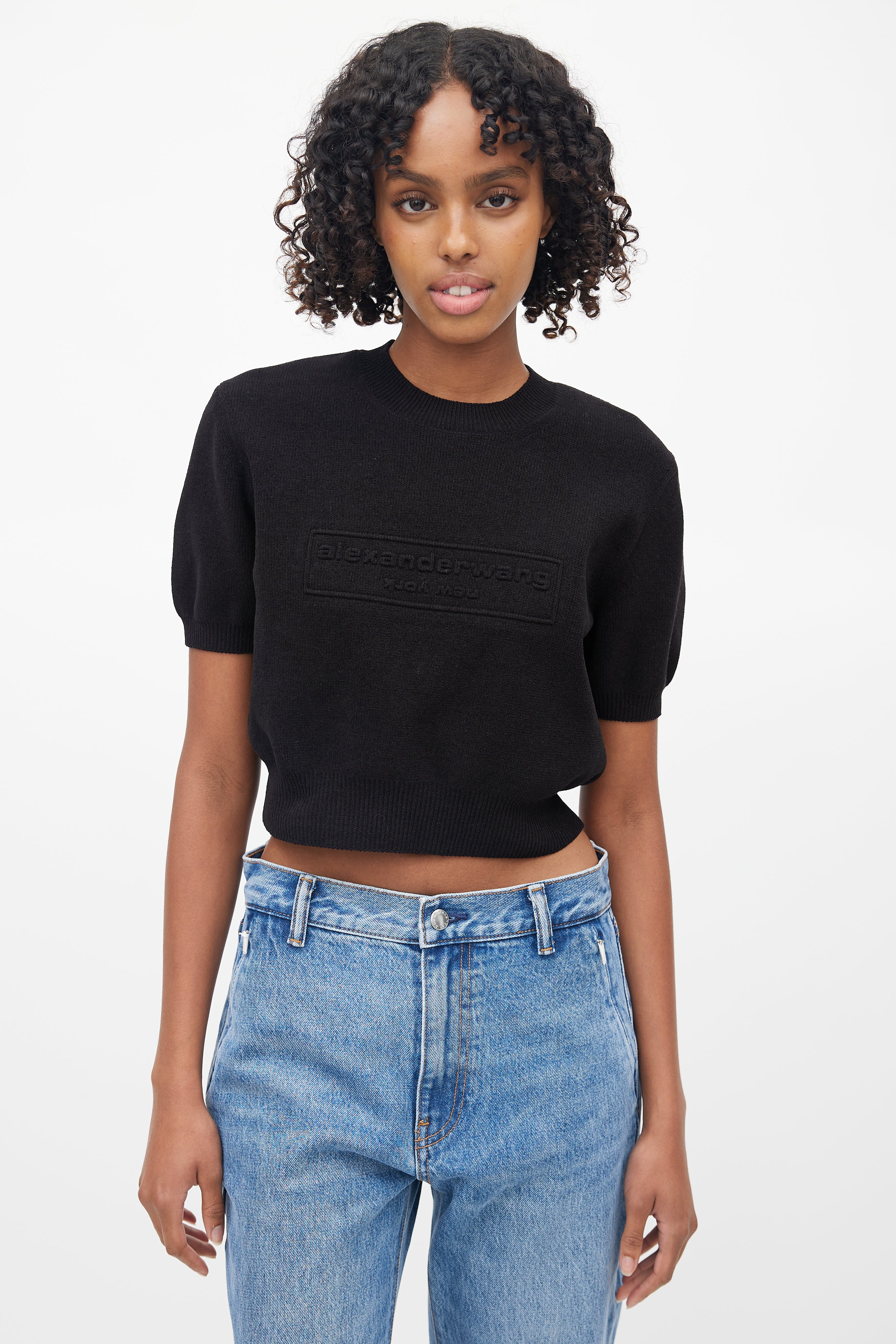 Alexander Wang black top featuring crew neckline, short sleeves, ribbed hem, and tonal embossed logo at front.