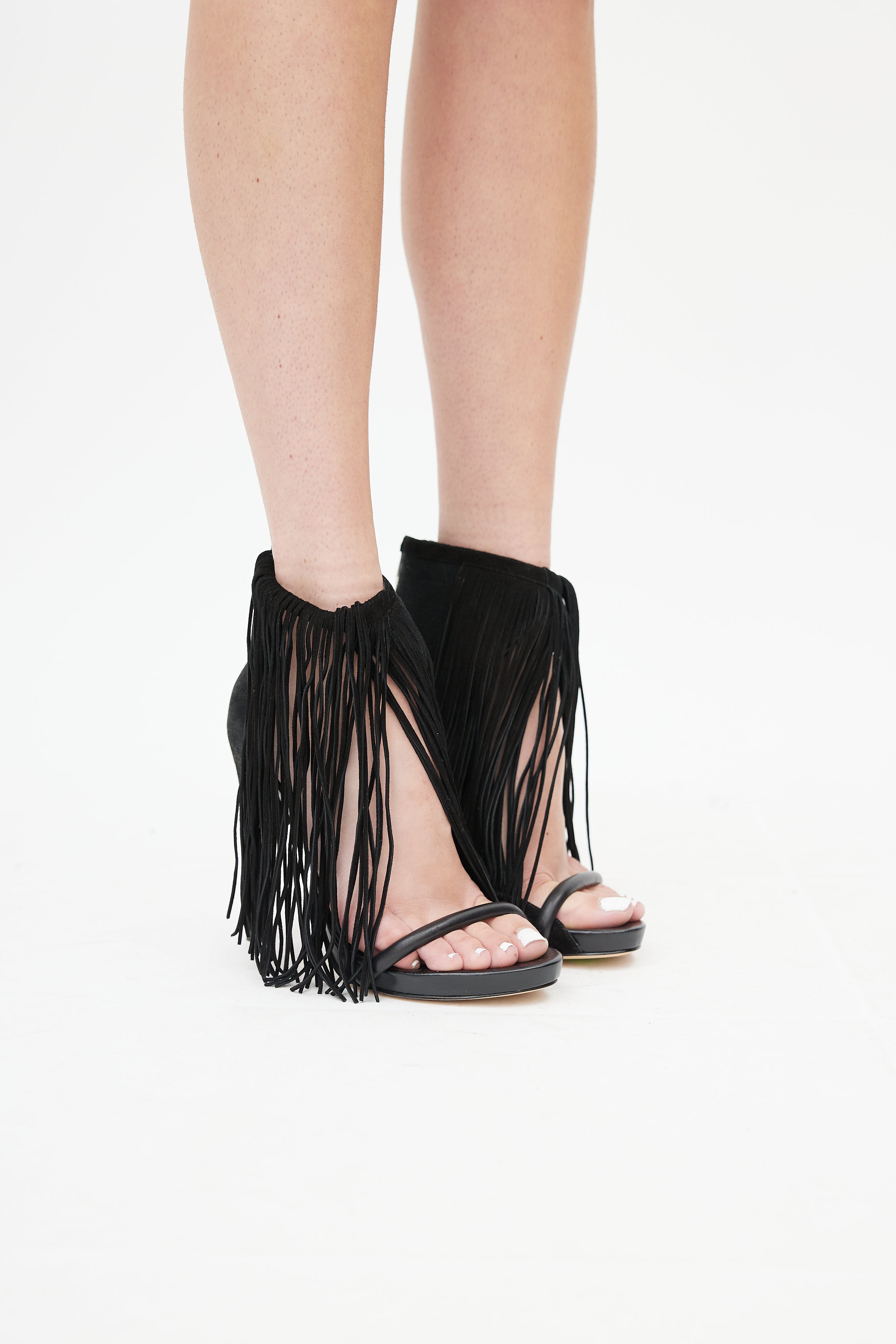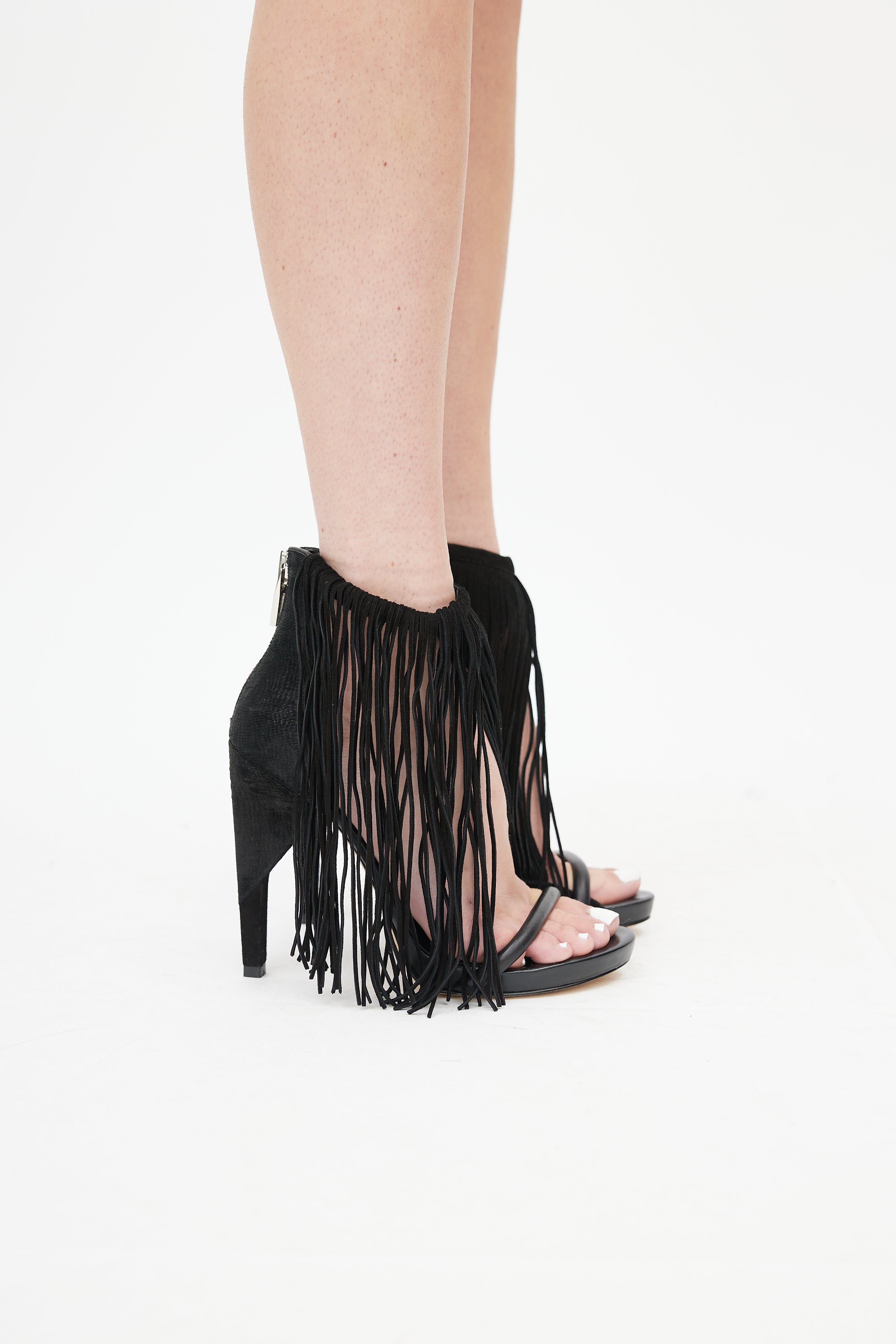 Pre-owned Alexander Wang black D'orsay heels featuring open rounded toe, silver tone zip closure at back, fringe embellishment at ankle, and tapered covered heel.