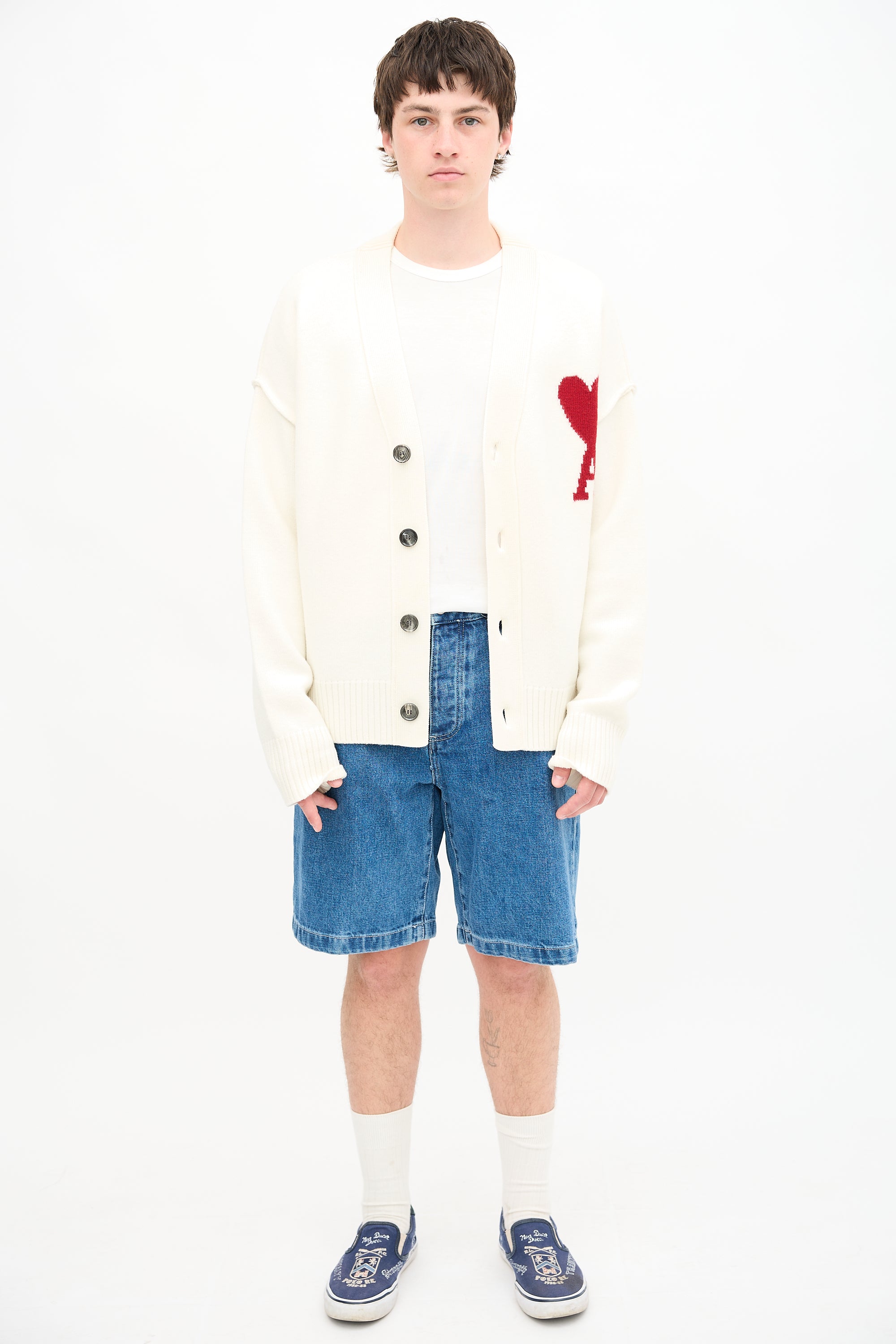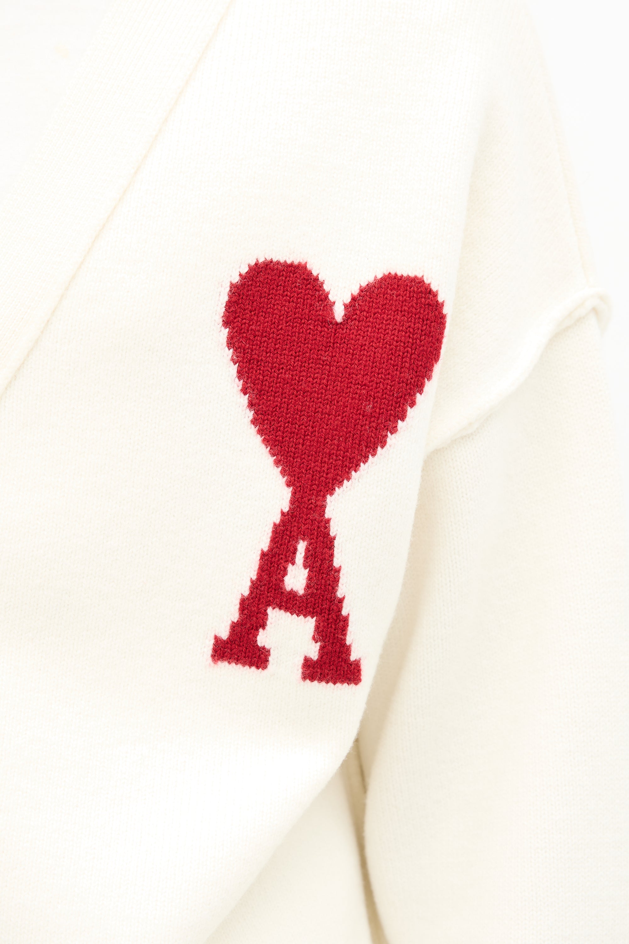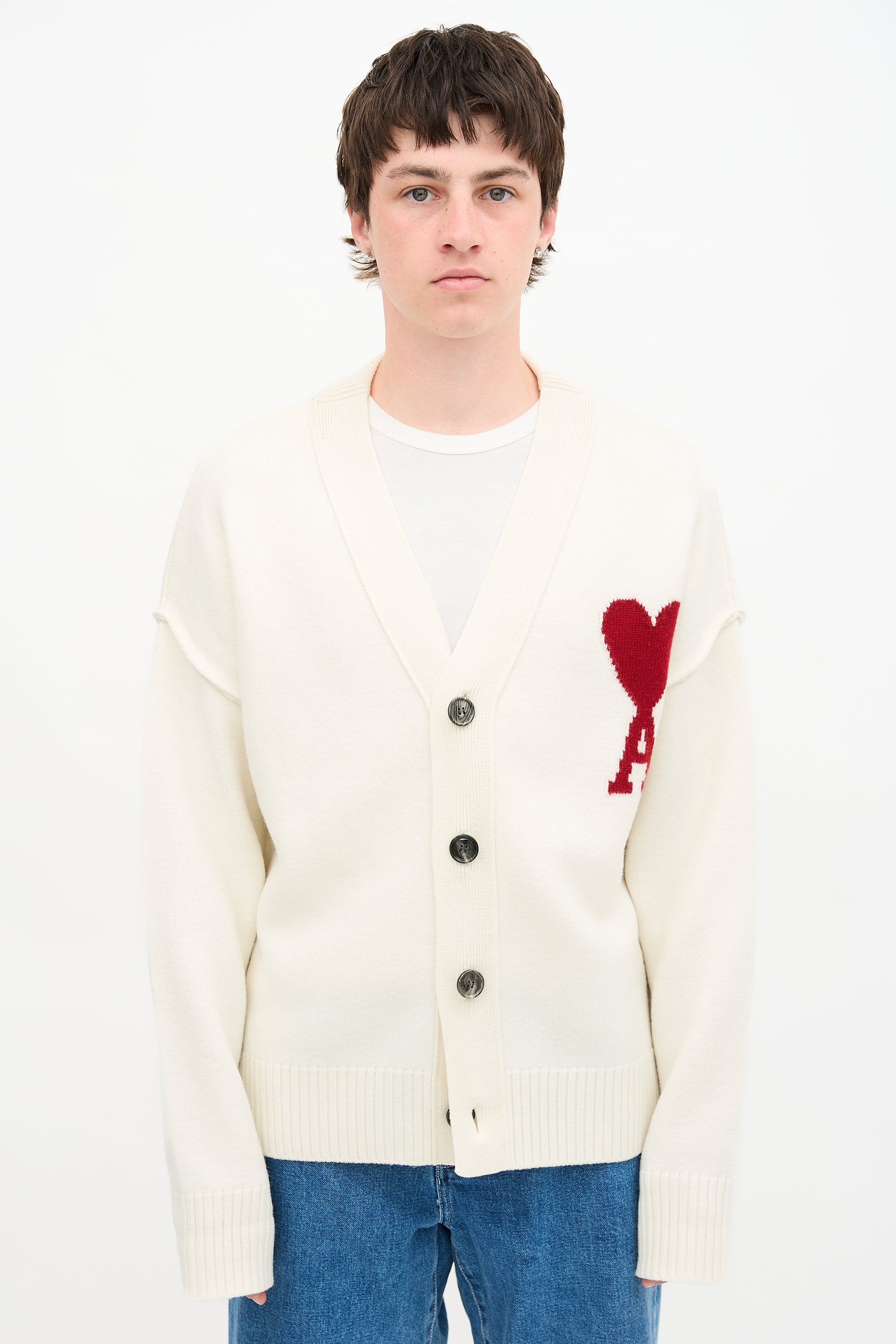 Pre-owned AMI Paris cream wool cardigan featuring V-neckline, button front, red Ami de Cœur logo intarsia at left chest, and ribbed placket, hem, and cuffs.