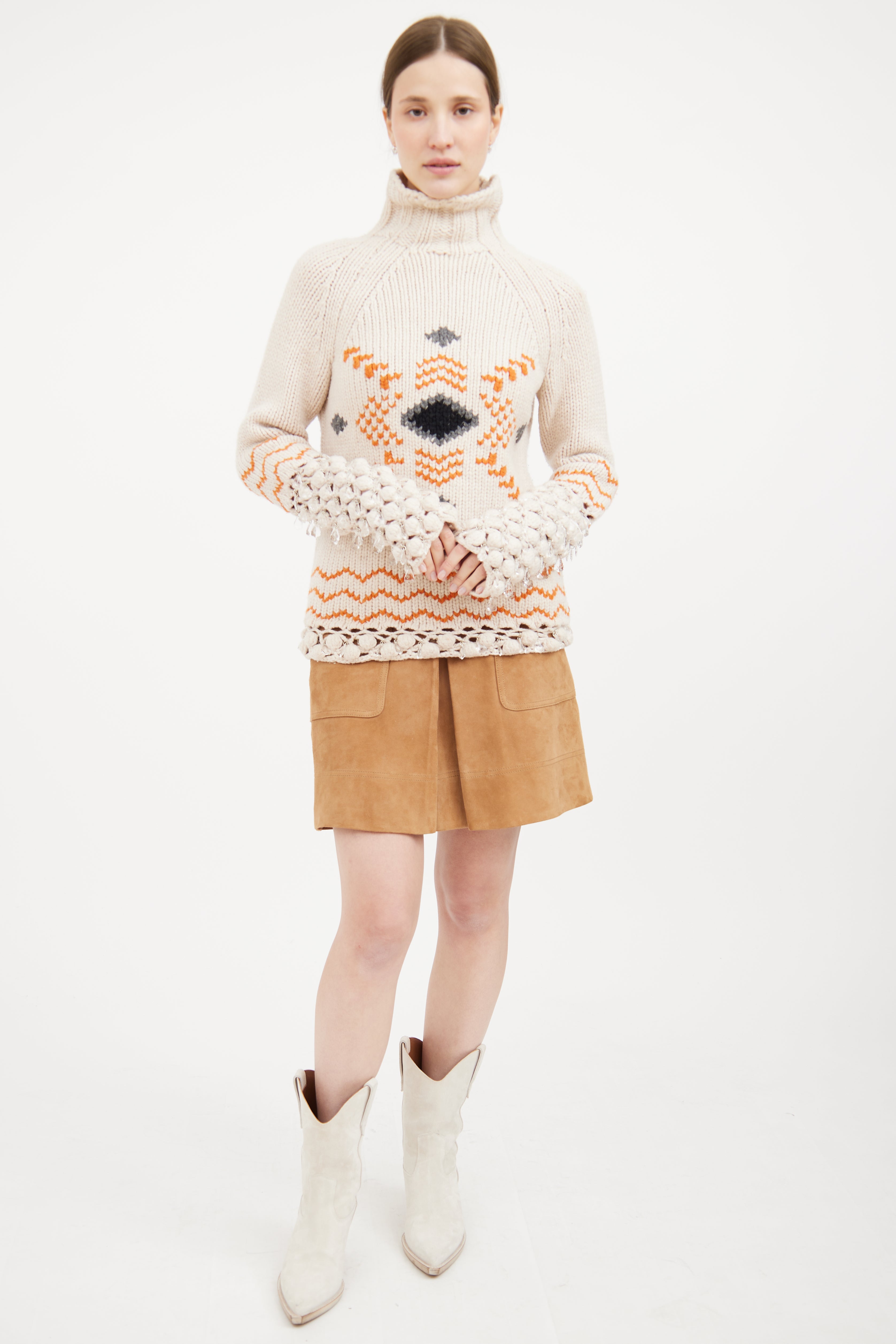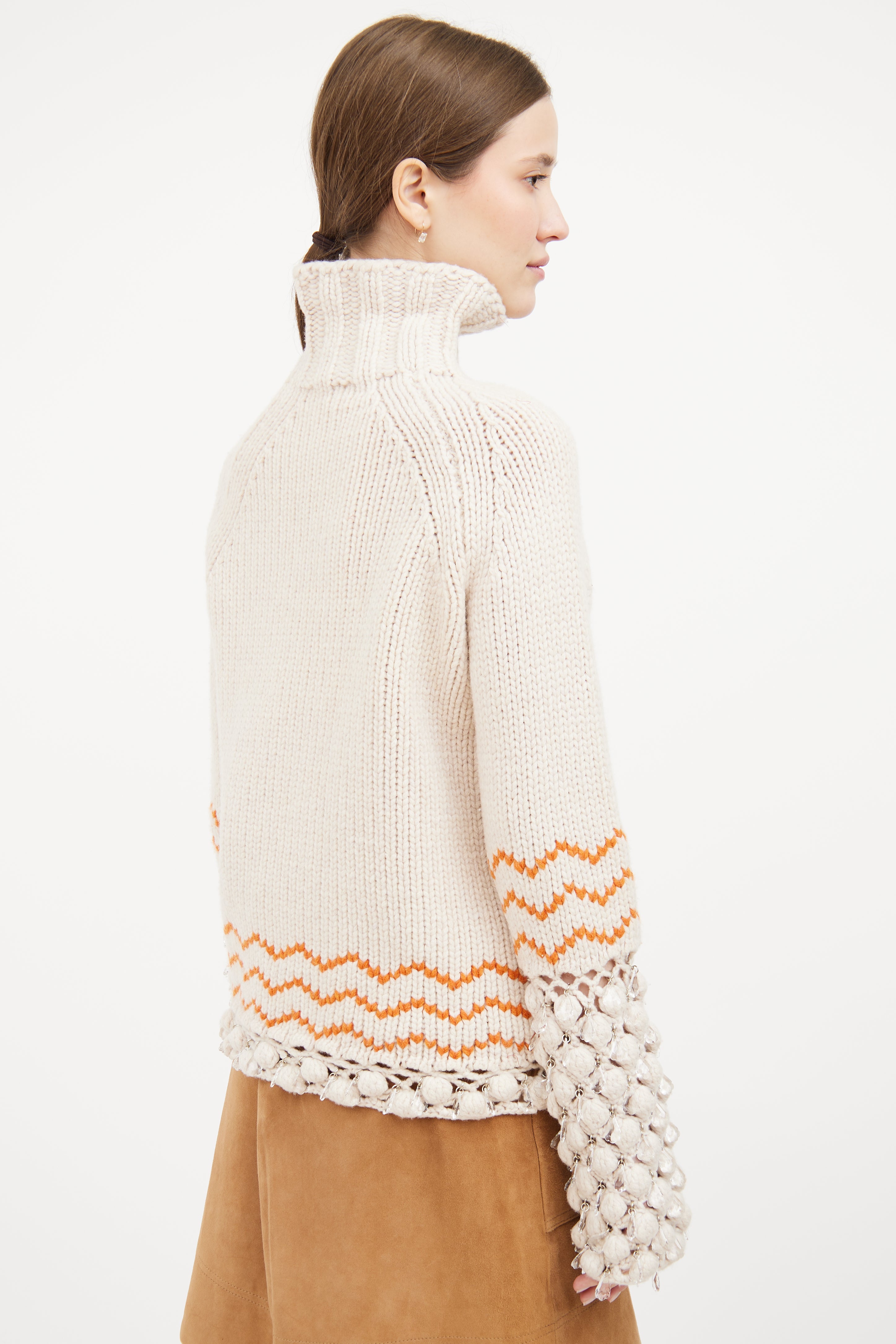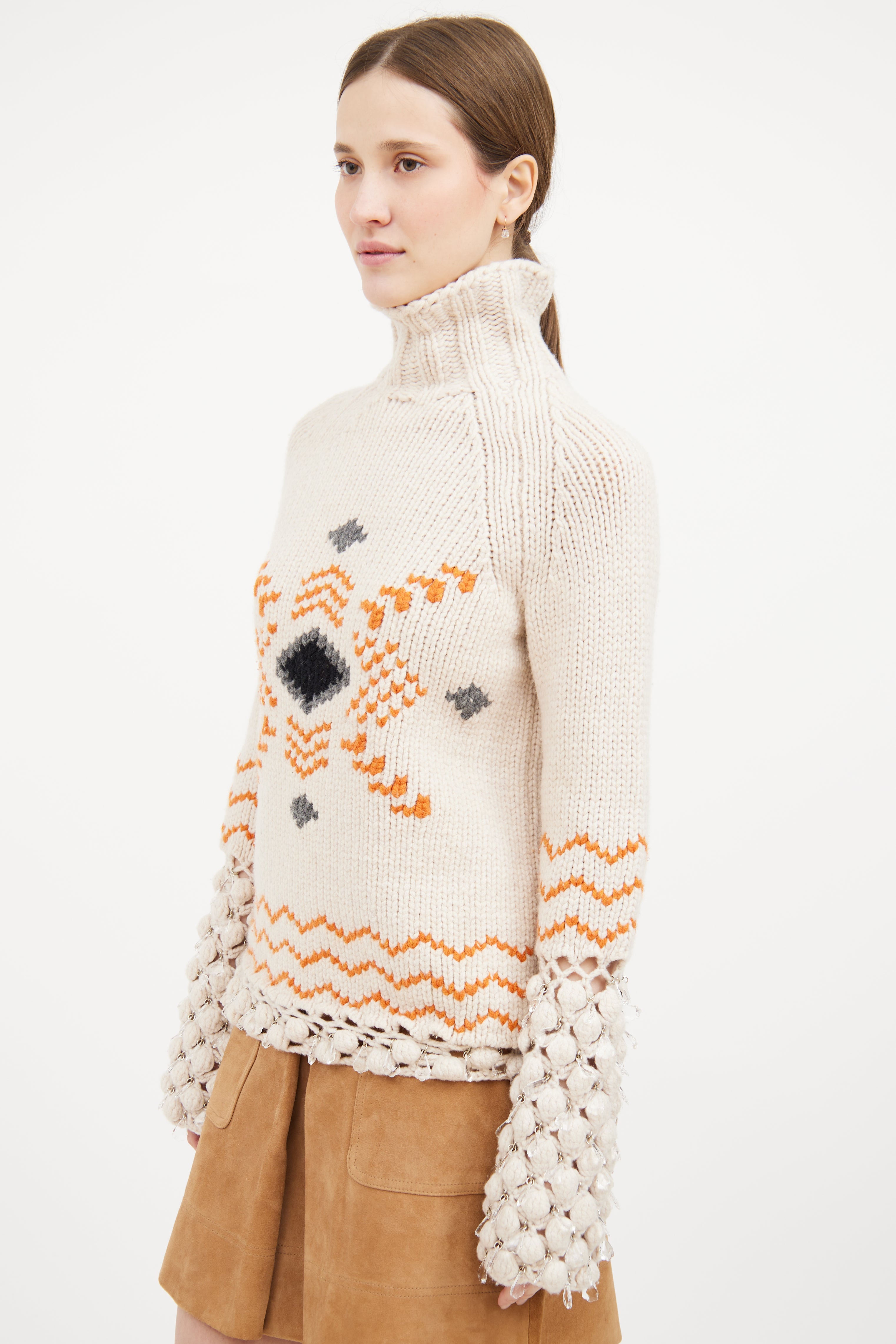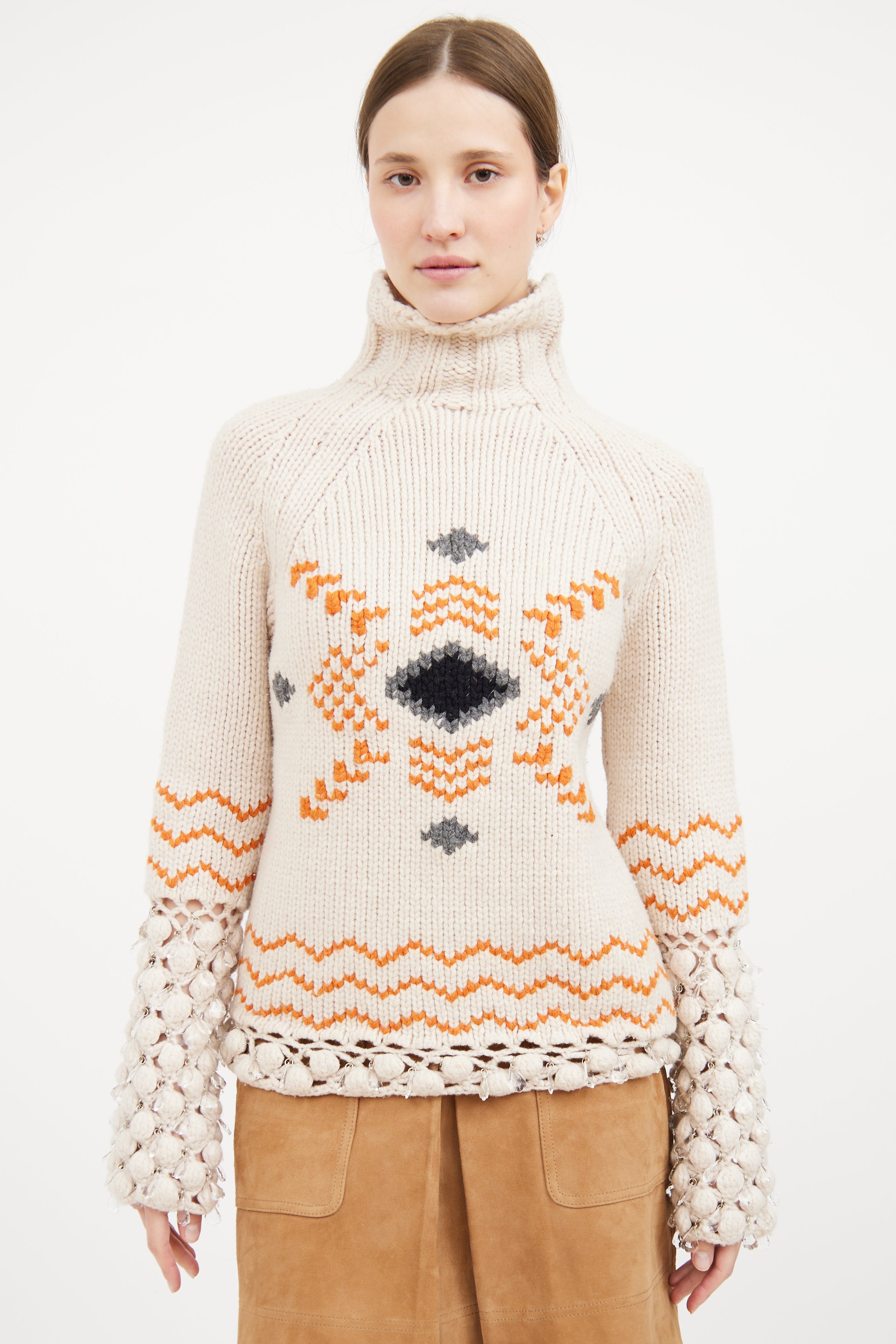 Pre-owned Paco Rabanne cream long sleeve sweater featuring turtleneck, orange, grey and black geometric pattern and cutout design at sleeves and hem with dangle charm embellishments.