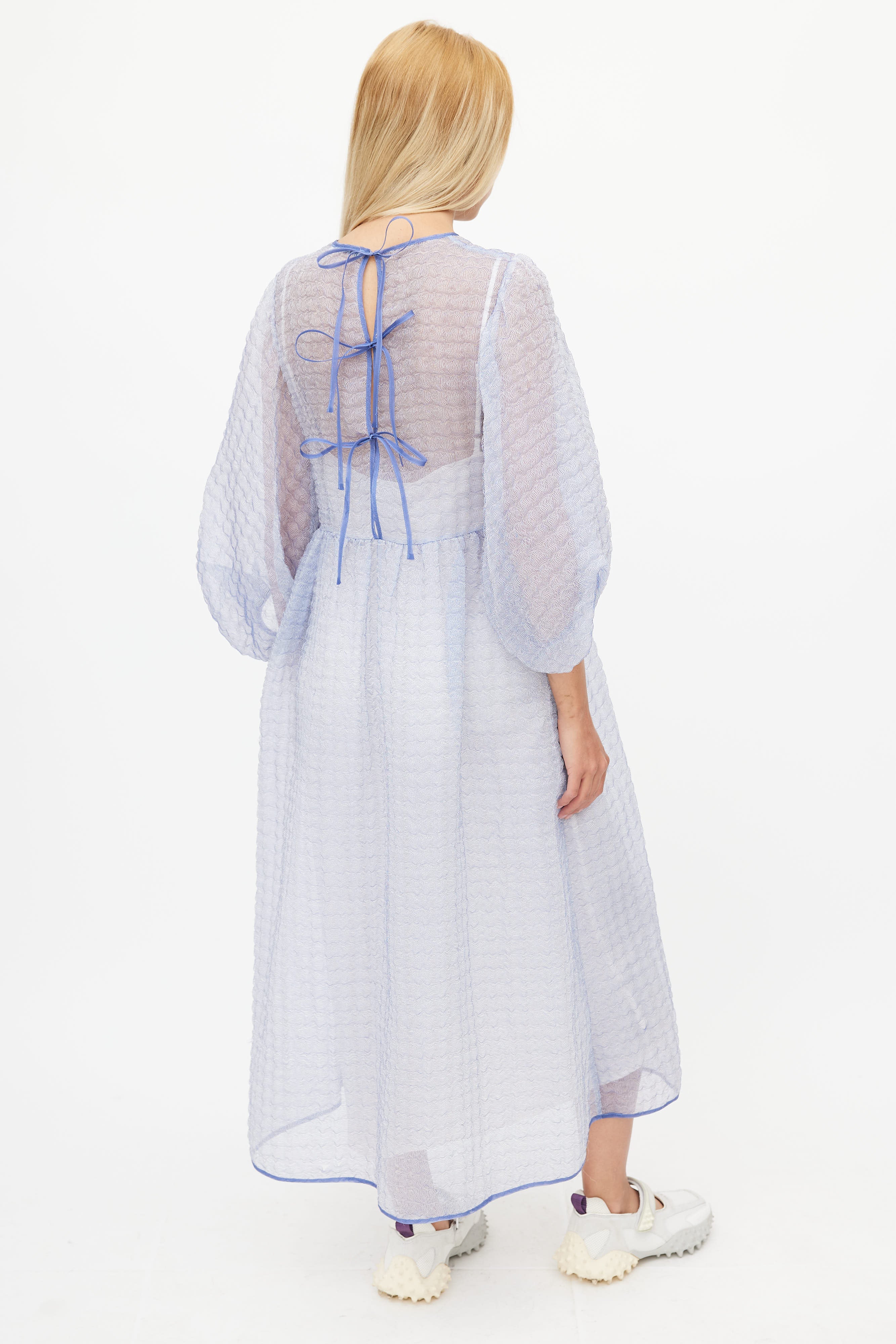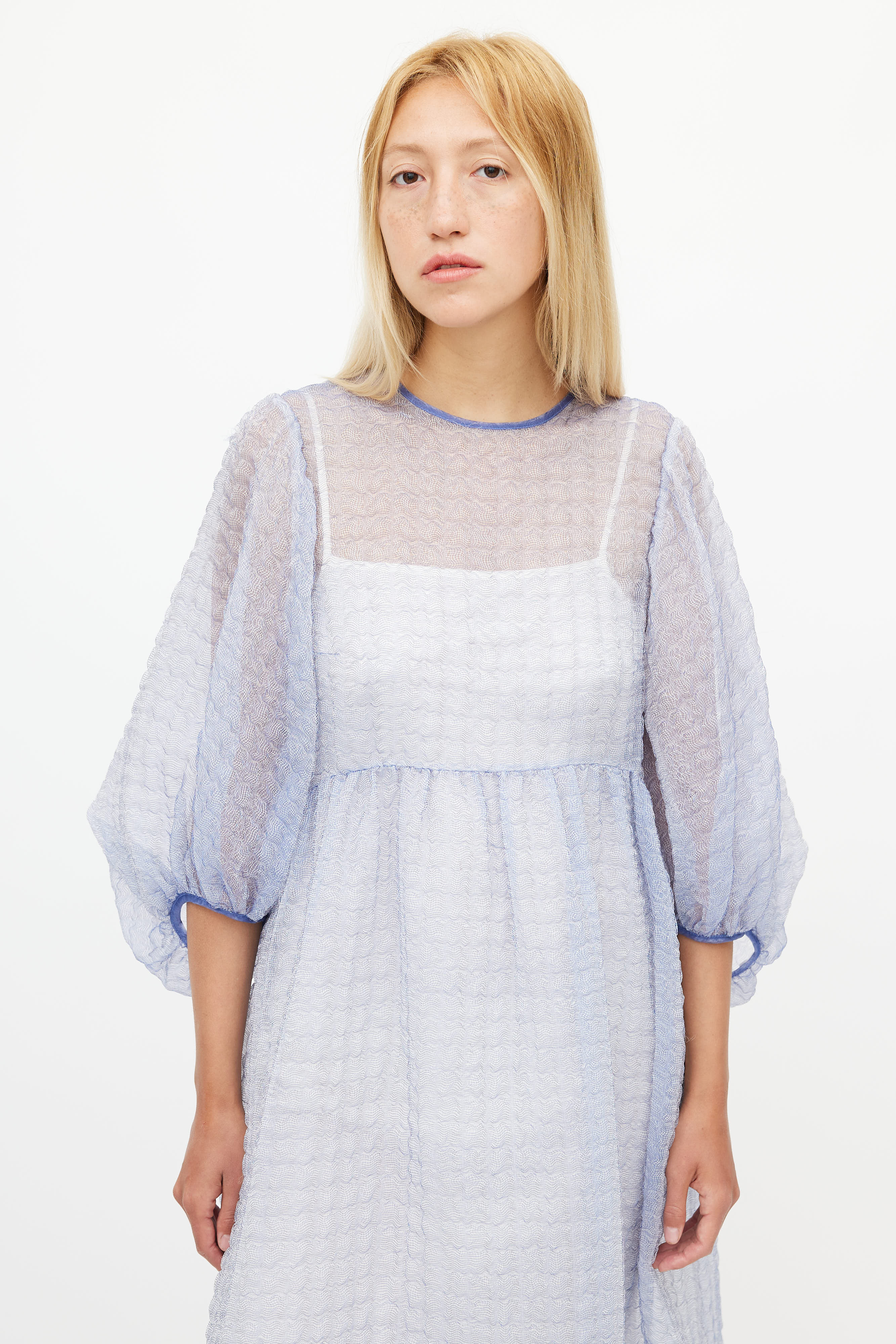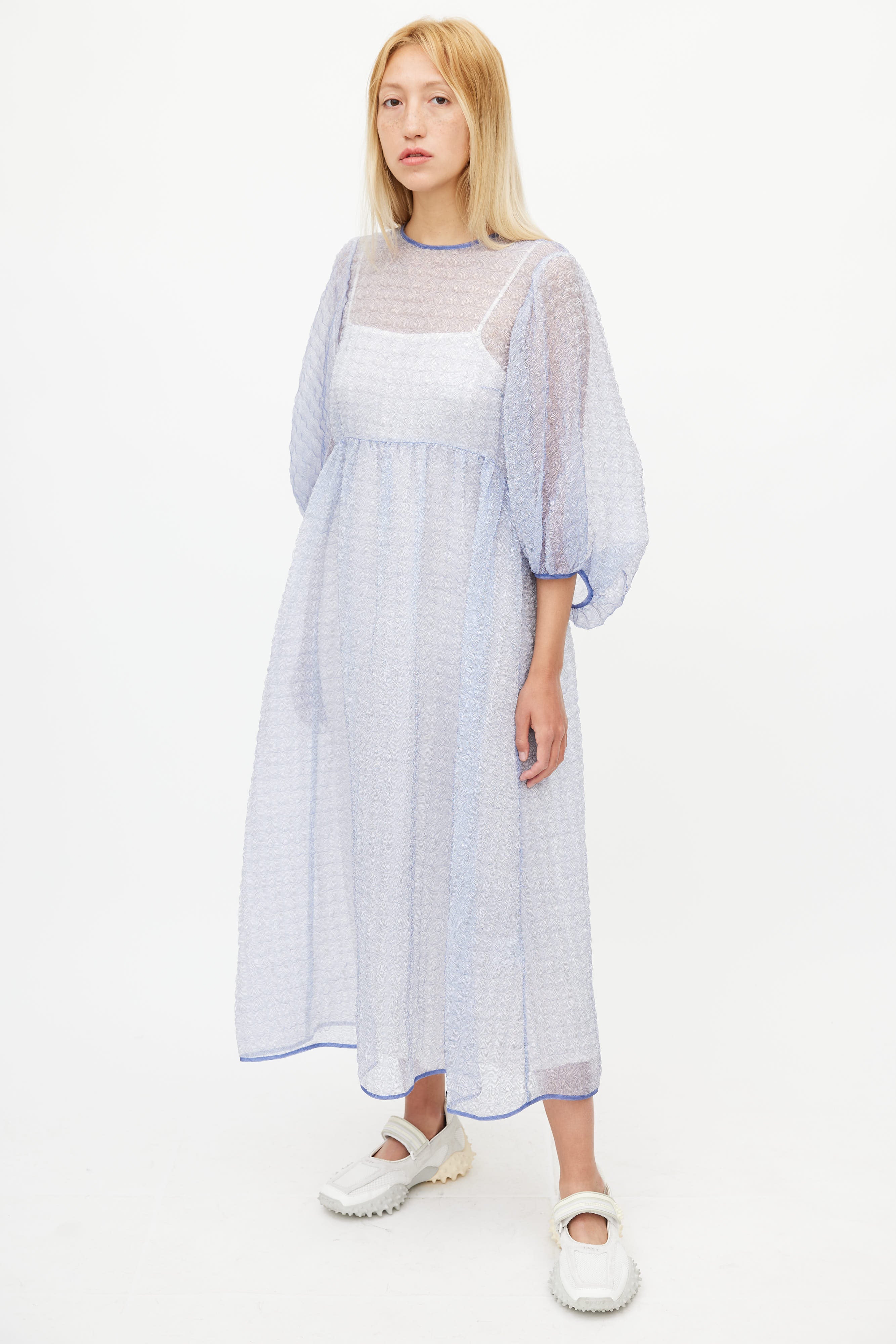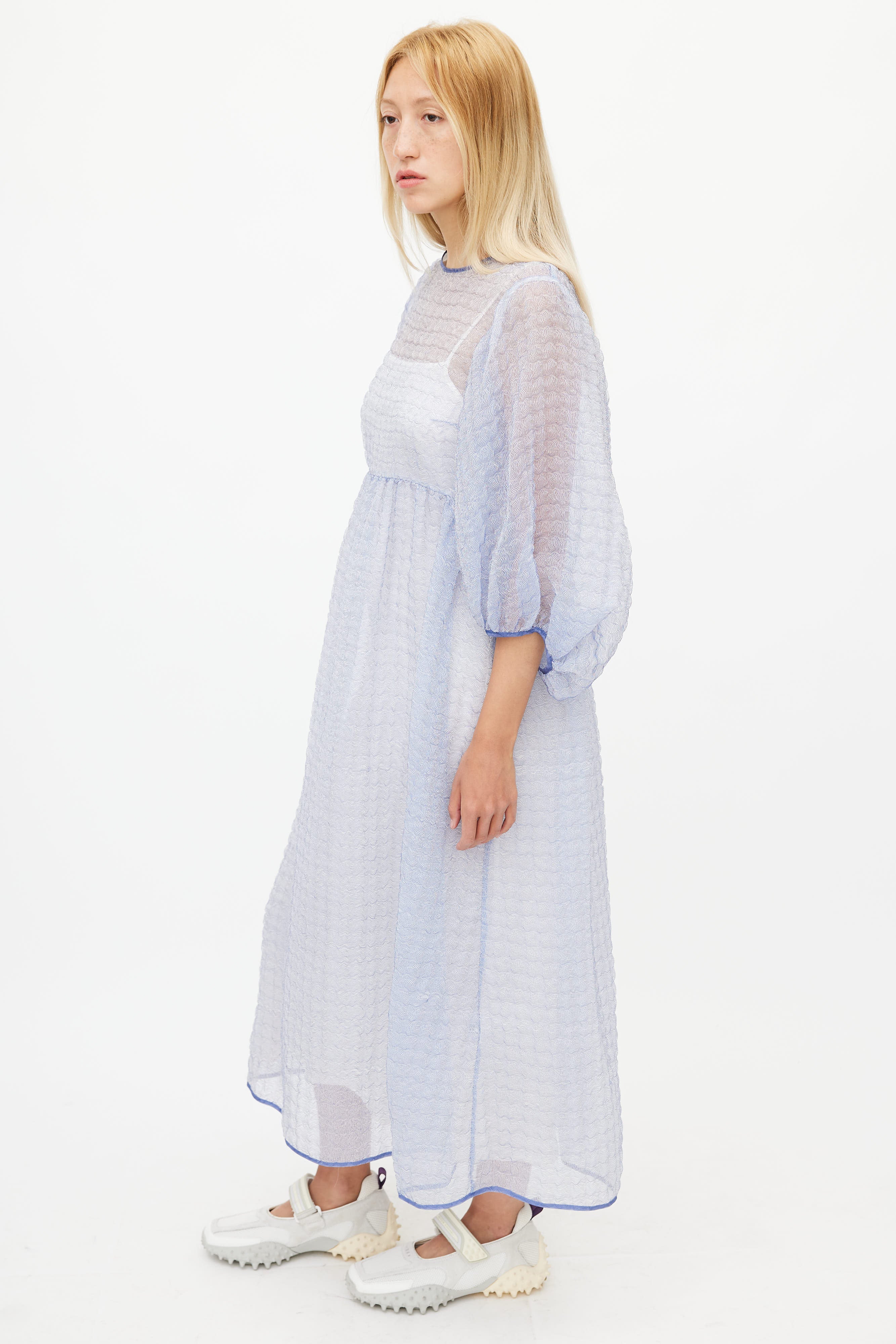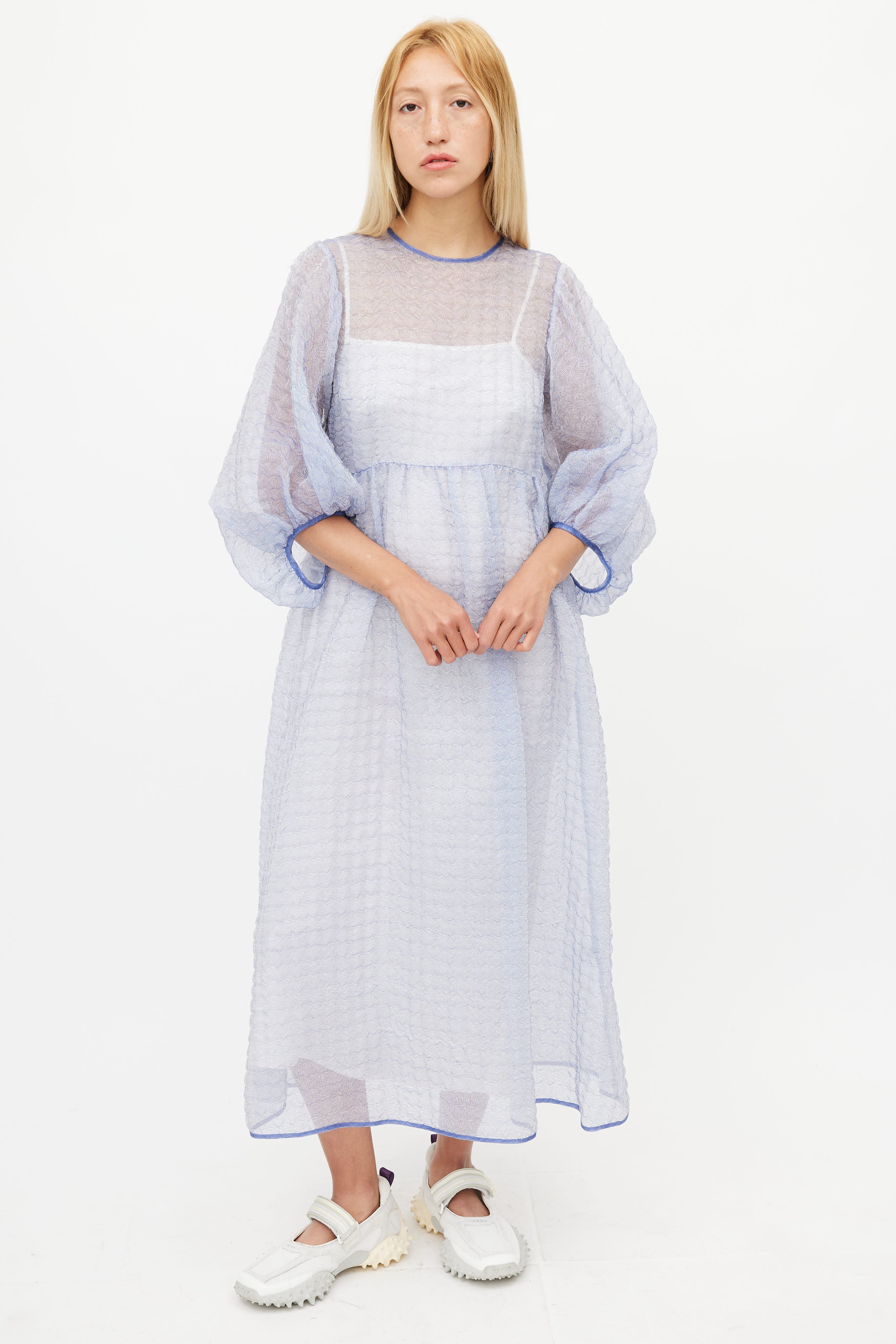Pre-owned Cecilie Bahnsen blue woven sheer dress featuring a scoop neckline, puffed three quarter sleeves, darted front, and a tie at back with hook and eye closure. Comes with slip dress.