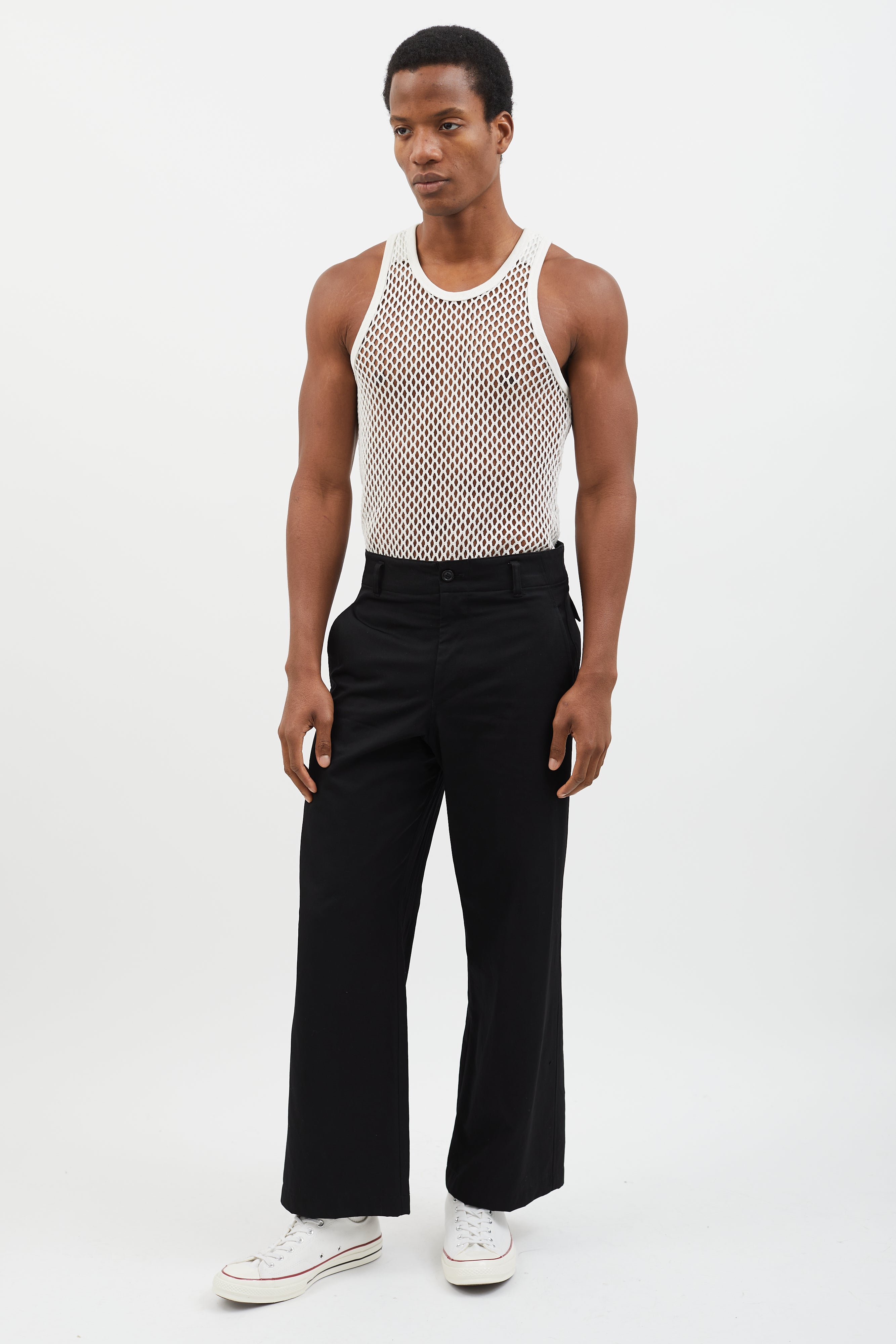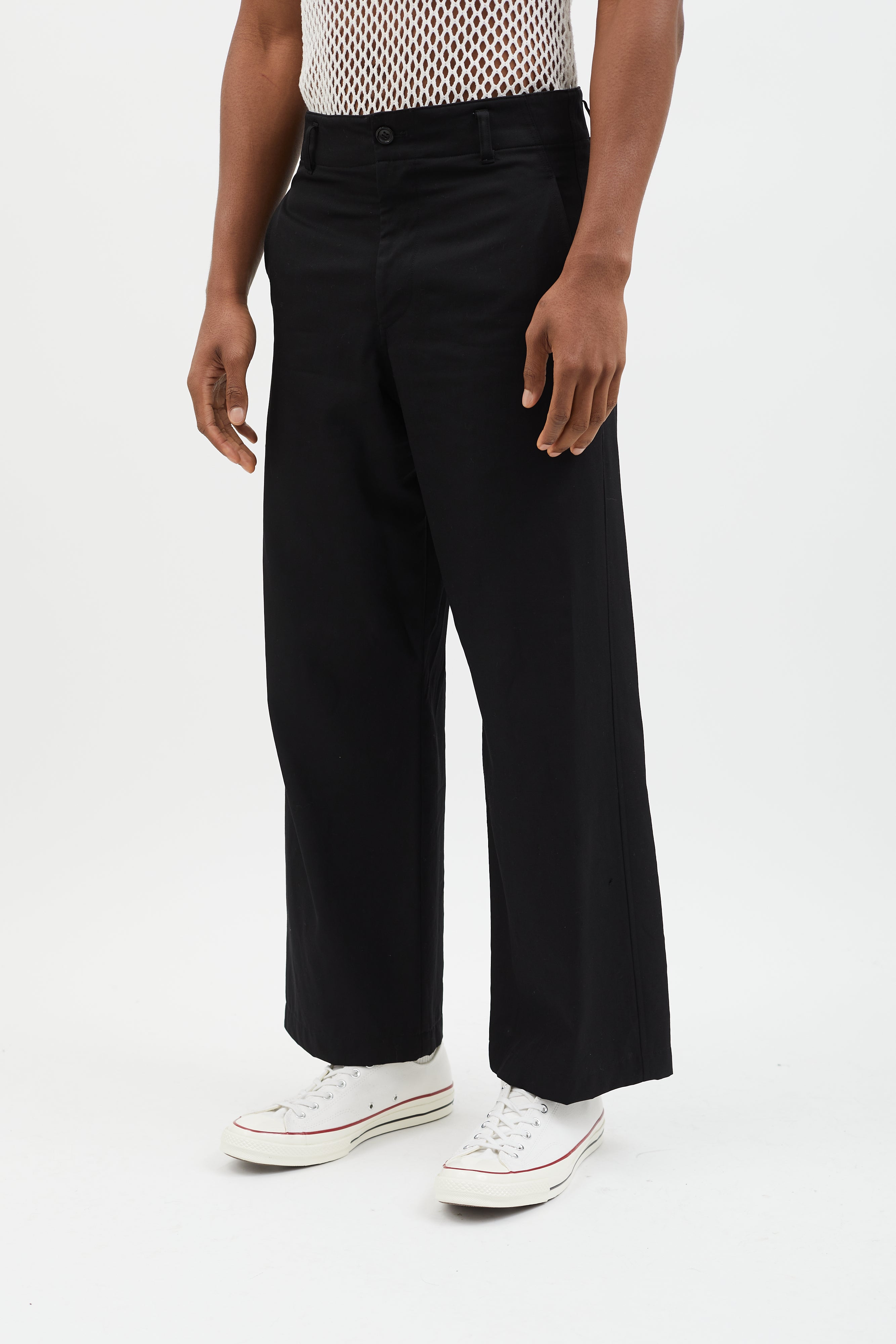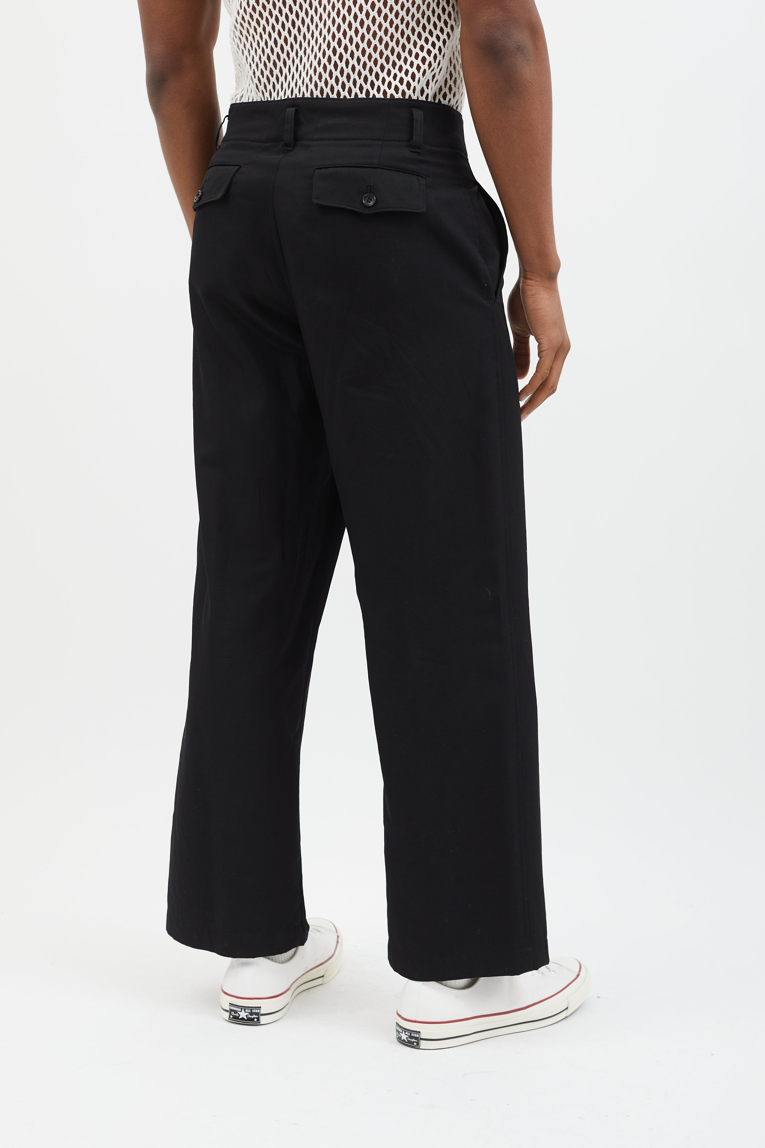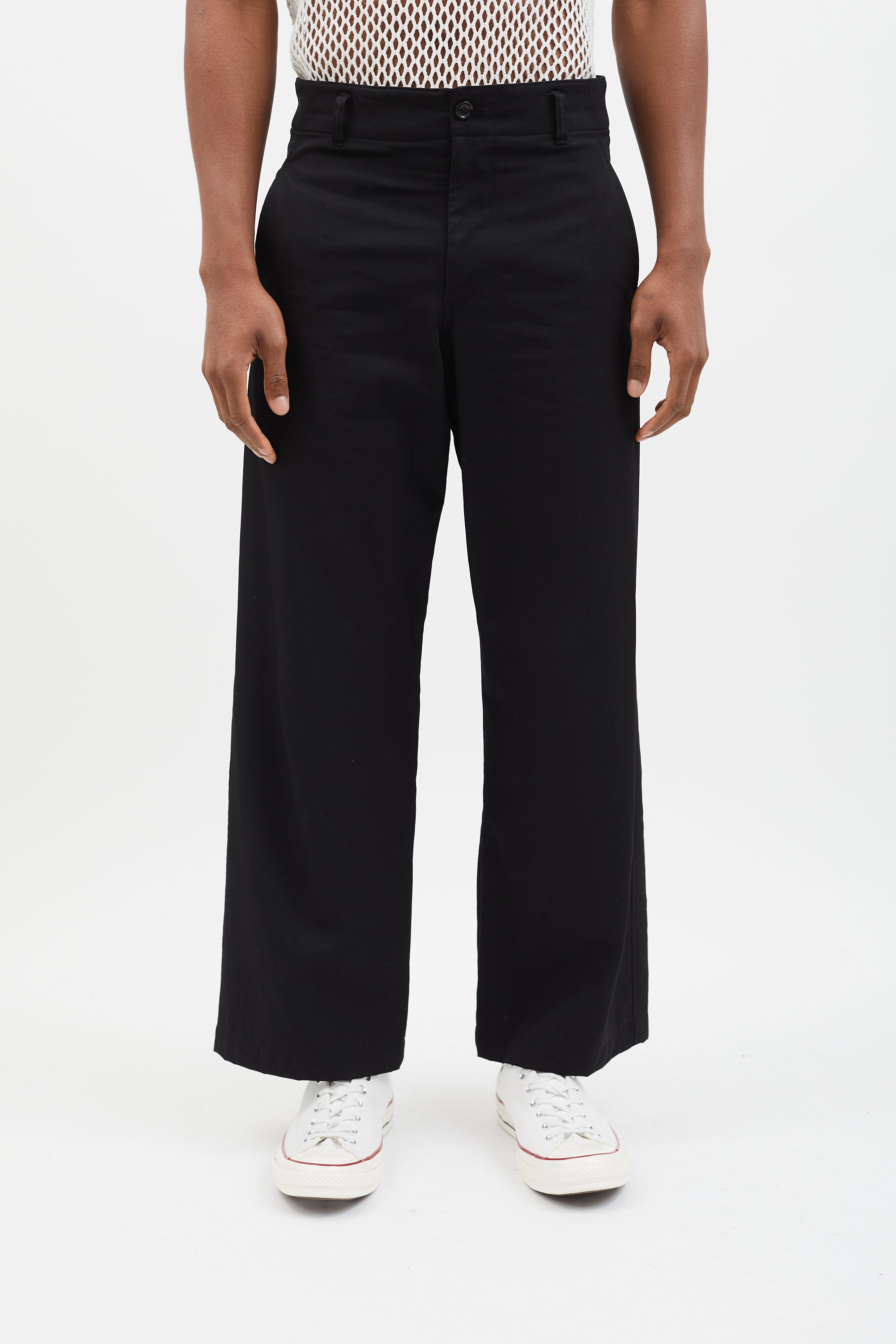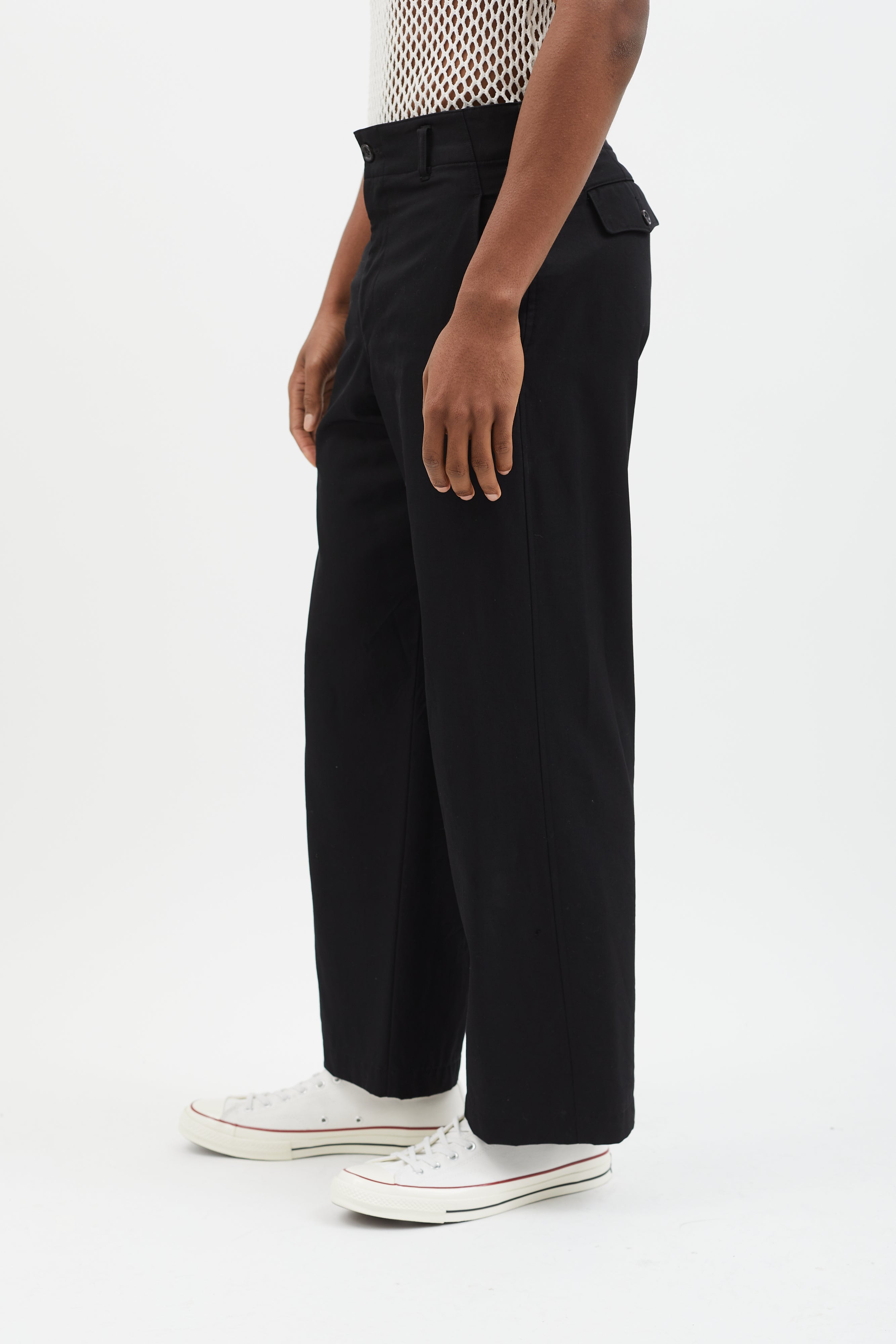 Pre-owned Comme des Garçons trouser in black featuring belt loop, concealed zipper closure at front, four pockets styling, and straight leg design.