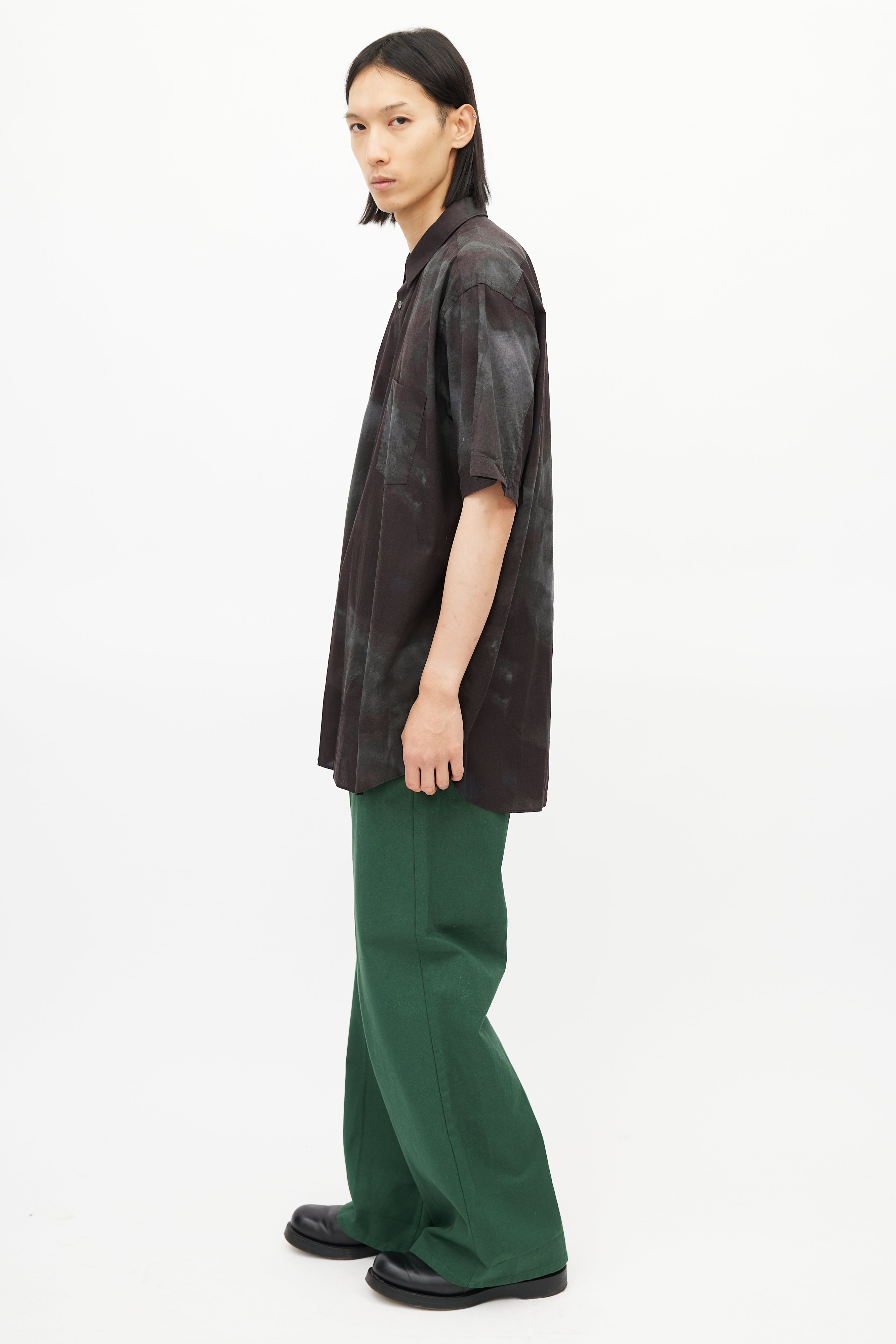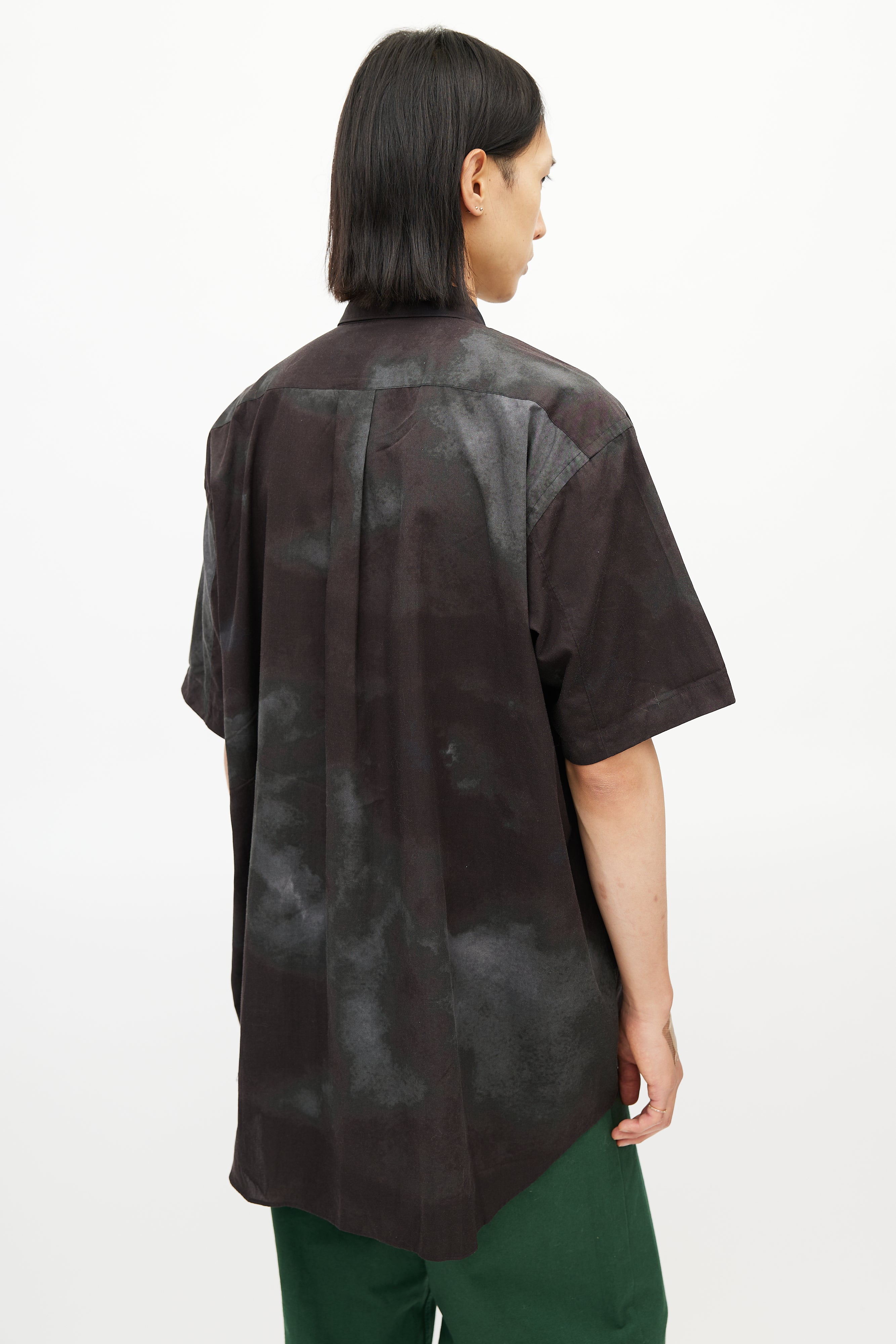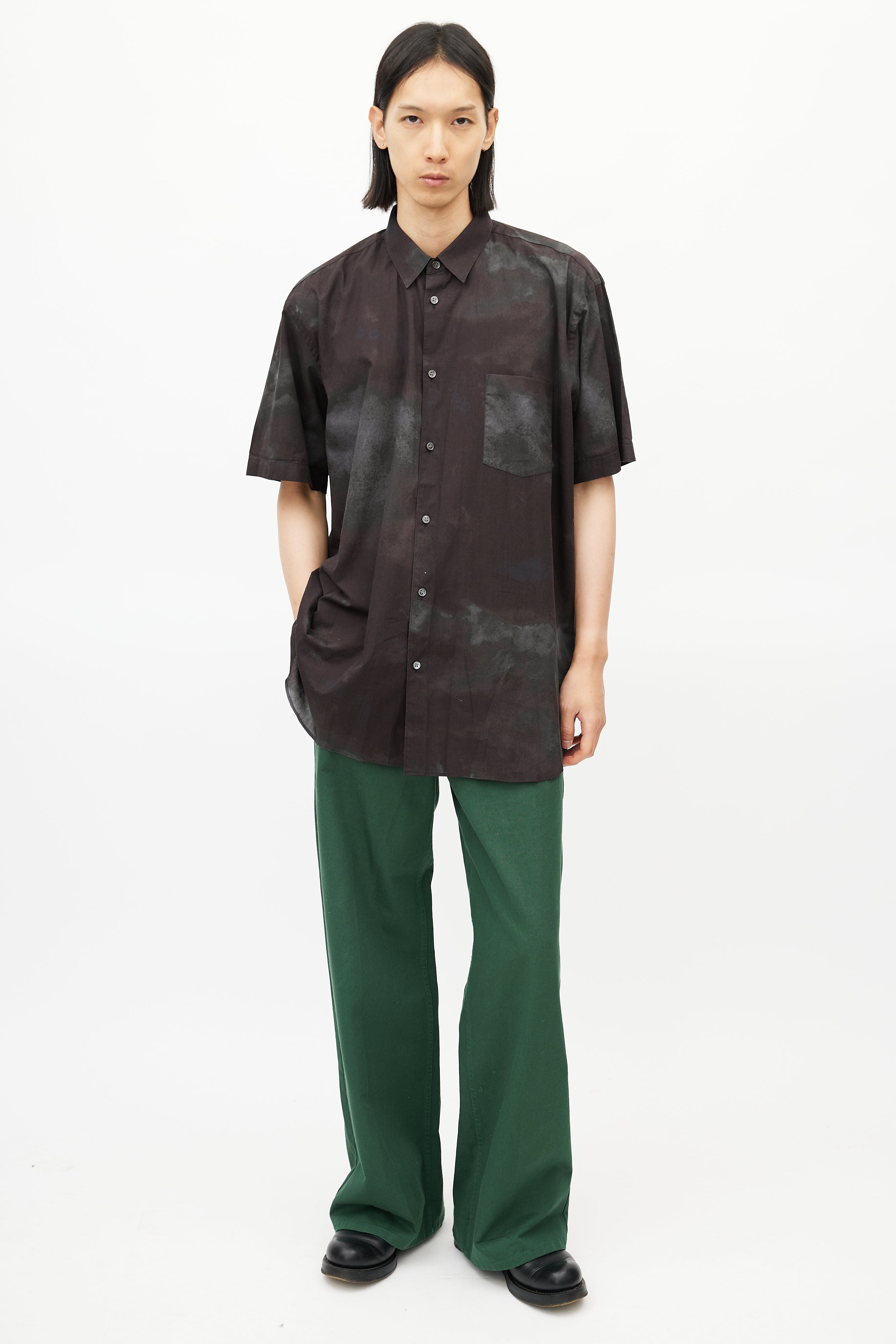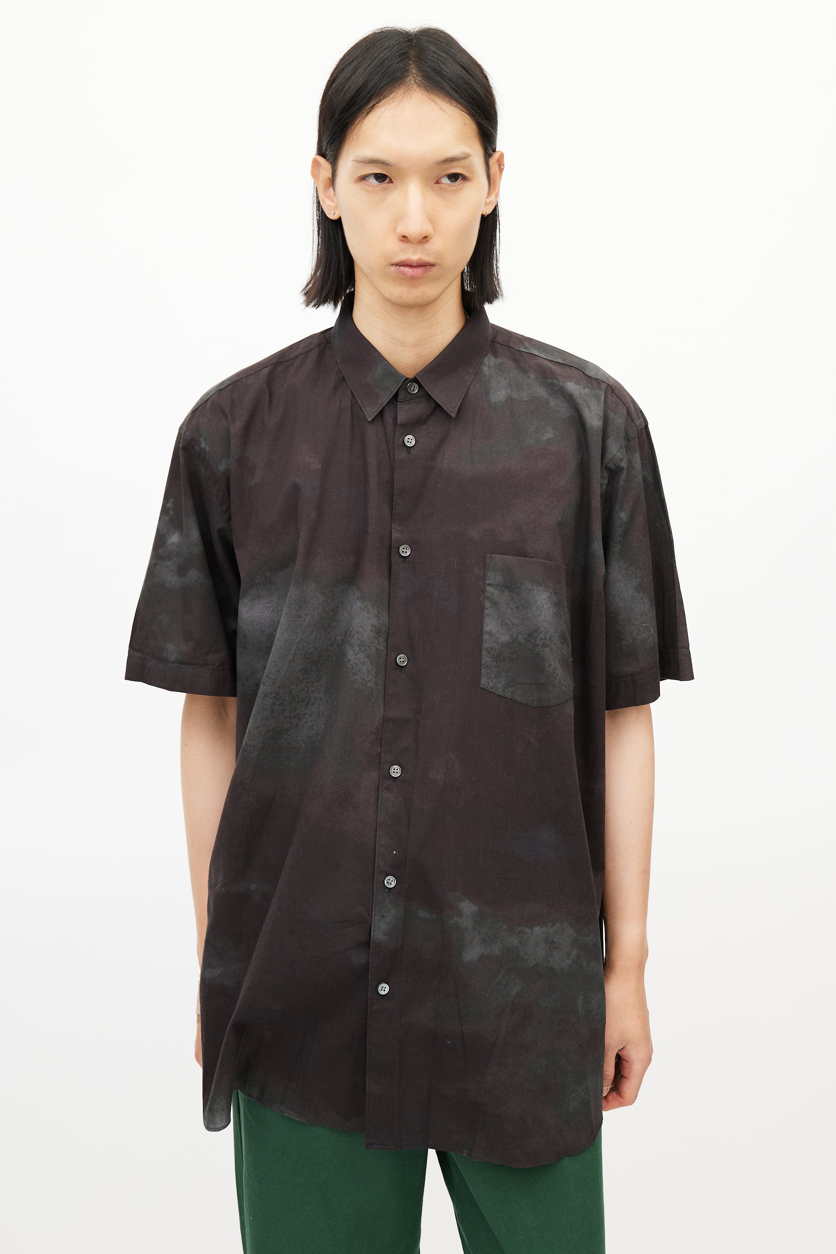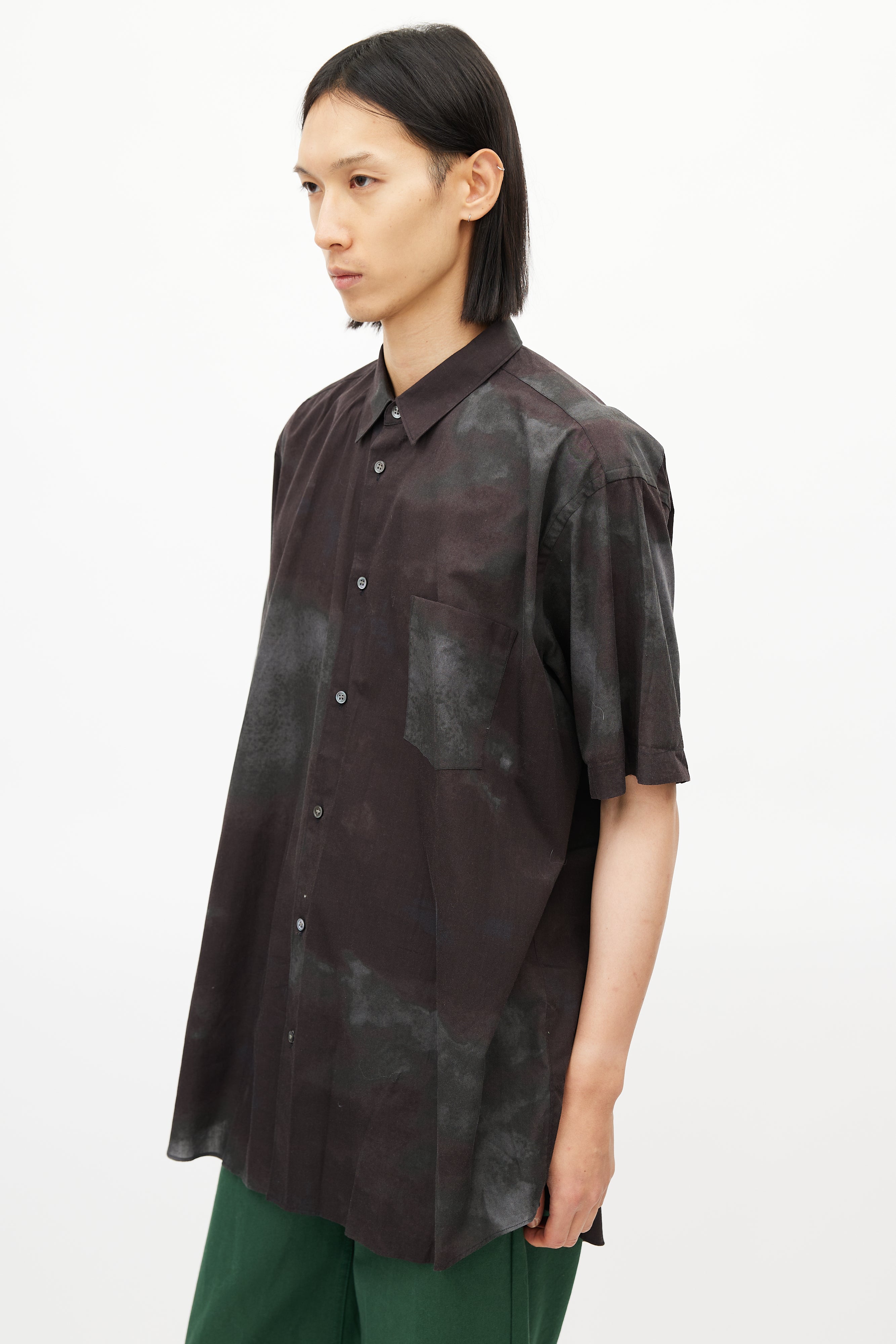 Pre-owned Comme des Garçons brown shirt featuring a grey tie die pattern throughout, pointed collar, short sleeves, and button up front.