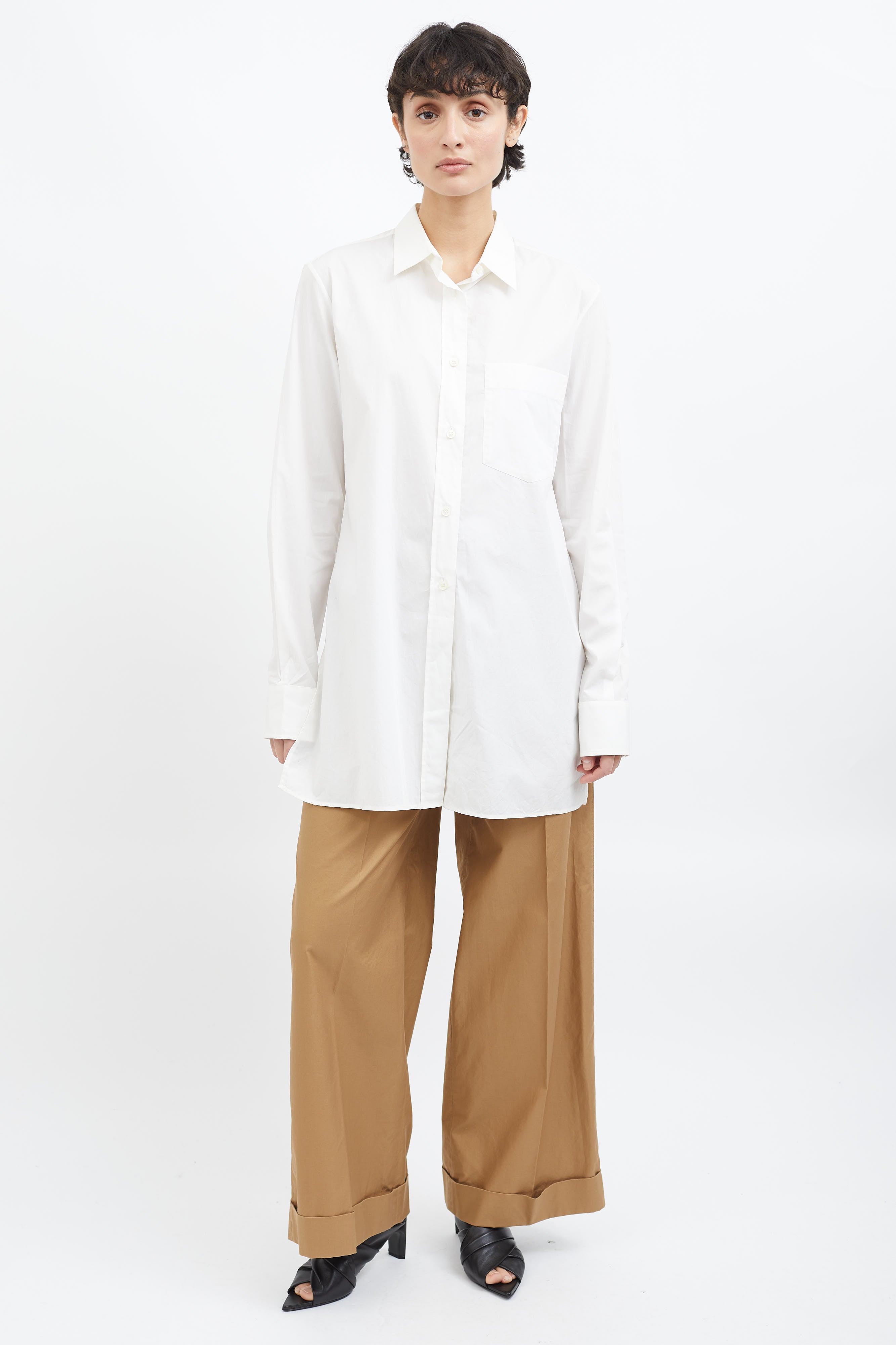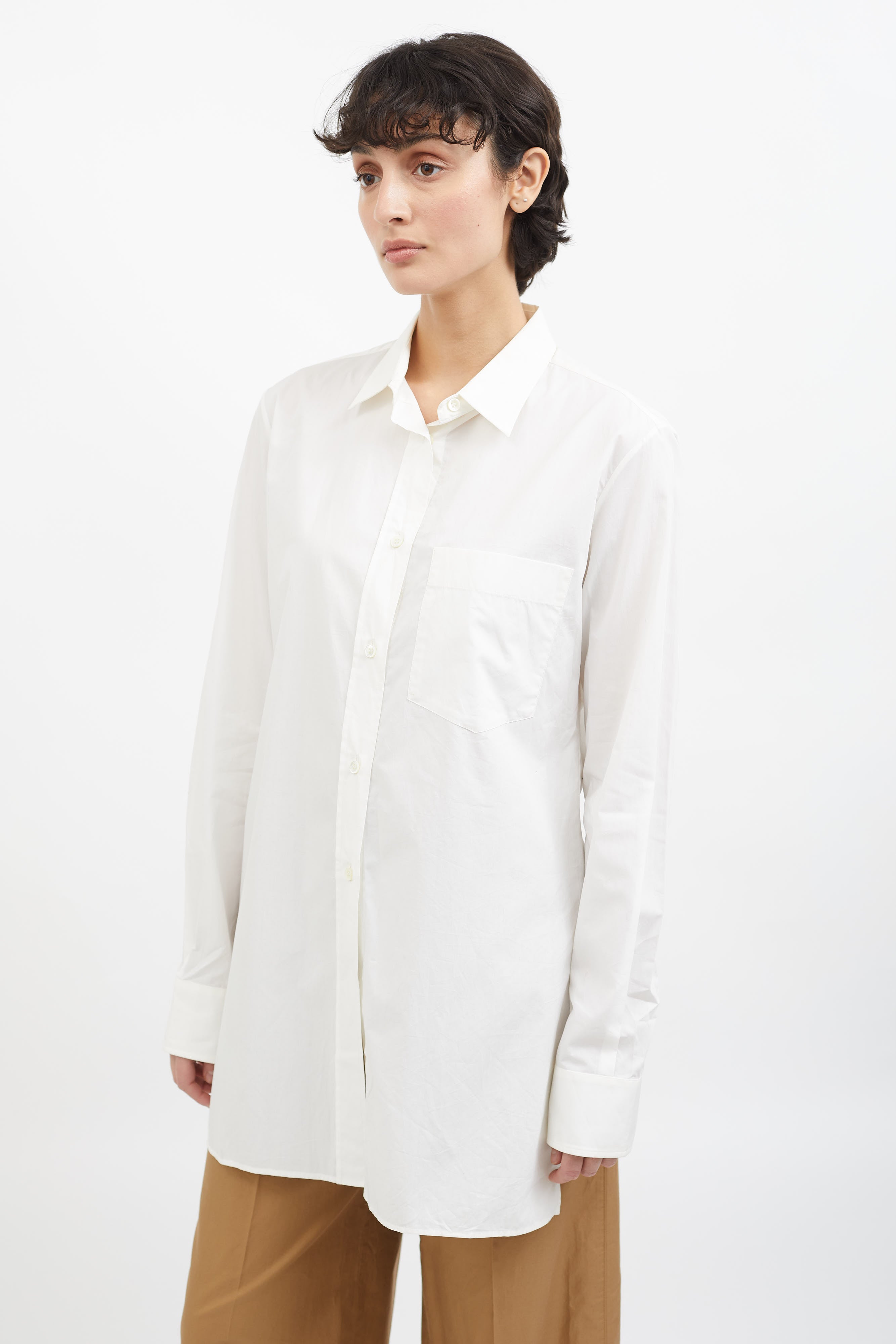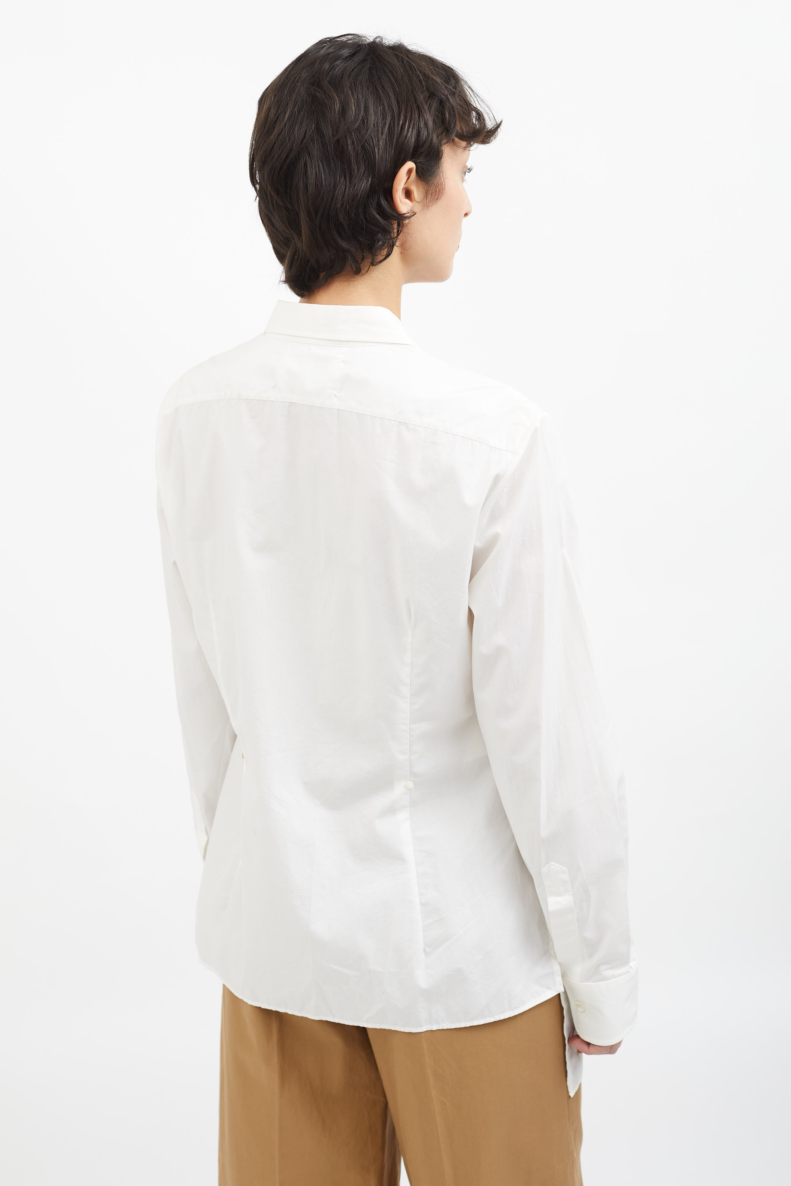 Pre-owned Maison Margiela white cotton side slit shirt featuring spread collar, six button closure, long sleeves with one button cuff, one front pocket, tiny hooks at front bottom hem to hook at back. Short back hem.