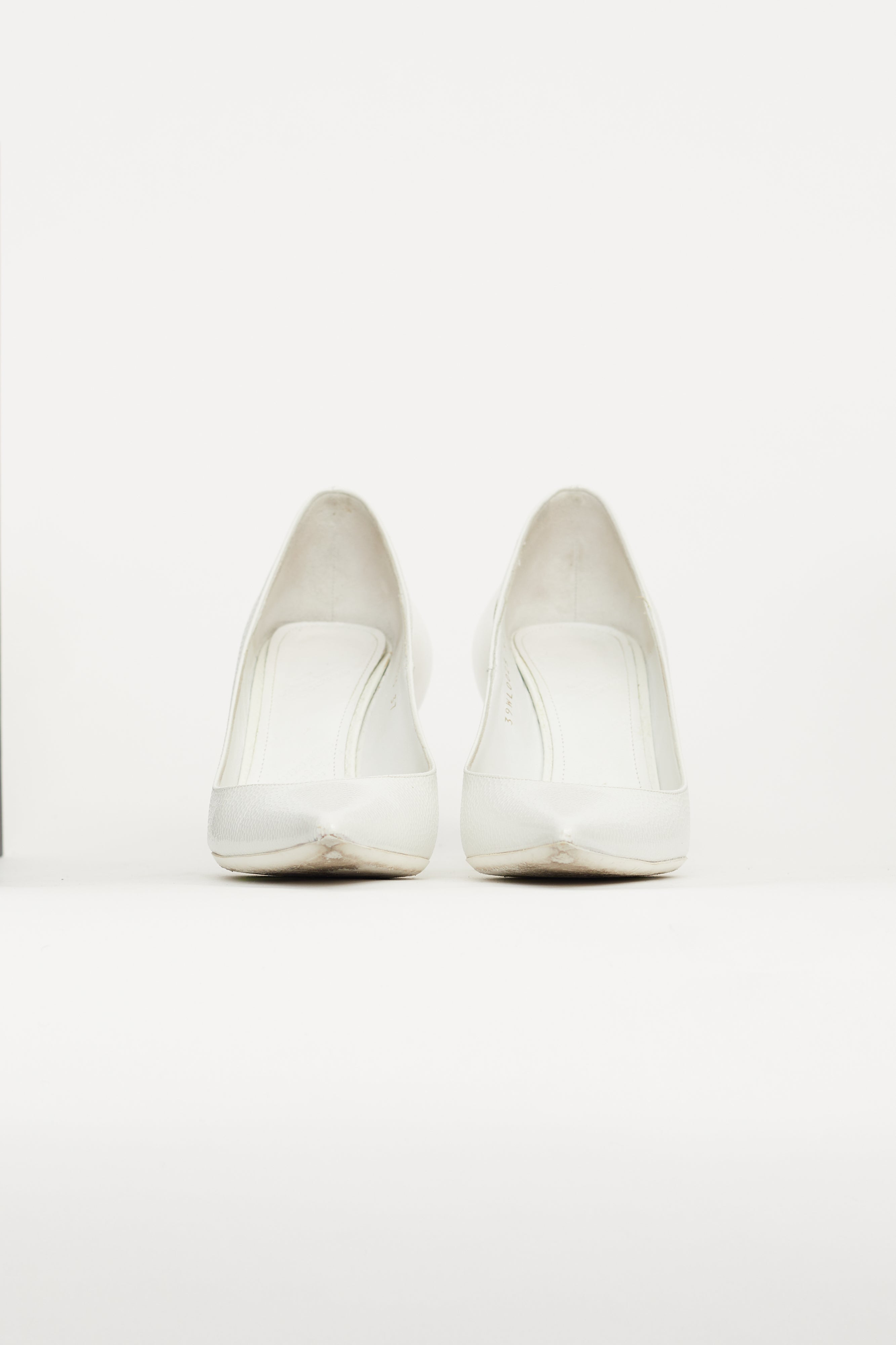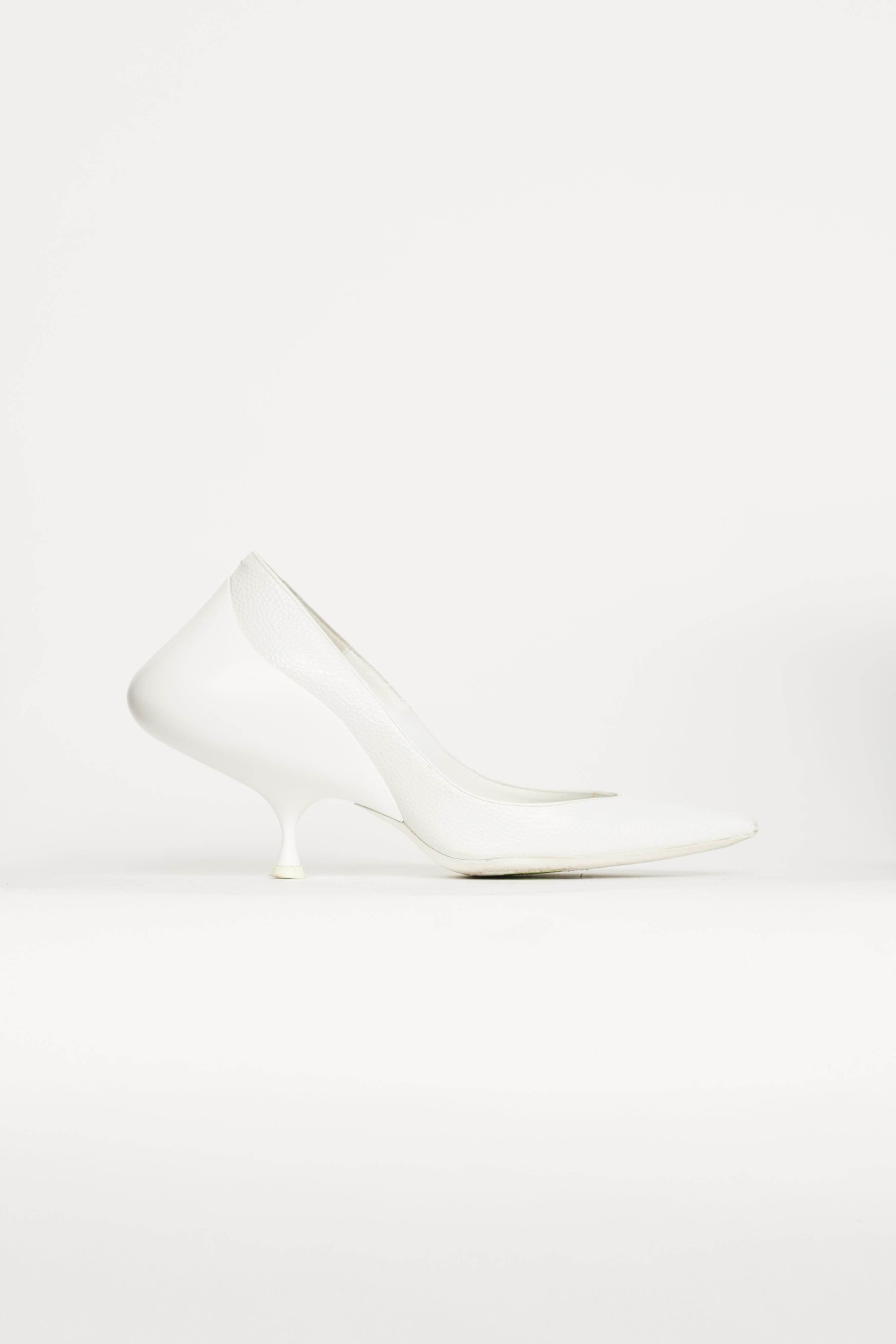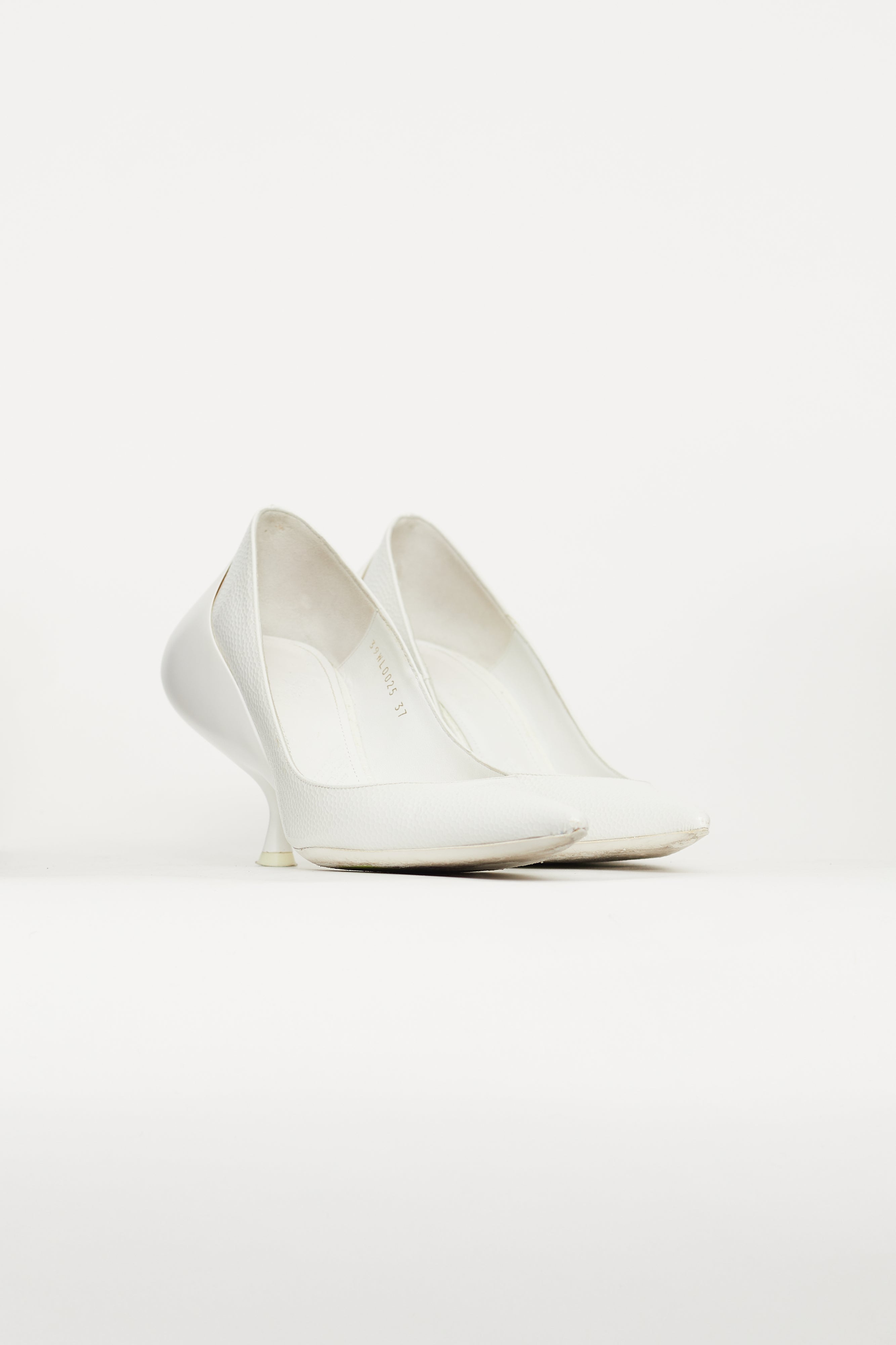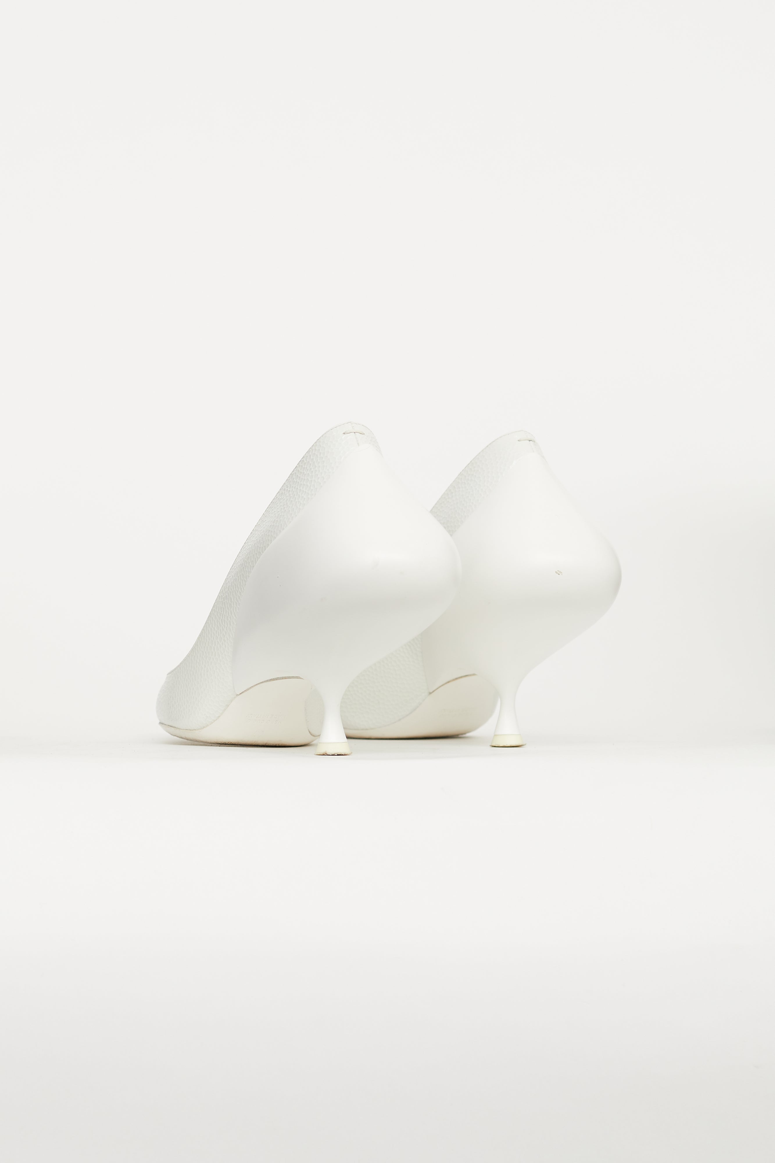 Pre-owned Maison Margiela white leather sculptural pump featuring a pointed toe, white textured leather upper, white plastic sculptural addition at counter and a spool heel.