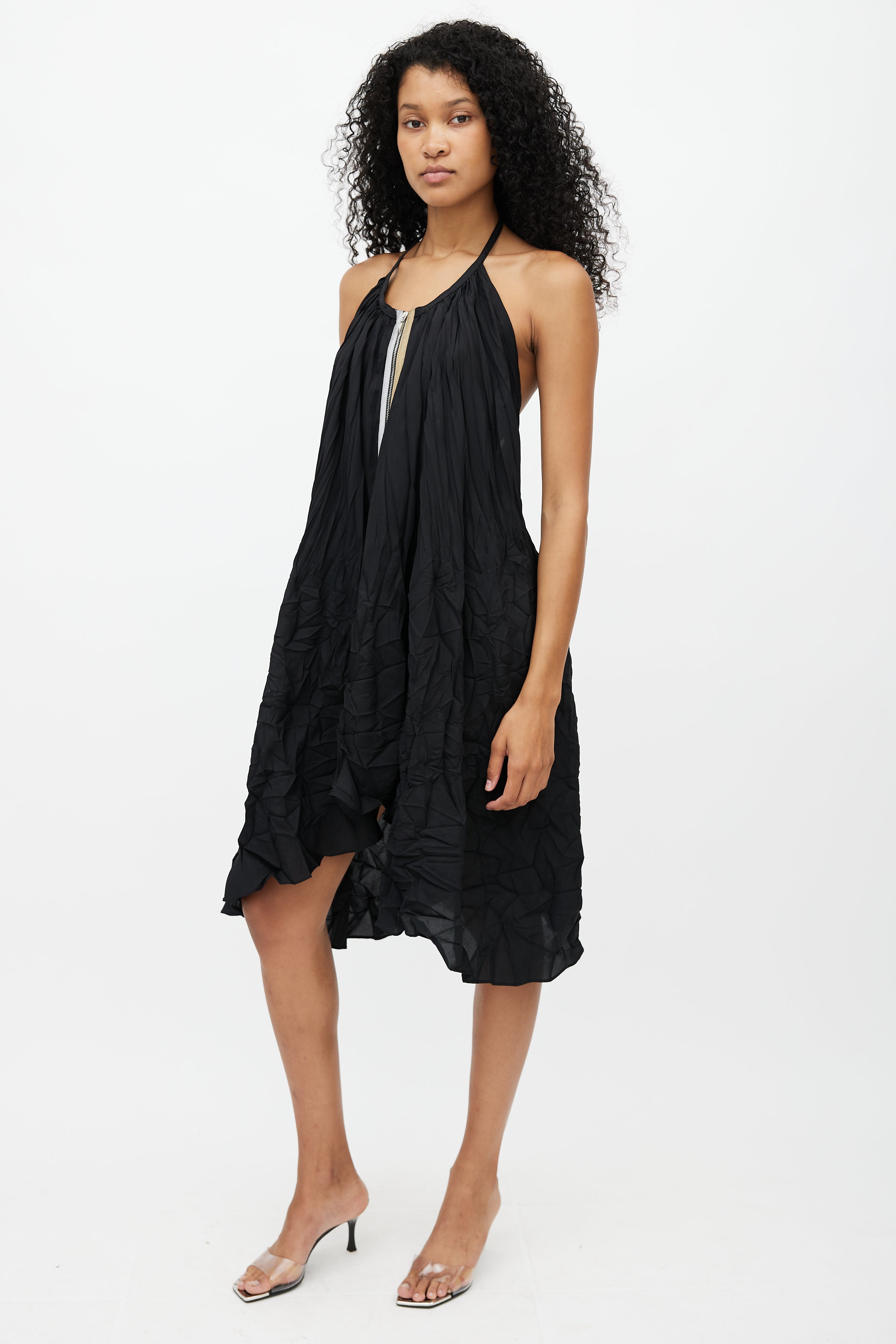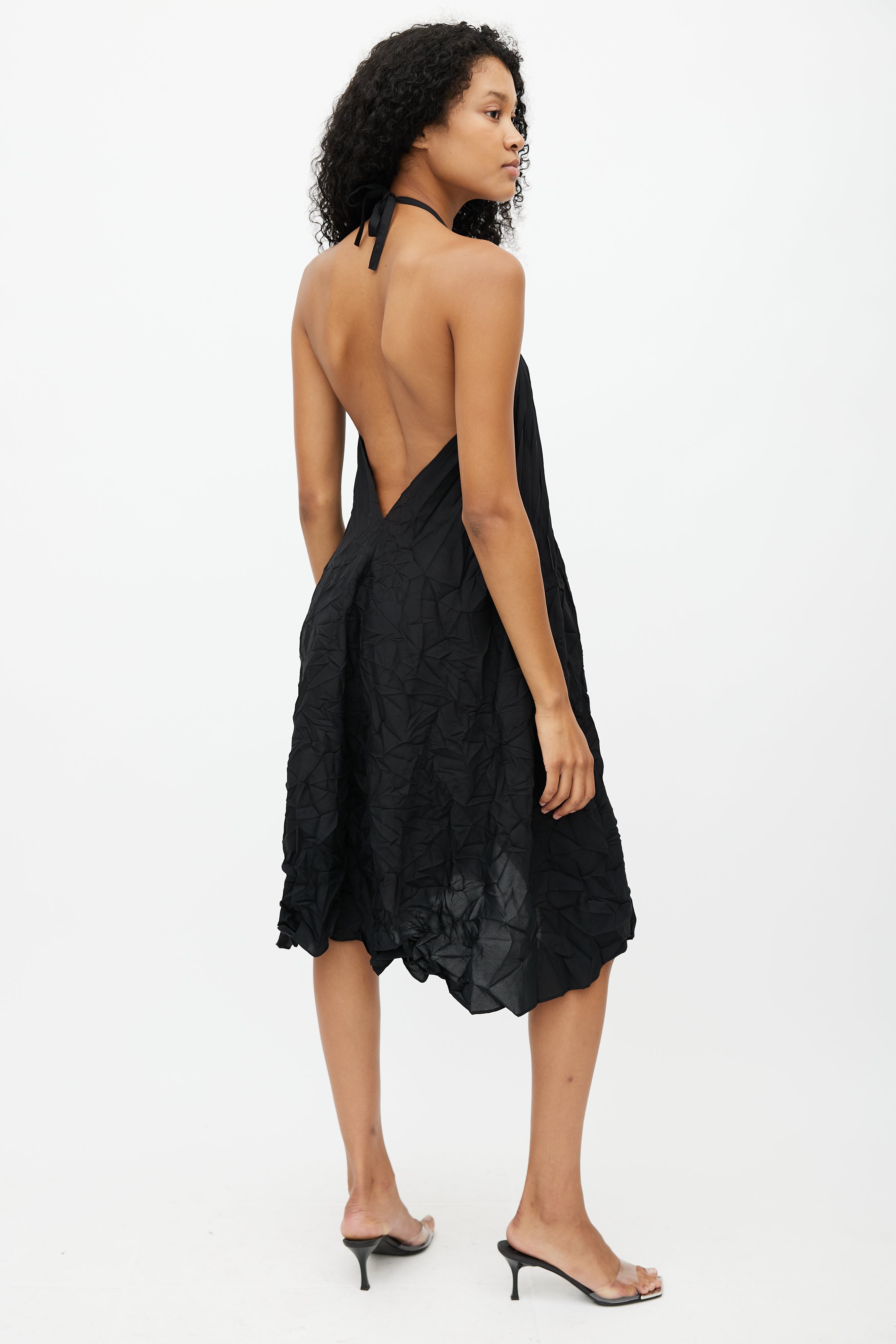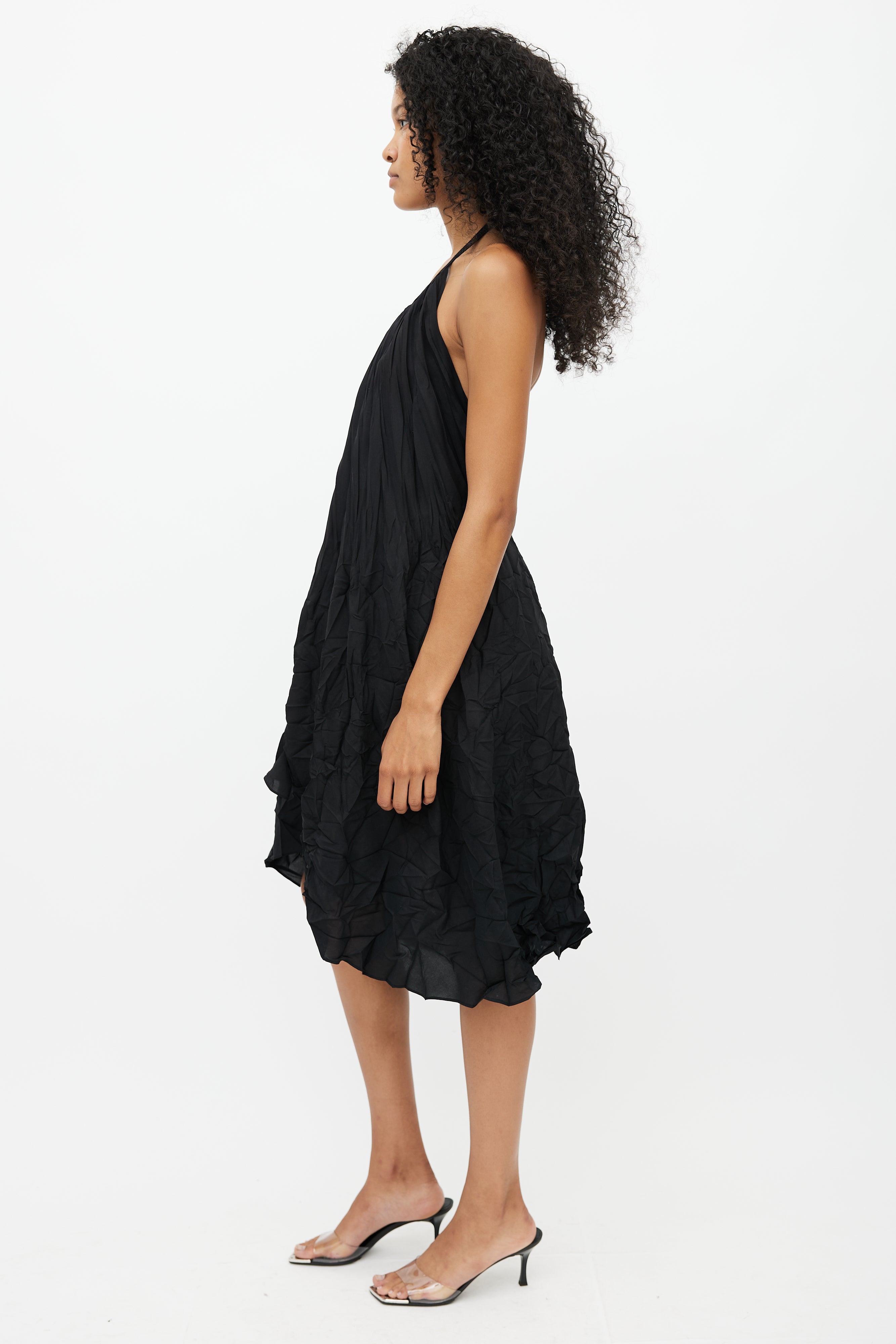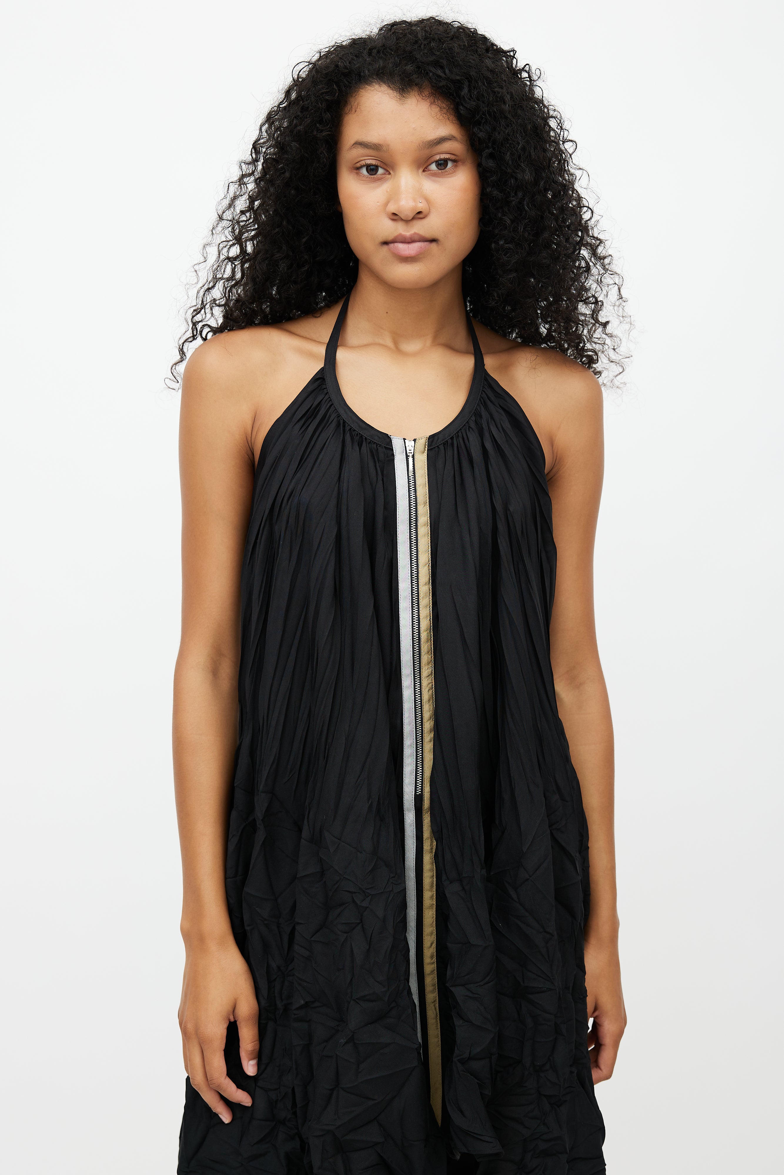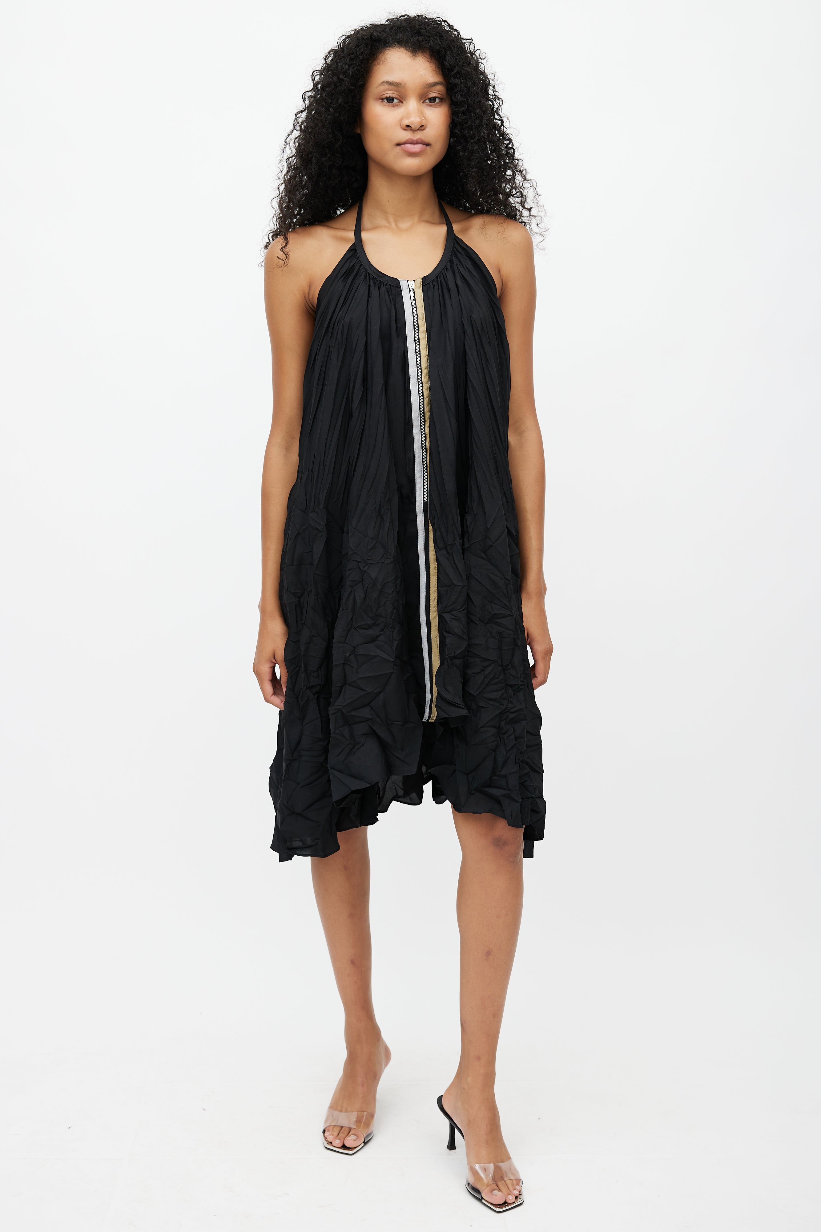 Pre-owned Marie Saint Pierre black crinkle dress featuring a halter neckline, metallic striping at chest, and silver tone zip closure at front.