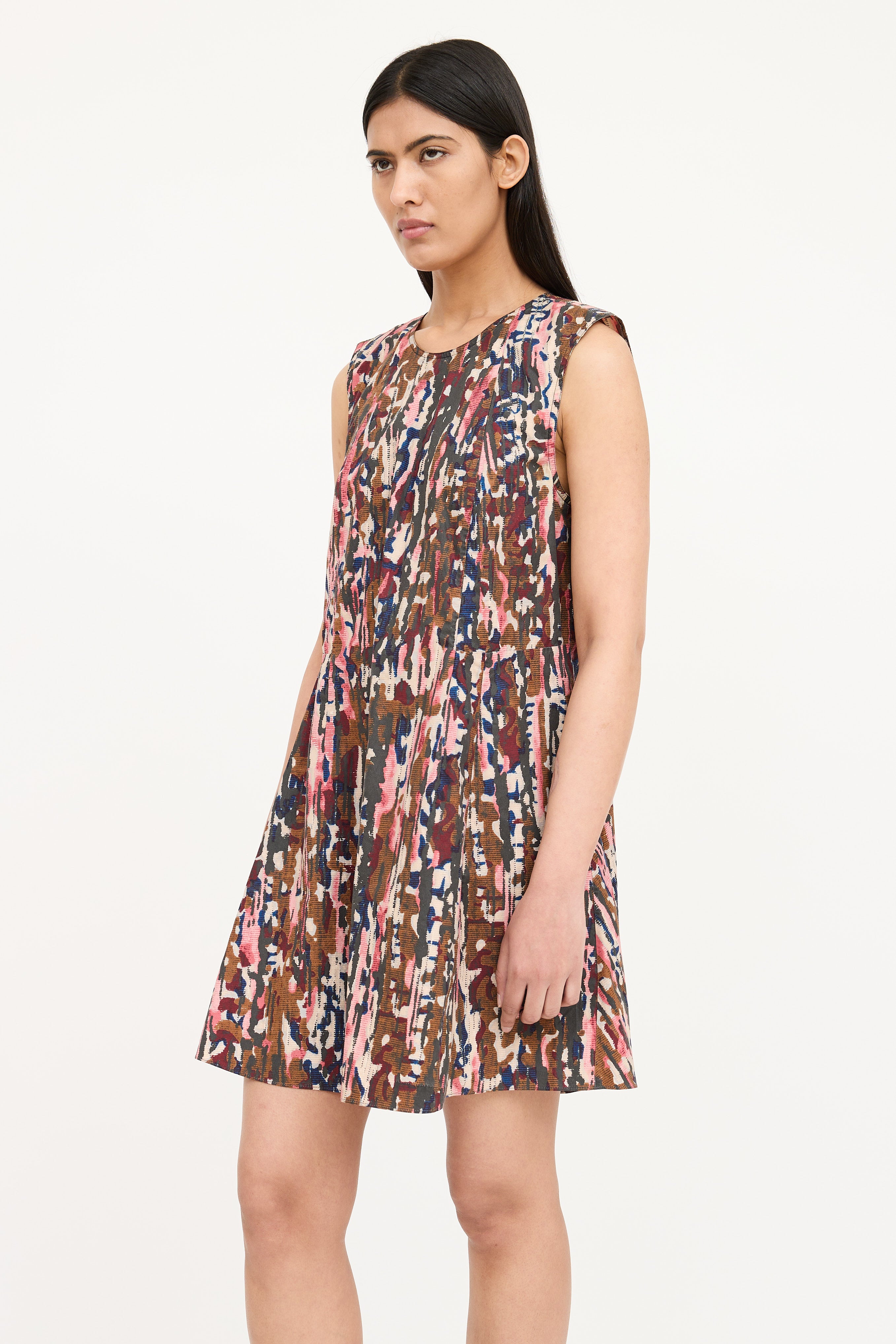 Pre-owned Marni brown and multicolor printed sleeveless dress featuring round neckline, asymmetric flare skirt at right side with vent and pleat and concealed zip at back. Unlined.