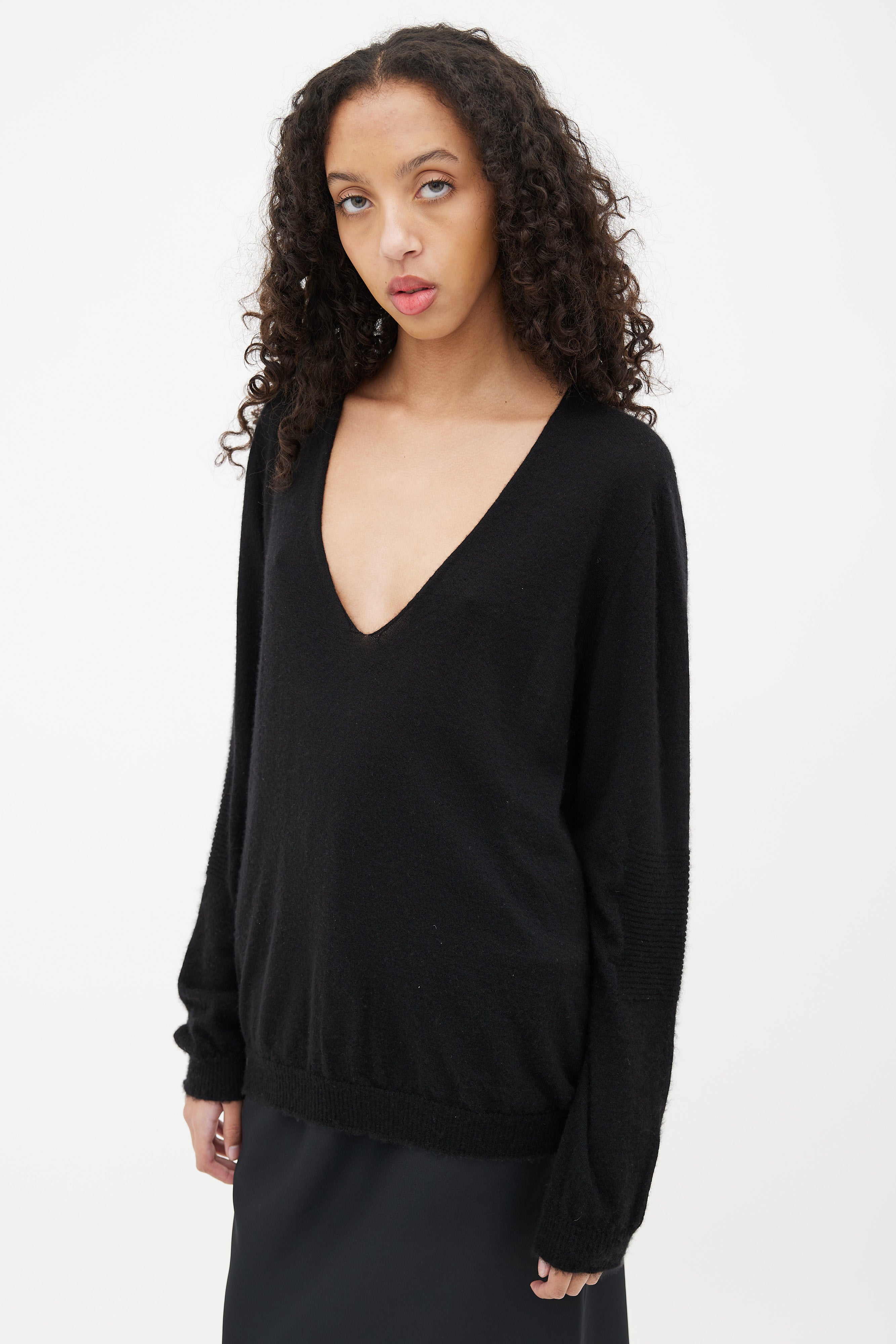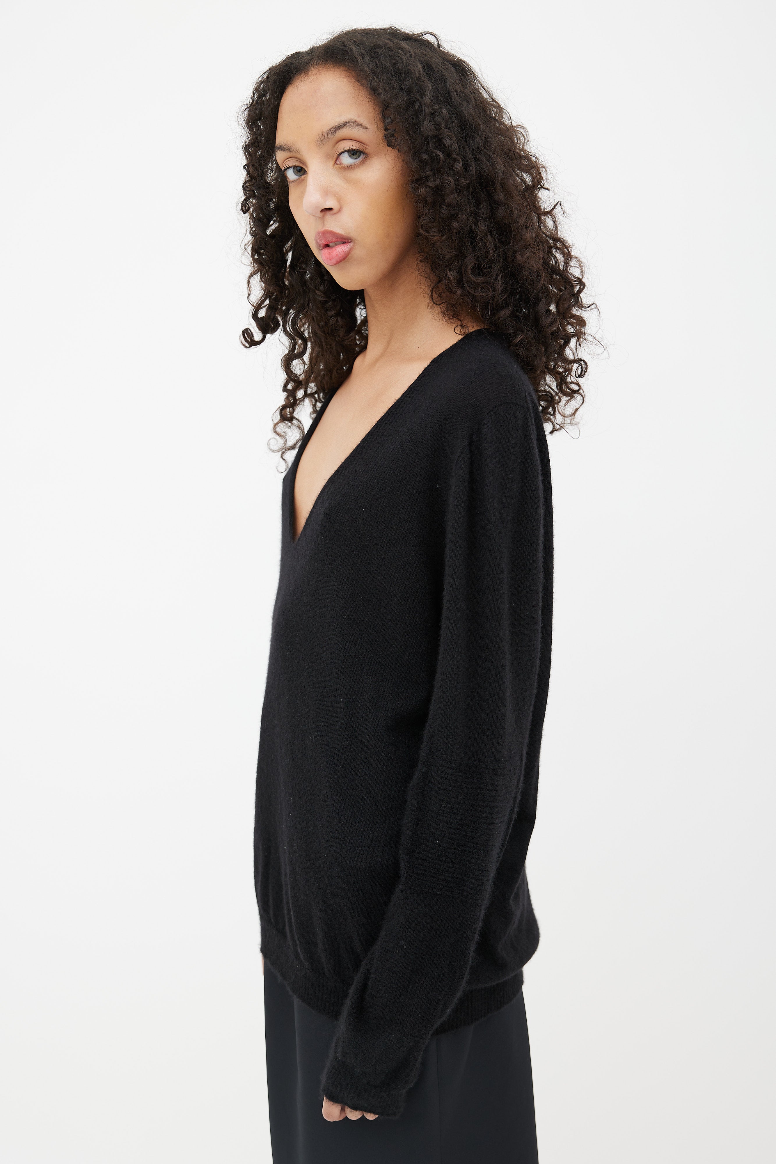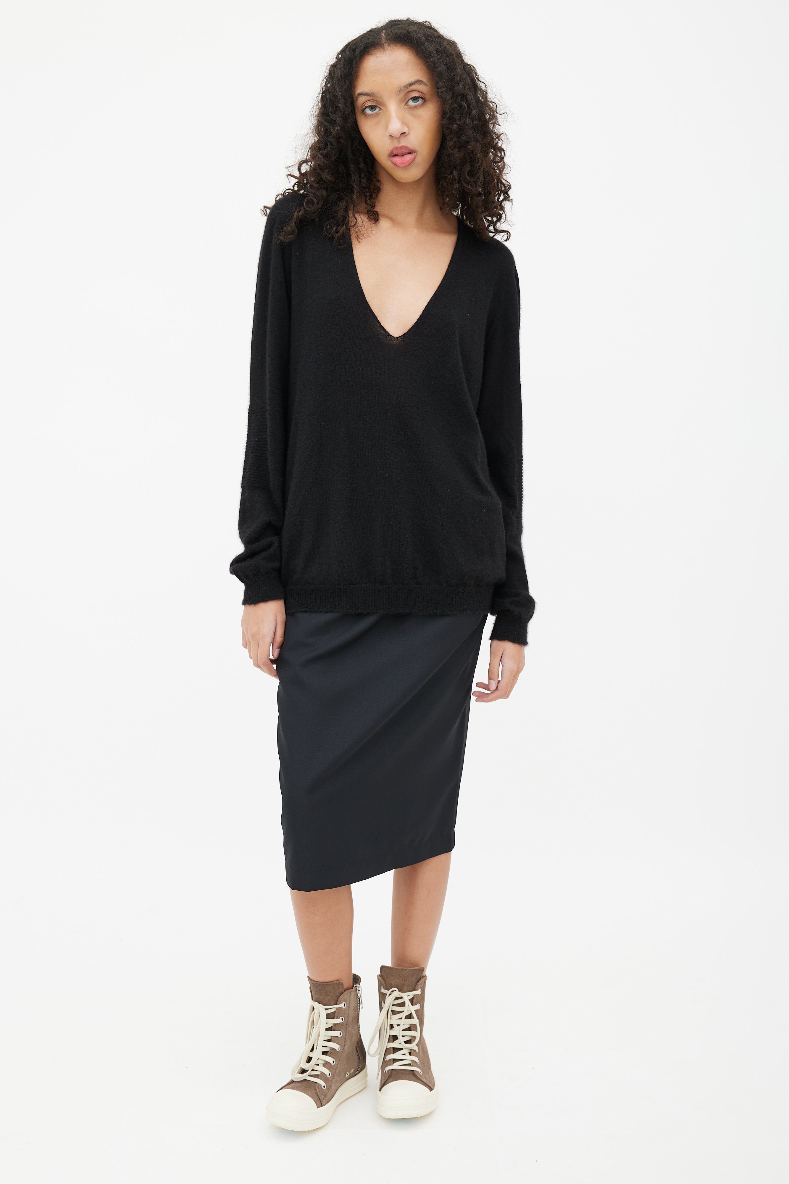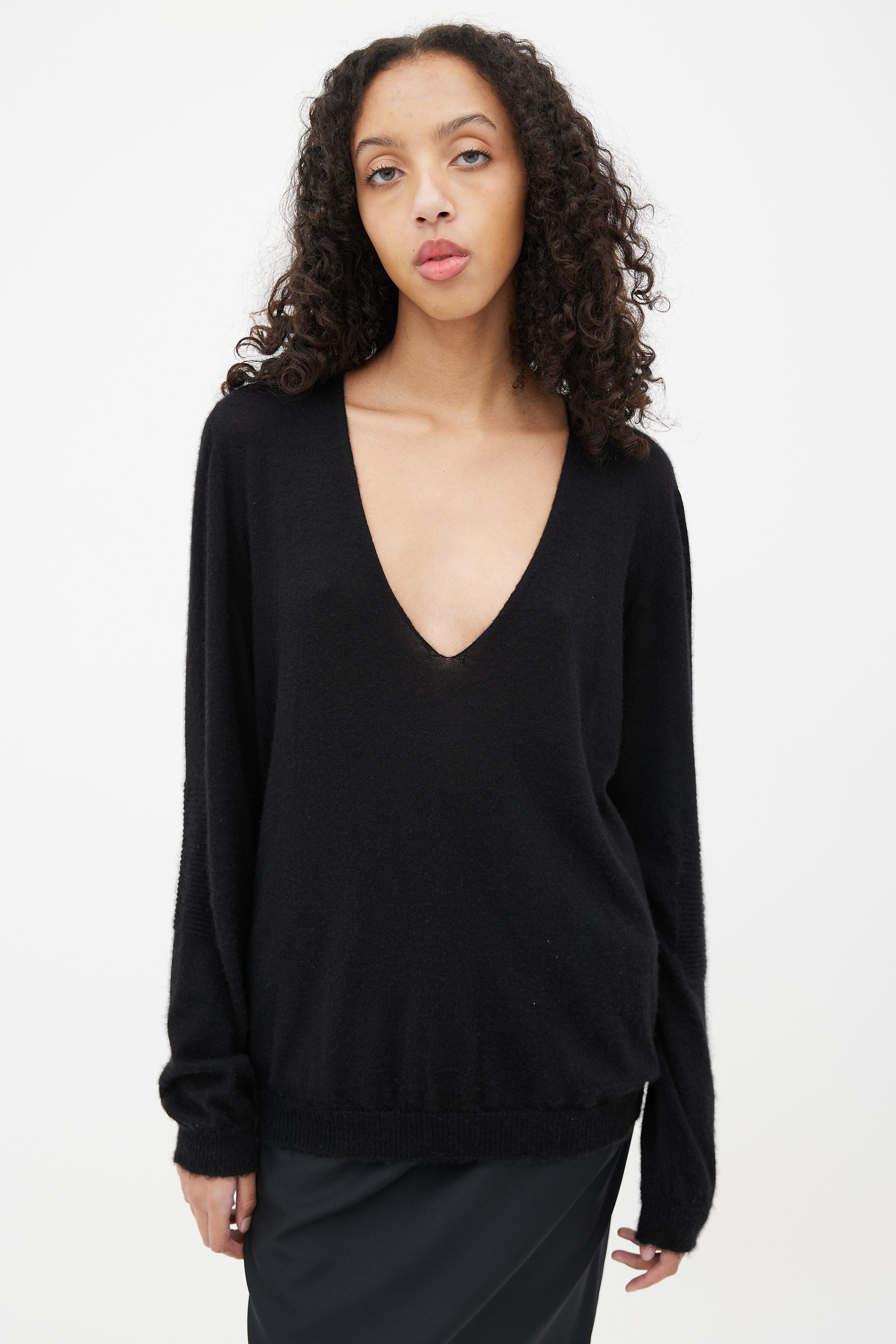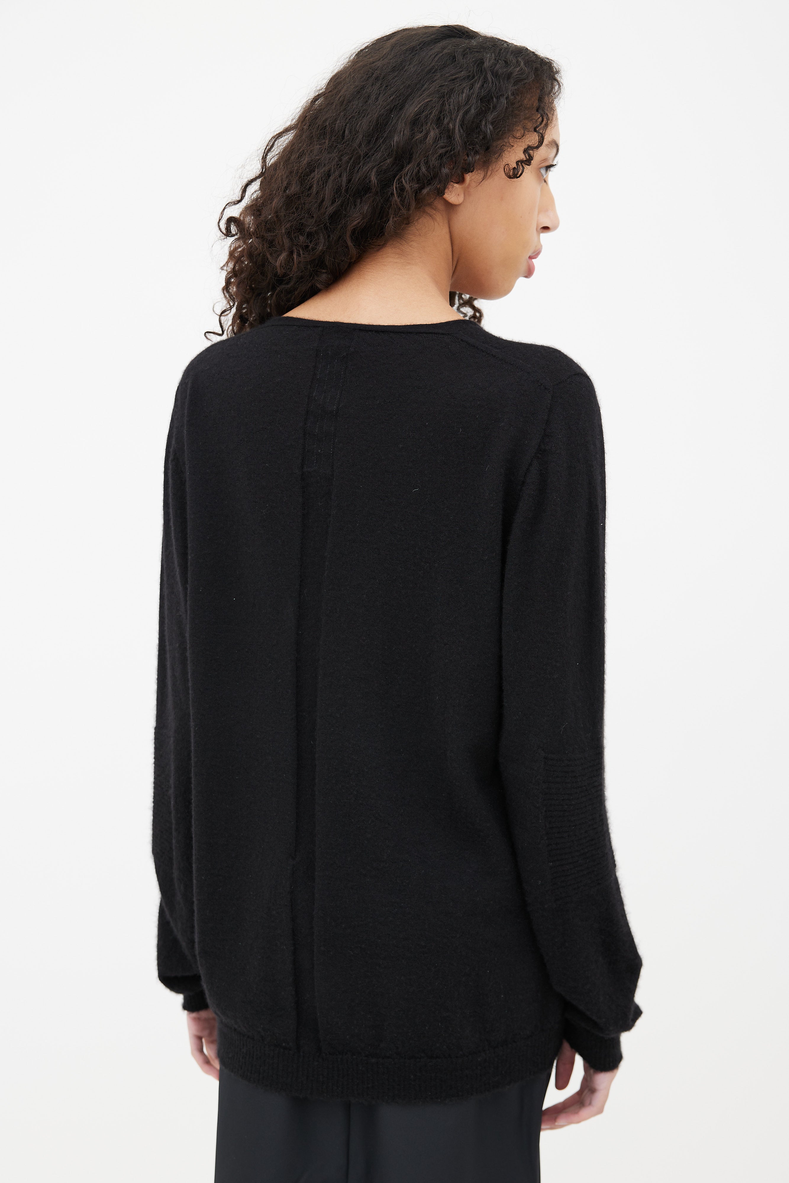 Pre-owned Rick Owens black V-neck cashmere sweater featuring long sleeves with elasticated cuffs, elasticated ruffled hem and a rolled hem V-neckline.