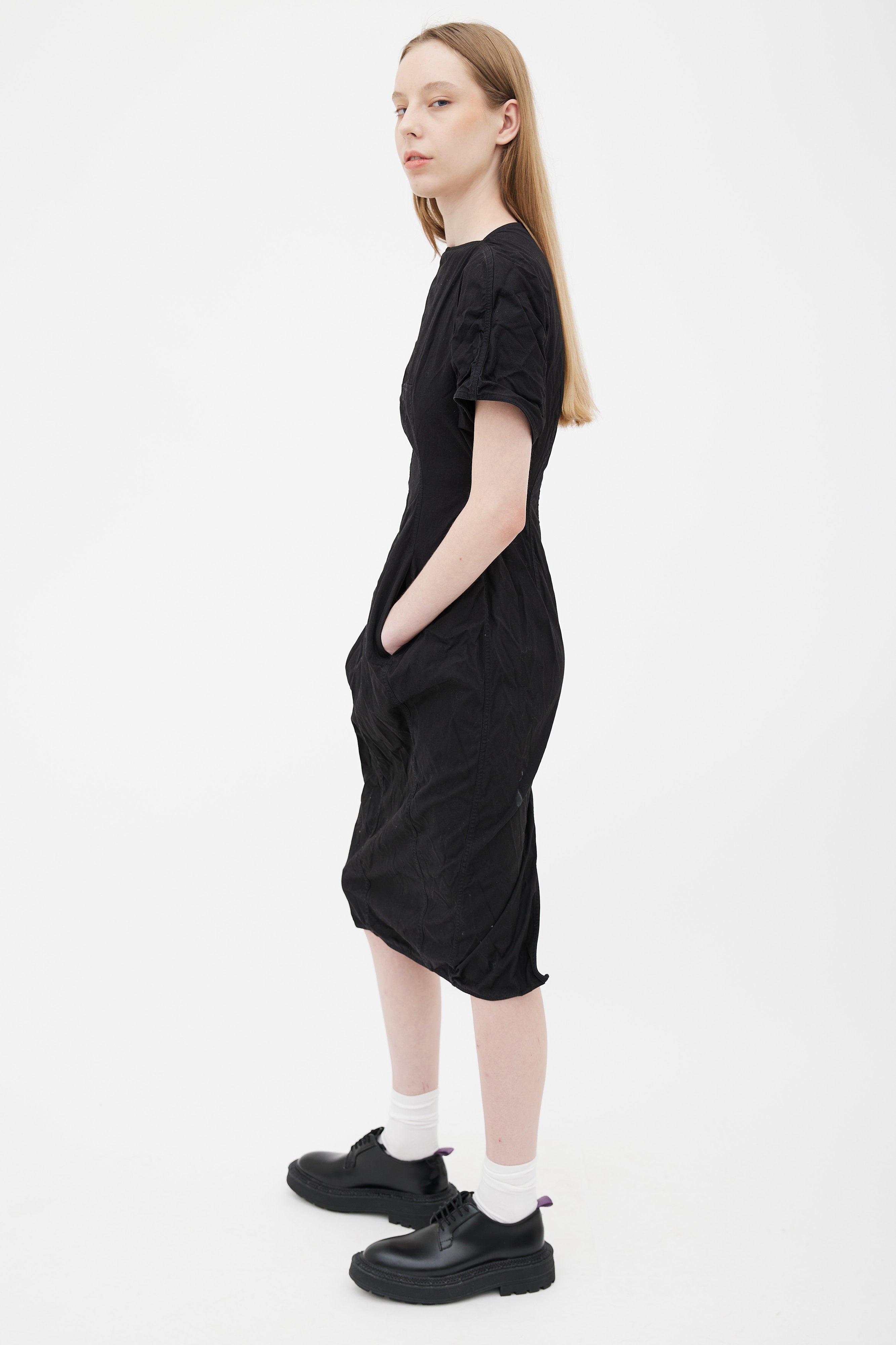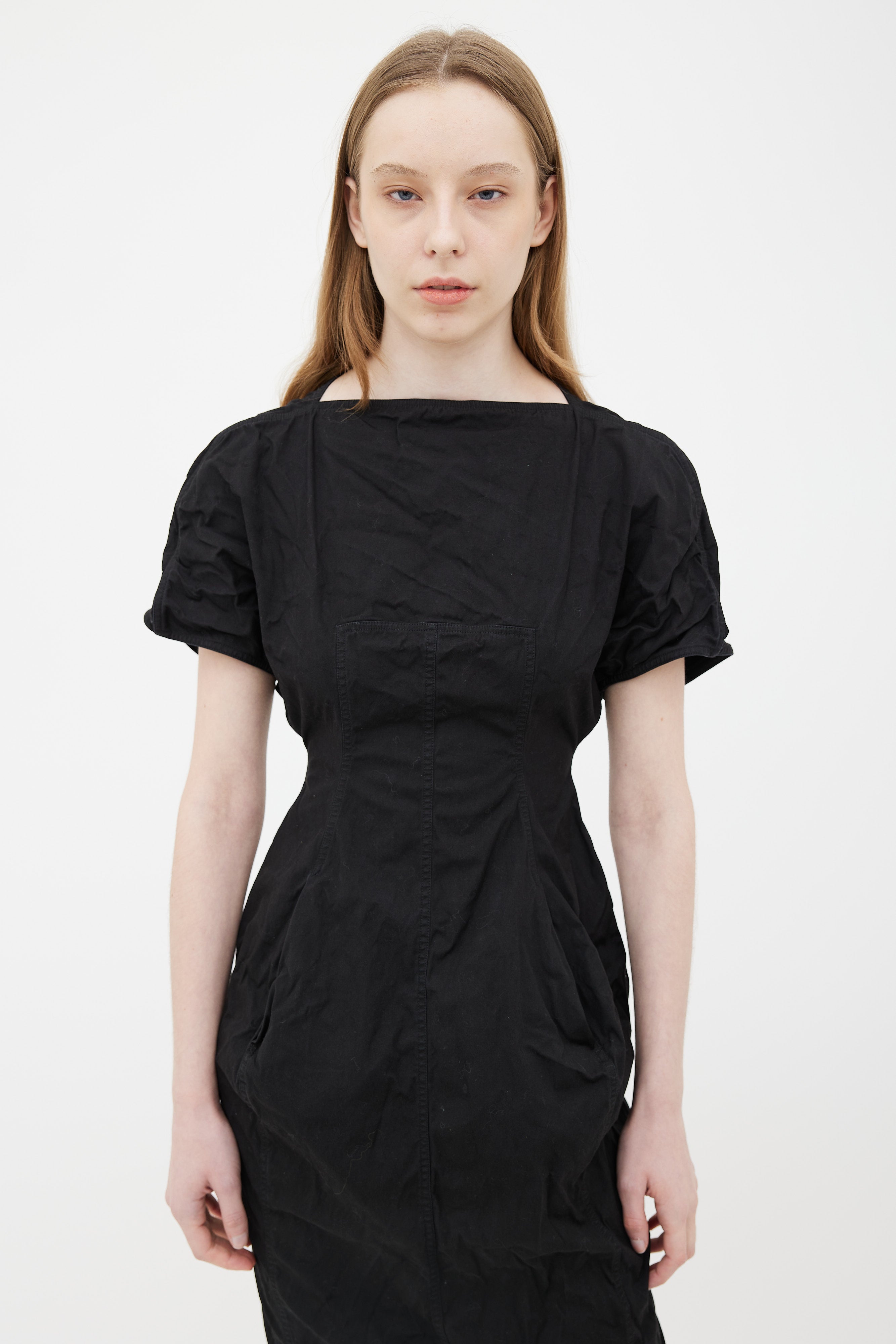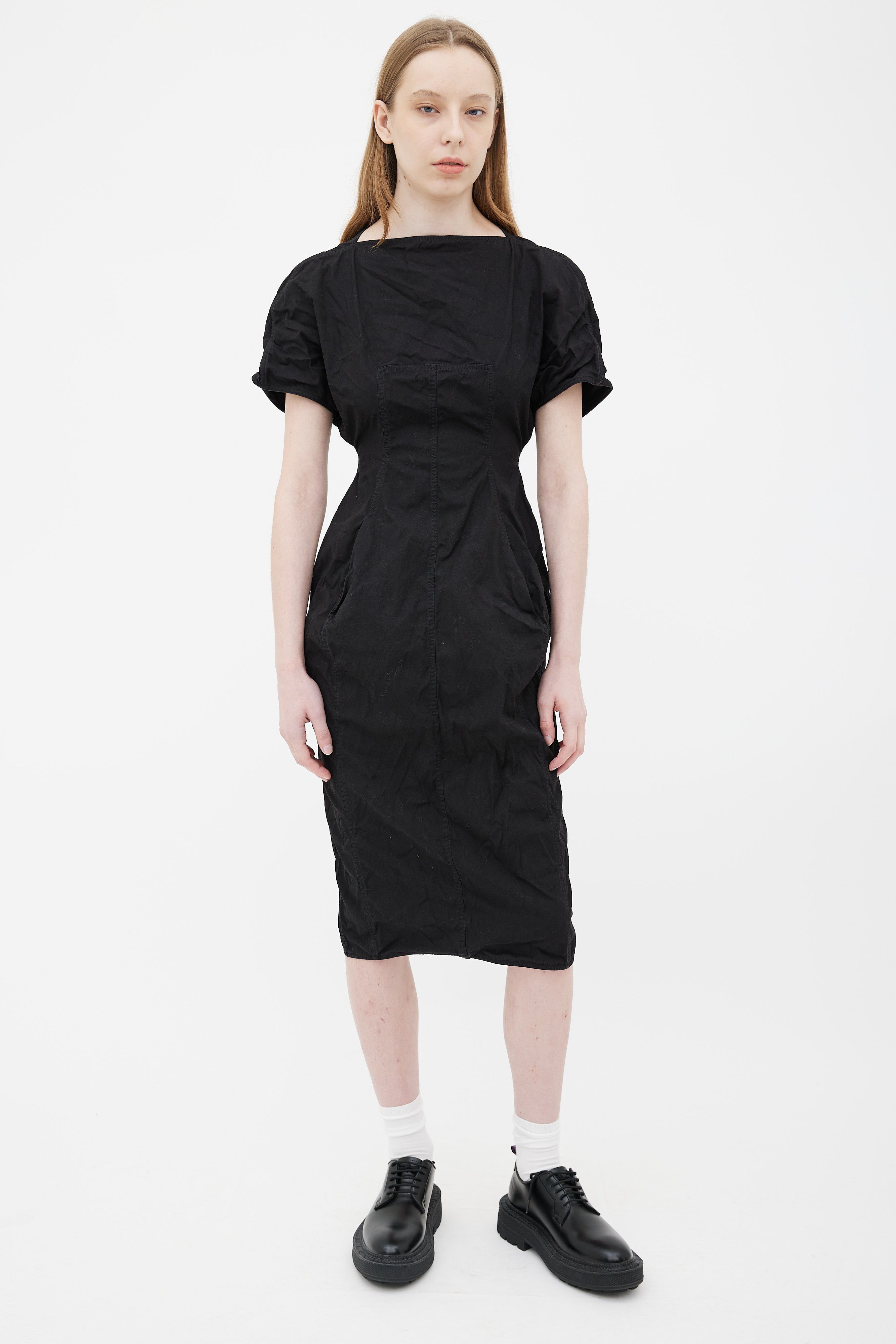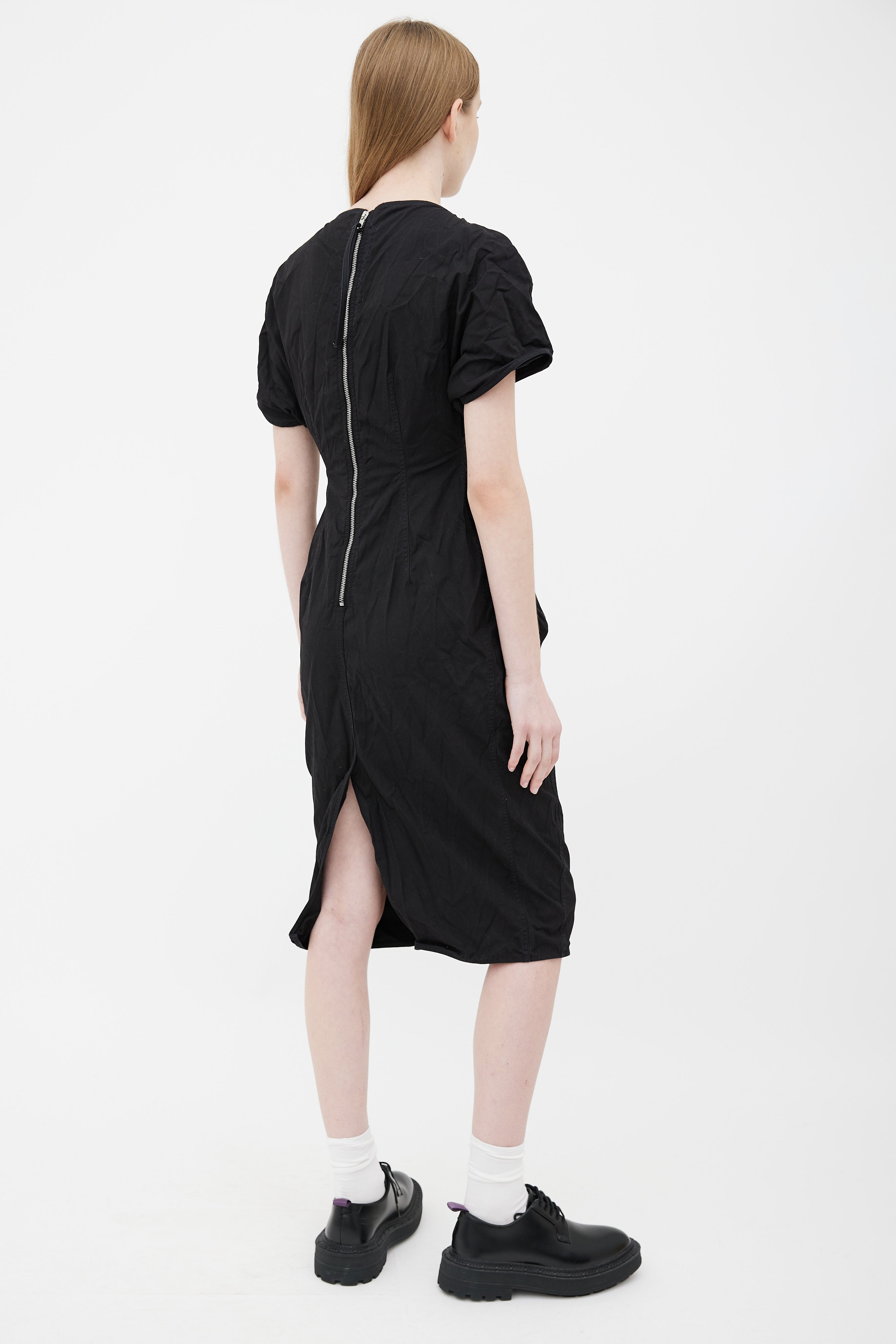 Pre-owned S/S 2018 Rick Owens dress in black featuring dolman short sleeve styling, boat neckline, exposed silver-tone zipper closure at back, mid length, slit at back, and tonal stitching throughout. From the Dirt S/S 2018 collection.