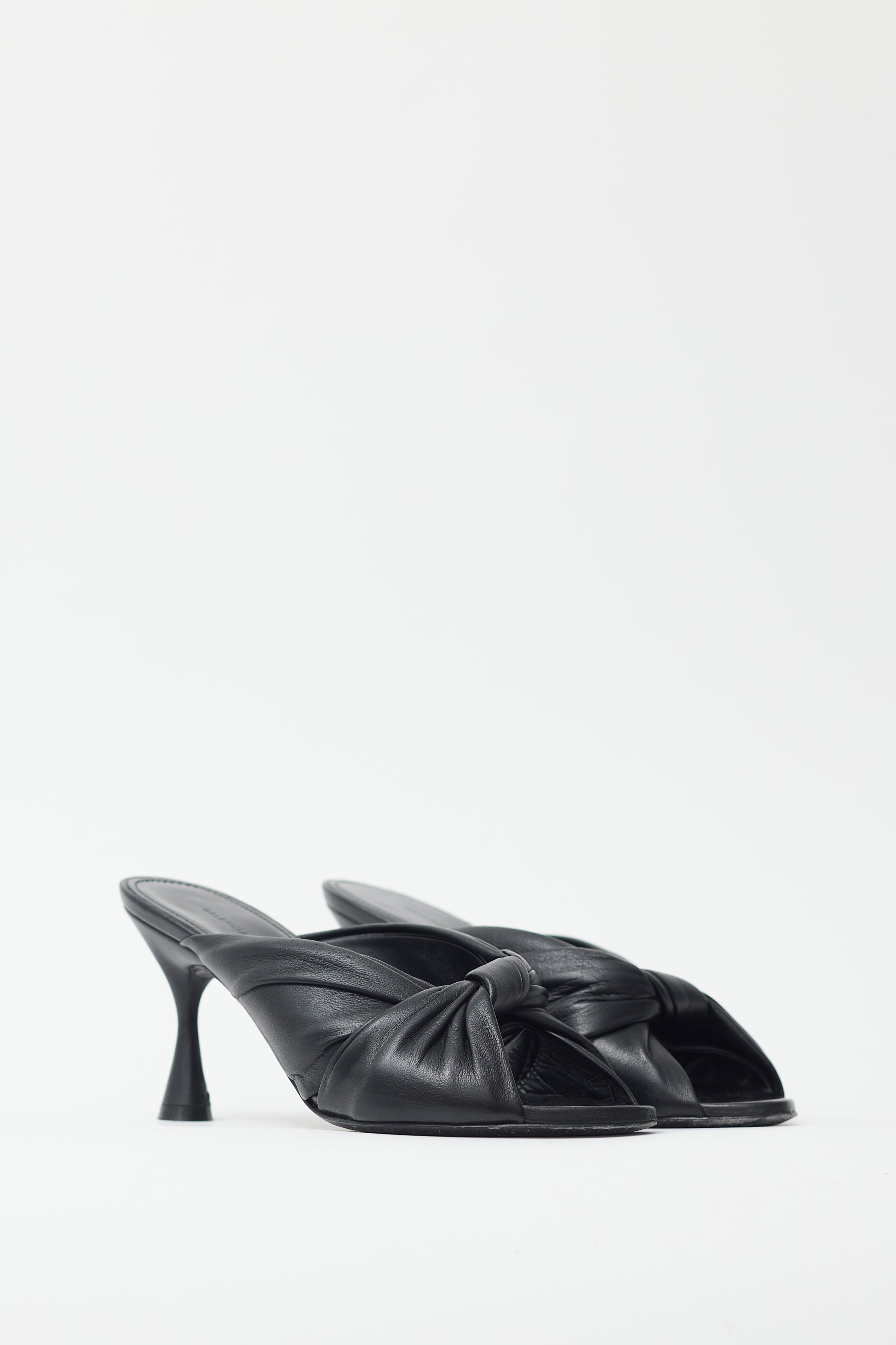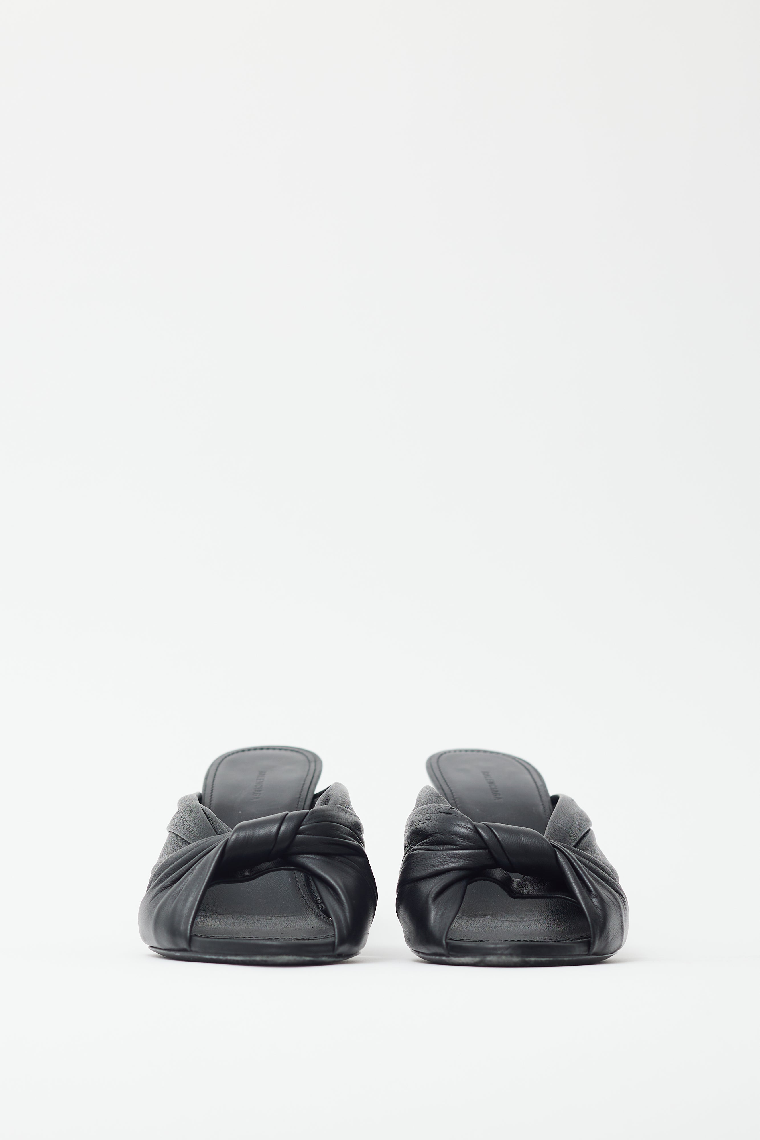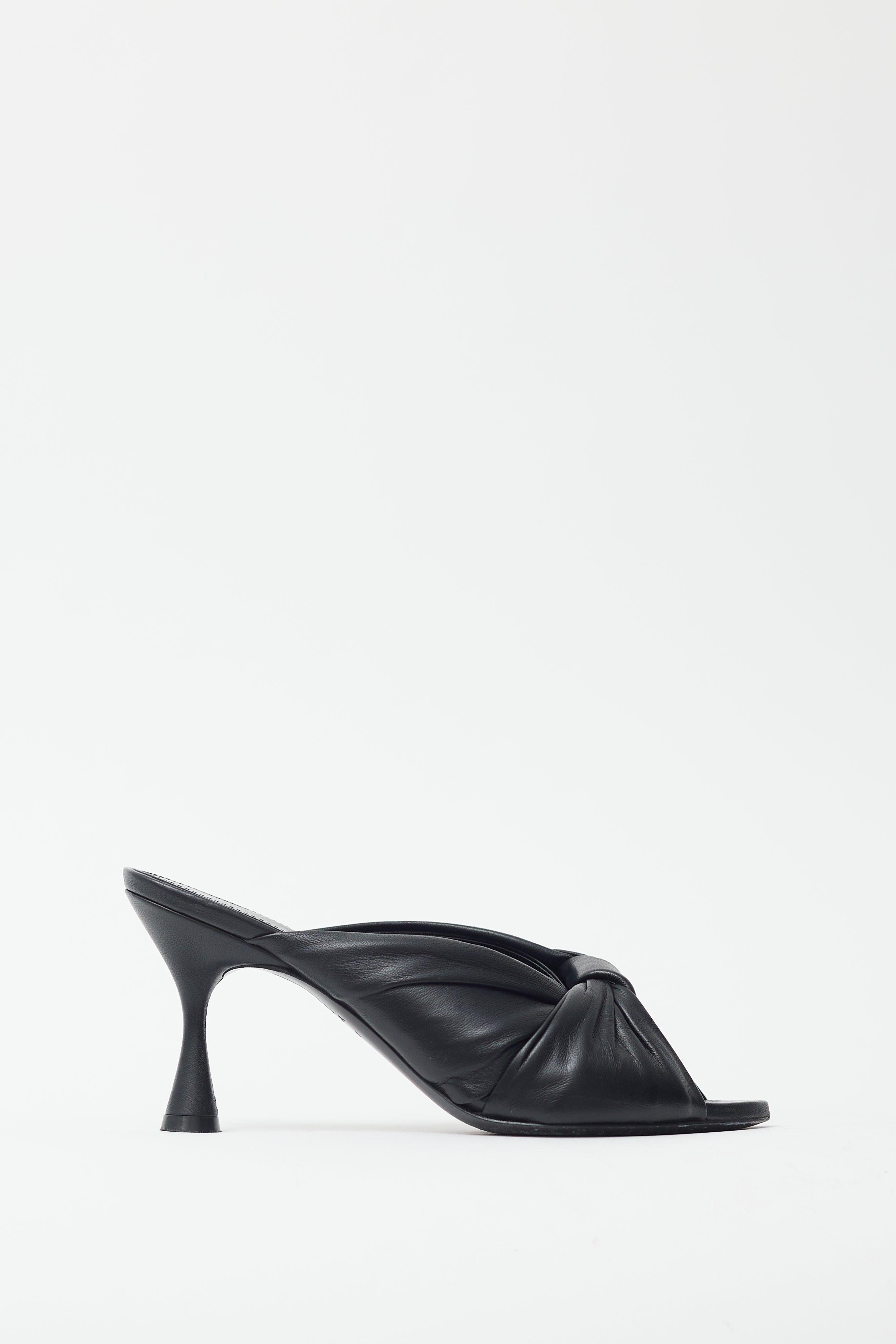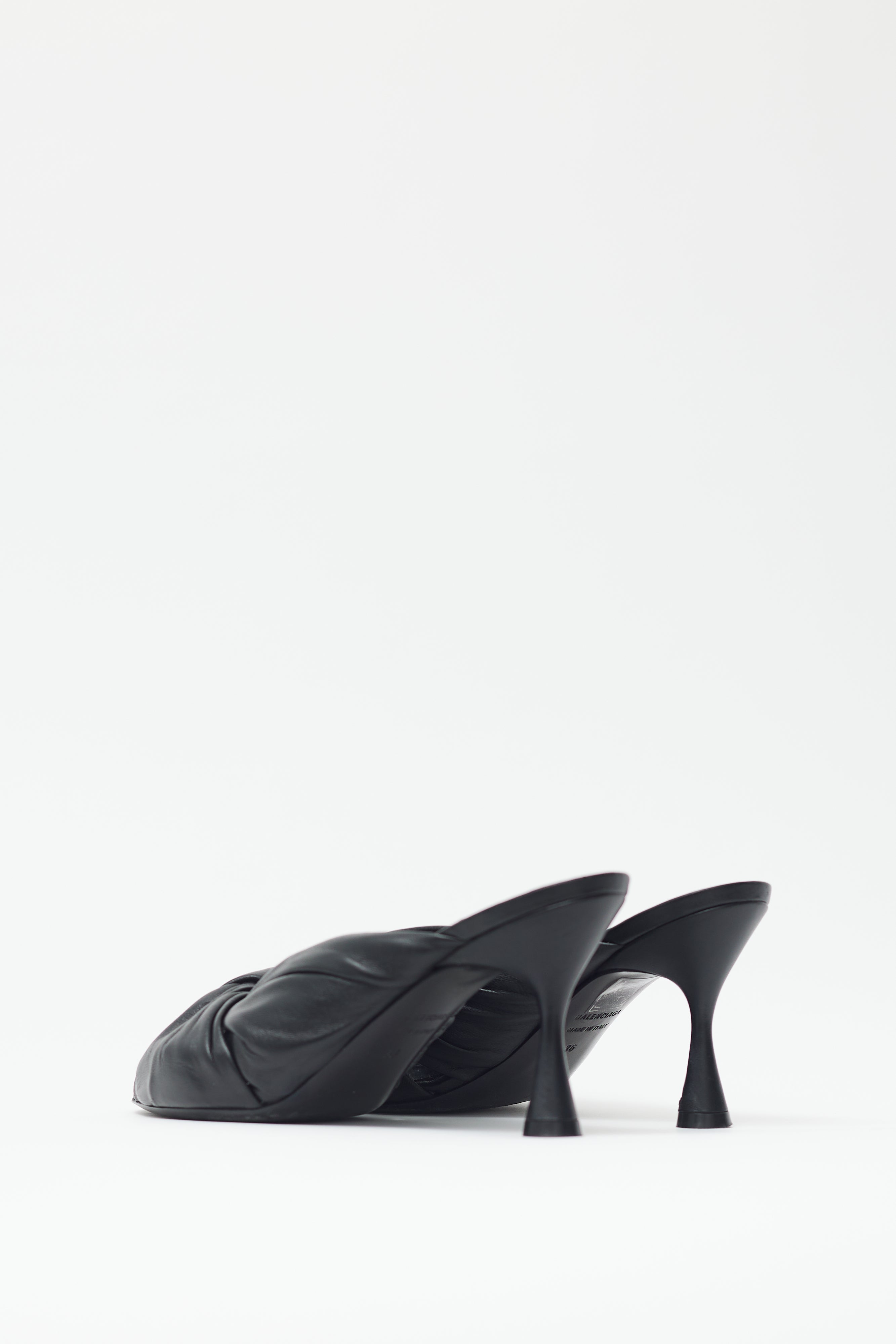 Pre-owned Balenciaga black leather mule featuring a rounded toe, twist styling at vamp, slip on entry, and fluted heel.
