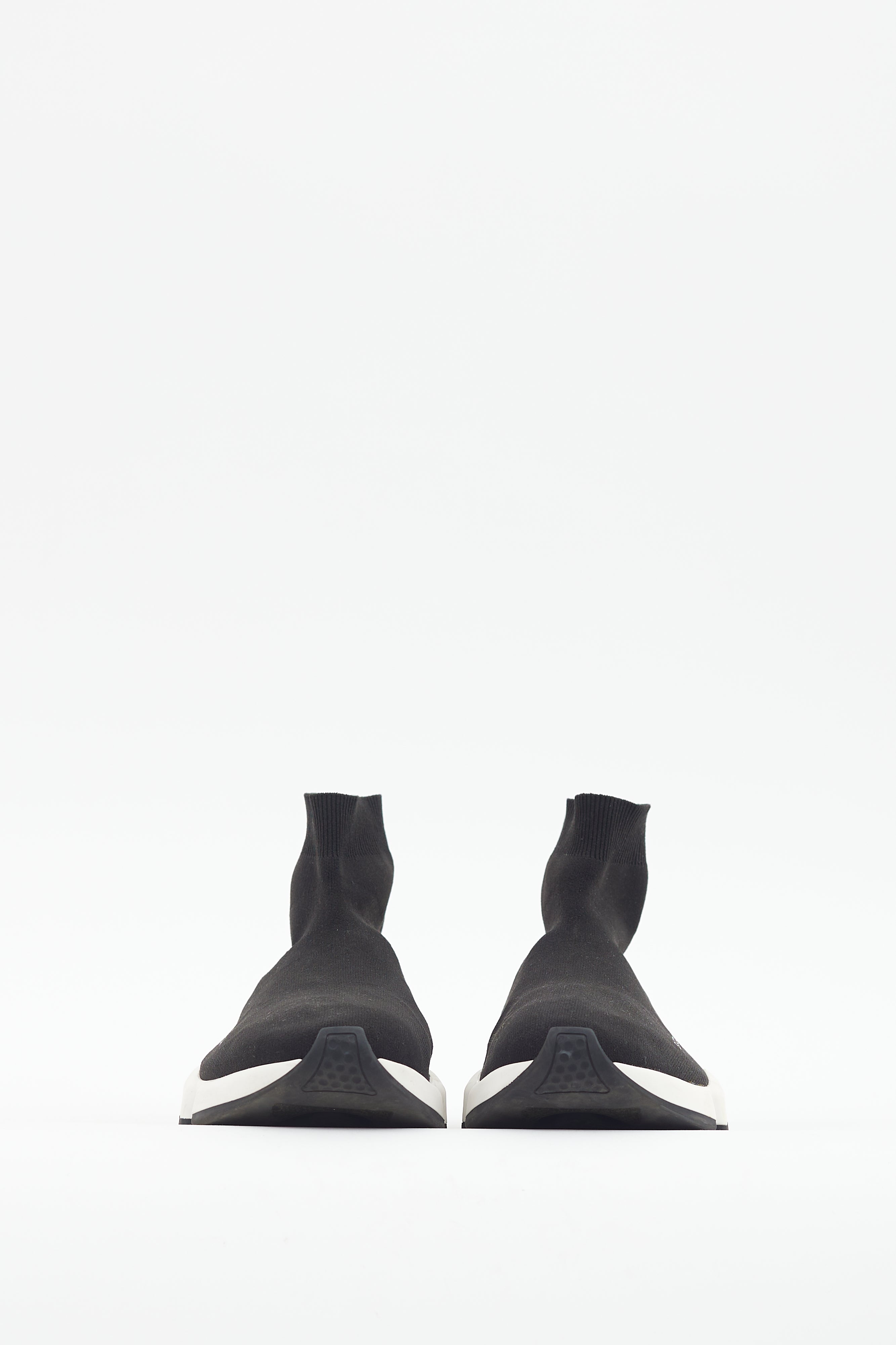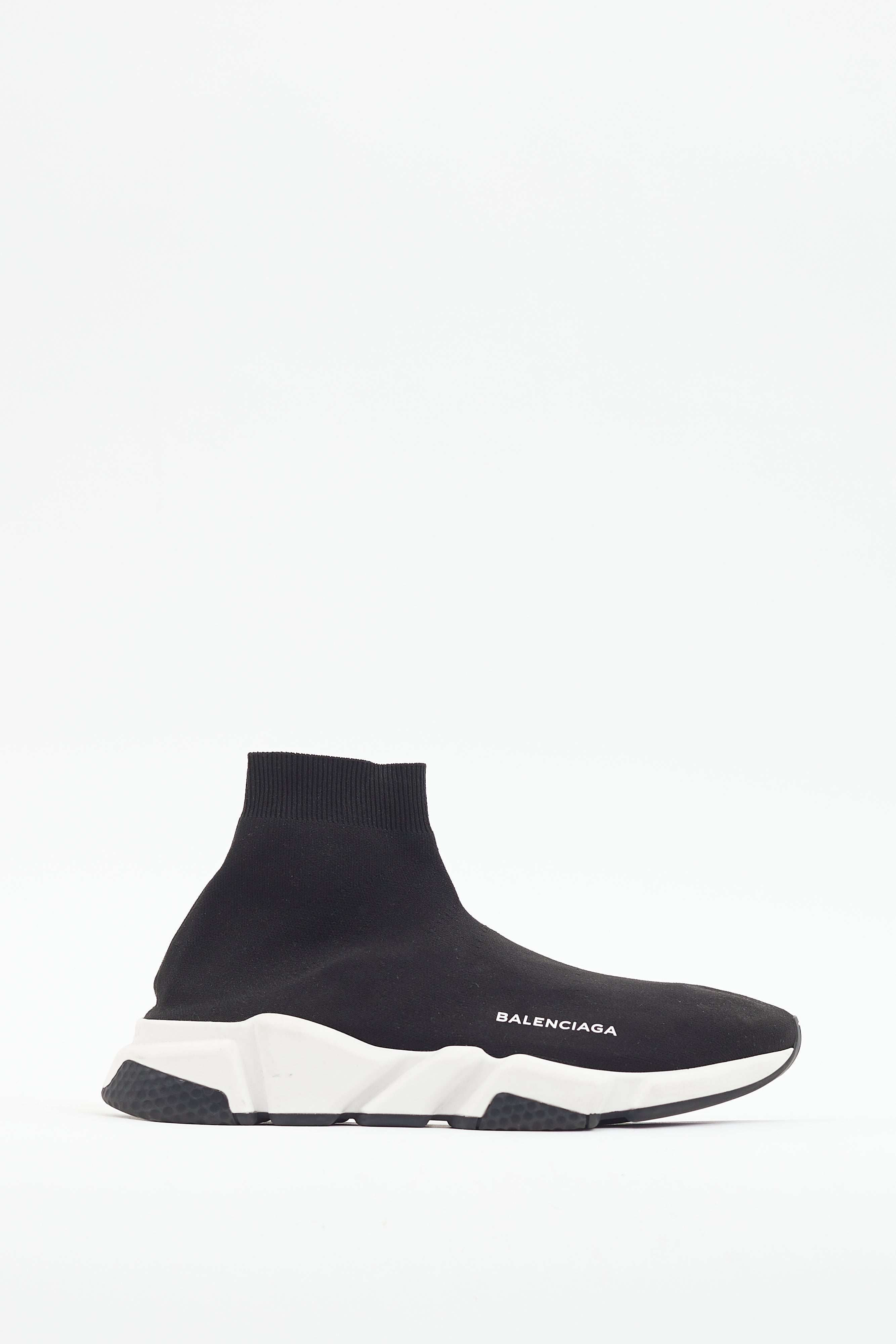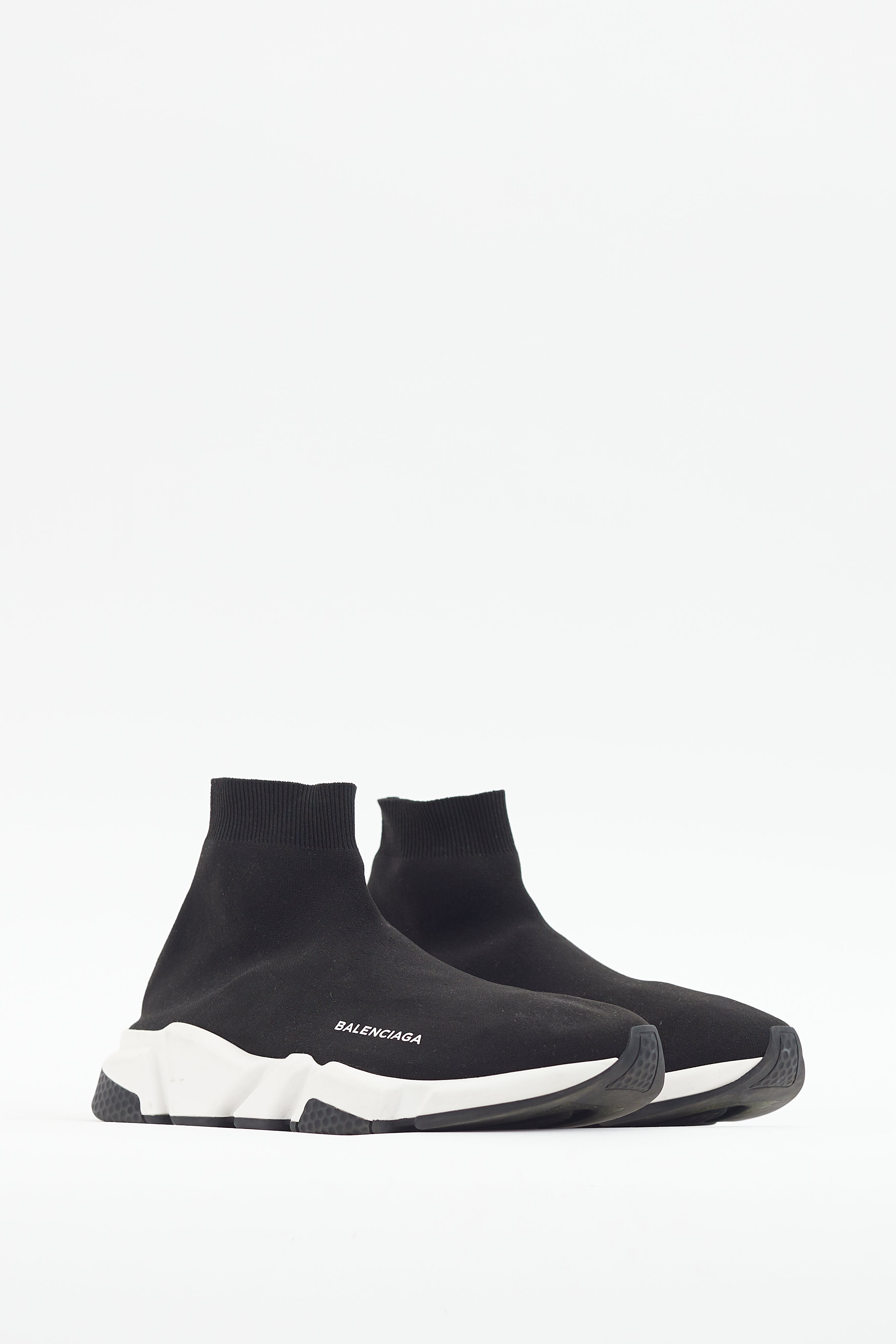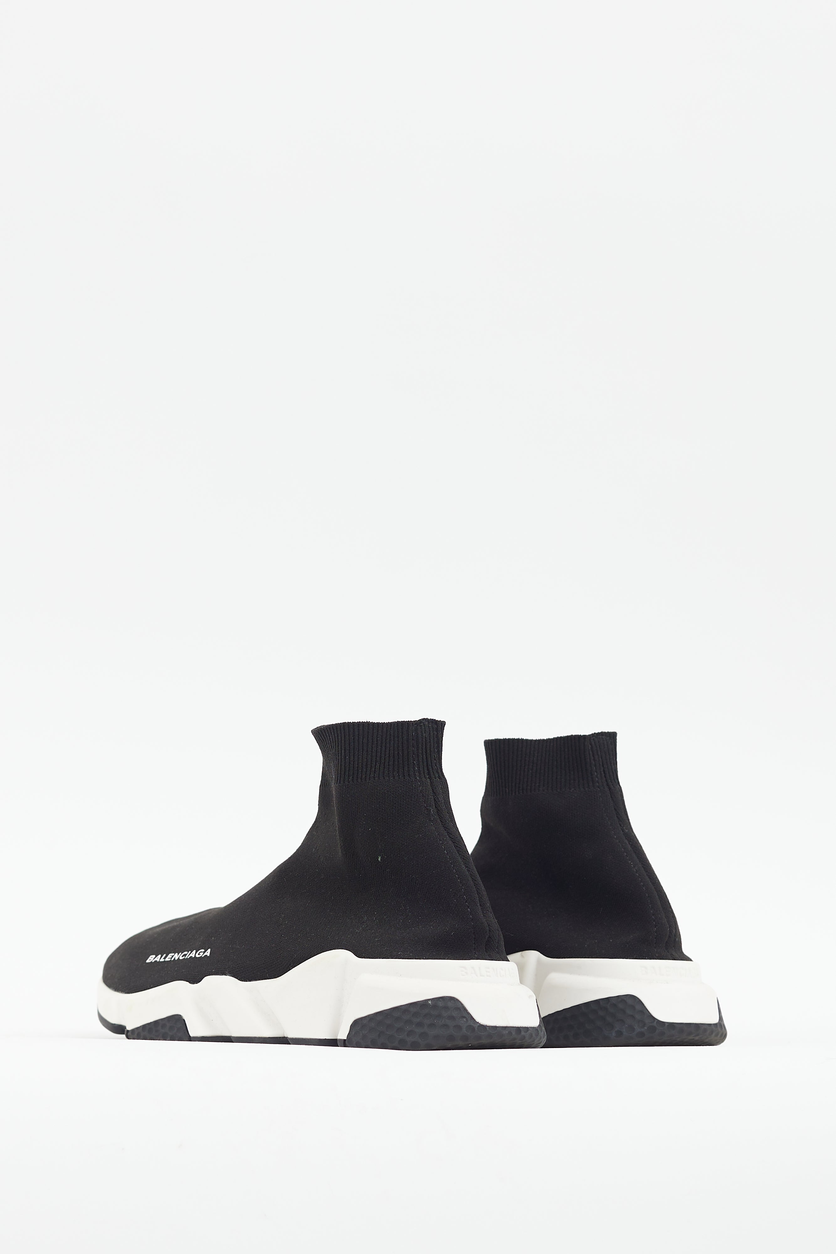 Pre-owned Balenciaga black Speed knit sneakers featuring a rounded toe, textile uppers with printed logo at mudguard, and white rubber sole with debossed logo at heel.
