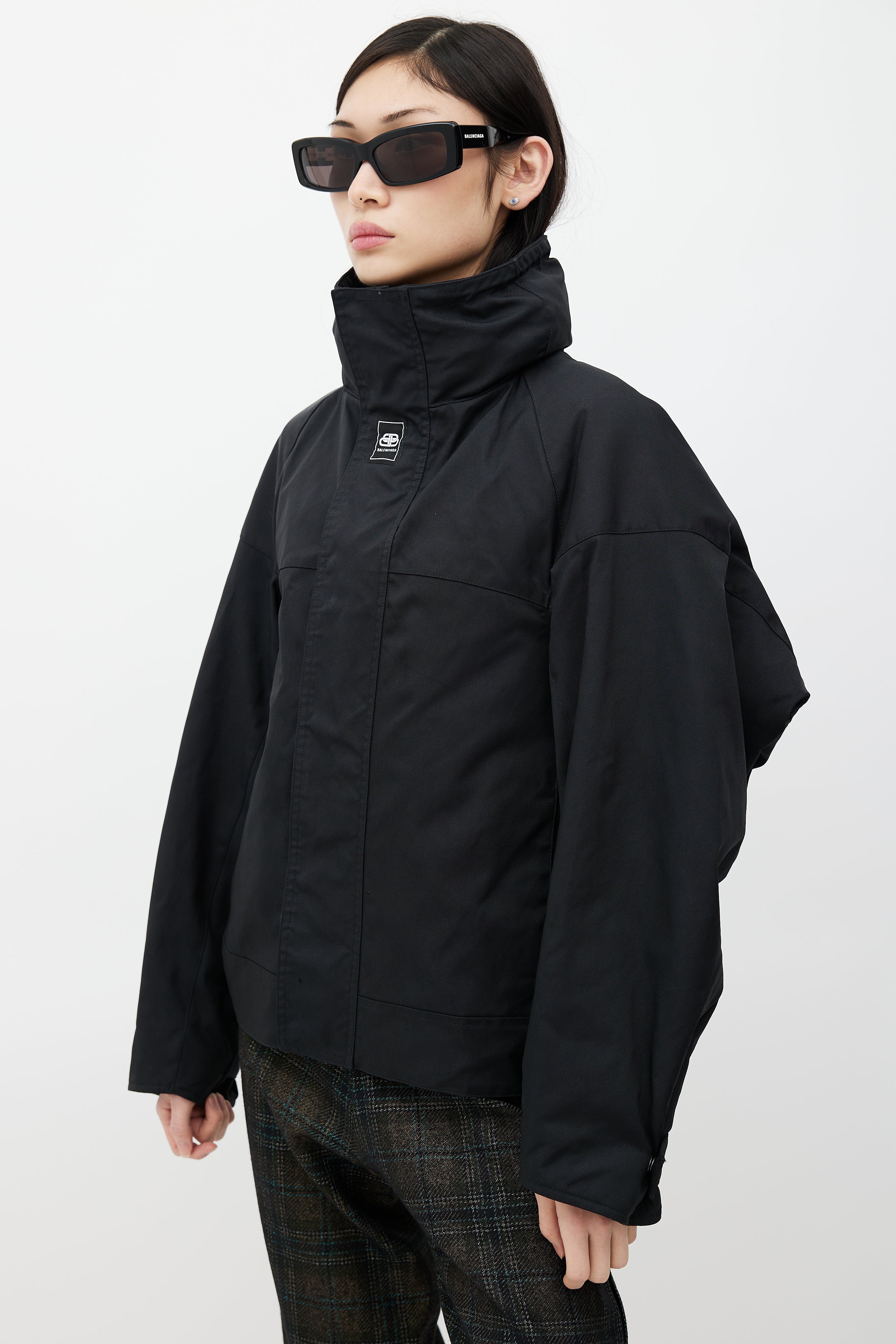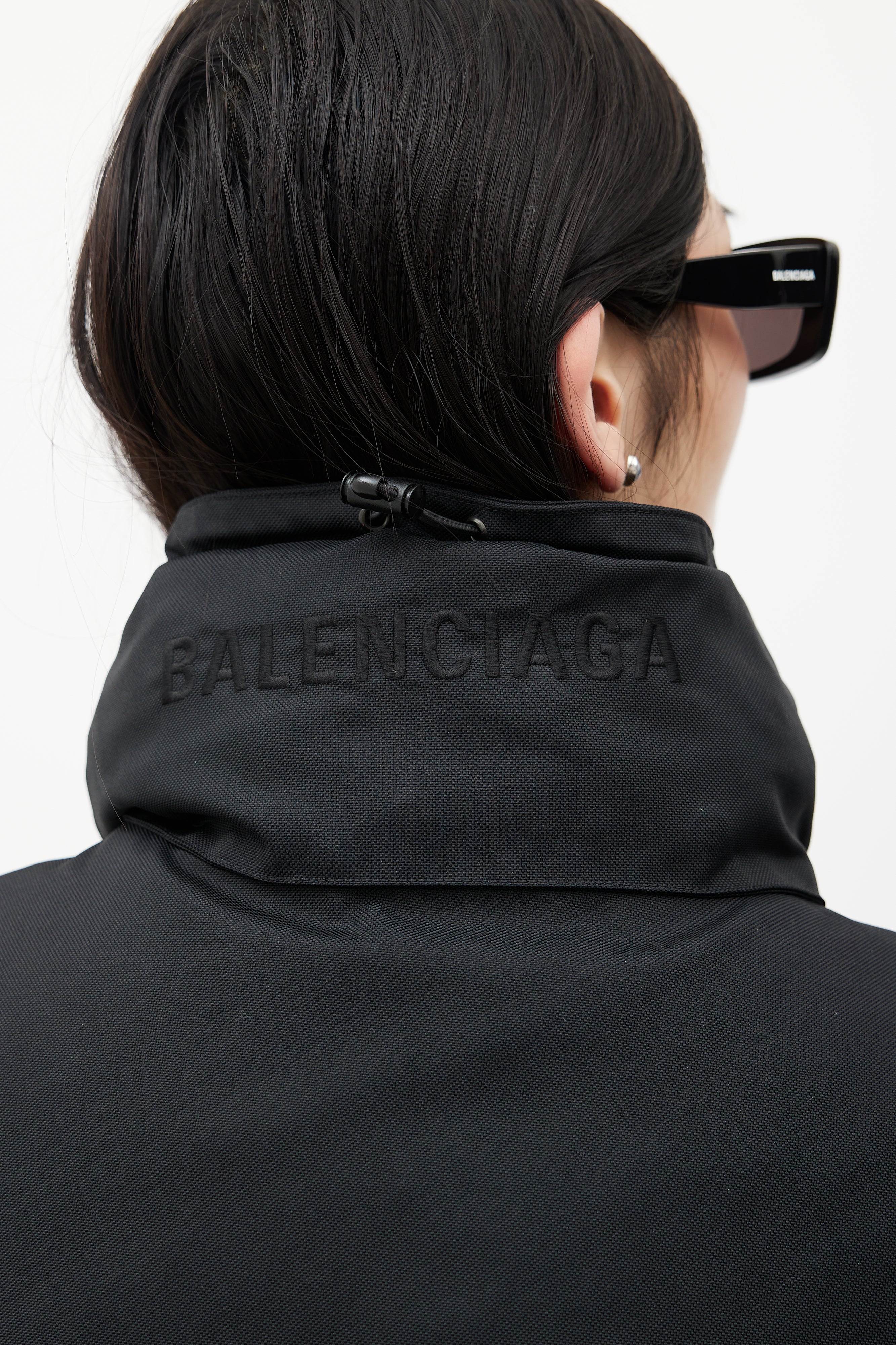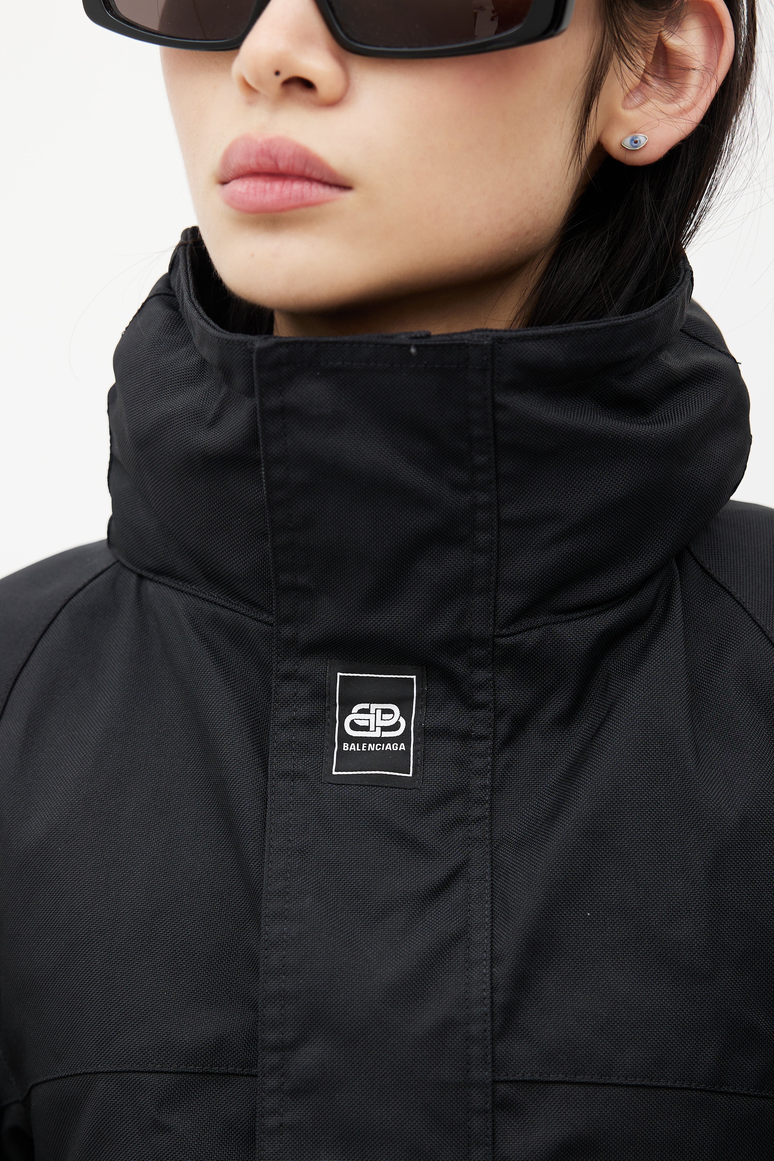Pre-owned Balenciaga black Upside Down technical jacket featuring a mock neck collar with concealable hood, embroidered logo at back of neck, logo patch at chest, cargo pocket at arm, long sleeves with buttoned cuffs, two slip pockets at hip, high low drawstring hem, and zip closure. Lined.
