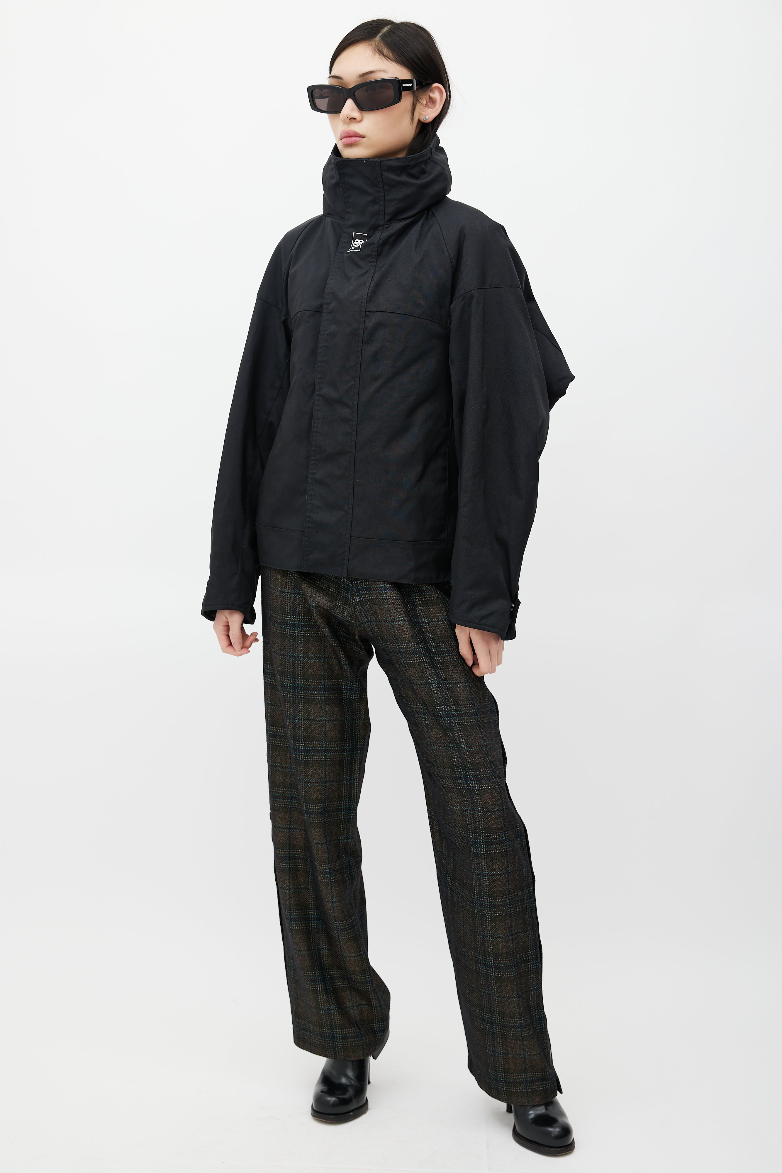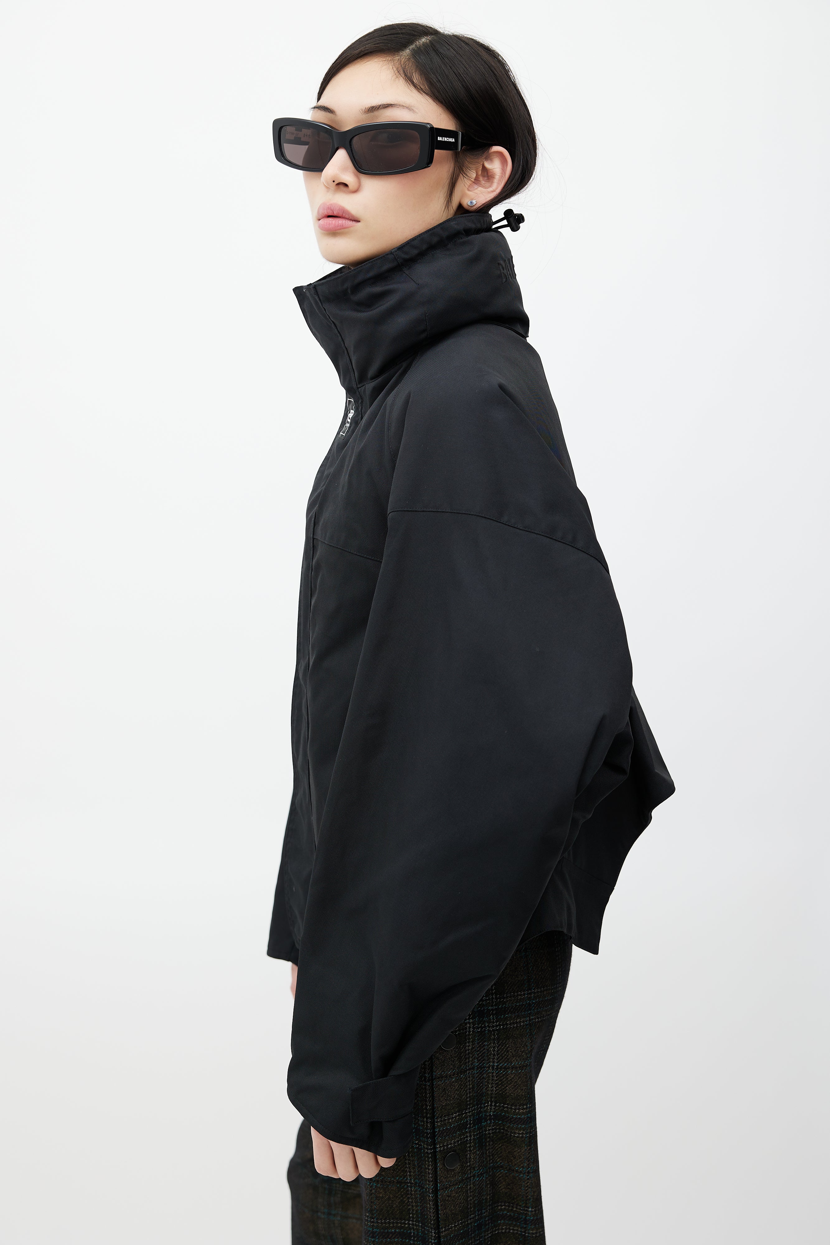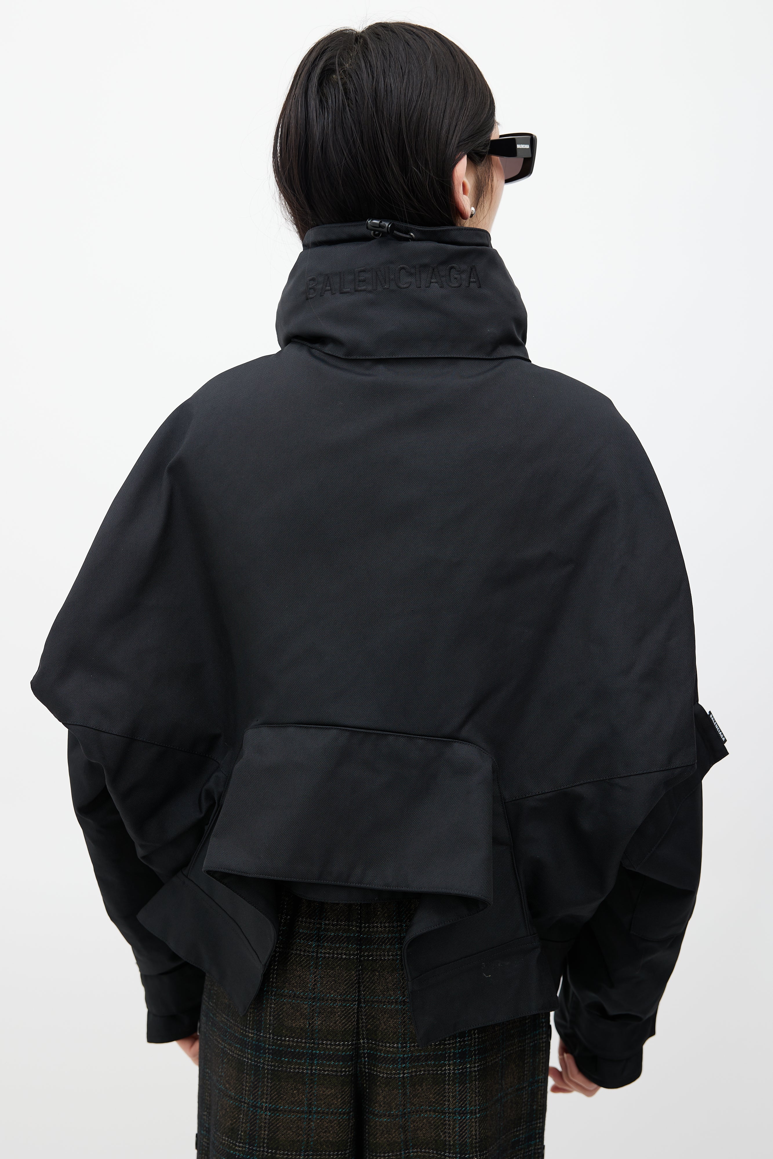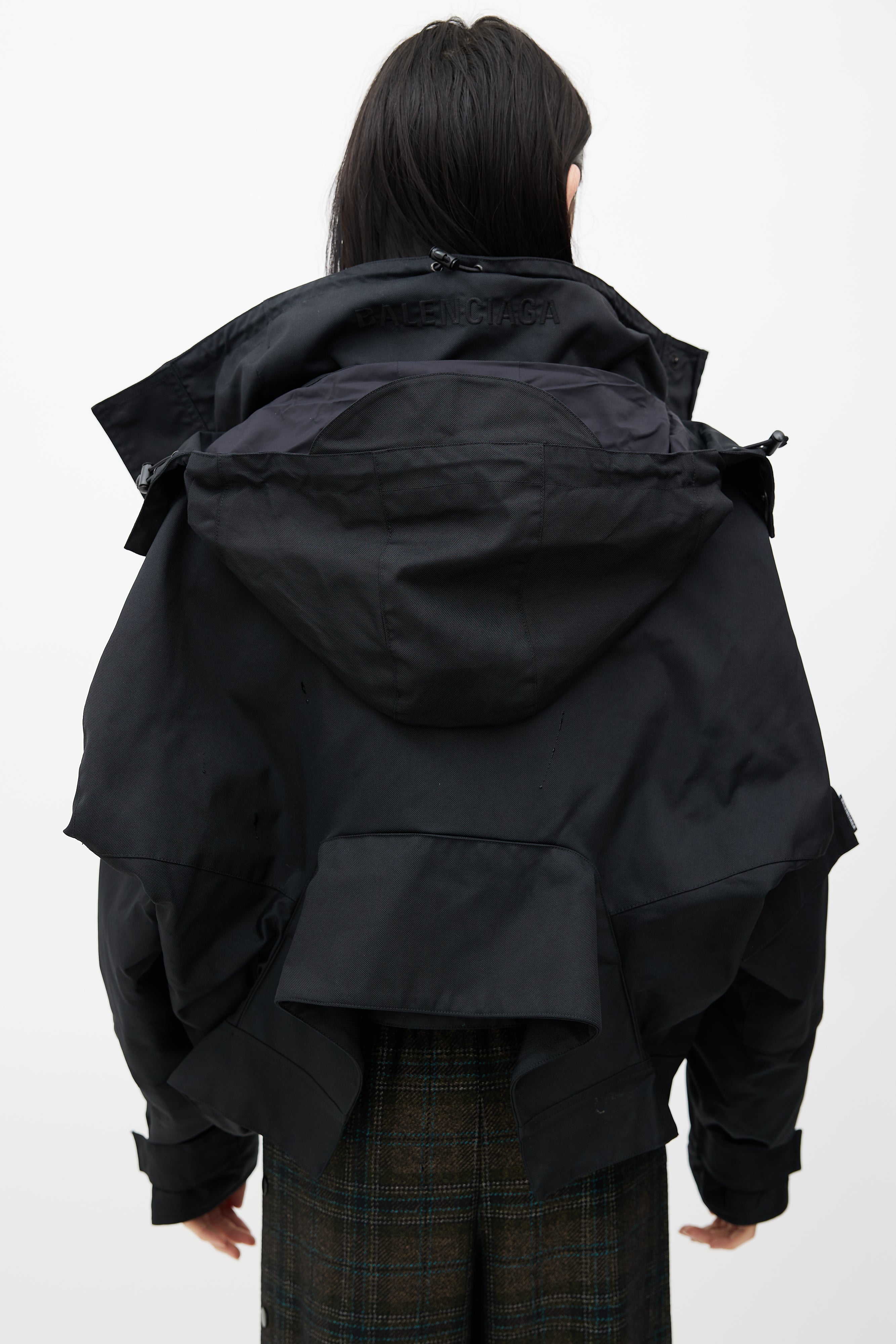 Pre-owned Balenciaga black Upside Down technical jacket featuring a mock neck collar with concealable hood, embroidered logo at back of neck, logo patch at chest, cargo pocket at arm, long sleeves with buttoned cuffs, two slip pockets at hip, high low drawstring hem, and zip closure. Lined.