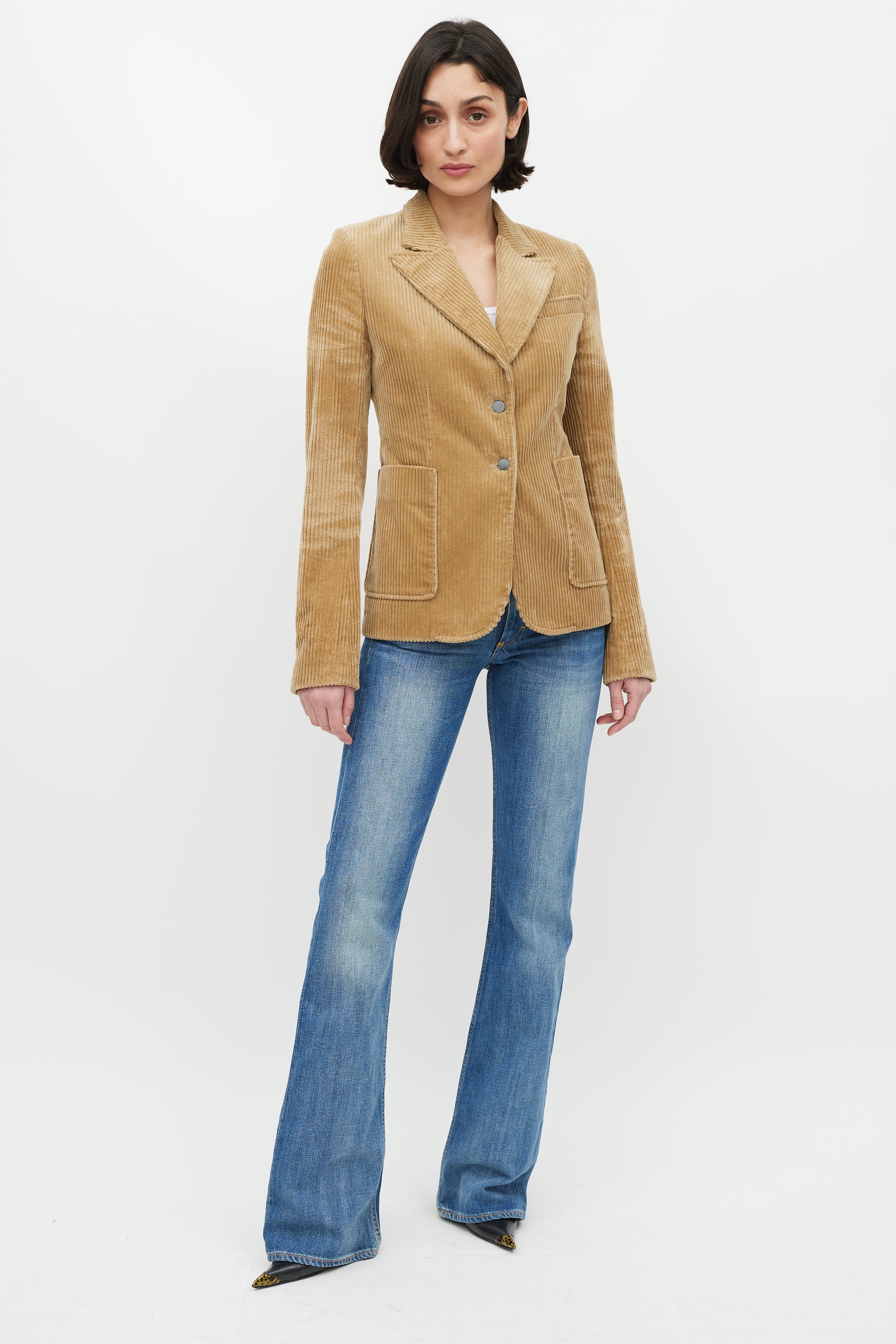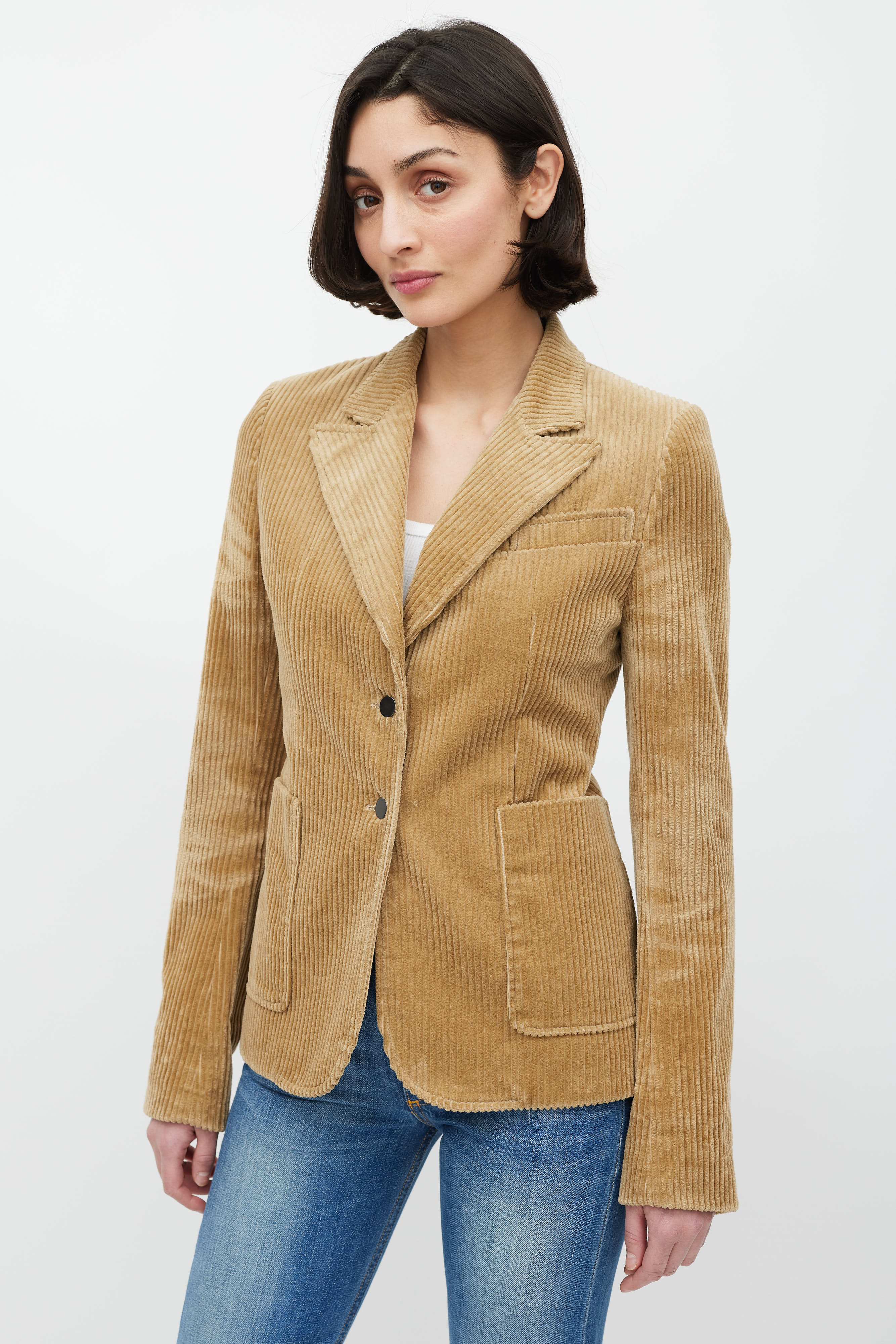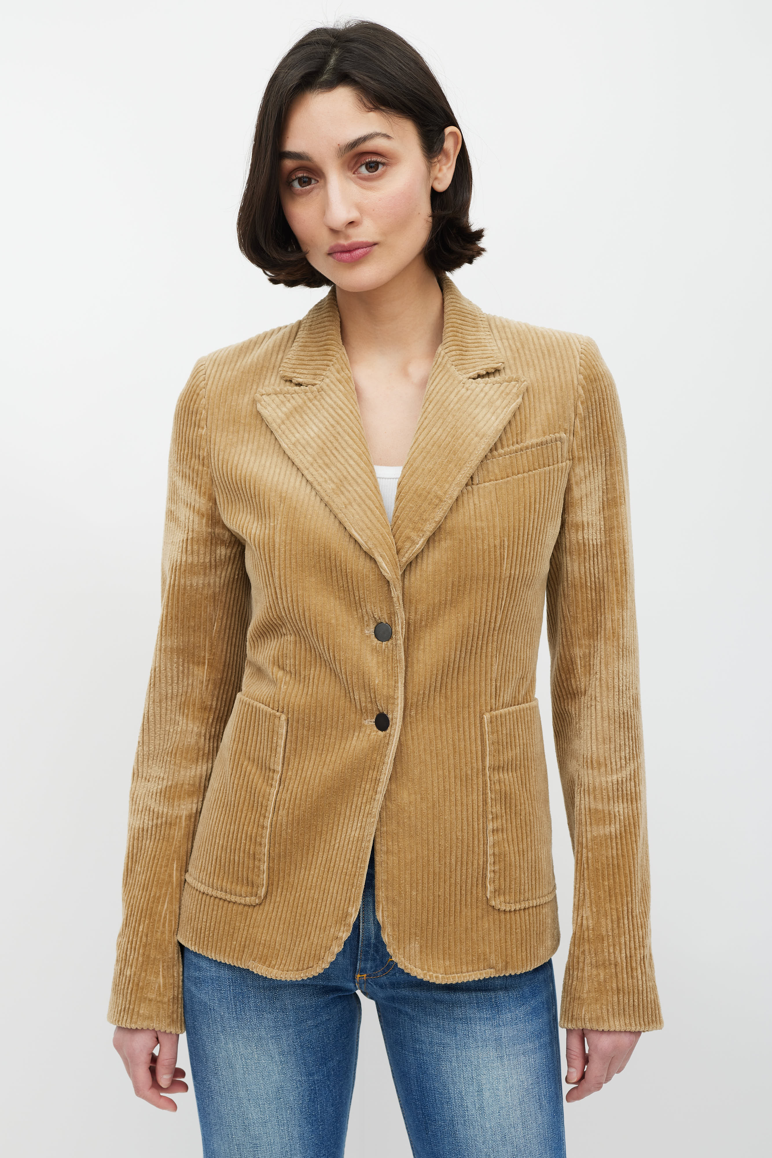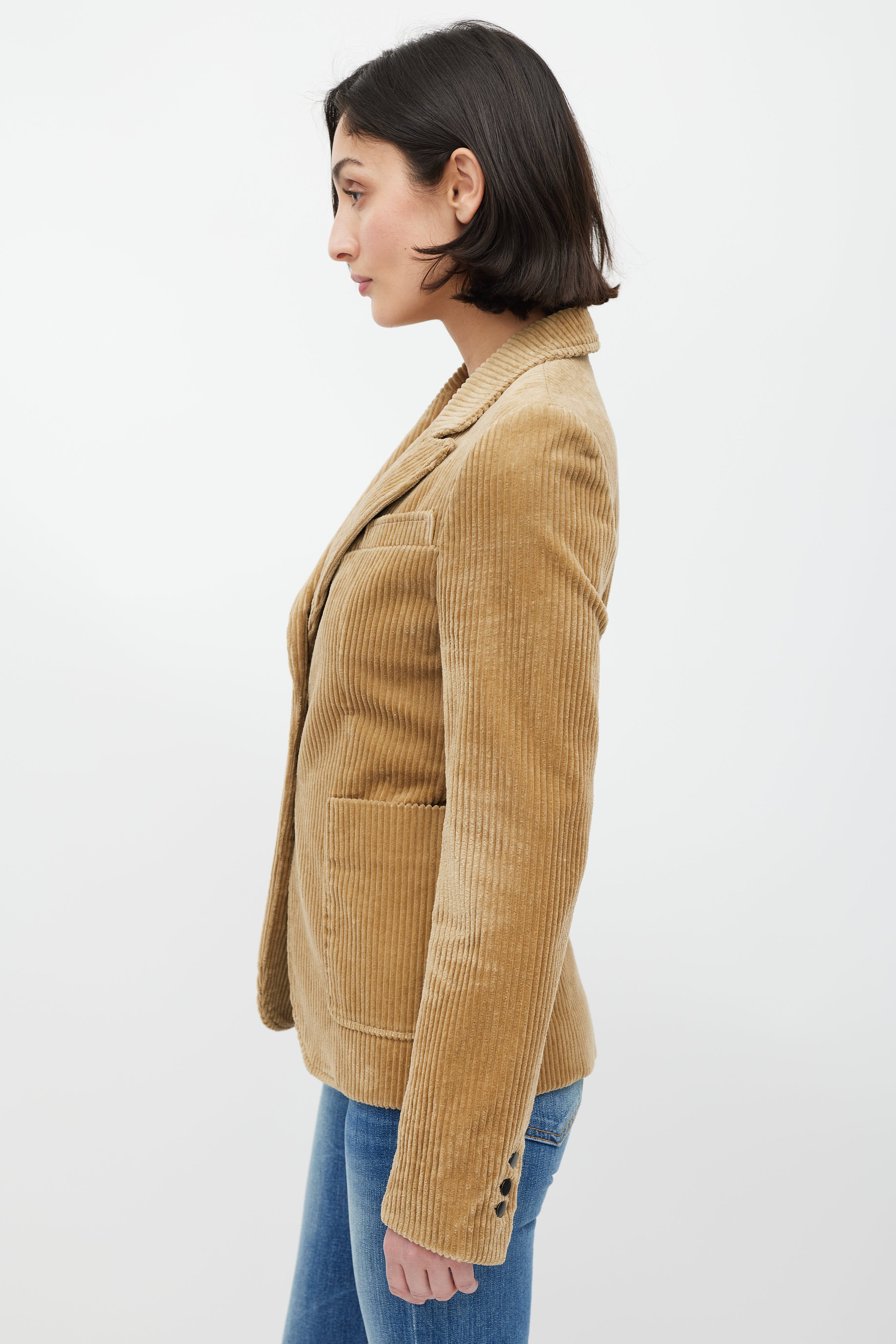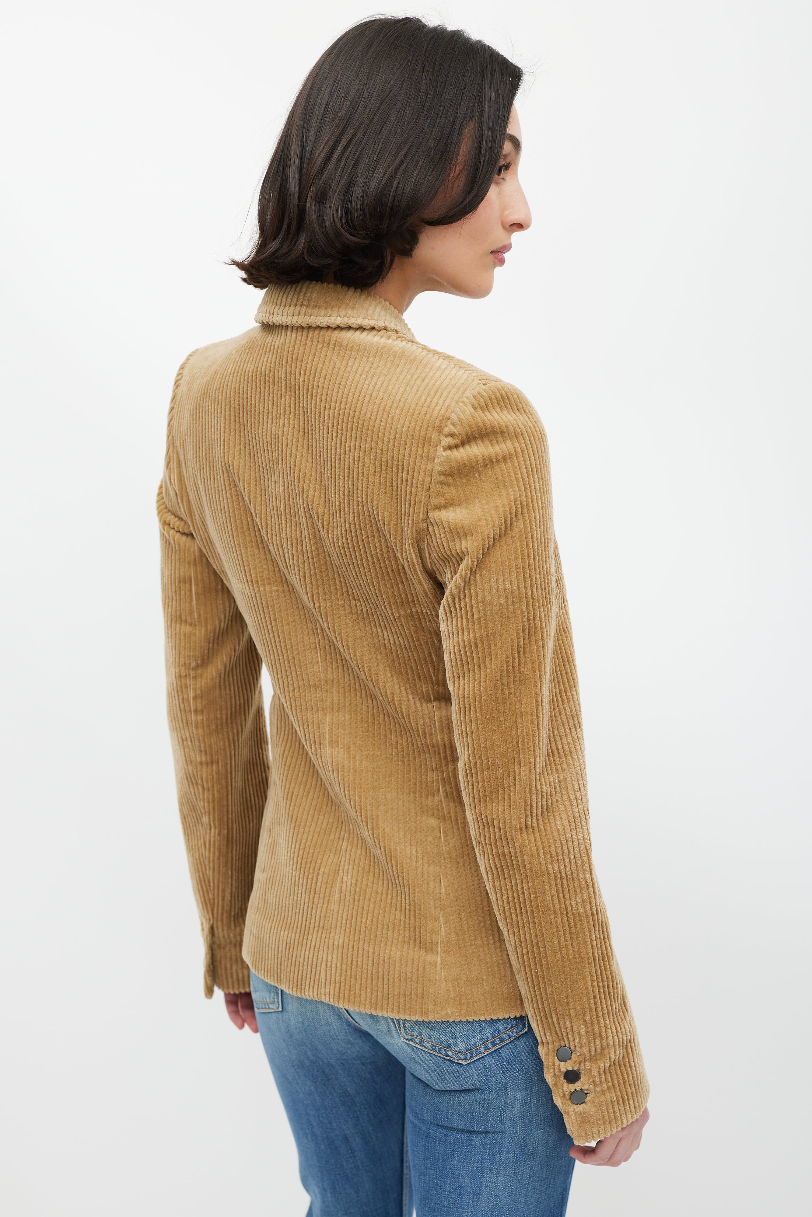 Pre-owned Balenciaga brown corduroy blazer featuring peak lapels, two button closure at front, patch pockets at waist, buttons at cuffs, and gunmetal hardware throughout. Nicolas Ghesquière era design.
