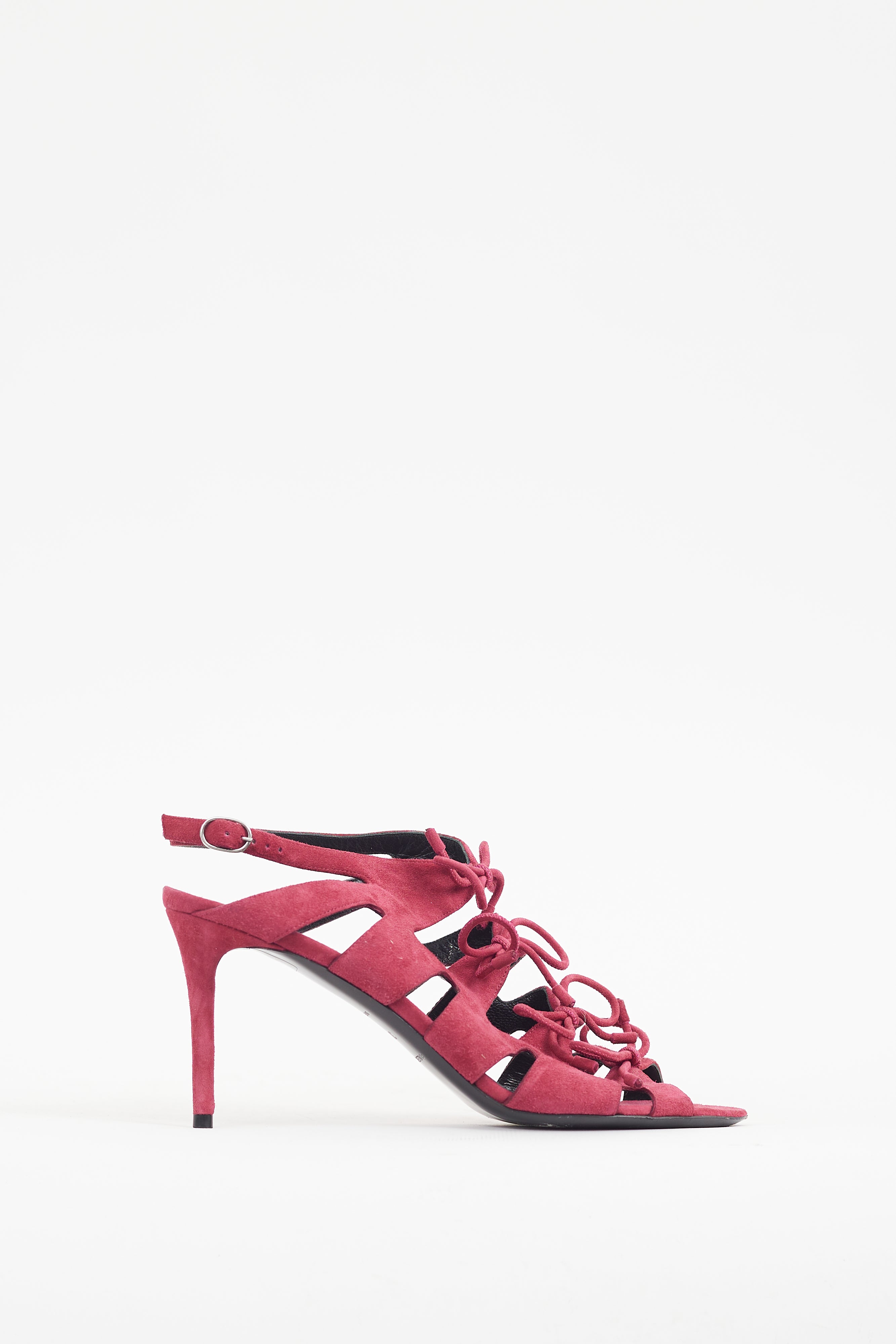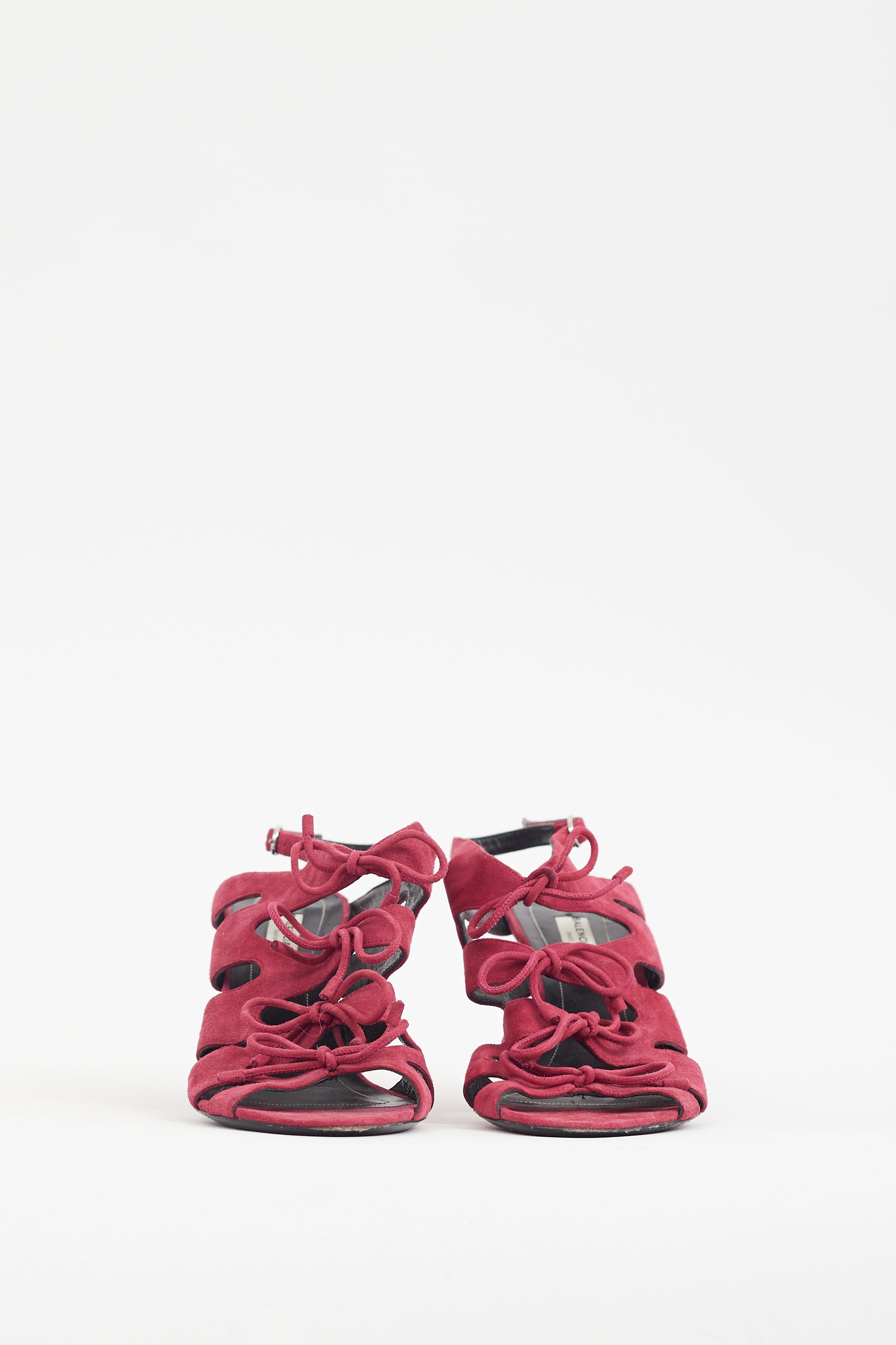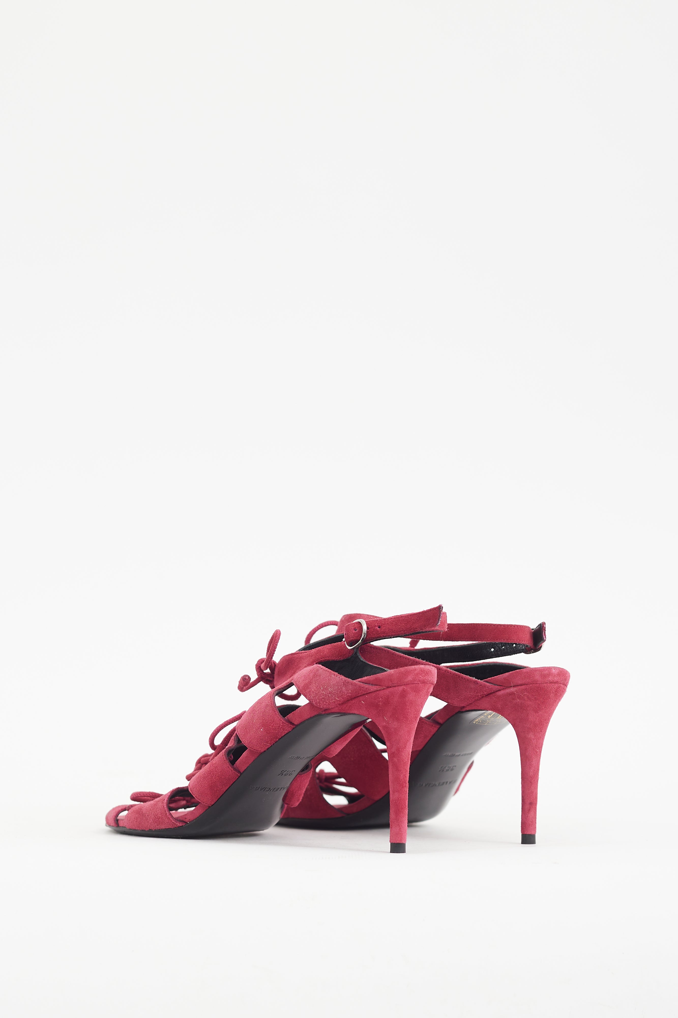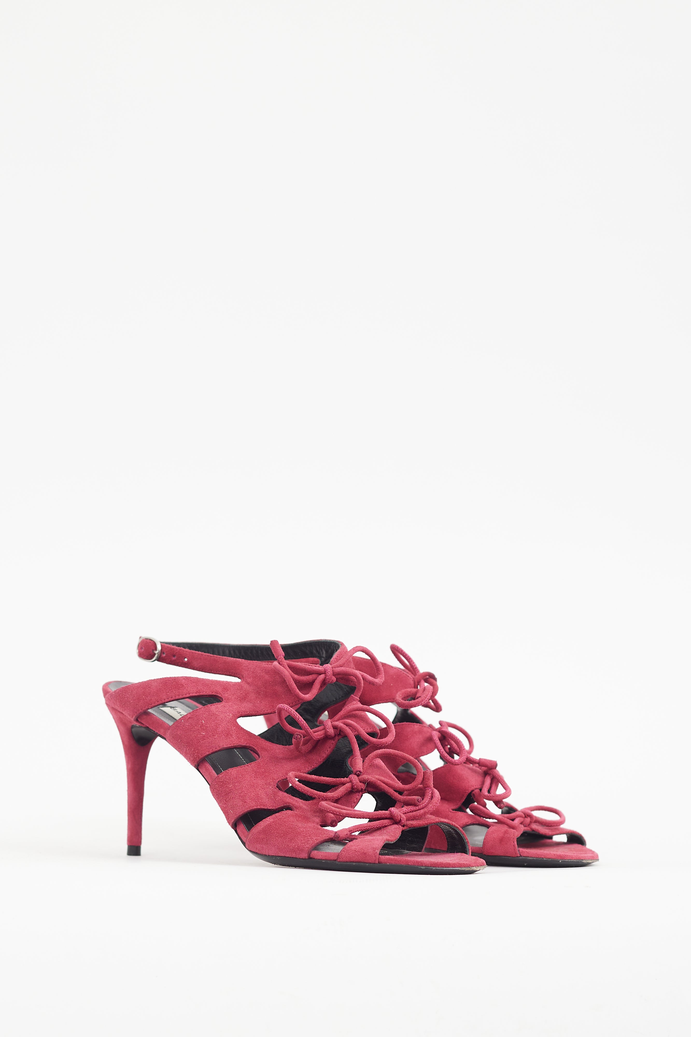Pre-owned Balenciaga burgundy heels featuring an open rounded toe, suede uppers, caged upper with four bows at front, adjustable slingback strap with silver tone buckle, and stiletto heel.