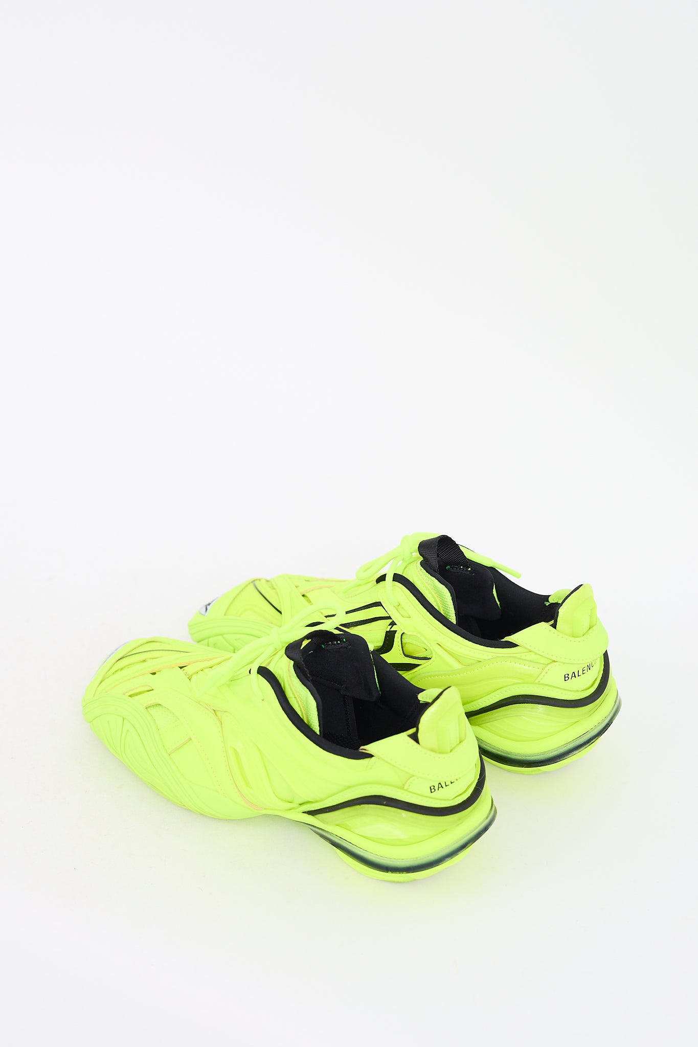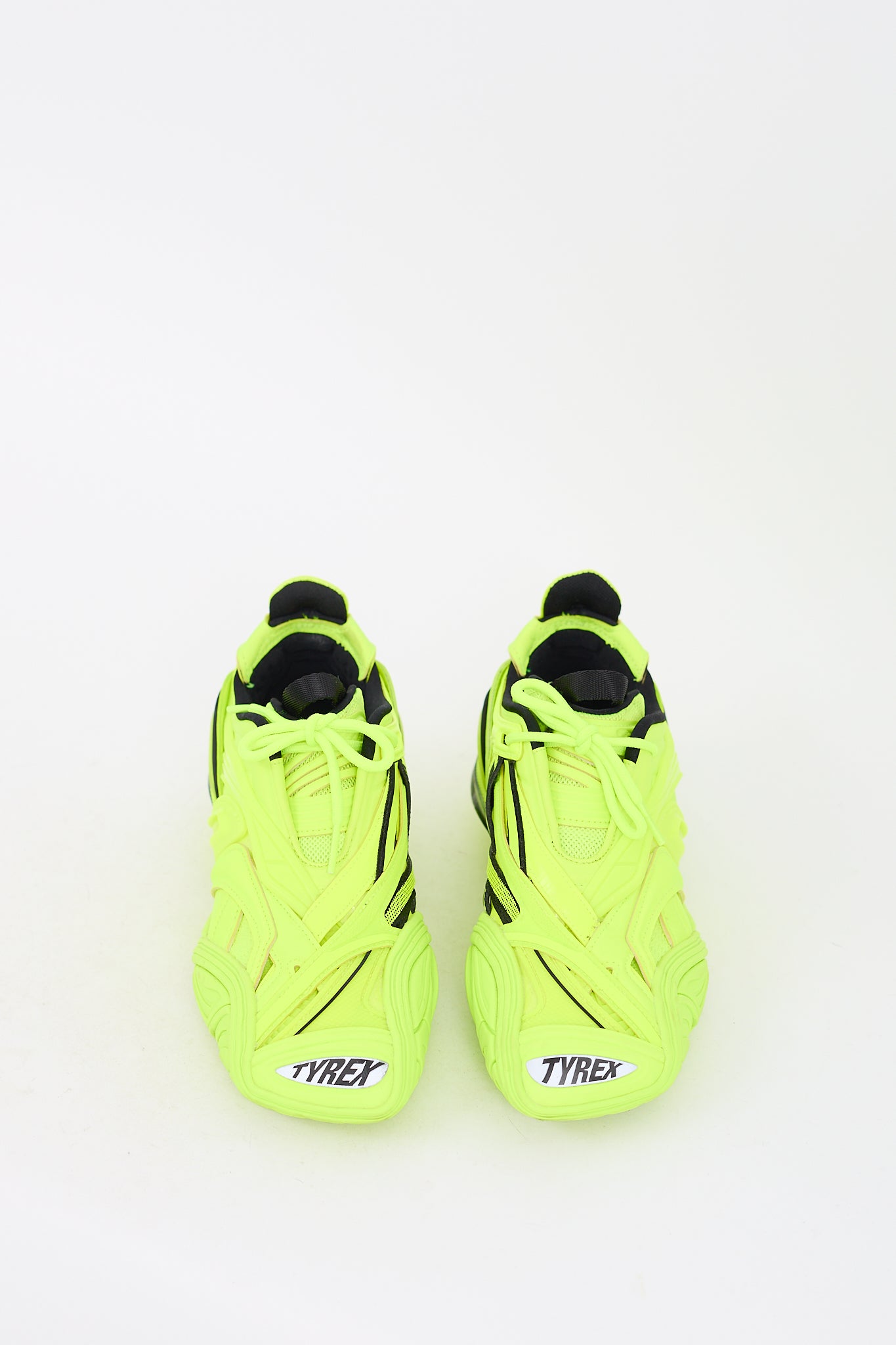 Pre-owned Balenciaga neon yellow Tyrex sneakers featuring exaggerated square toe, rubberized cut out panelling throughout, single lace up vamp, split outsole, and debossed "Tyrex" lettering at toe. Comes with two extra sets of shoelaces.