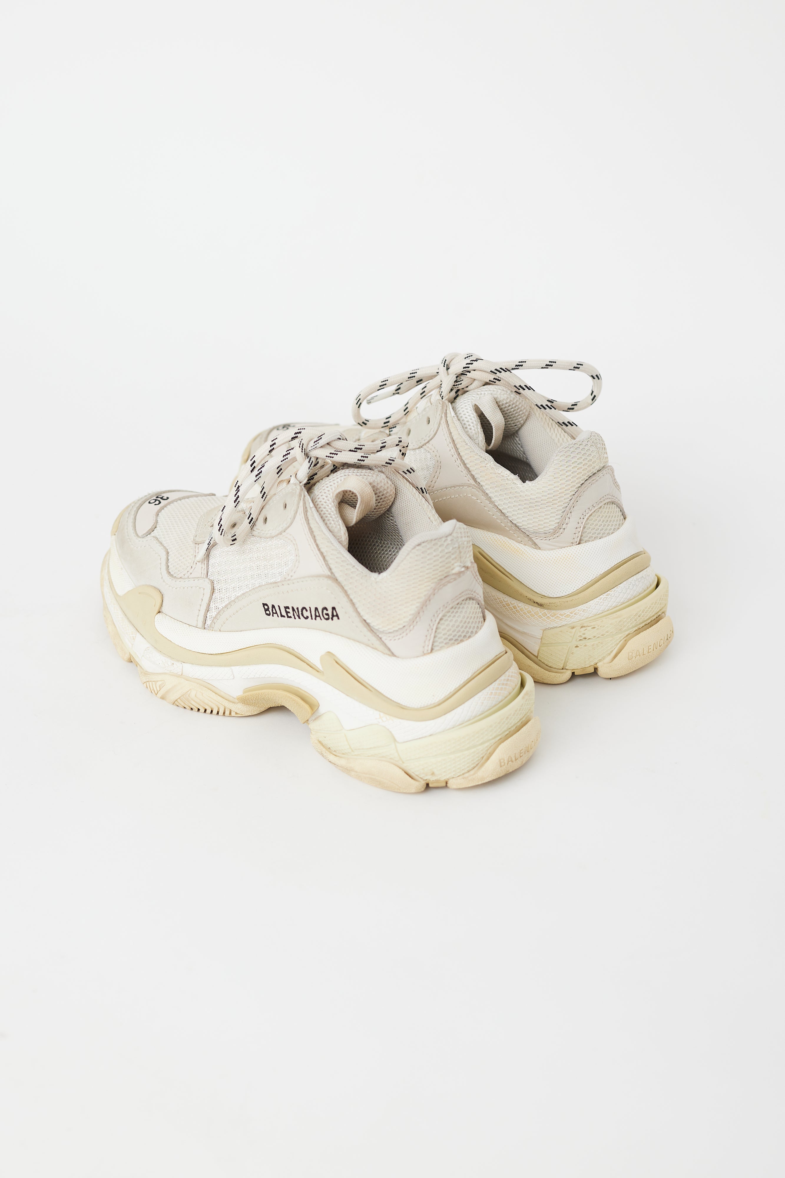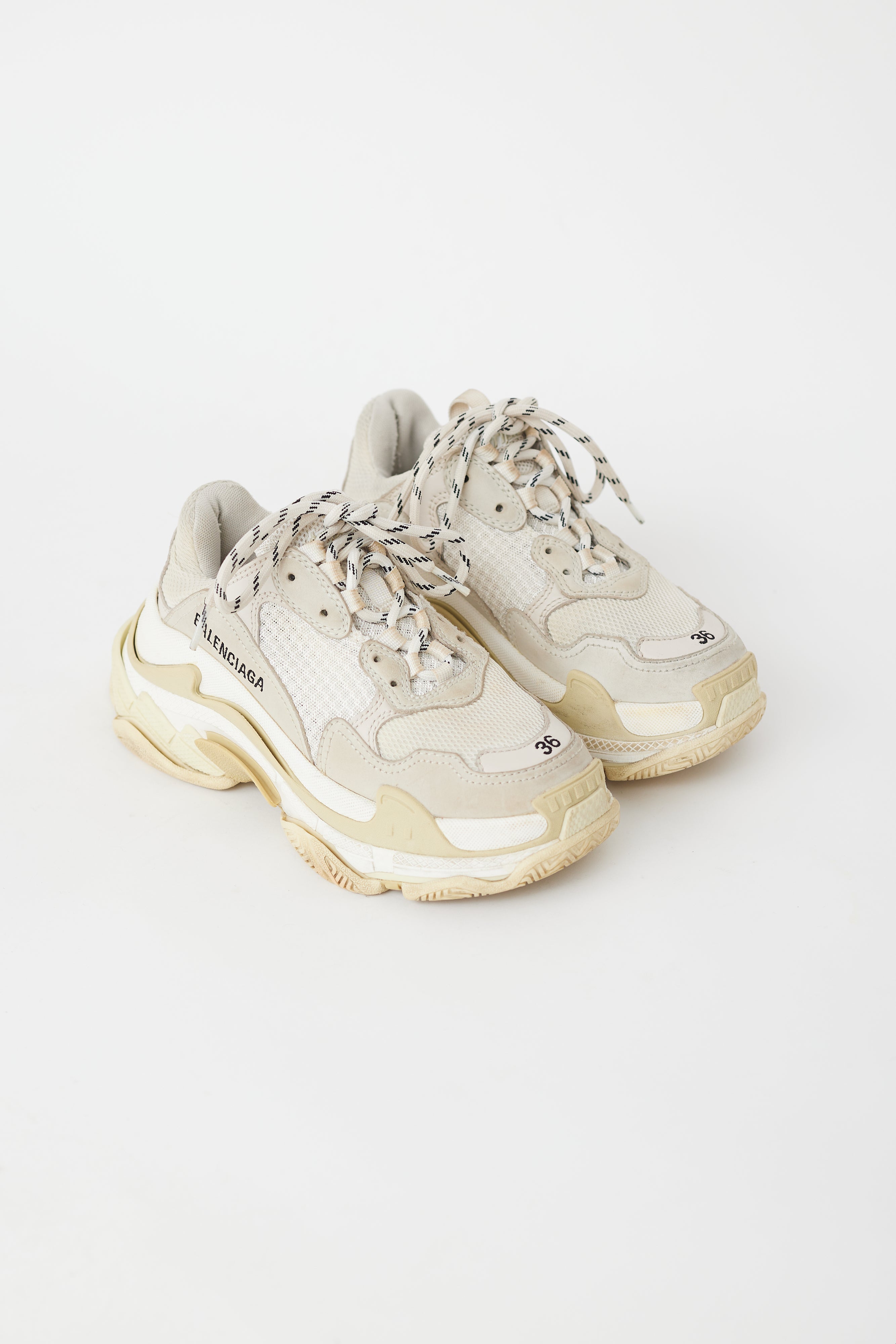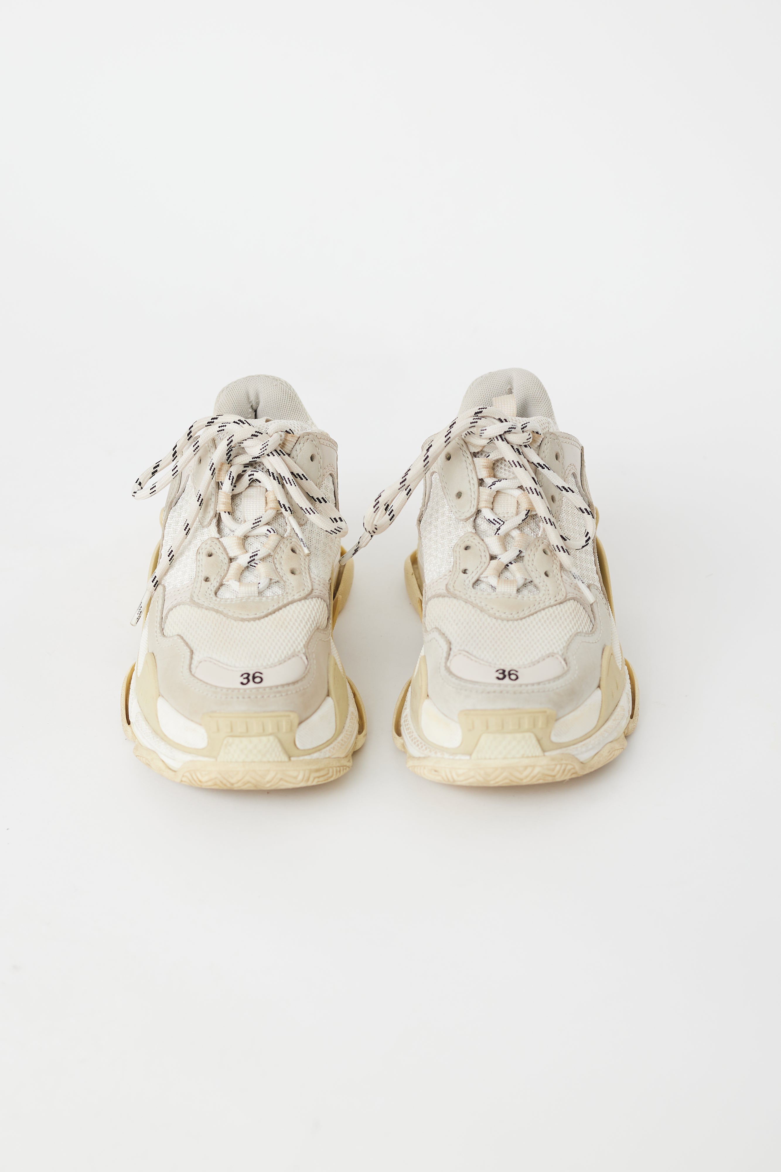 Pre-owned Balenciaga white and cream Triple S sneakers featuring rounded toe, leather and mesh upper, pull tab at tongue, chunky cream midsole, embroidered "36" at toe, and lace up front. Comes with original dust bag.