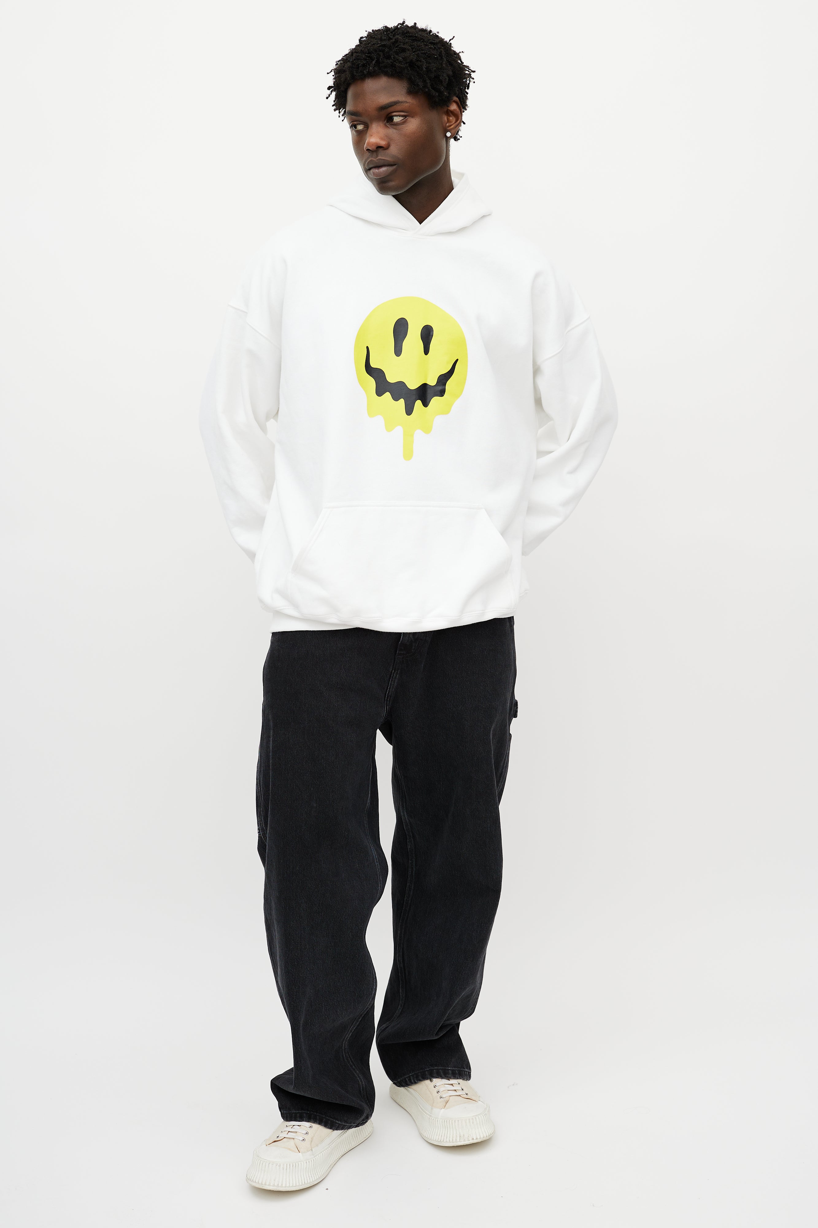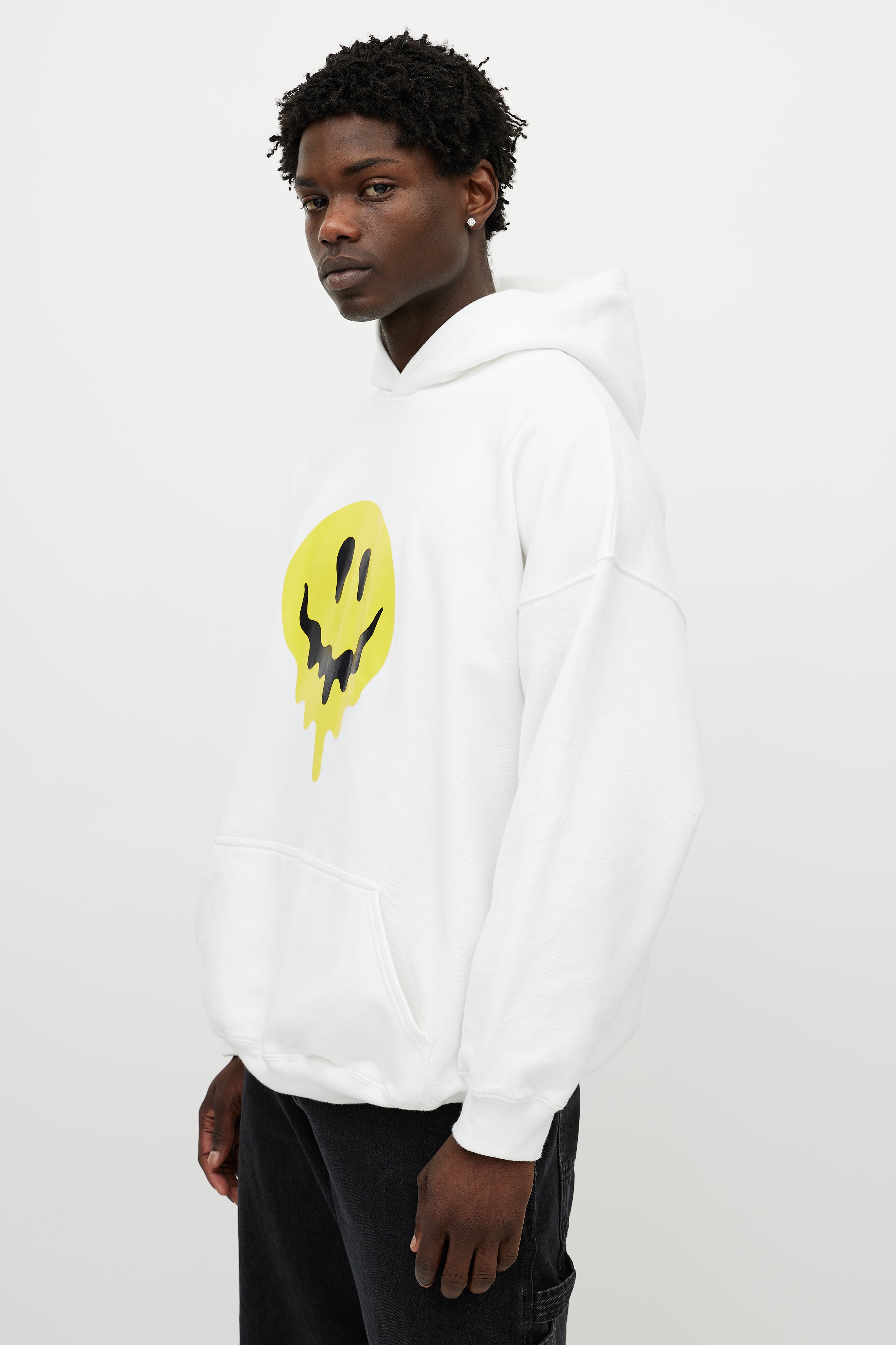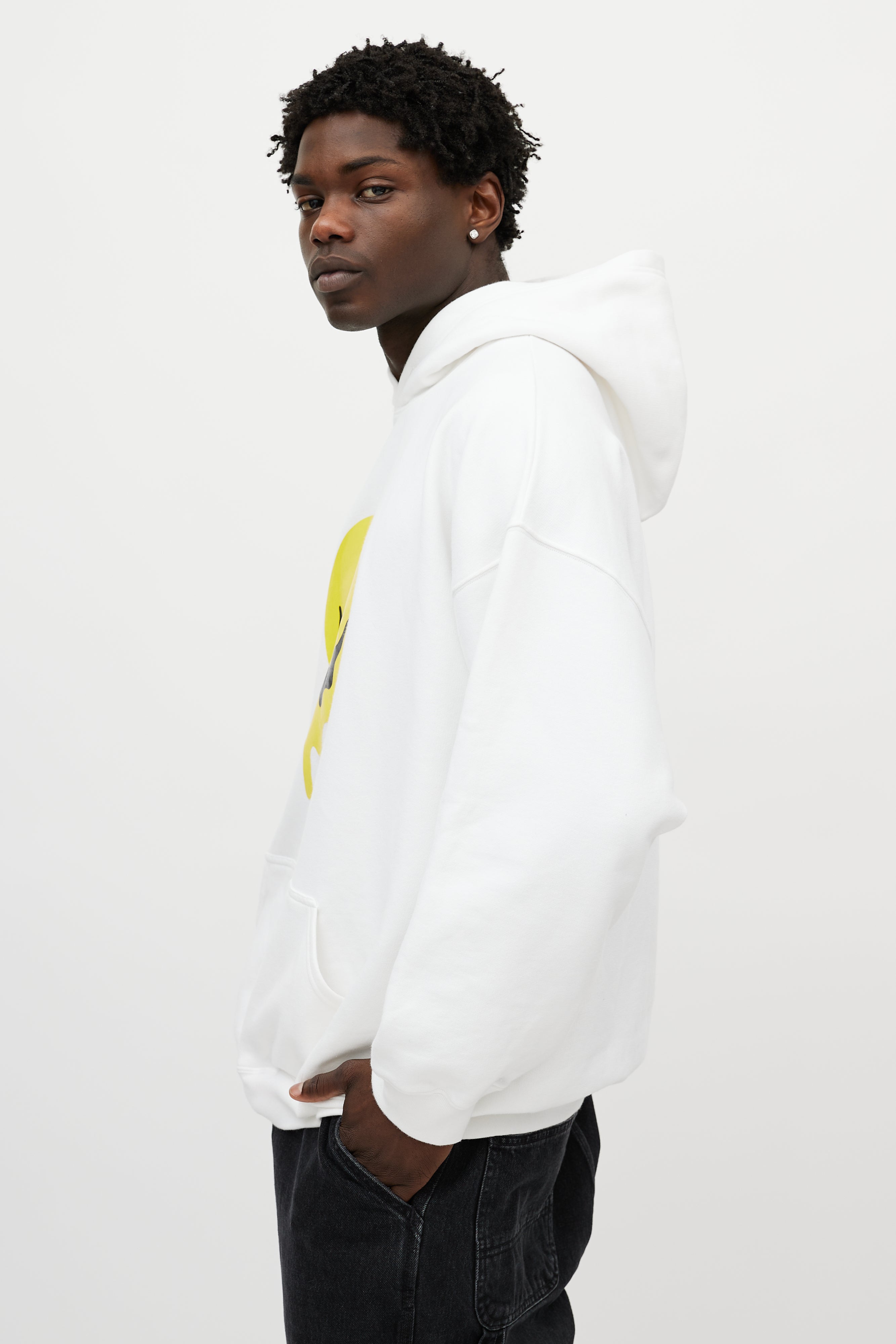 Pre-owned Balenciaga white oversized hoodie featuring a yellow melting smiley face at front, embroidered skeleton hand at back, attached hood, kangaroo pocket at front, and ribbed hem.