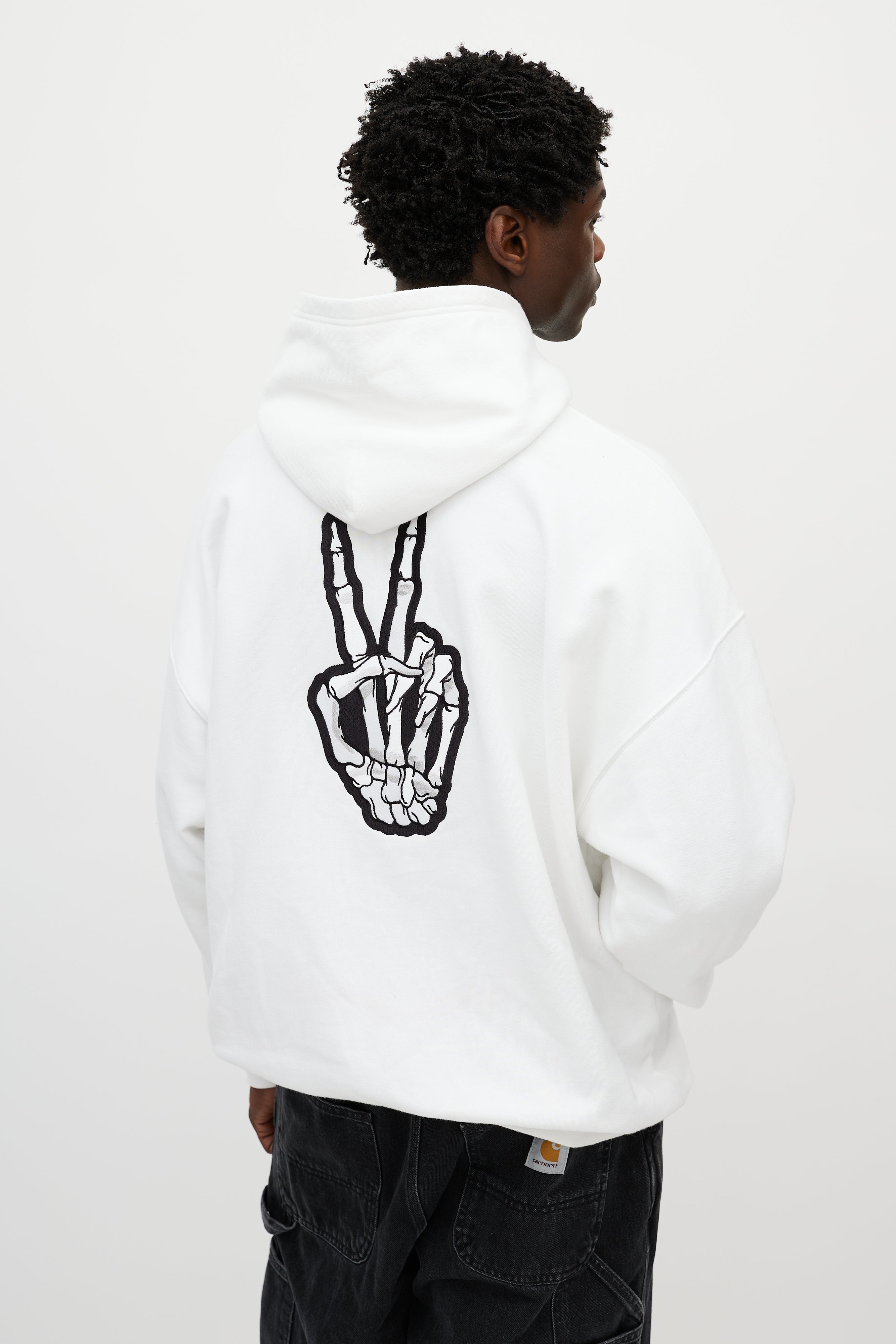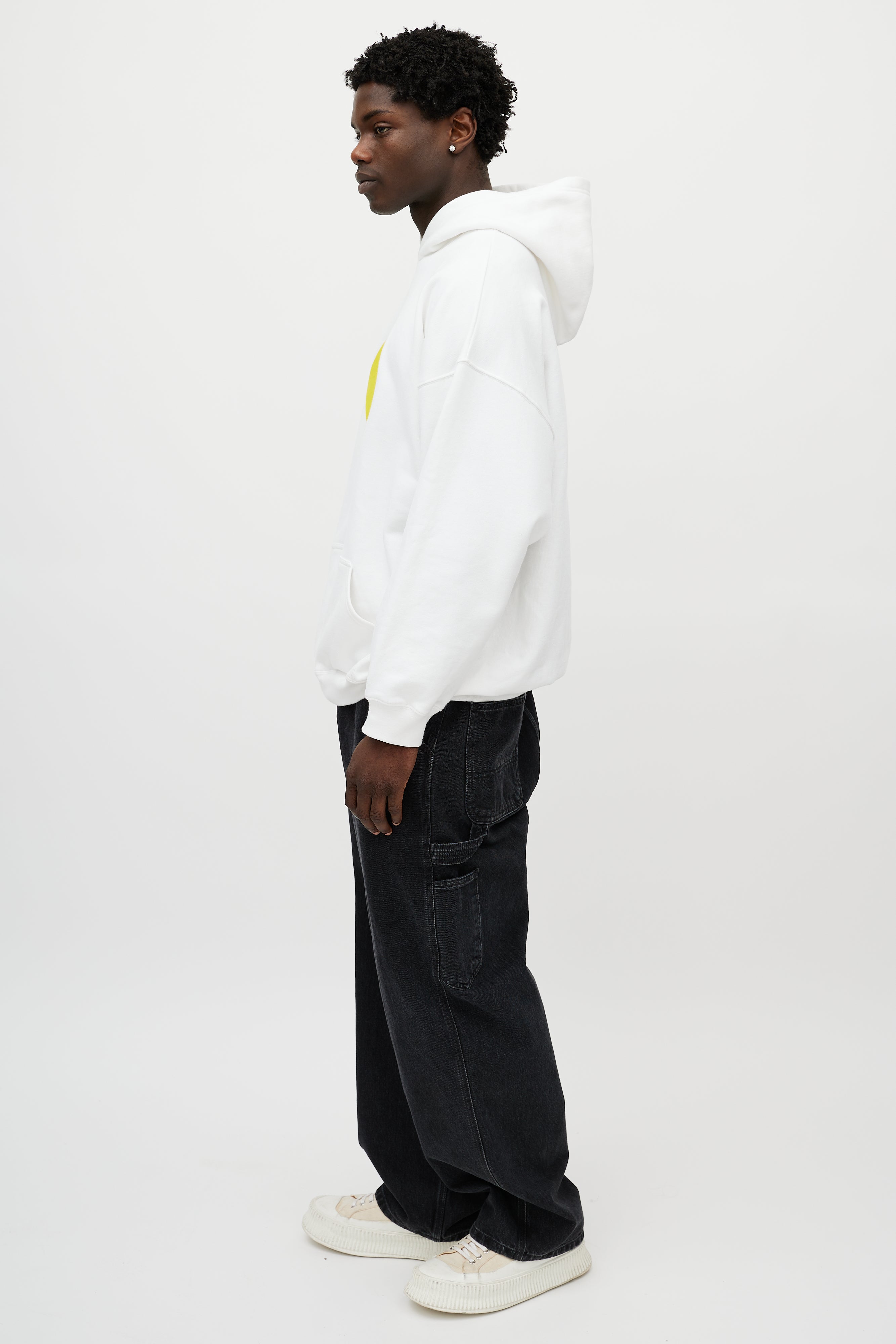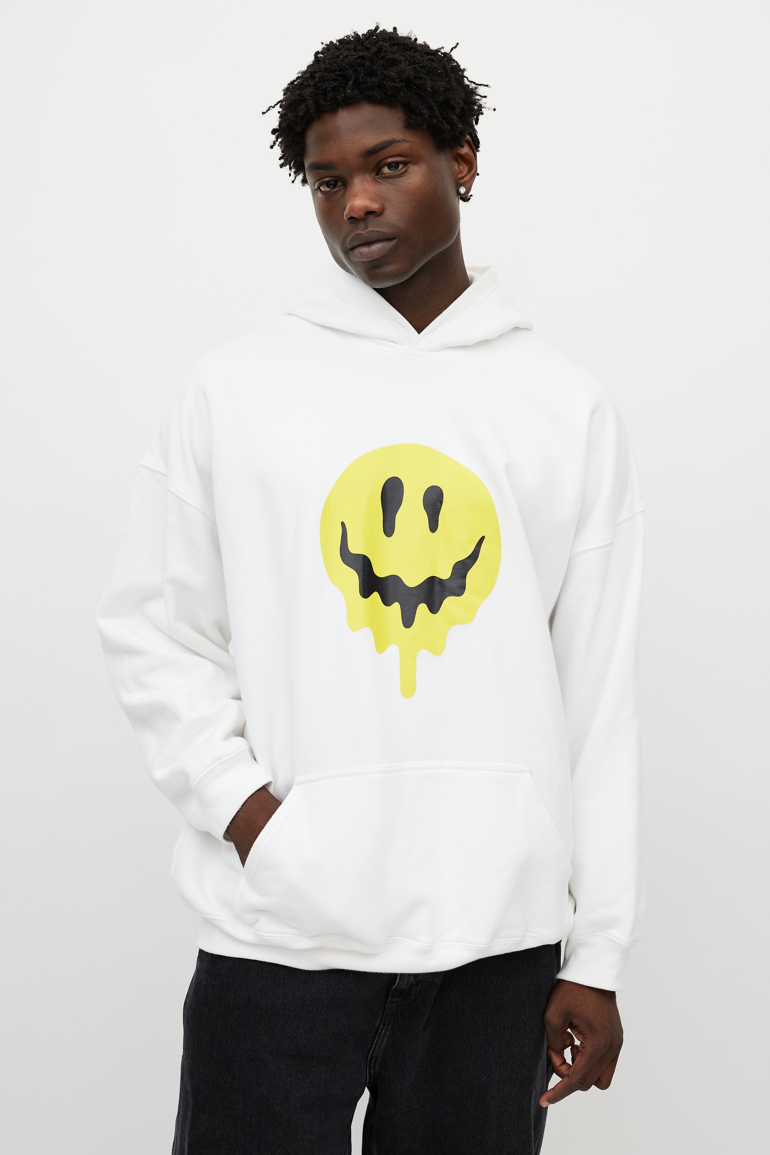 Pre-owned Balenciaga white oversized hoodie featuring a yellow melting smiley face at front, embroidered skeleton hand at back, attached hood, kangaroo pocket at front, and ribbed hem.