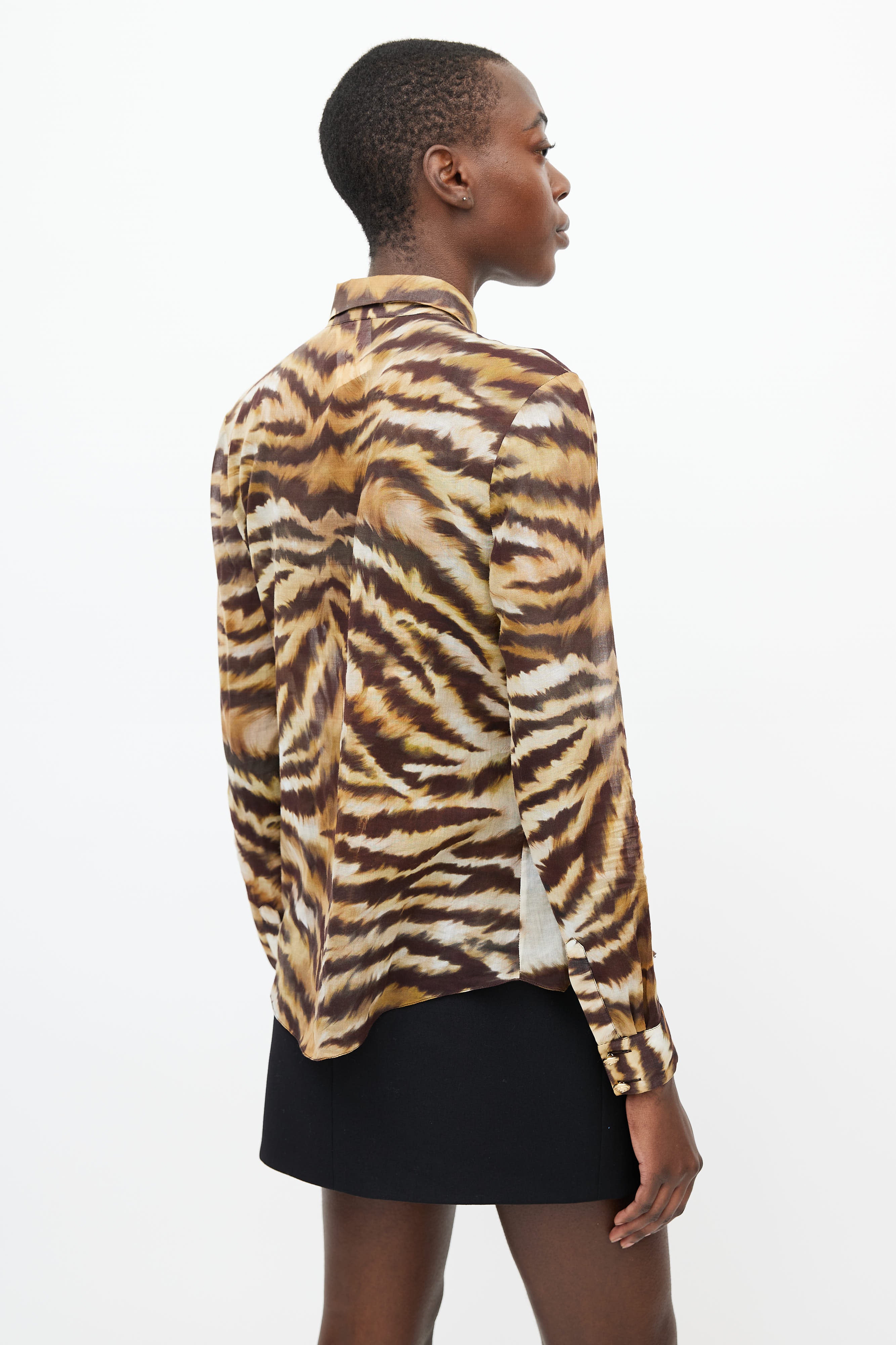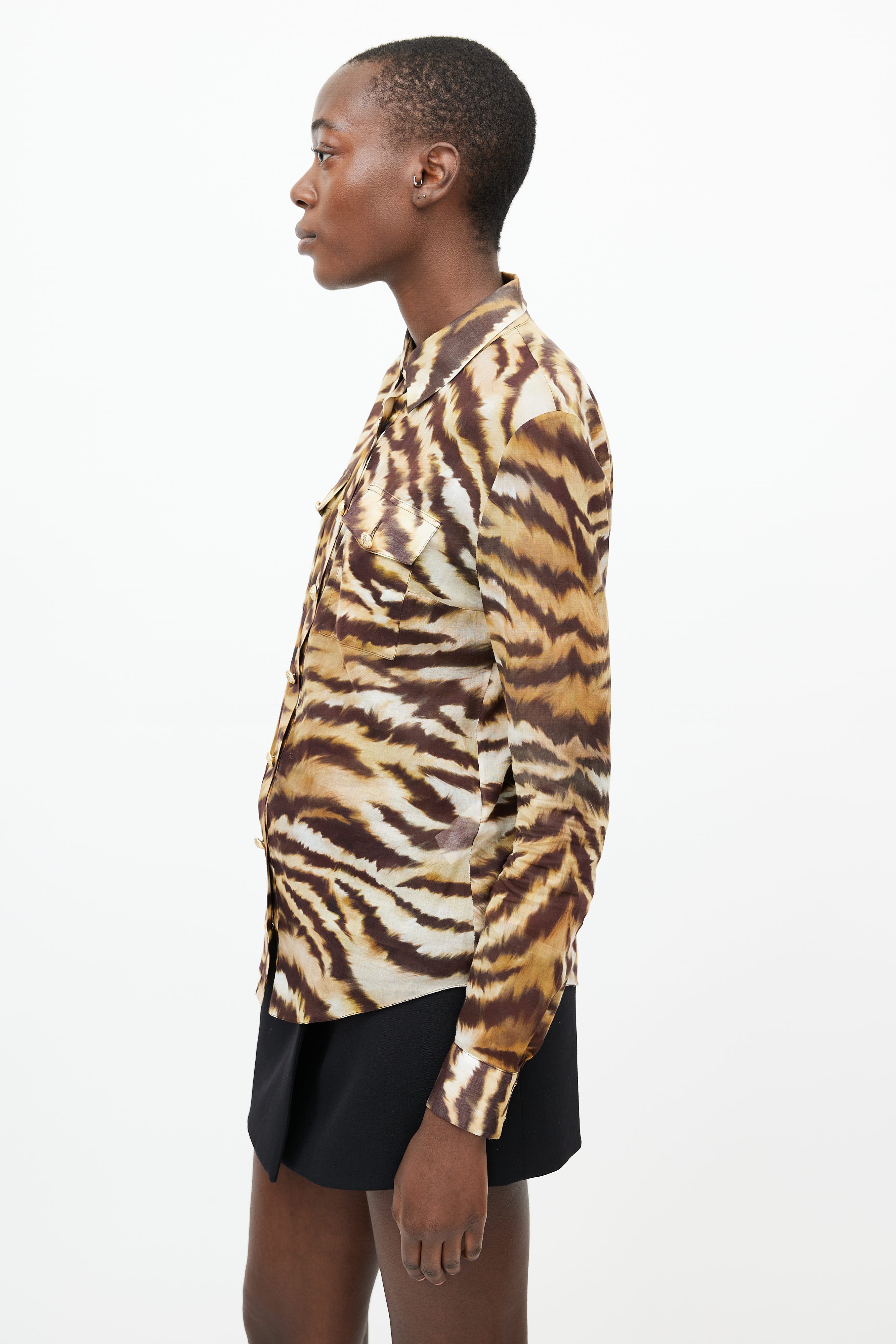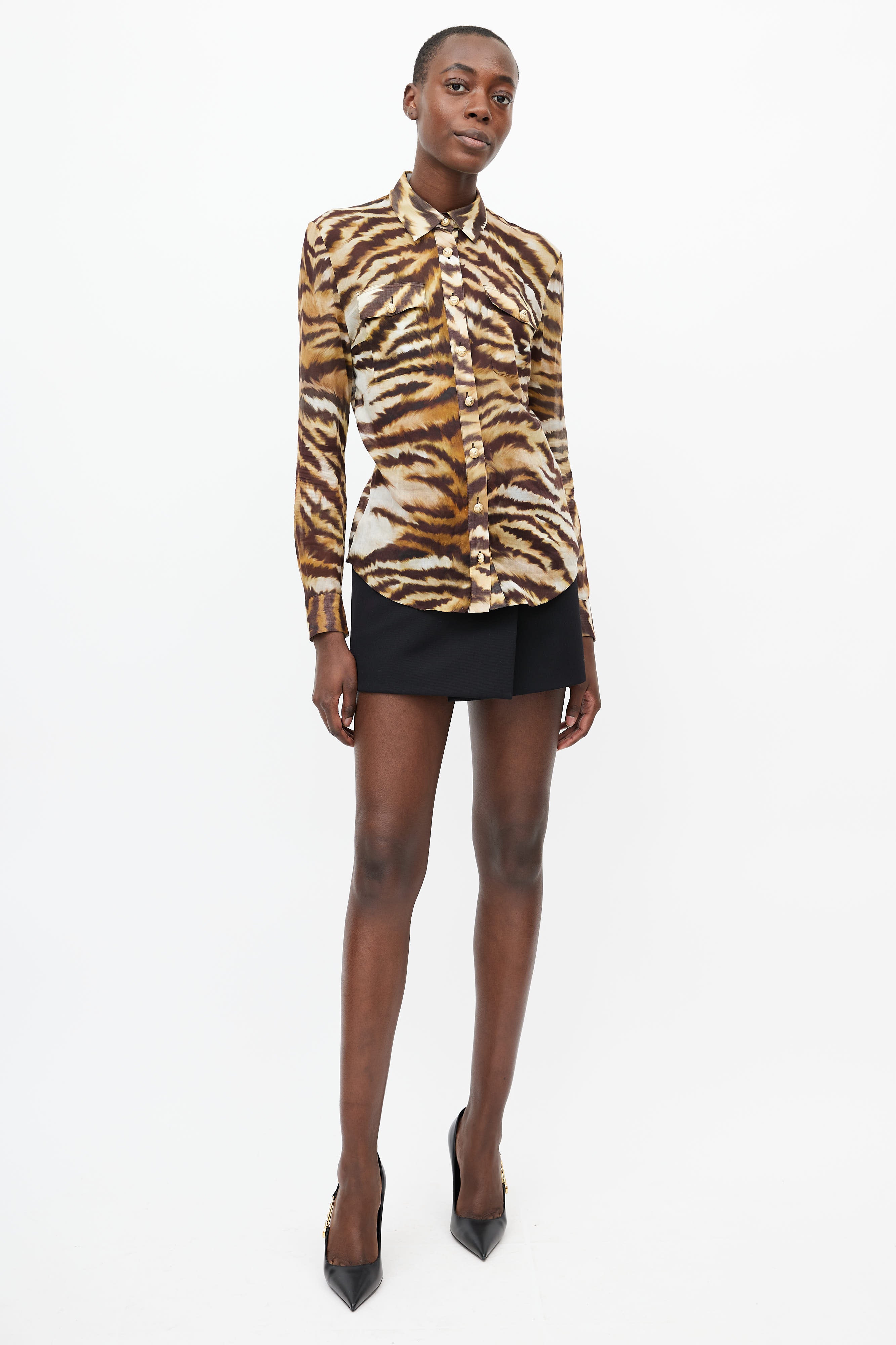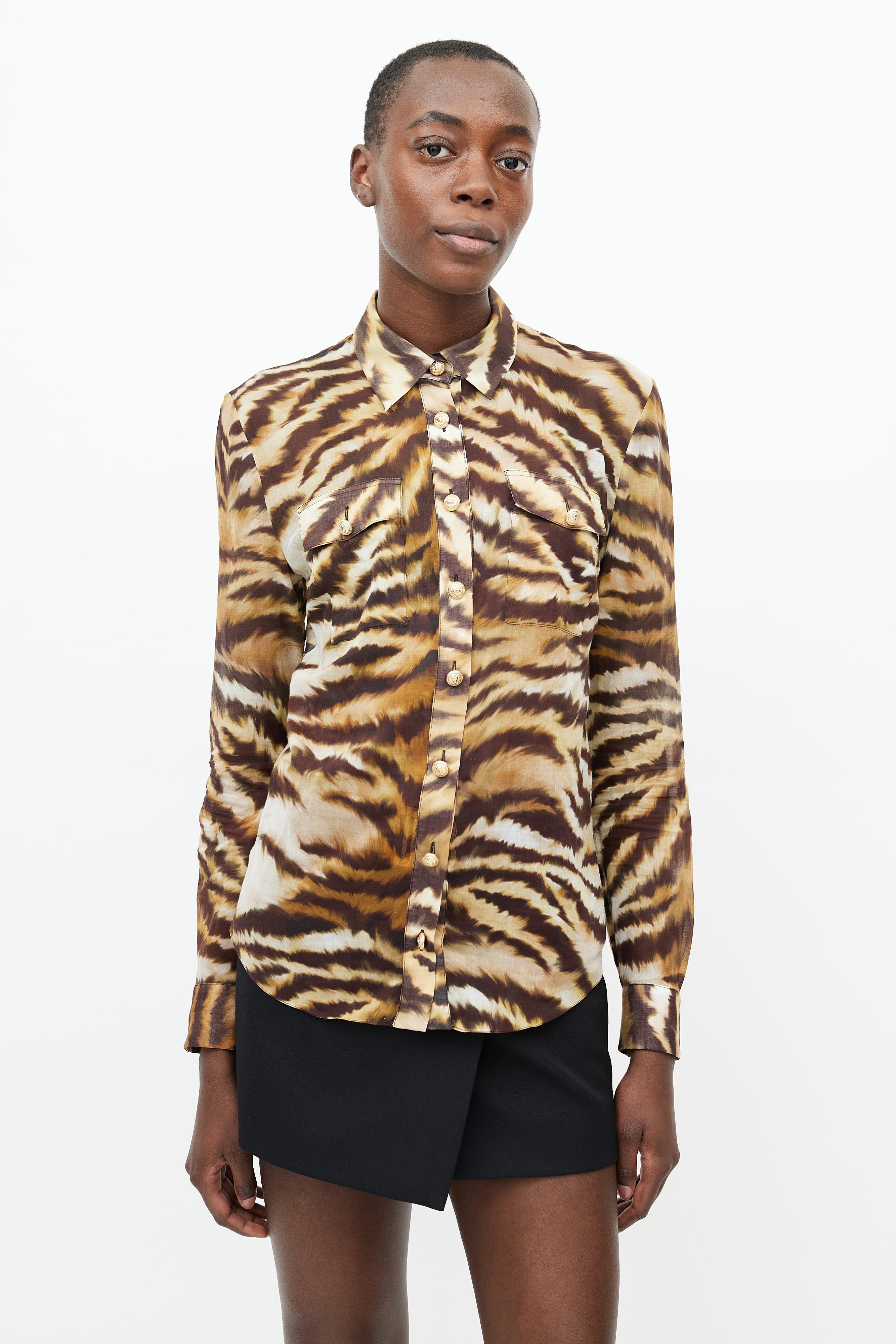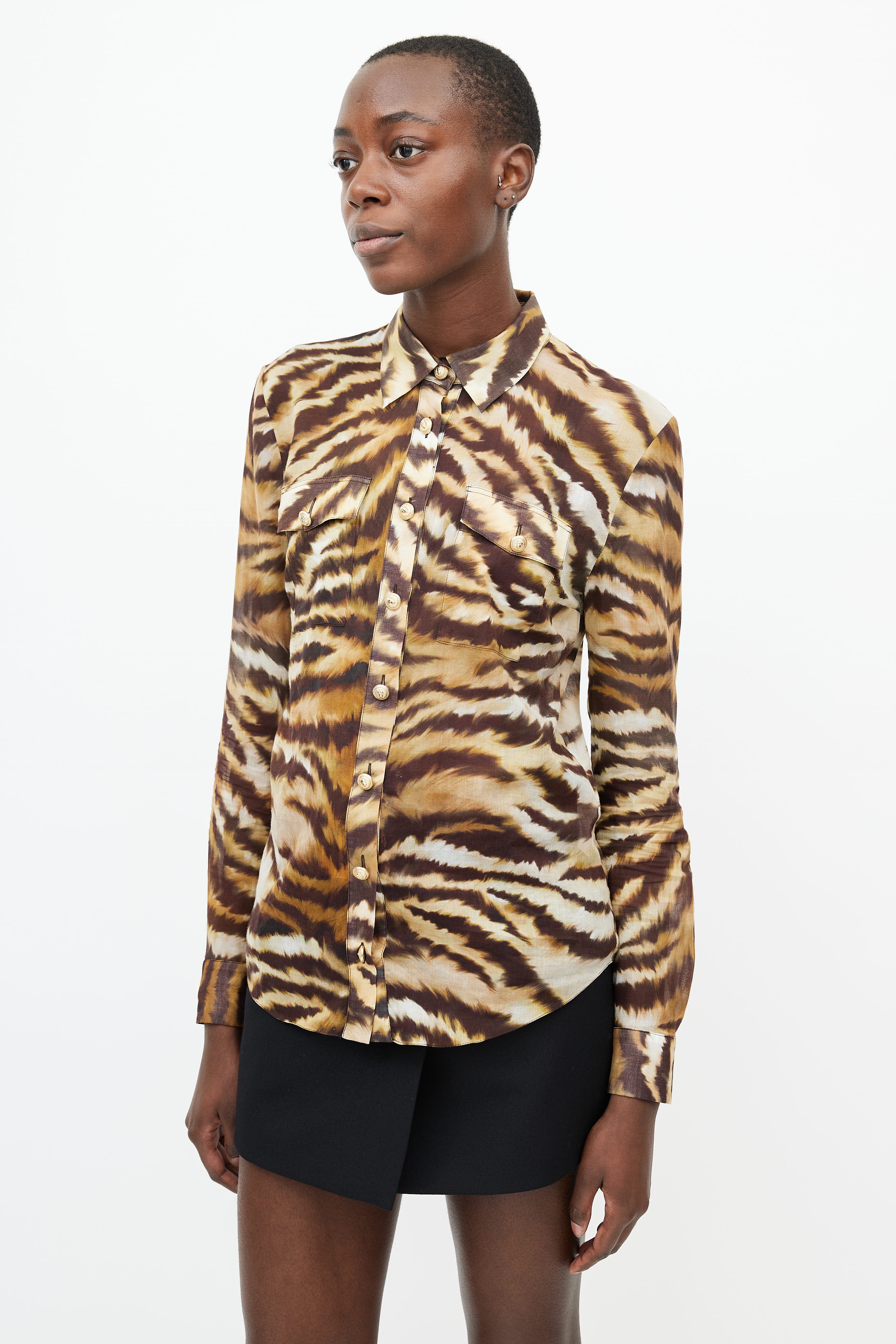 Pre-owned Balmain black and brown blouse featuring tiger print throughout, pointed collar, two cargo pockets at front with gold tone button closure, long sleeves with gold tone button closure at cuff, and button up front.