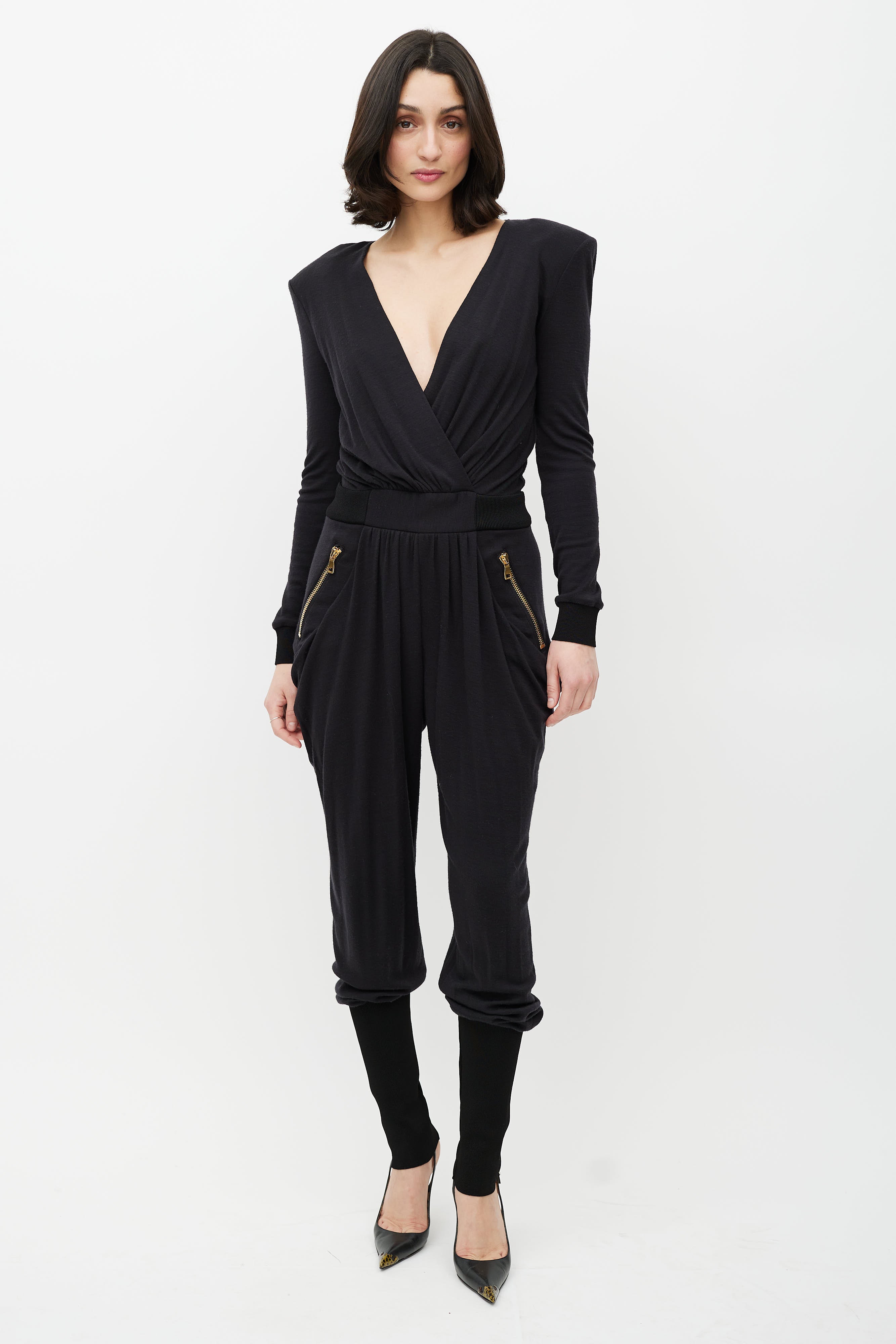 Pre-owned Balmain black wool jumpsuit featuring a V-neckline, shoulder pads, long sleeves, elasticized waist, two gold tone zip pockets at hip, and elasticized hem.