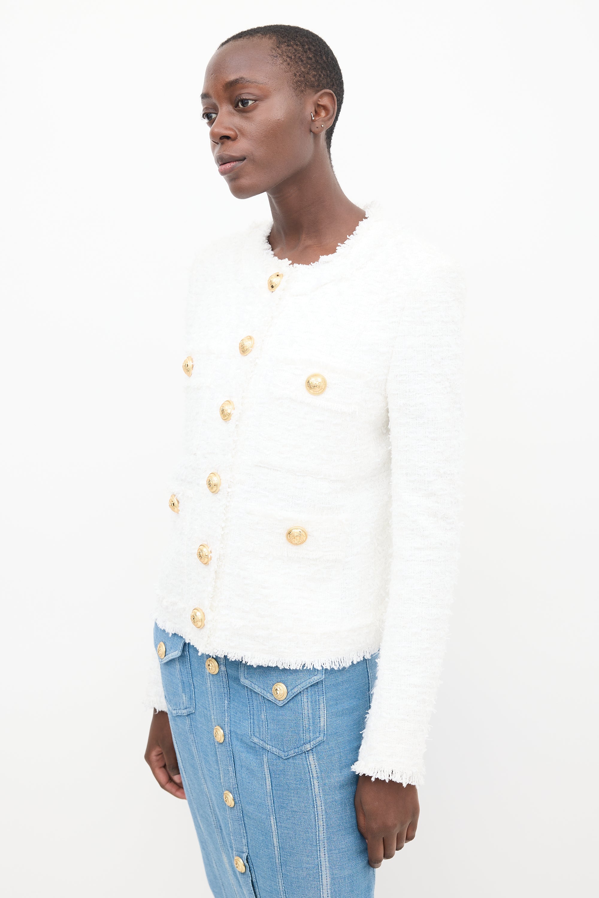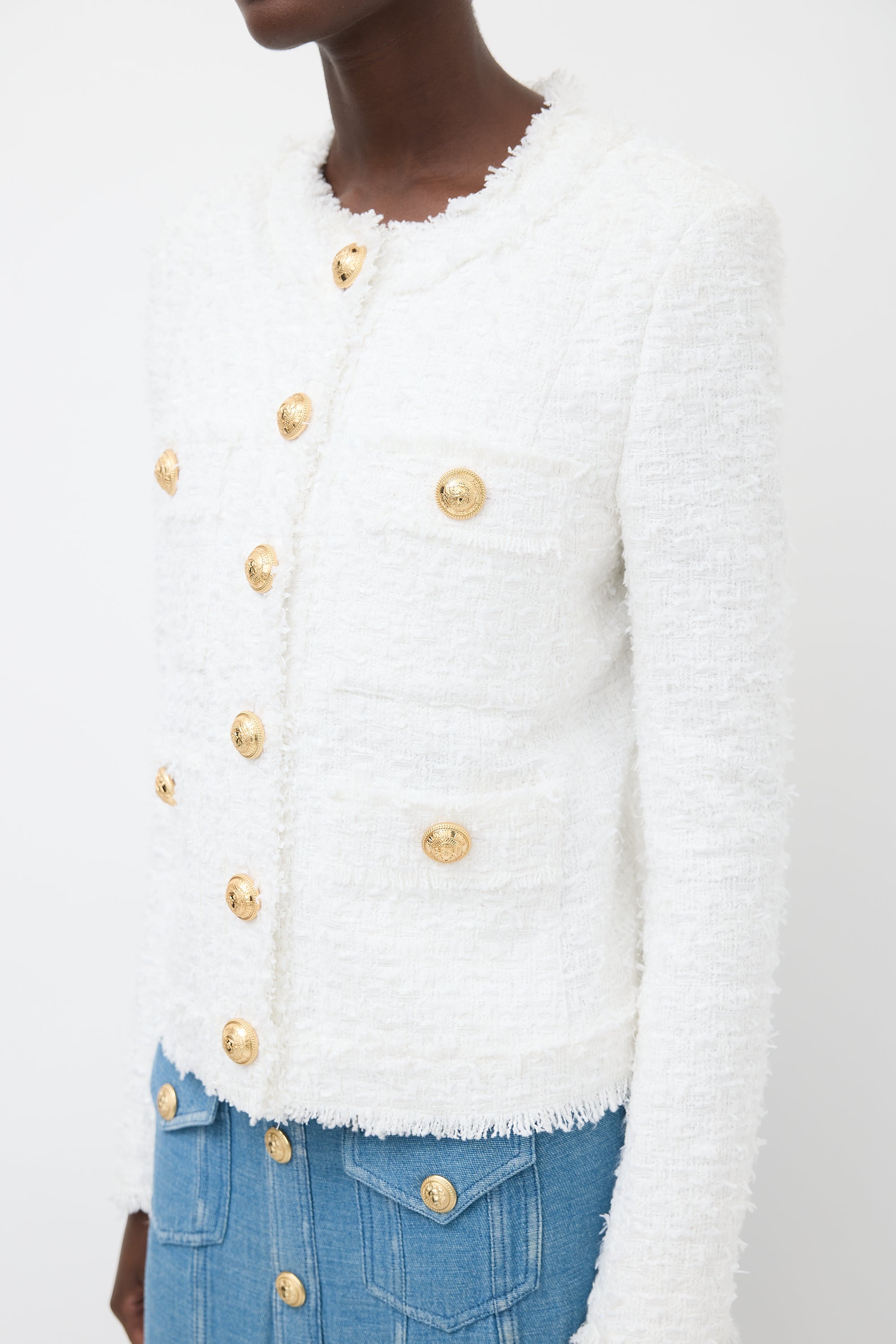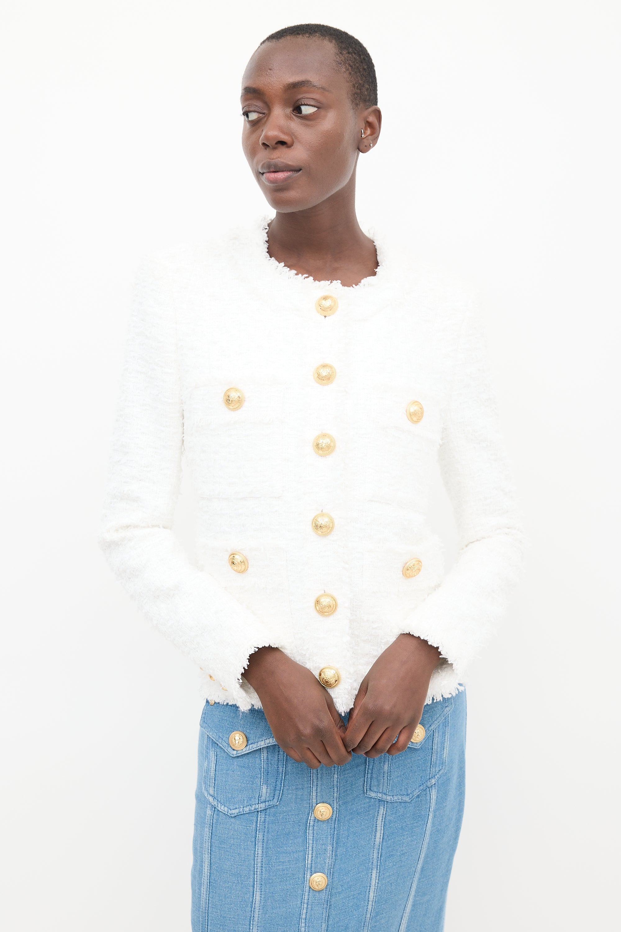 Pre-owned Balmain white tweed jacket featuring a round neckline, long sleeves with buttoned cuffs, four patch pockets at chest, and gold tone button up closure. Lined.