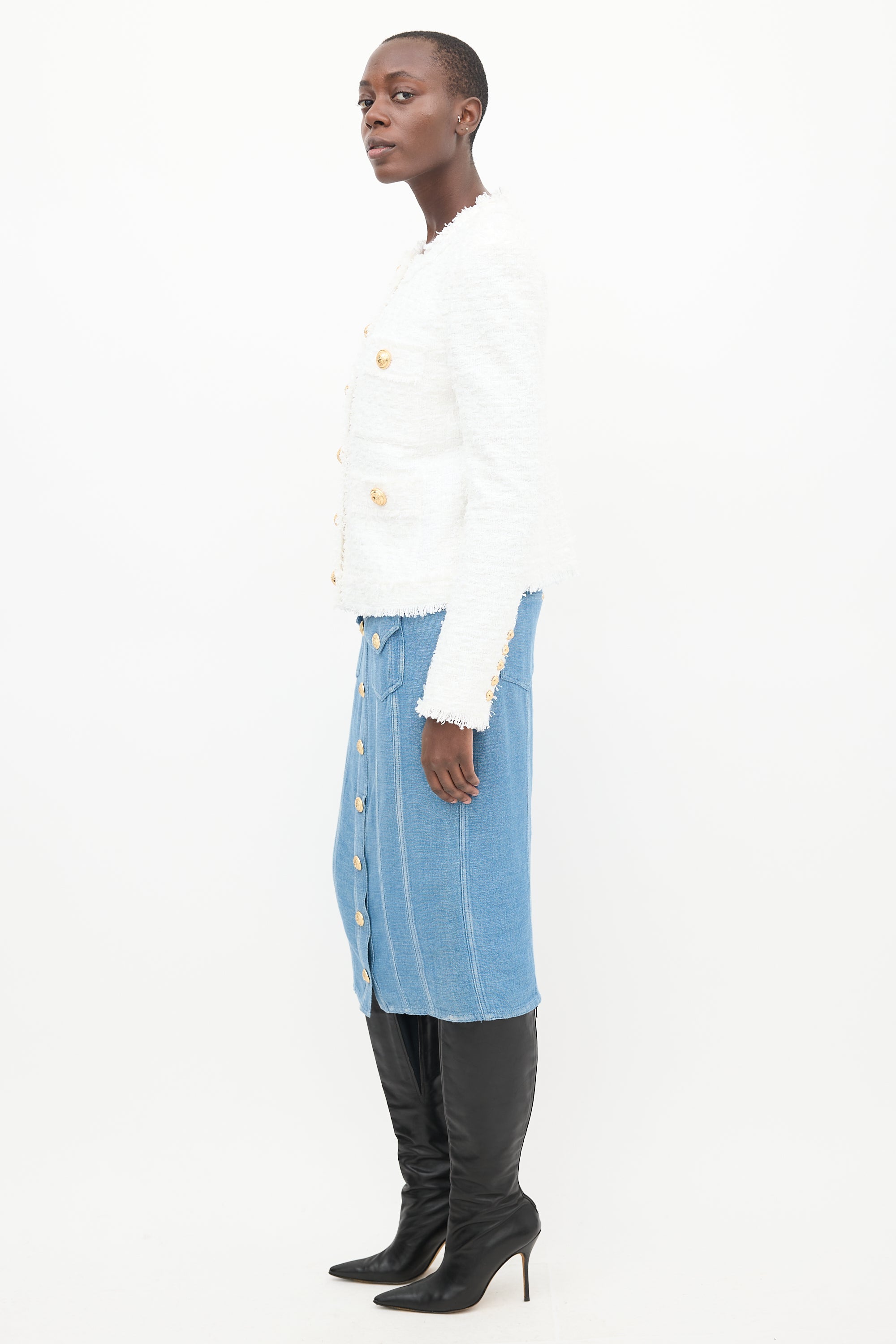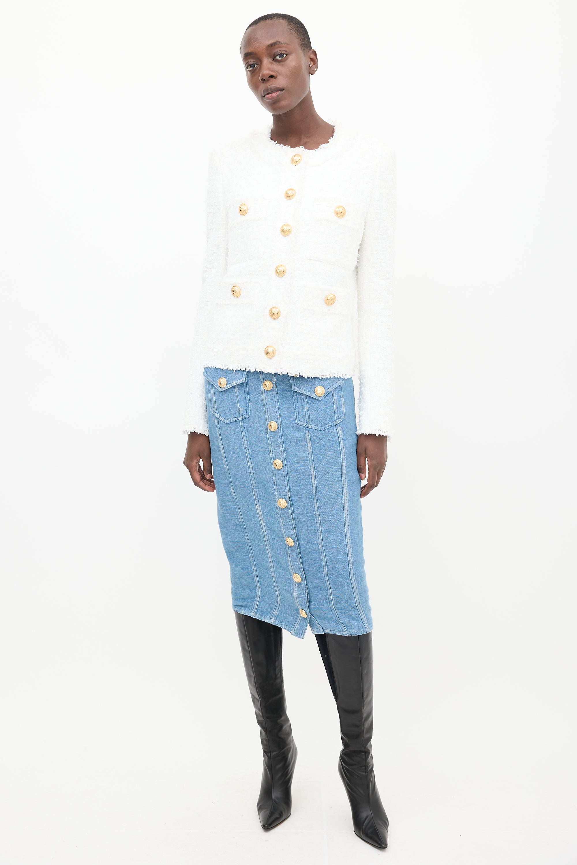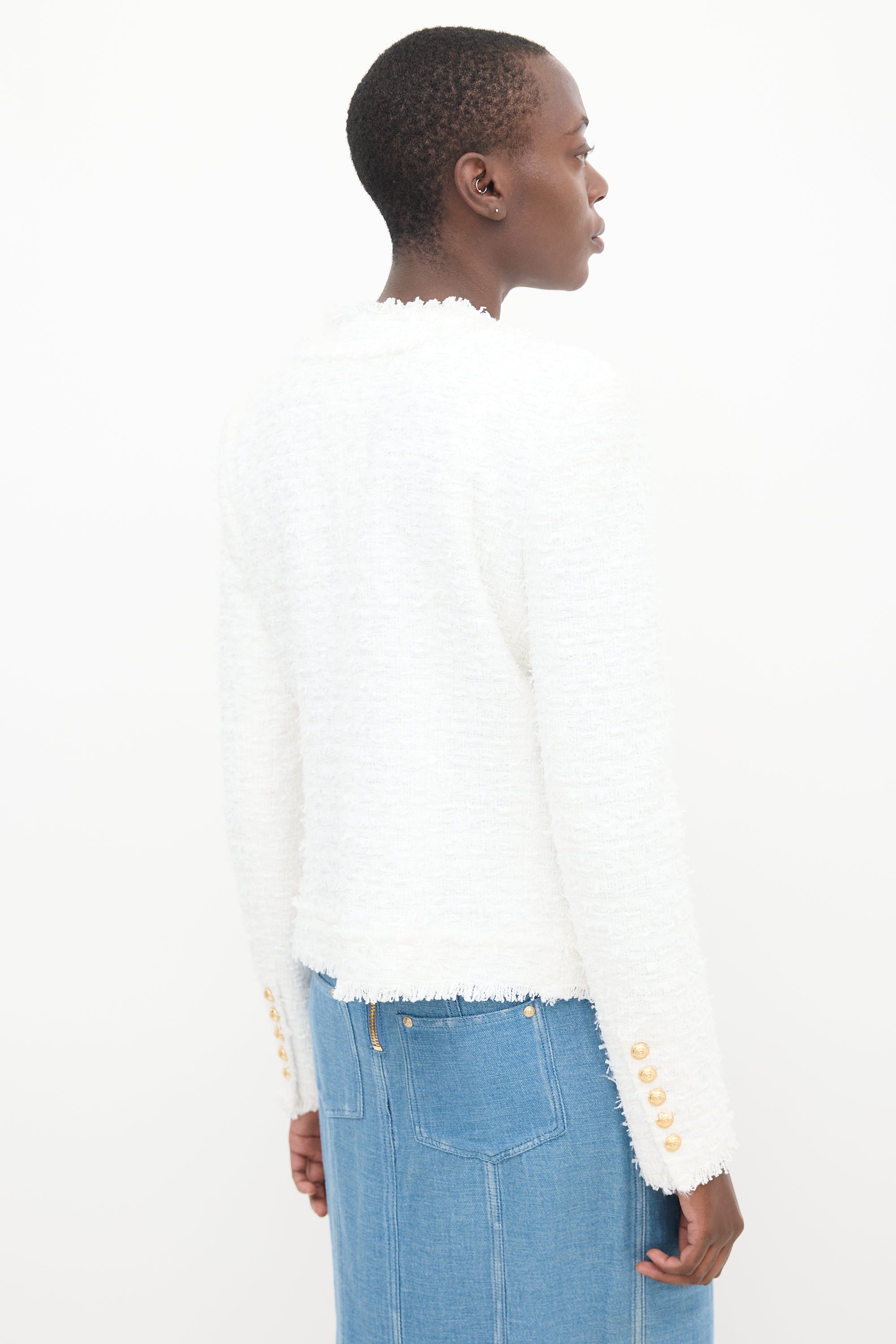 Pre-owned Balmain white tweed jacket featuring a round neckline, long sleeves with buttoned cuffs, four patch pockets at chest, and gold tone button up closure. Lined.