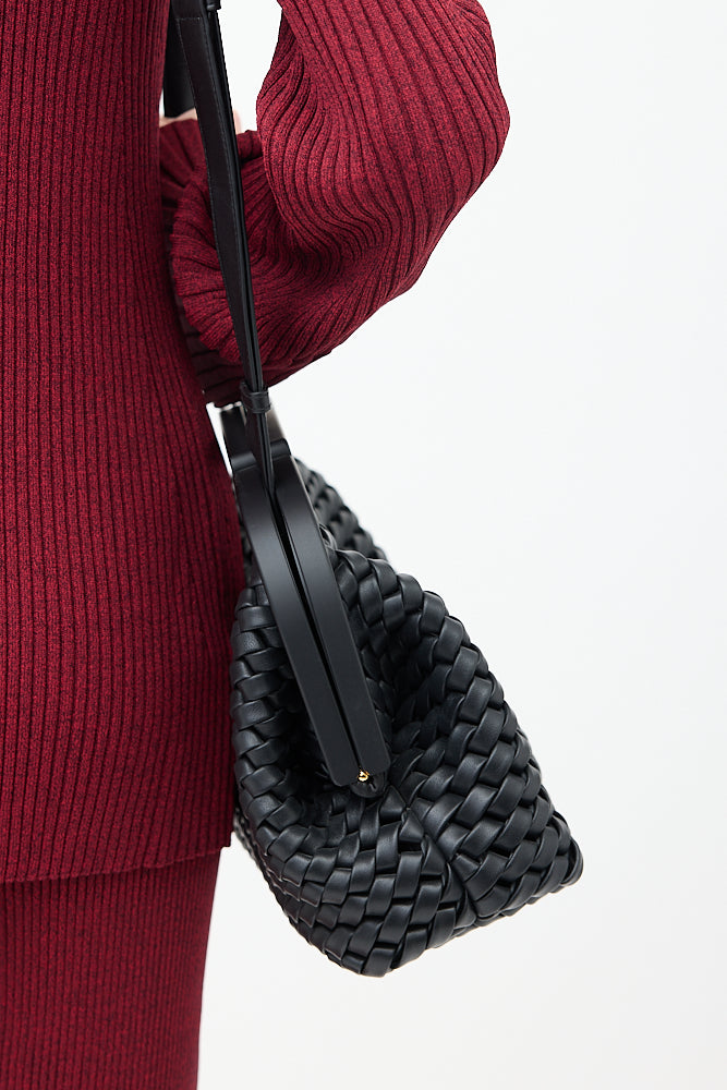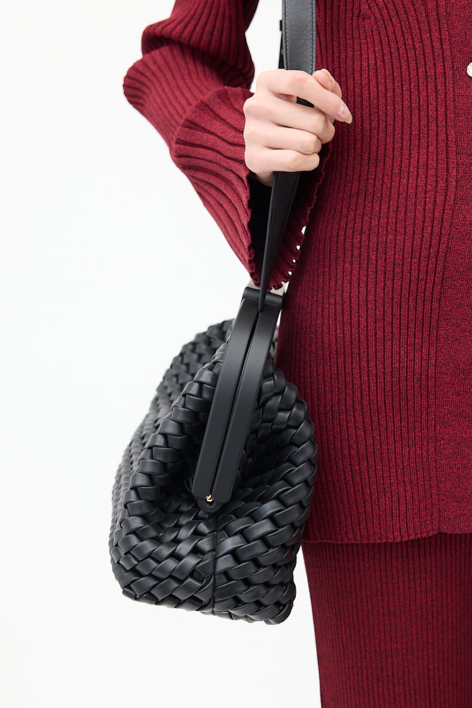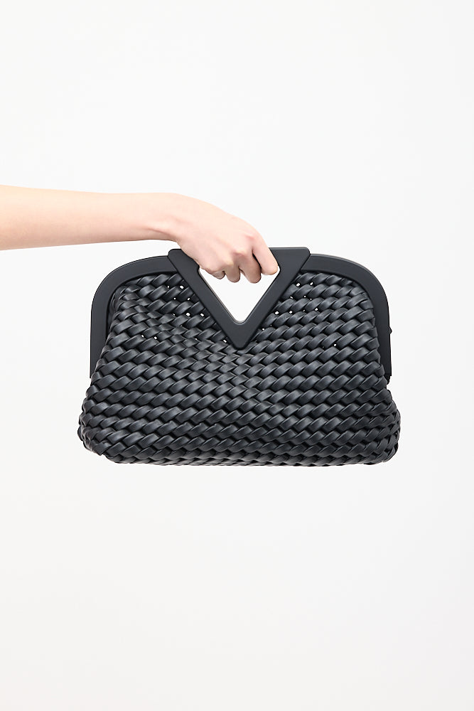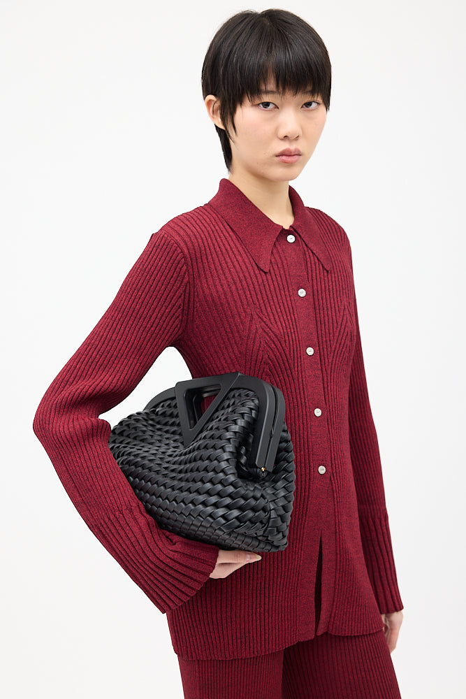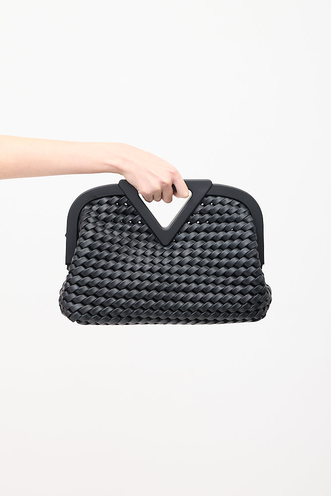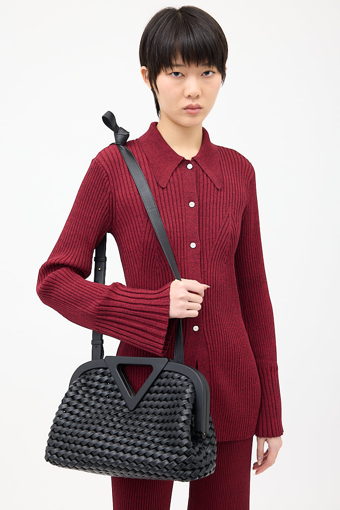 Pre-owned Bottega Veneta black medium The Point Triangle bag featuring Intrecciato woven leather body, triangle cutout handle, removable and adjustable knotted shoulder strap, magnetic frame closure, and one main compartment. Comes with original dust bag.