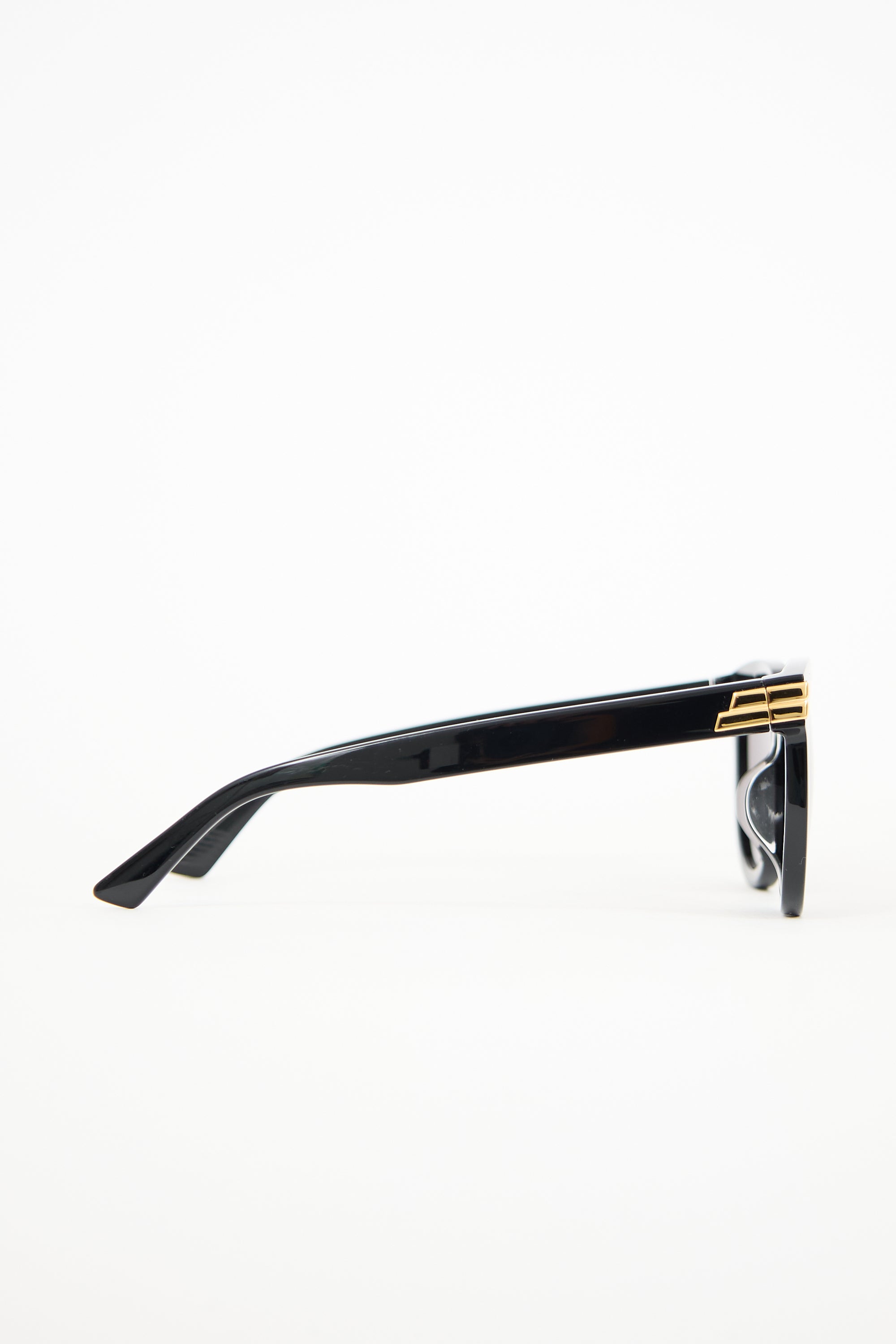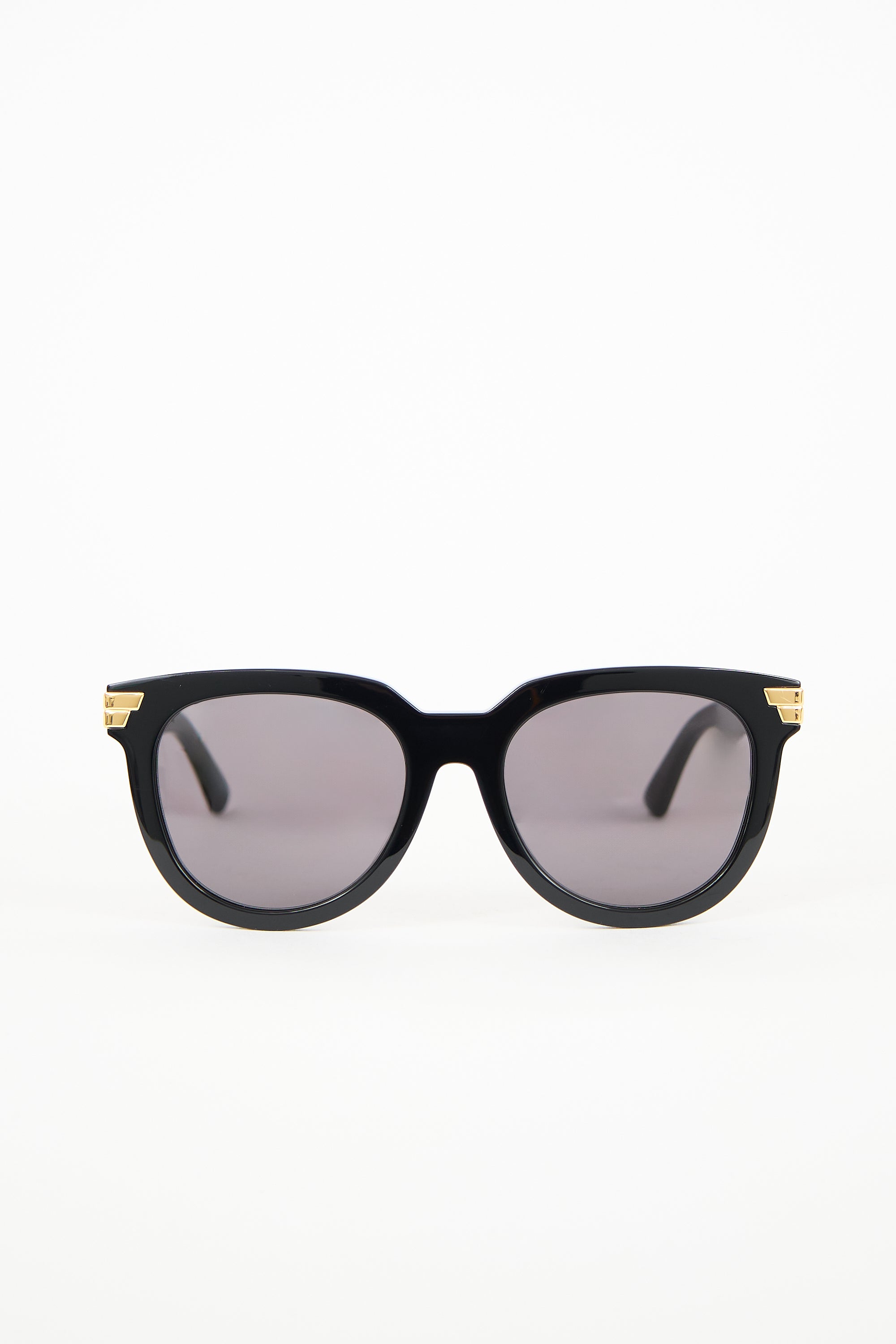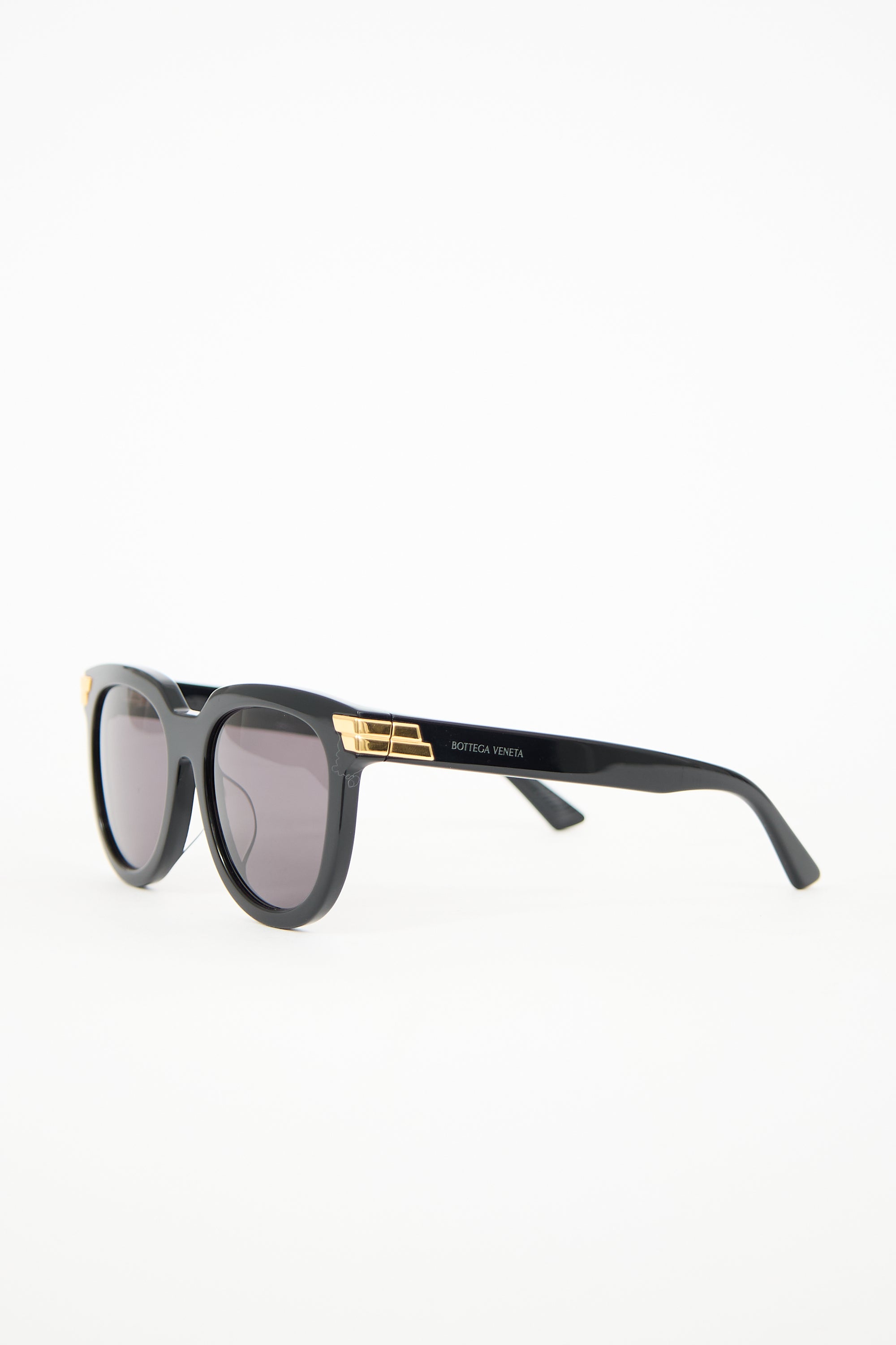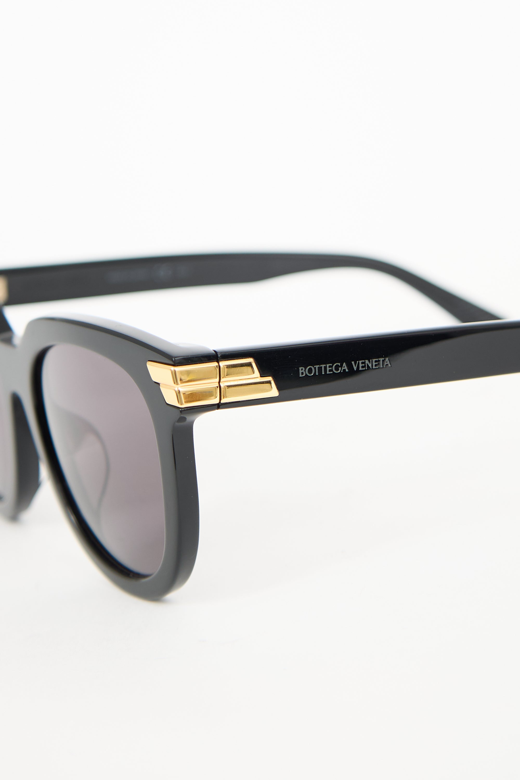Pre-owned Bottega Veneta BV1104SA Unapologetic sunglasses featuring grey tinted lenses, black acetate round frame, gold tone accent at temples, and etched logo at left arm. Comes with original pouch.