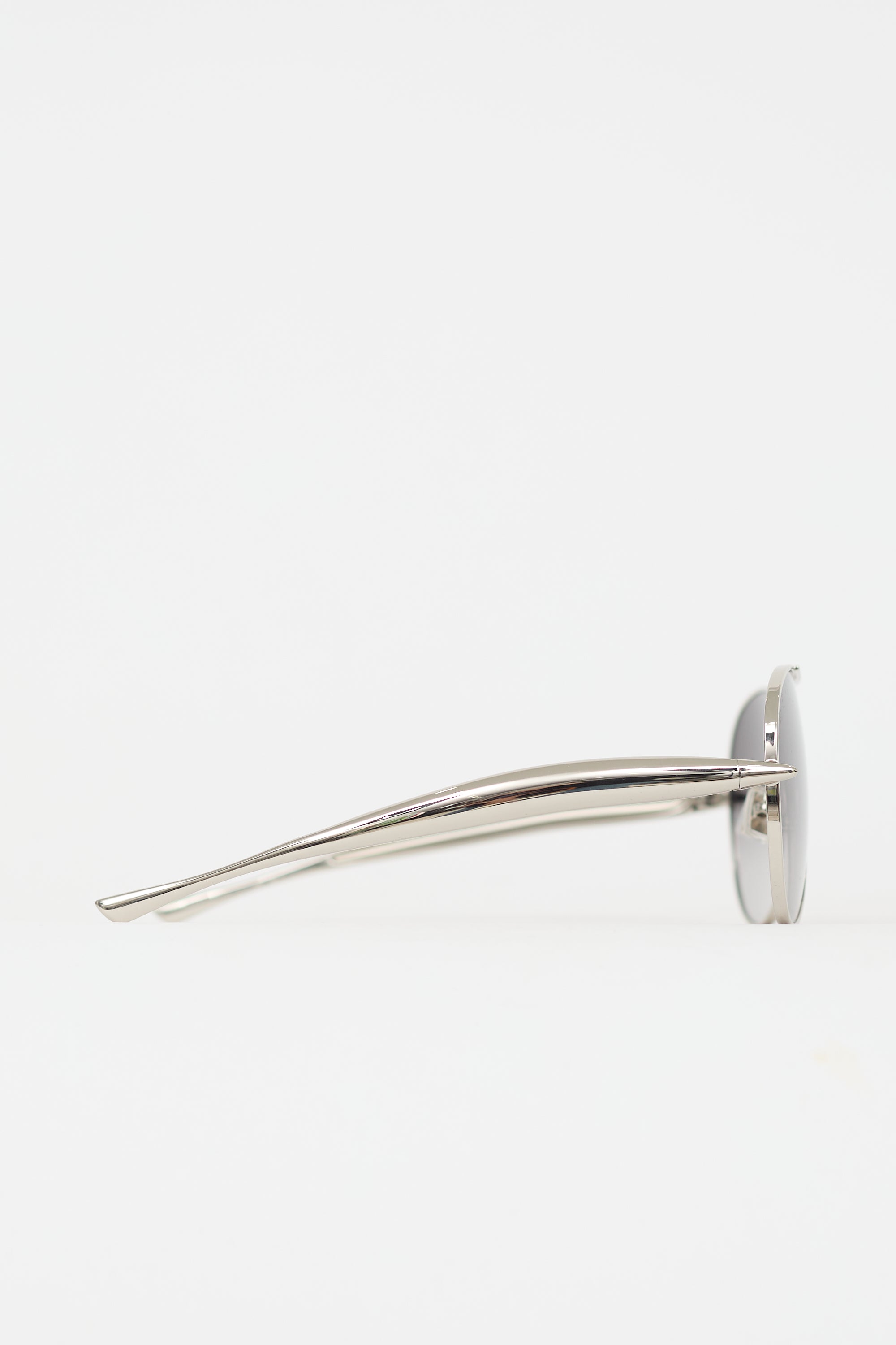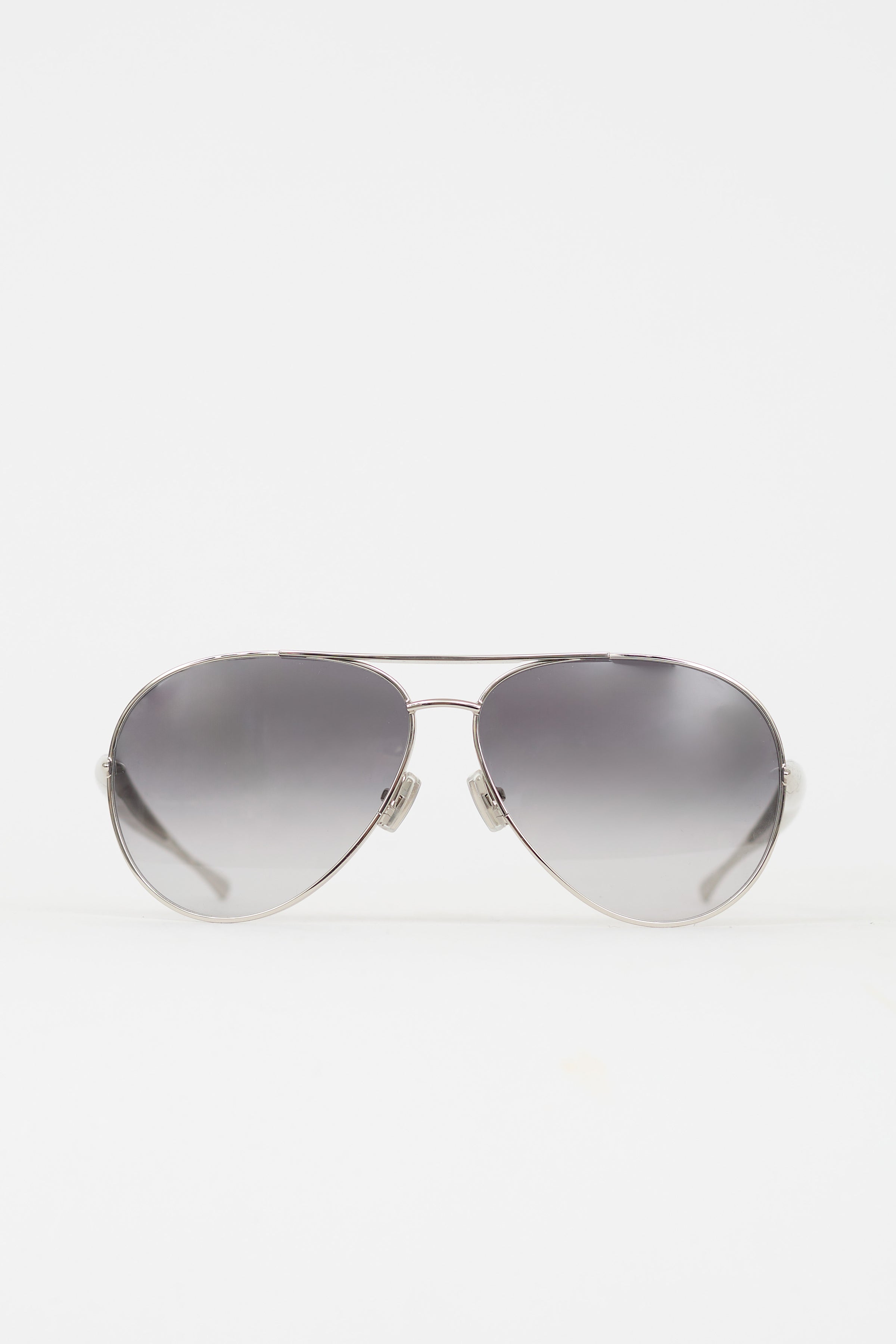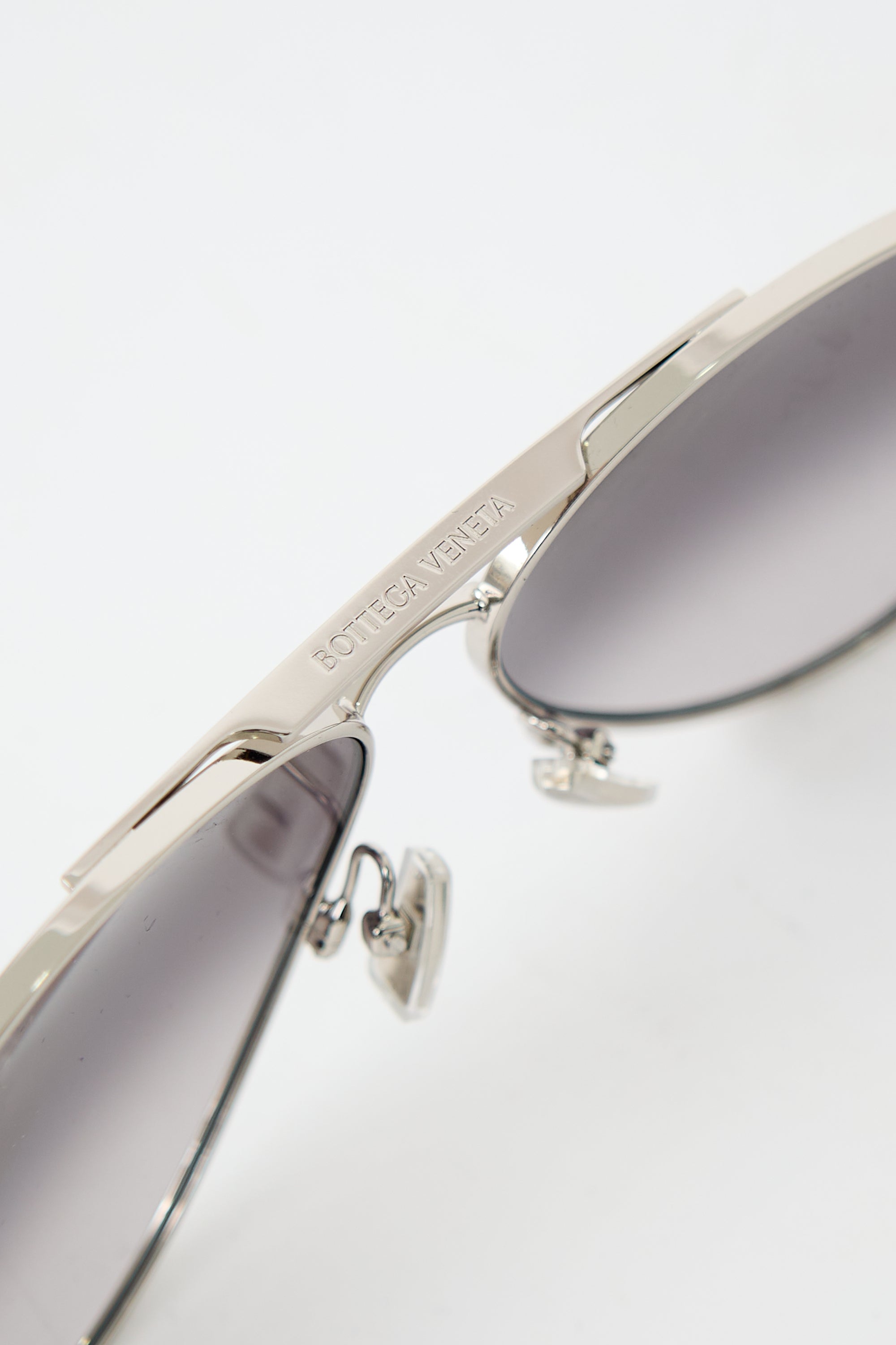 Pre-owned Bottega Veneta BV1305S sunglasses featuring grey gradient tinted lenses, silver tone metal aviator frame, etched logo at top bar, and sculptural arms.