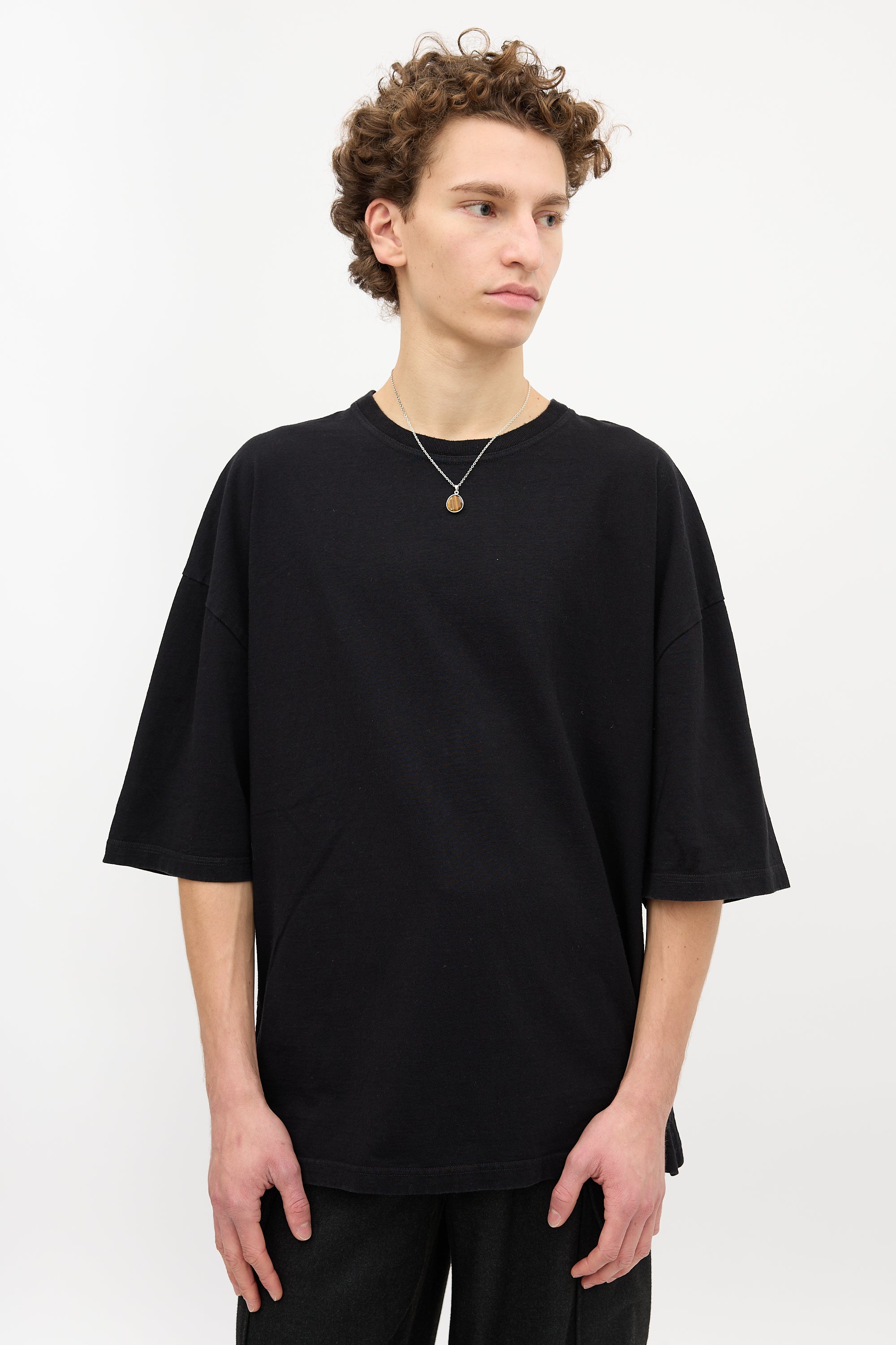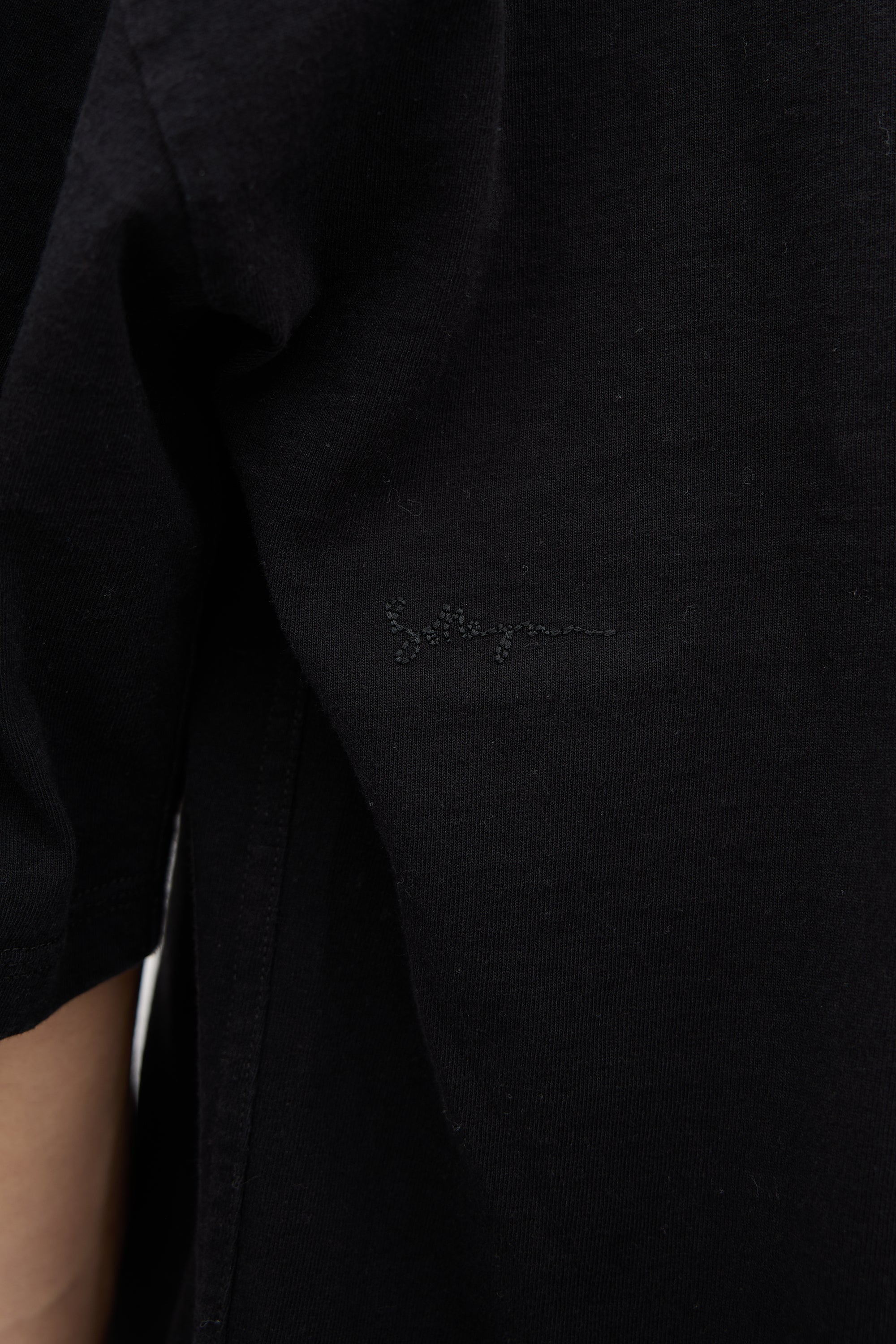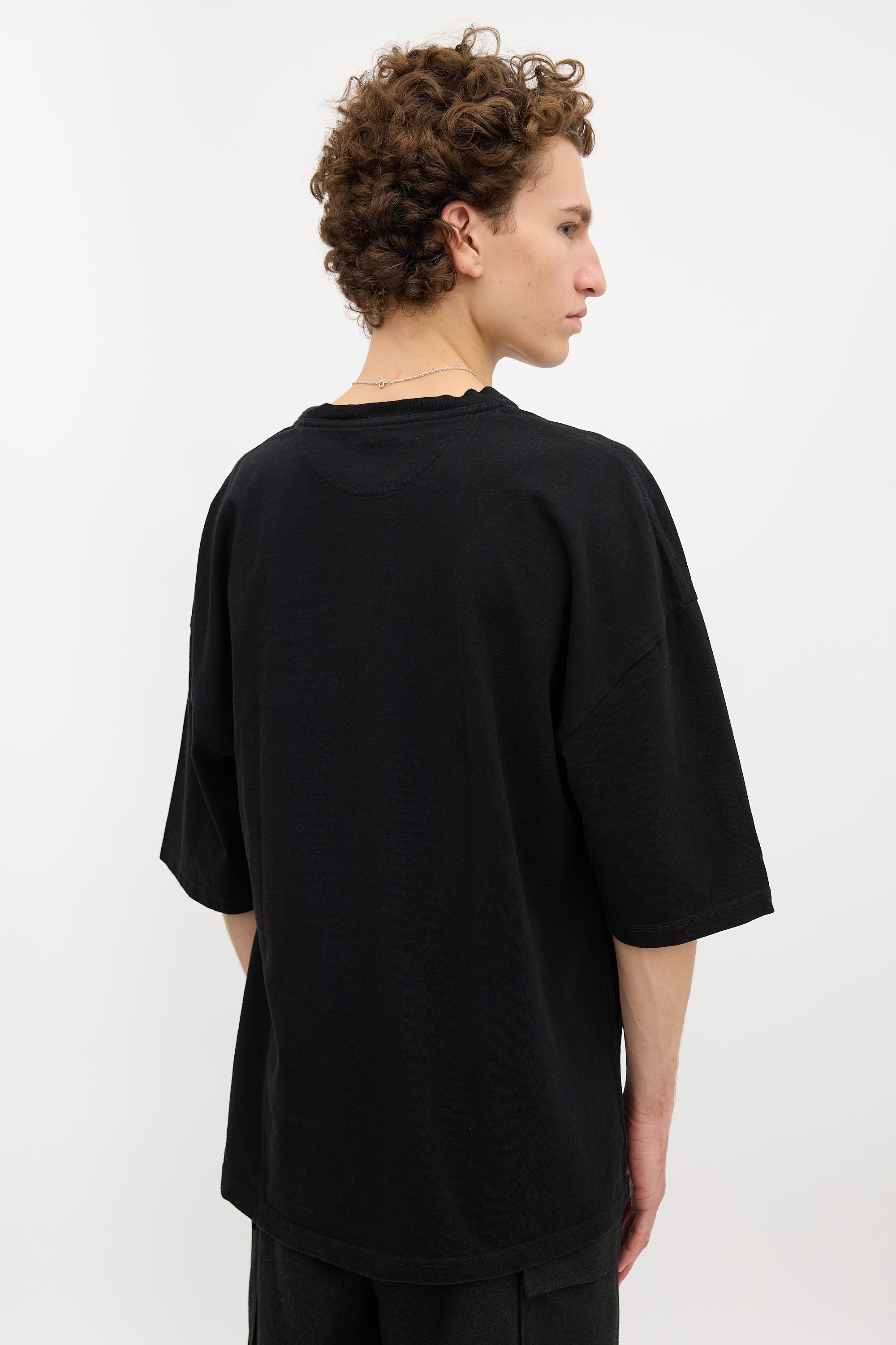 Pre-owned Bottega Veneta black mid-weight T-shirt featuring a crew neckline, dropped shoulder, tonal logo embroidery at back side, and boxy silhouette.