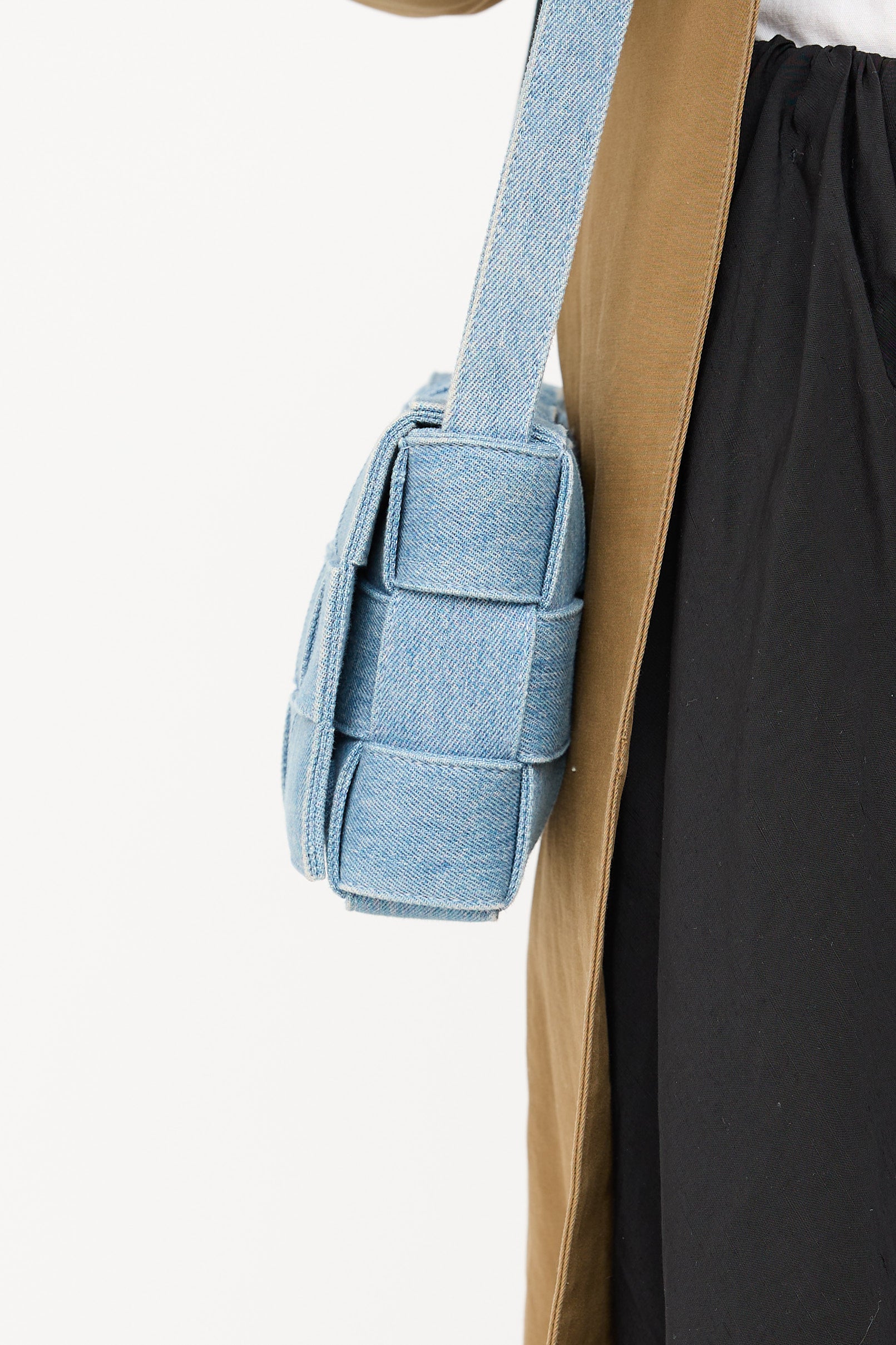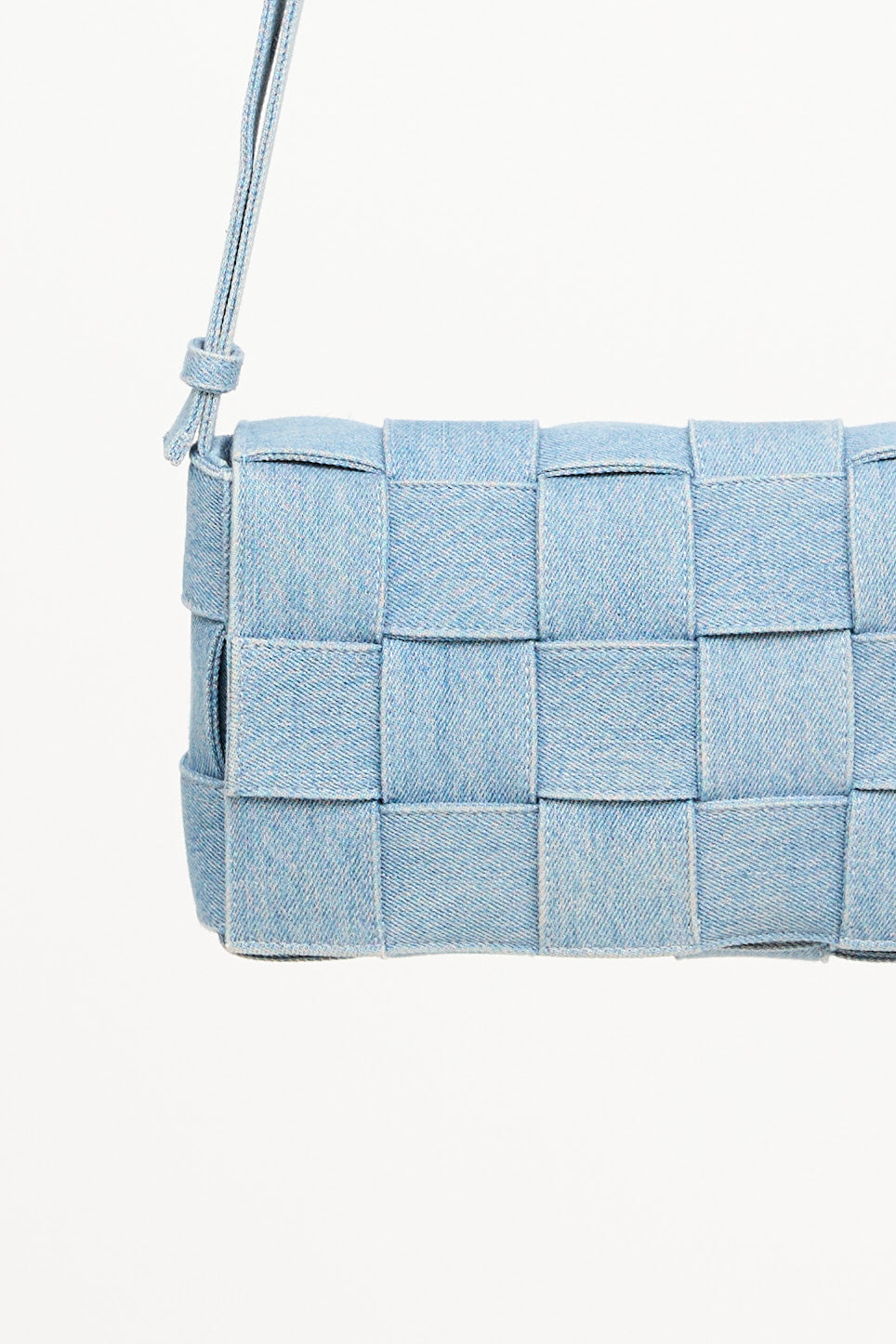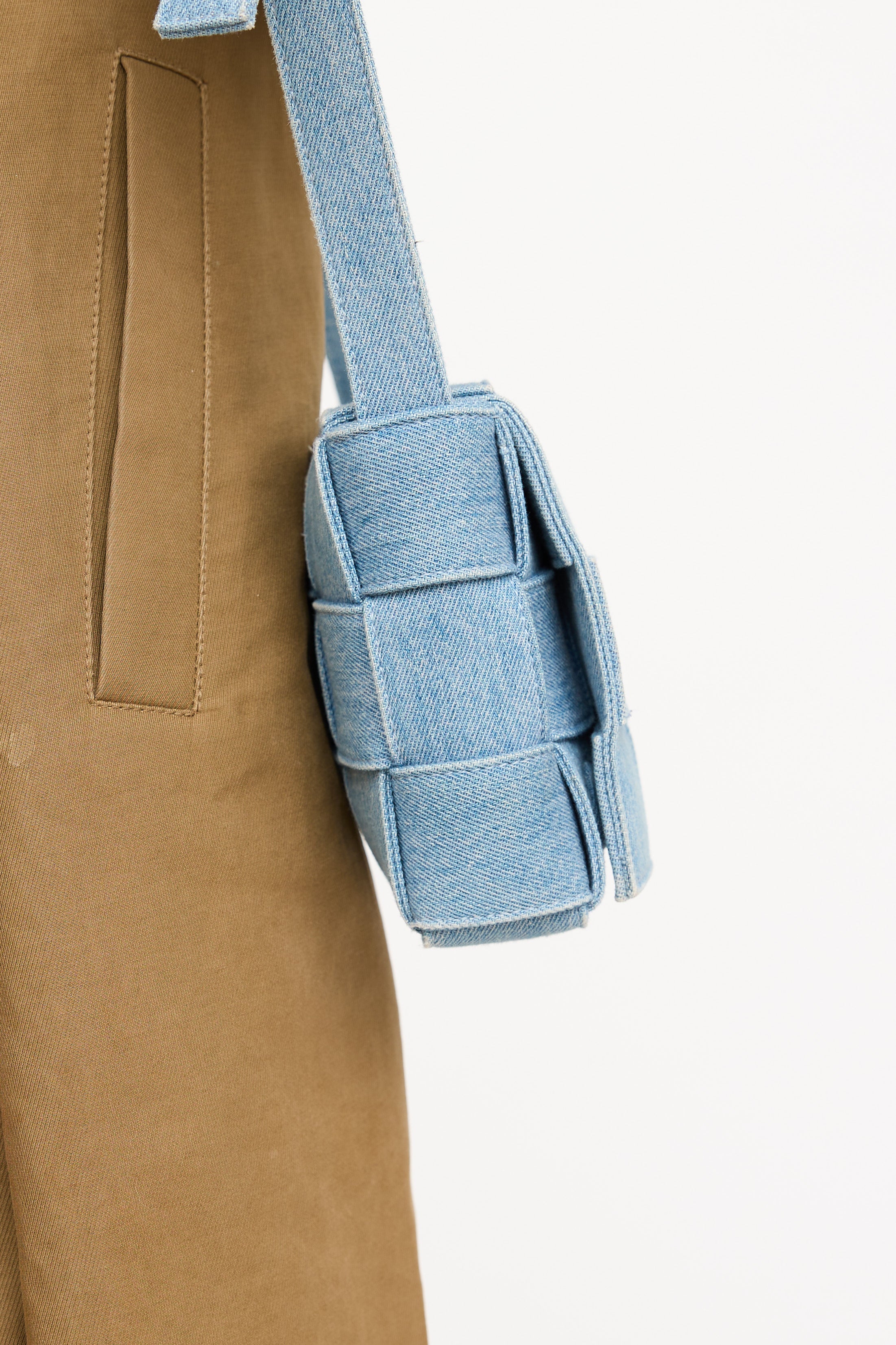 Pre-owned Bottega Veneta denim Cassette bag featural single flat adjustable shoulder strap, silver tone hardware, signature woven exterior and magnetic button closure on top flap. Main compartment with single slip pocket and zip pocket.