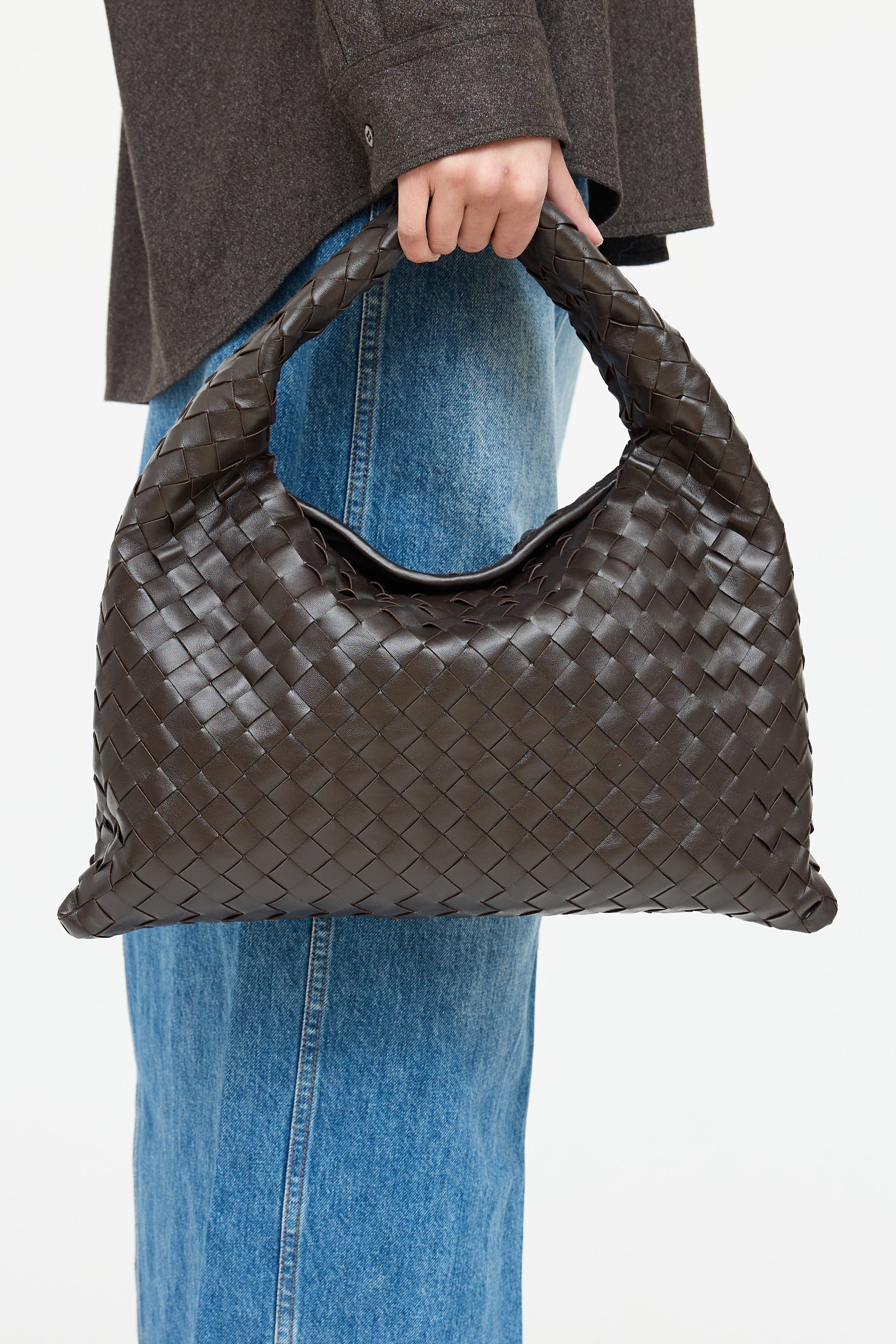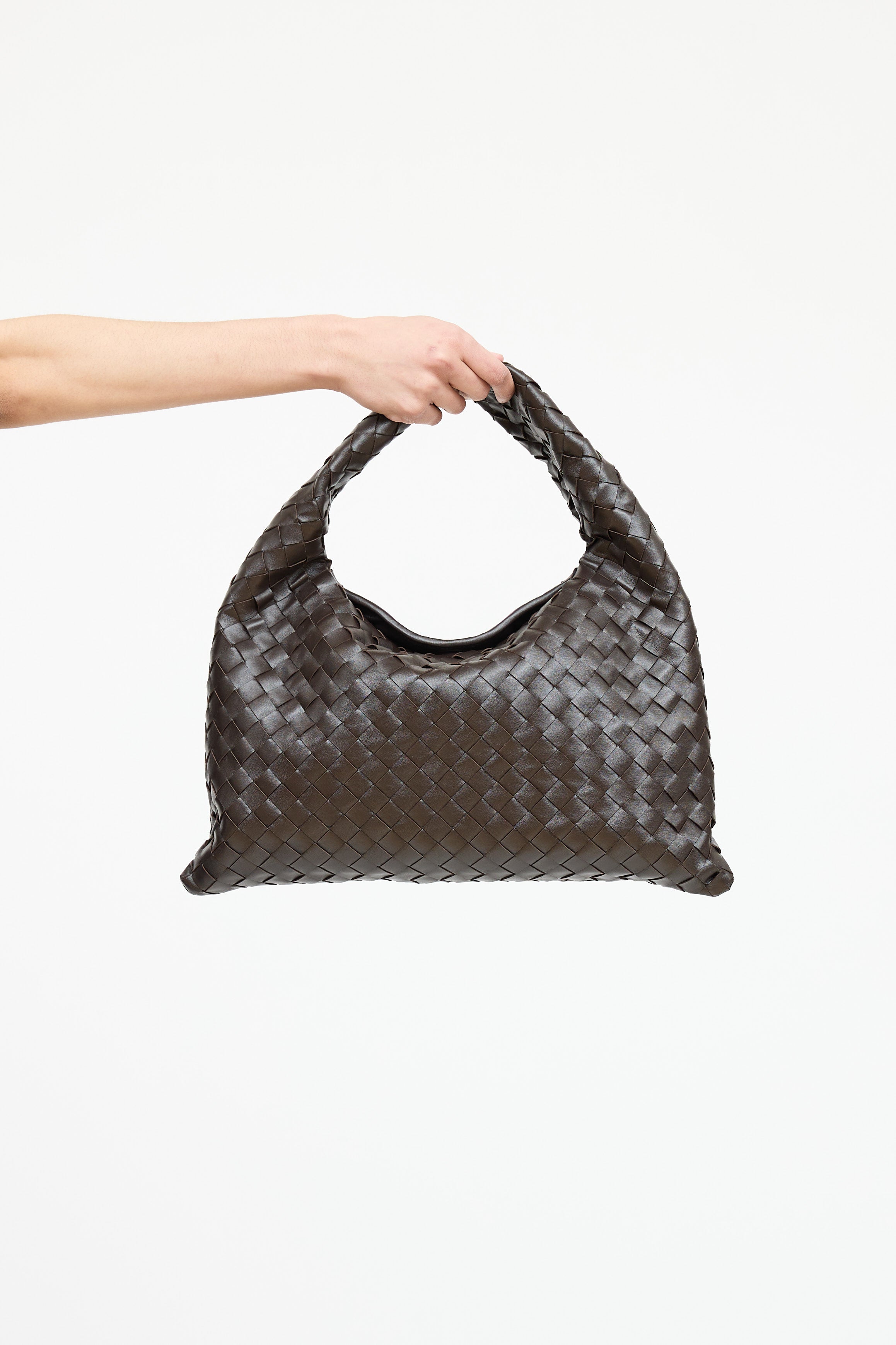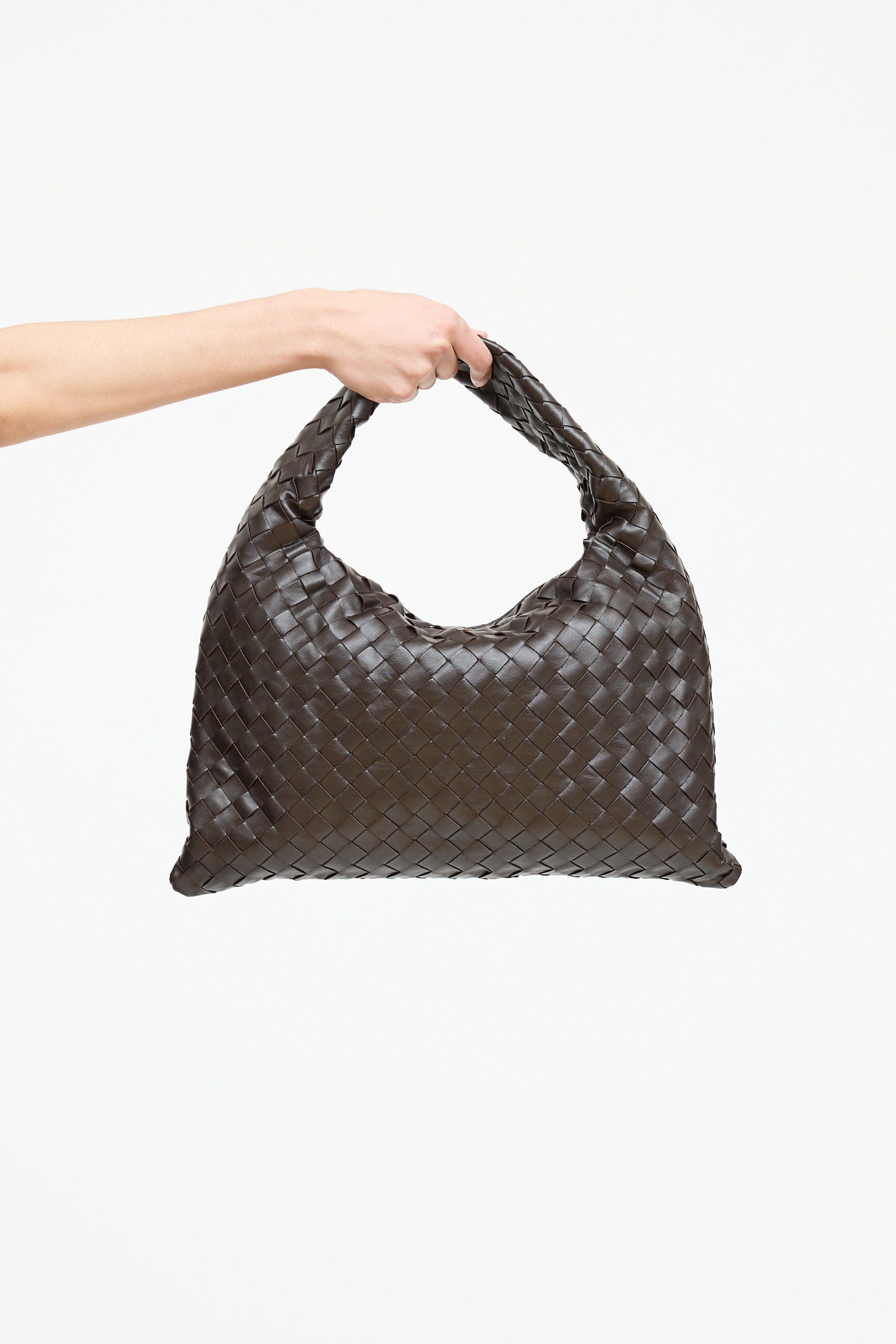 Pre-owned Bottega Veneta Hop shoulder bag in brown Fondant colour, Intrecciato craftsmanship in calf leather, singular top handle and magnetic closure with singular zip pocket at interior.