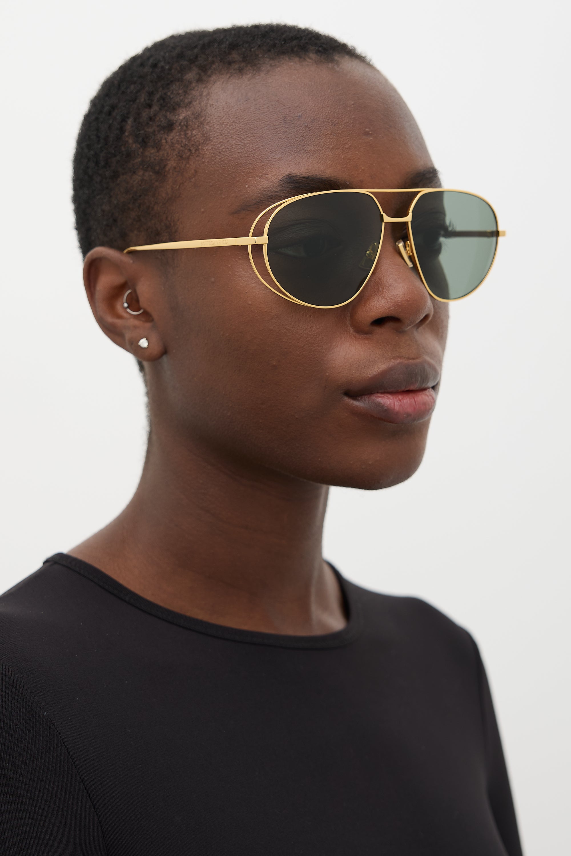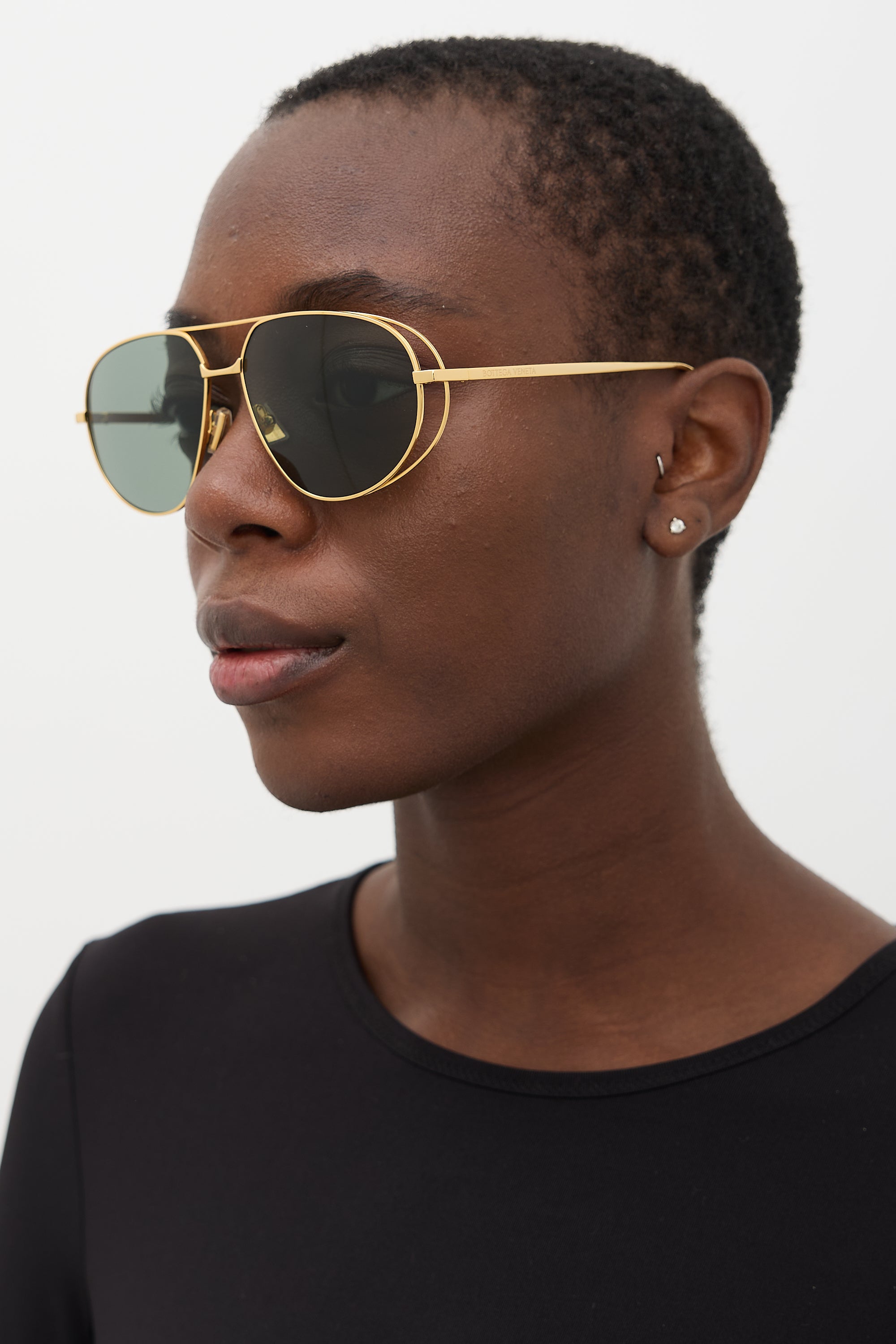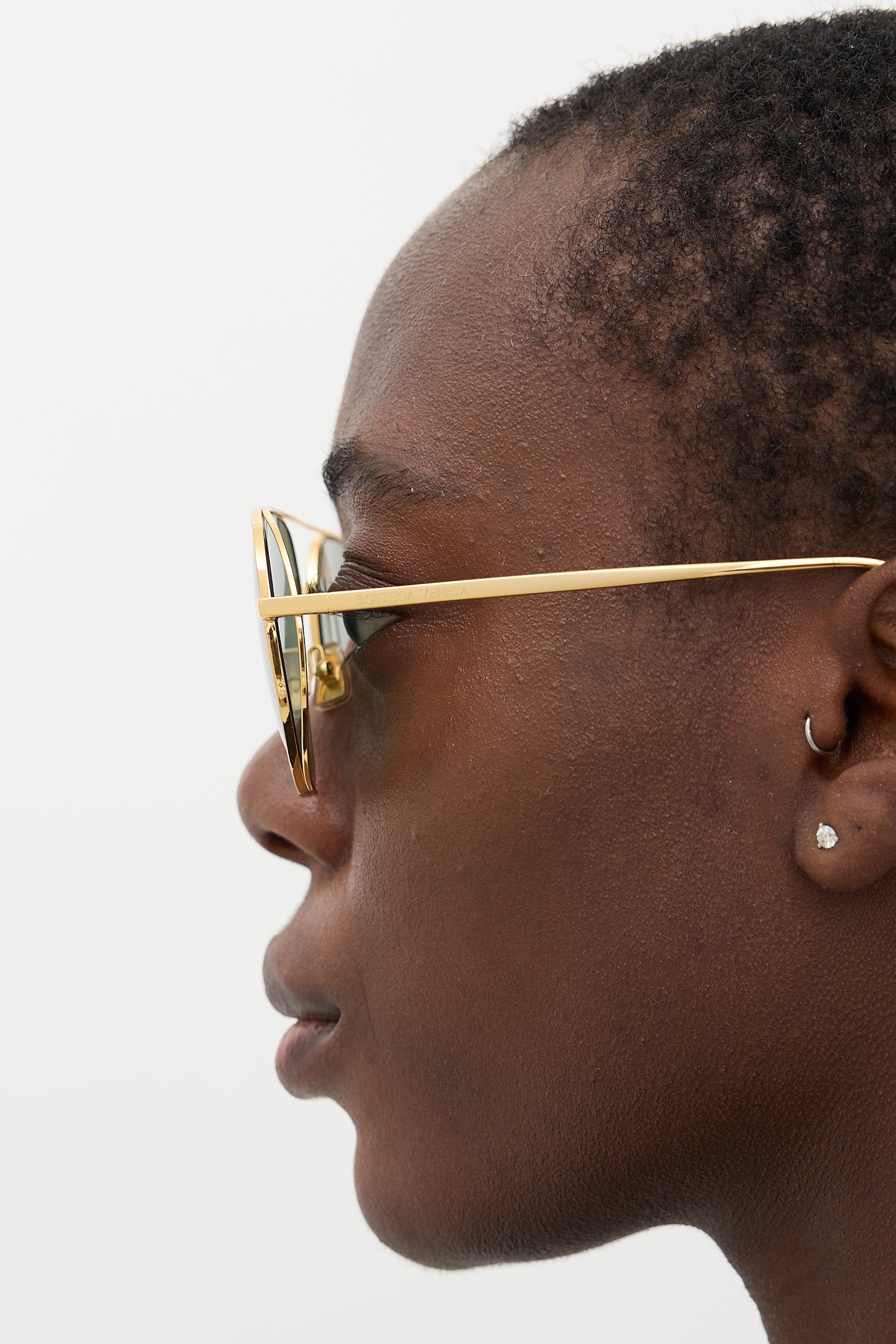 Pre-owned Bottega Veneta BV1344S sunglasses featuring grey tinted lenses, gold tone metal round aviator frame, and etched logo at temples. Comes with original case and wipe cloth.