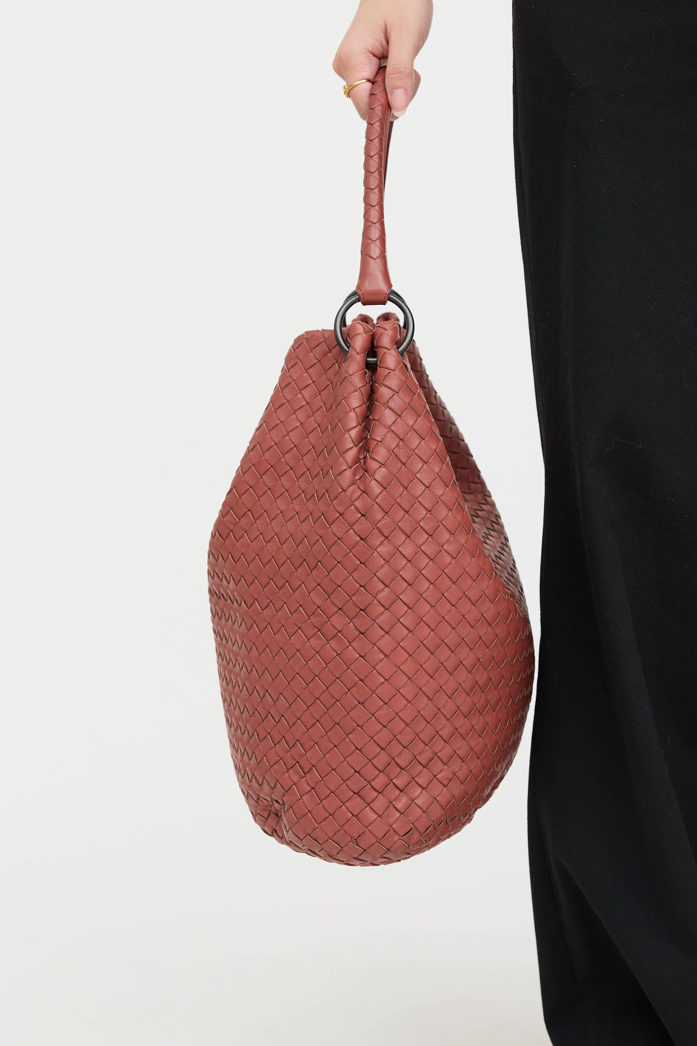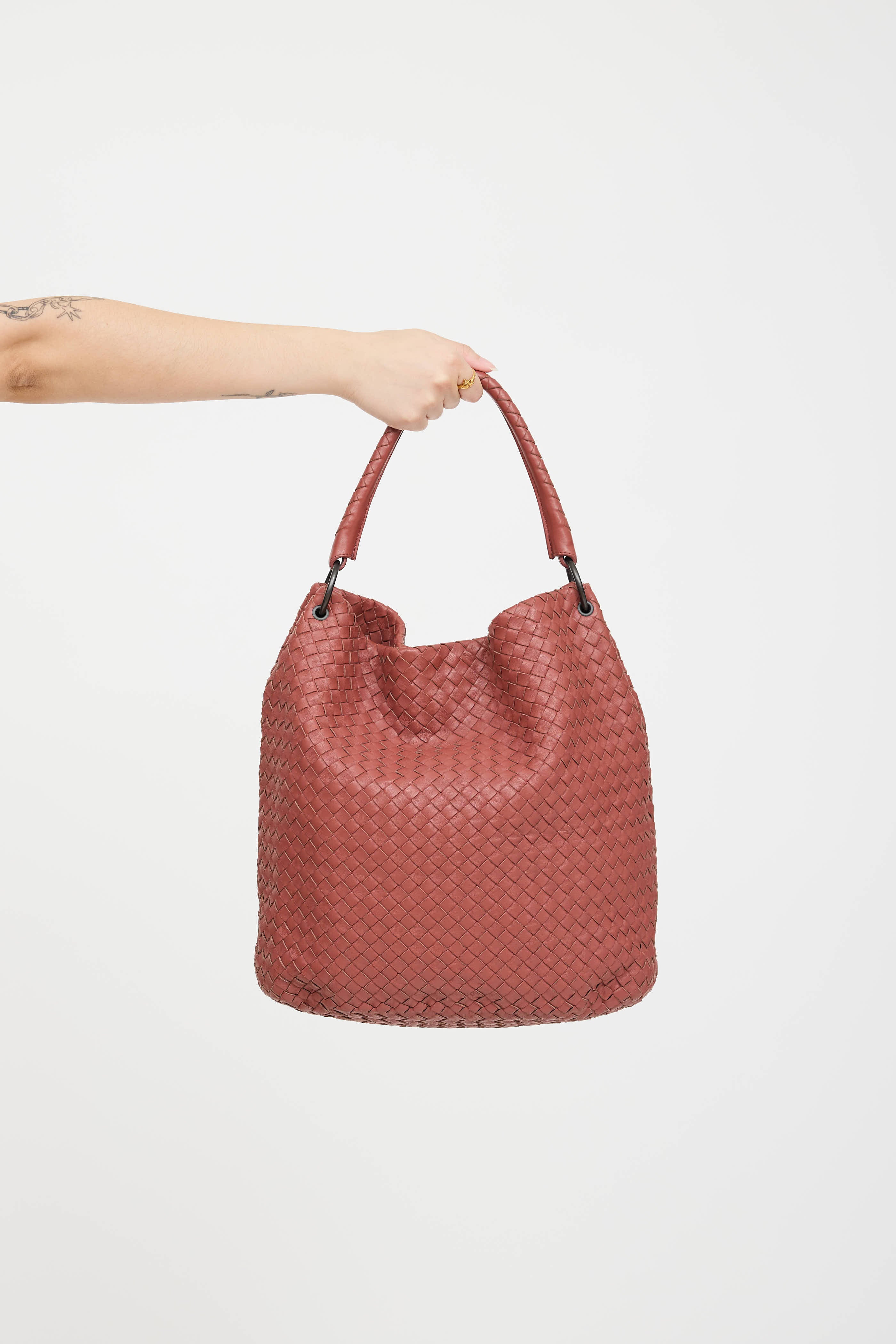 Pre-owned Bottega Venetta pink Intrecciato leather bag featuring singular rolled leather top handle, gunmetal hardware, concealed magnet closure, suede lined main compartment featuring one zip pocket and one slip pocket.
