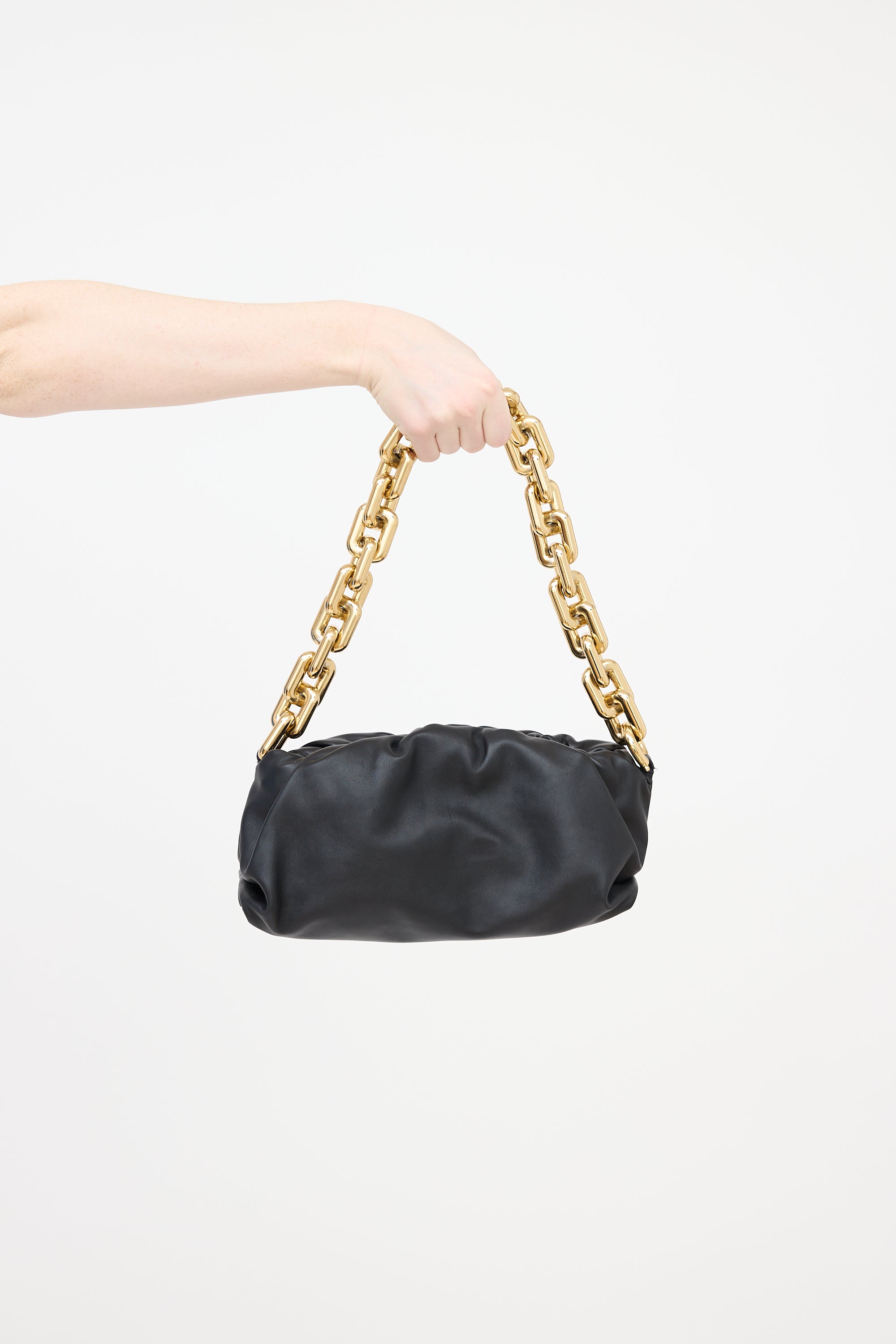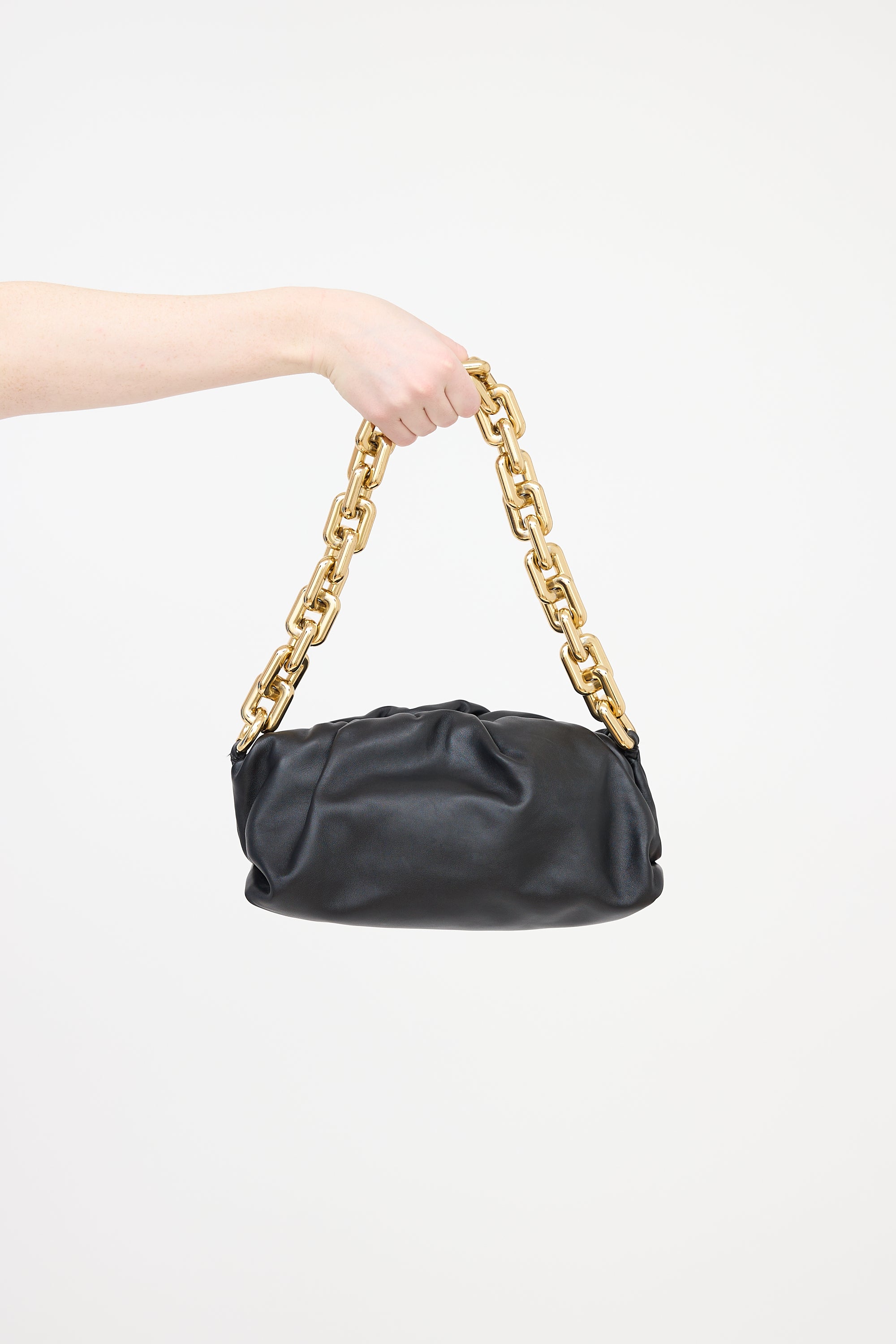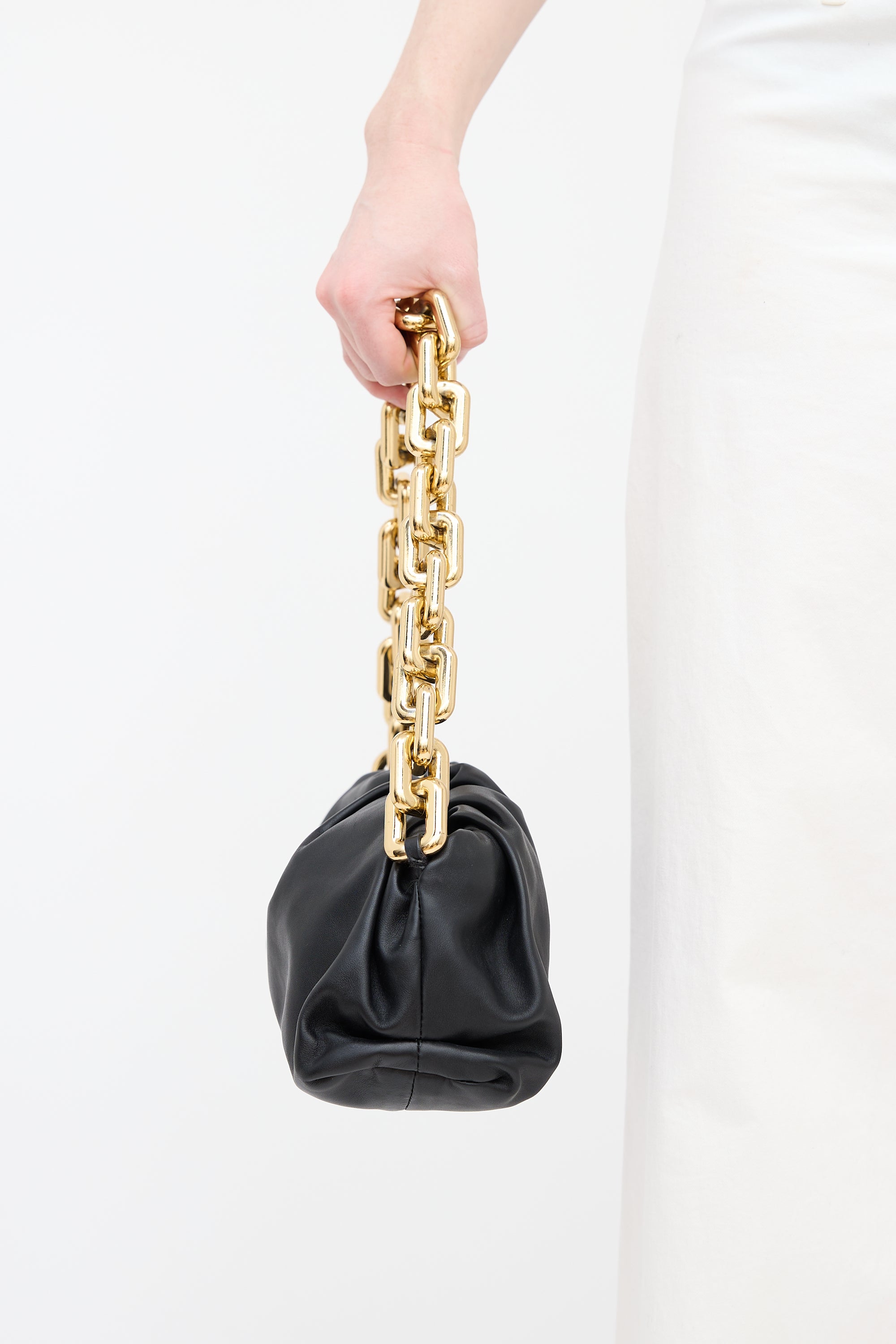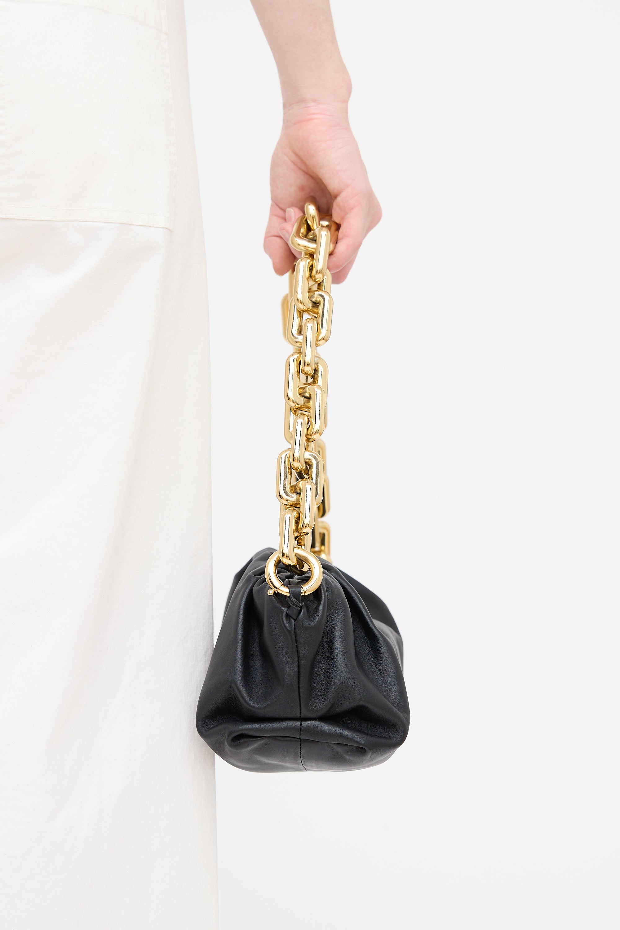 Pre-owned Bottega Veneta black leather Chain Pouch featuring gold tone exaggerated chain strap with clasp closure, magnetic hinge closure, and one main compartment. Comes with original dust bag.