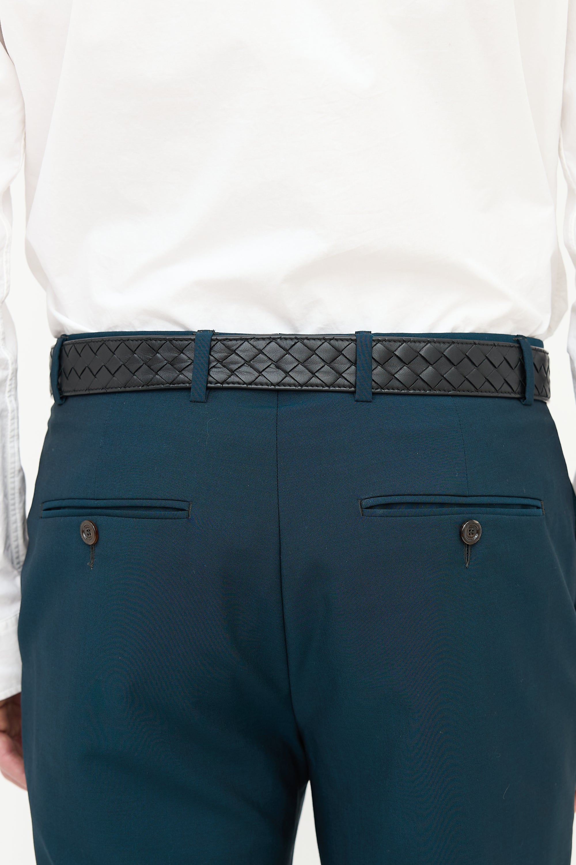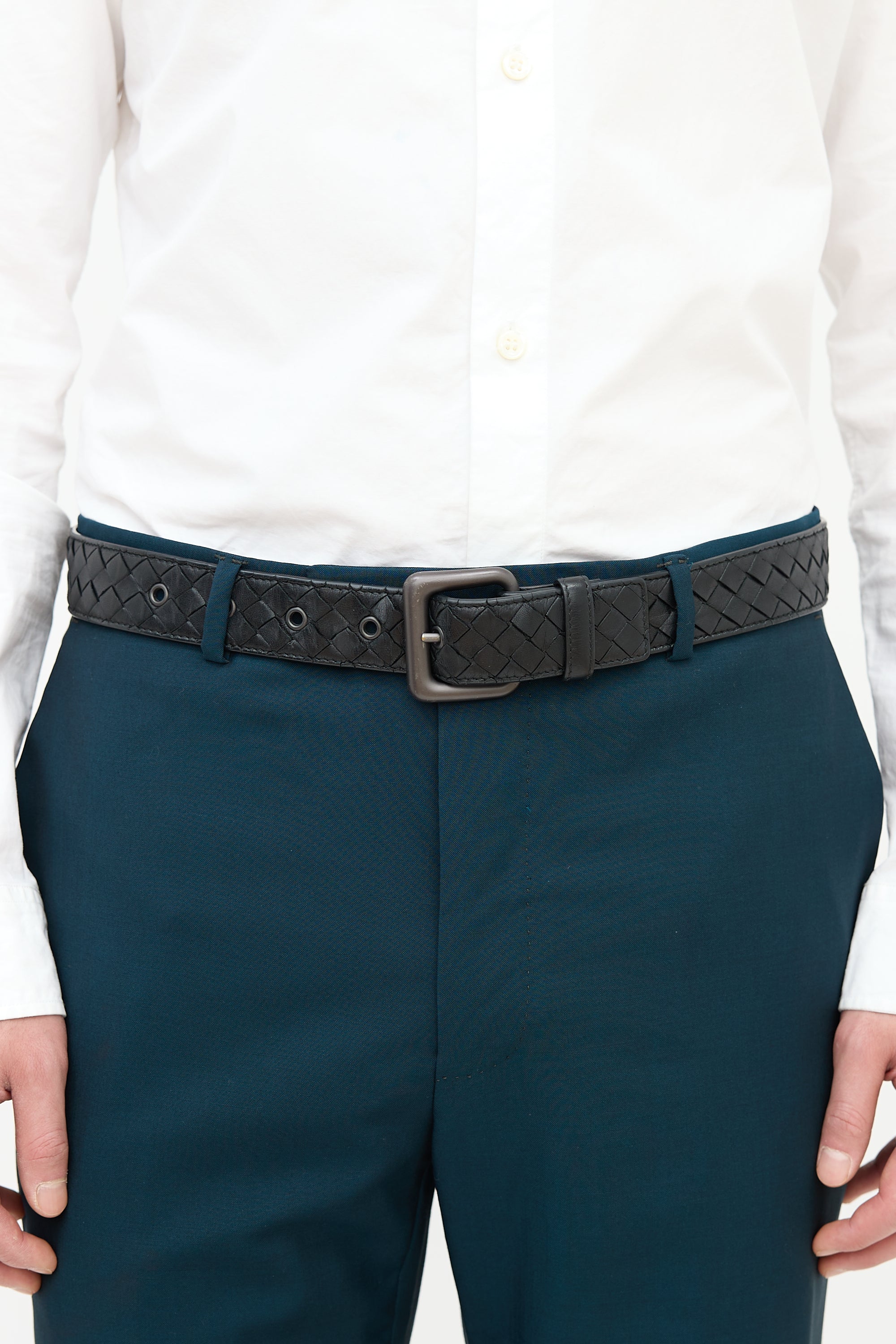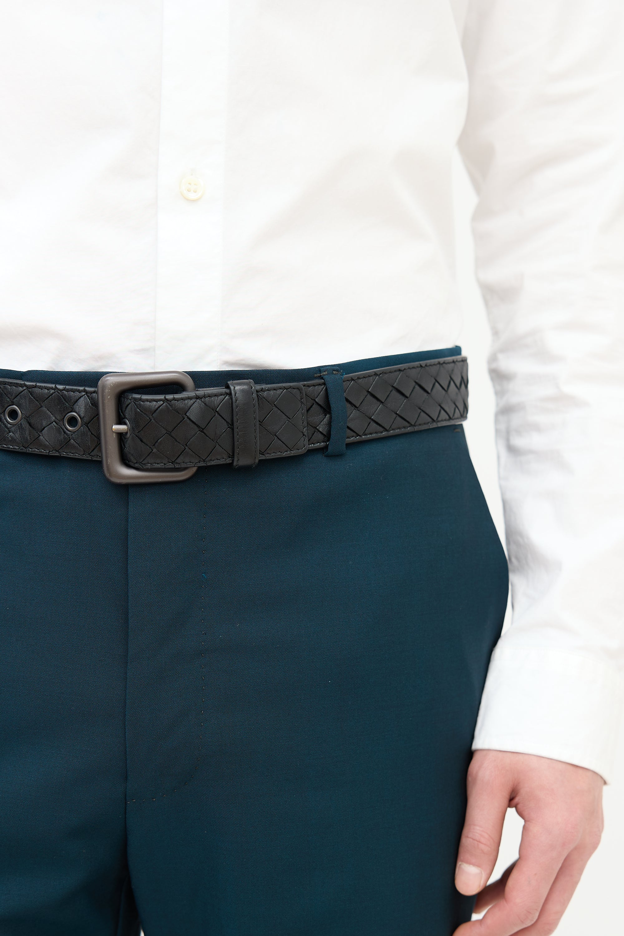 Pre-owned Bottega Veneta black leather belt featuring Intrecciato weave, a polished gunmetal buckle, and black leather reversed.