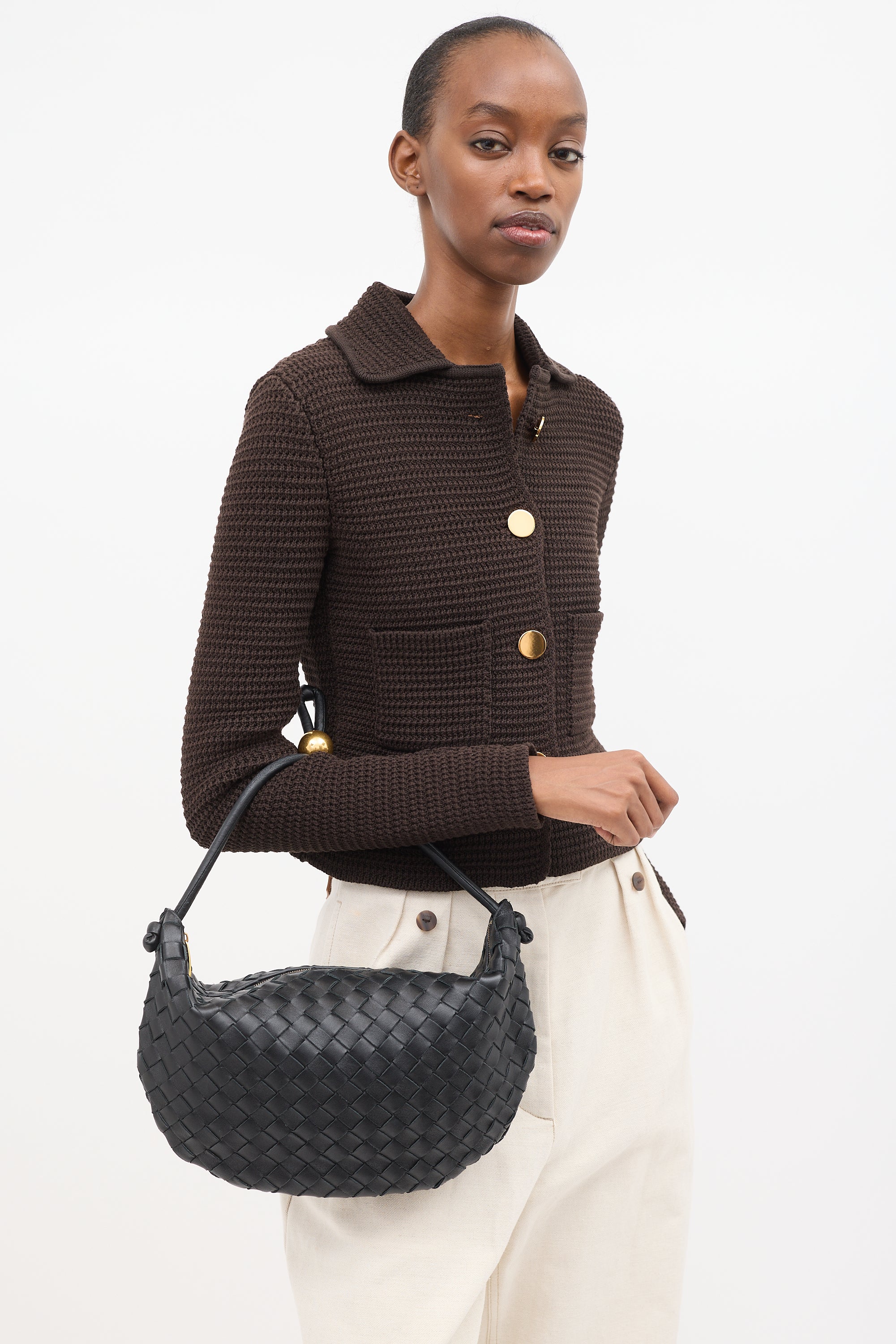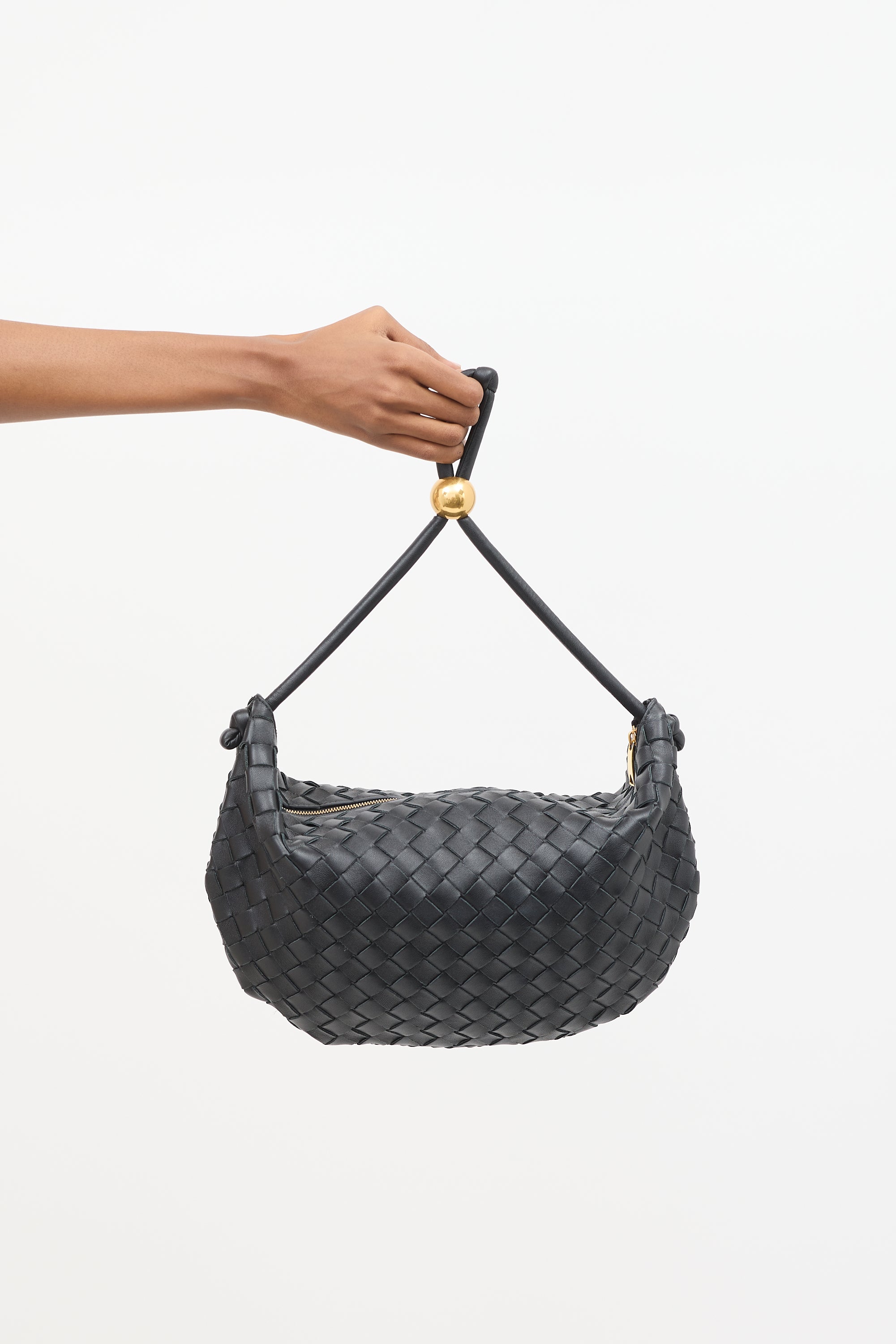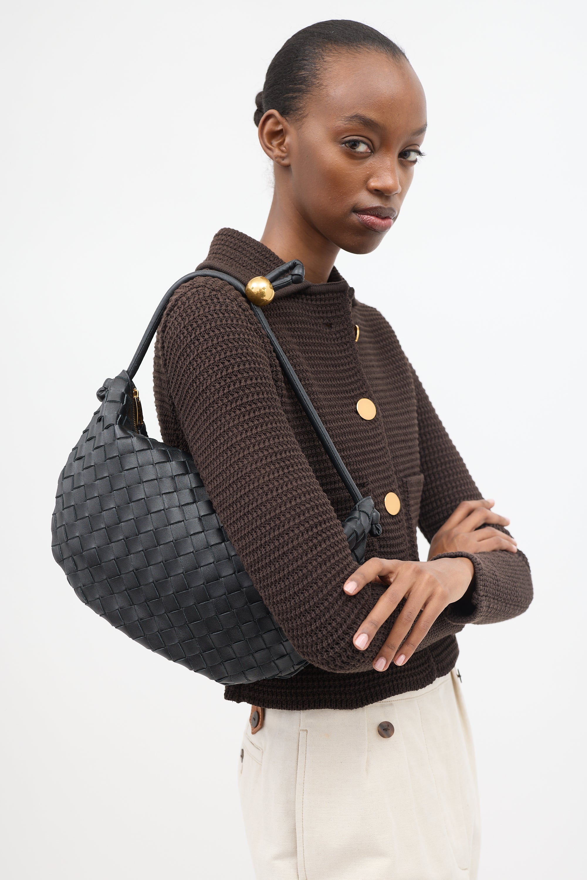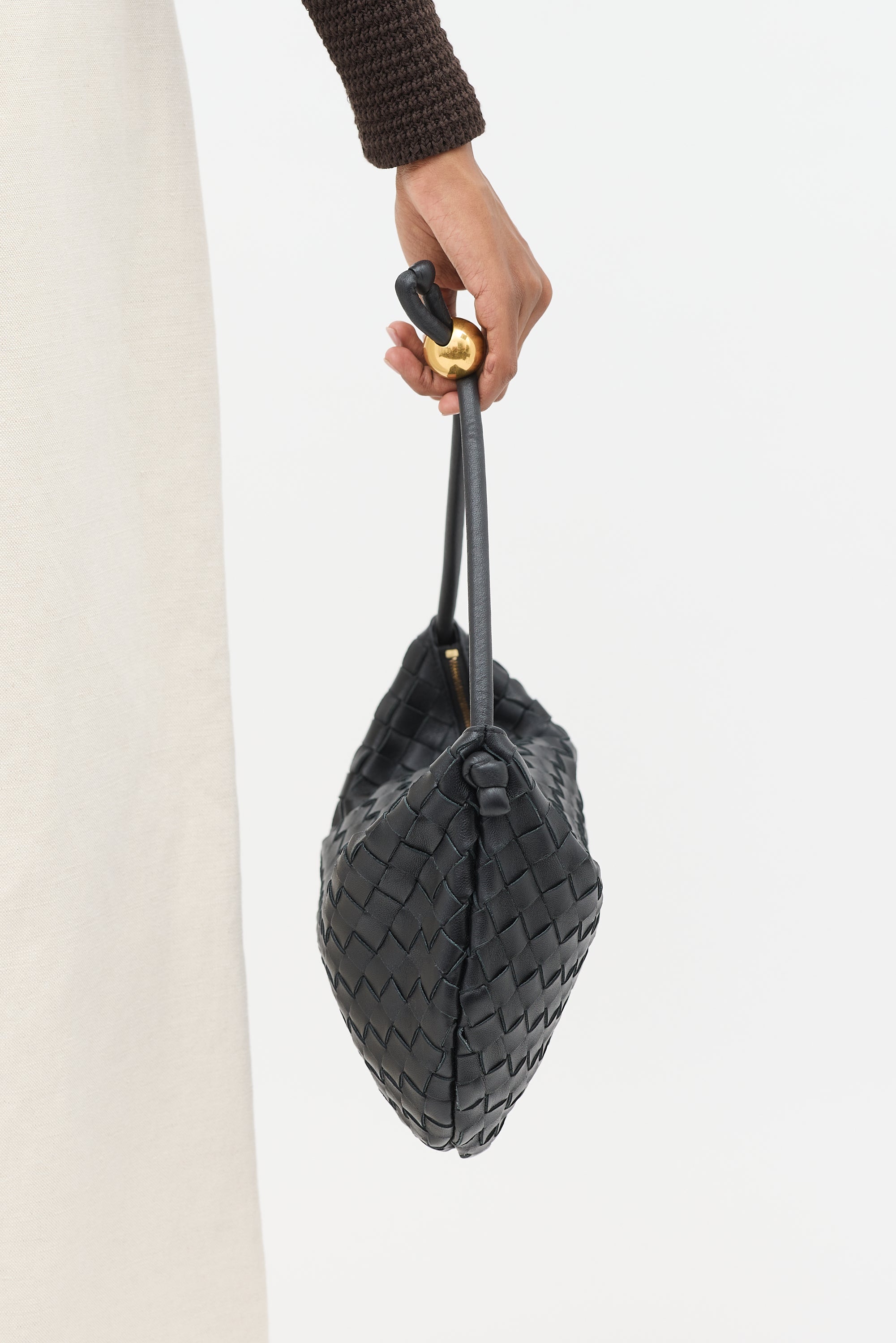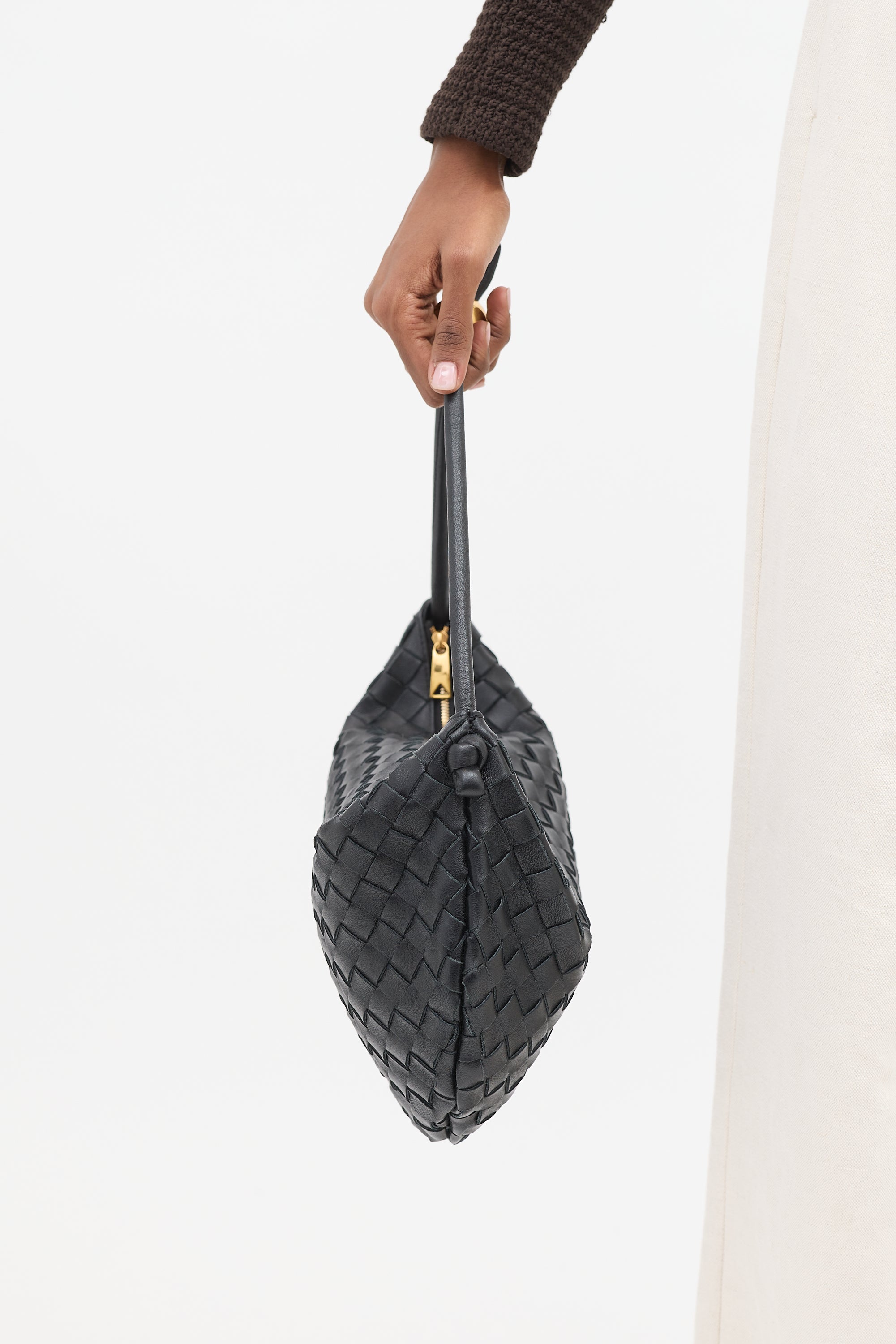 Pre-owned Bottega Veneta black leather medium Turn pouch bag featuring signature Intrecciato woven body, gold tone hardware, single adjustable rolled handle, top zip closure, and one main compartment. Comes with original dust bag.