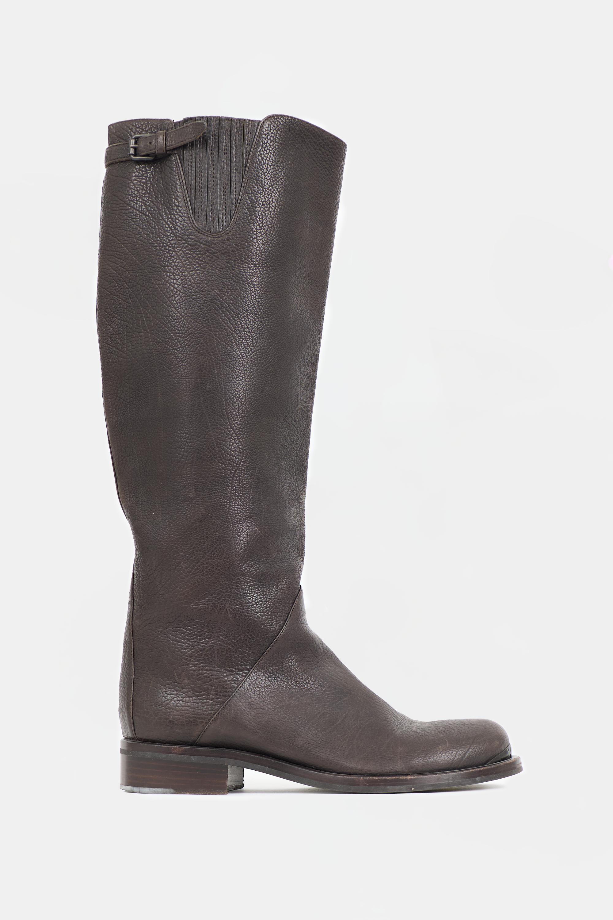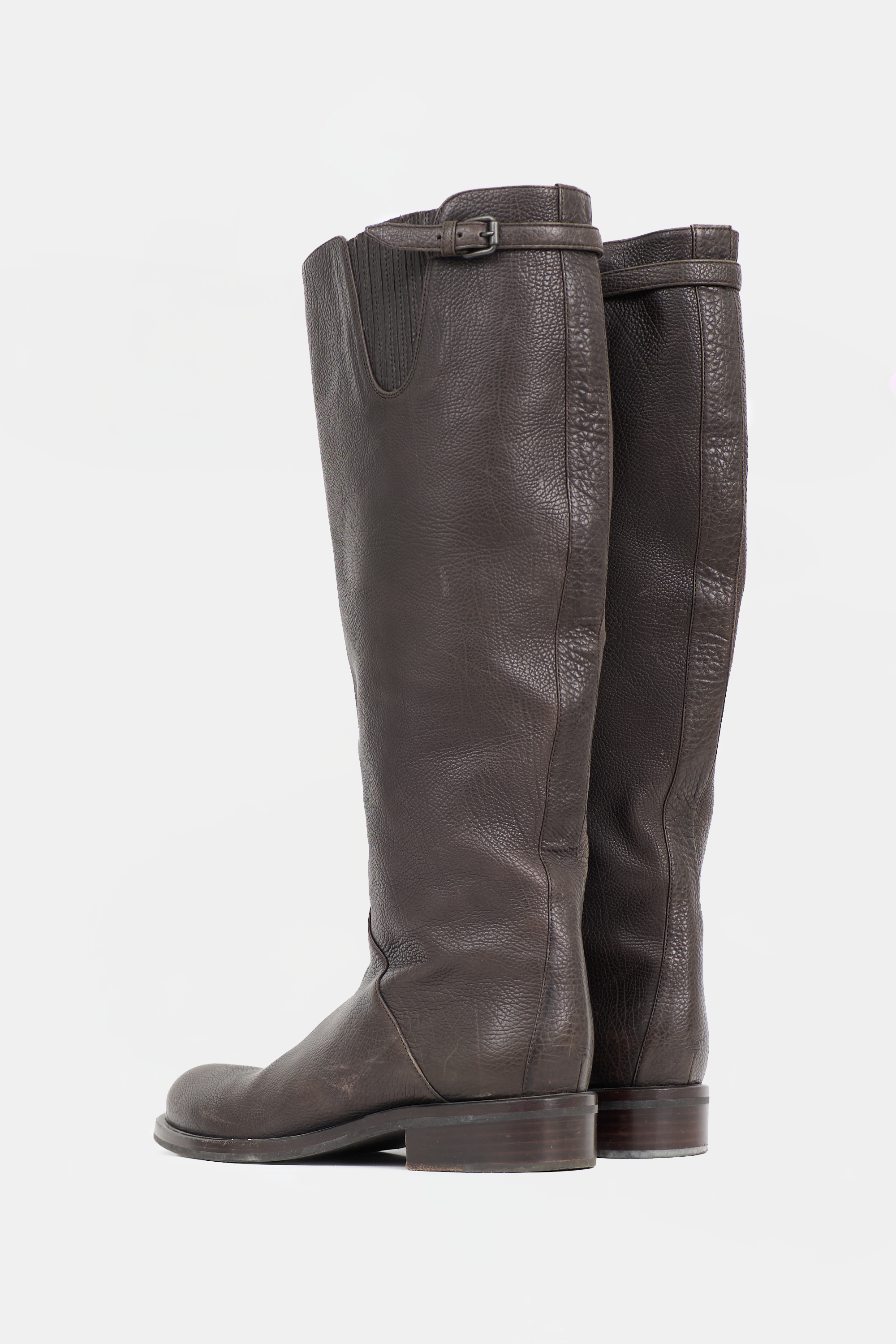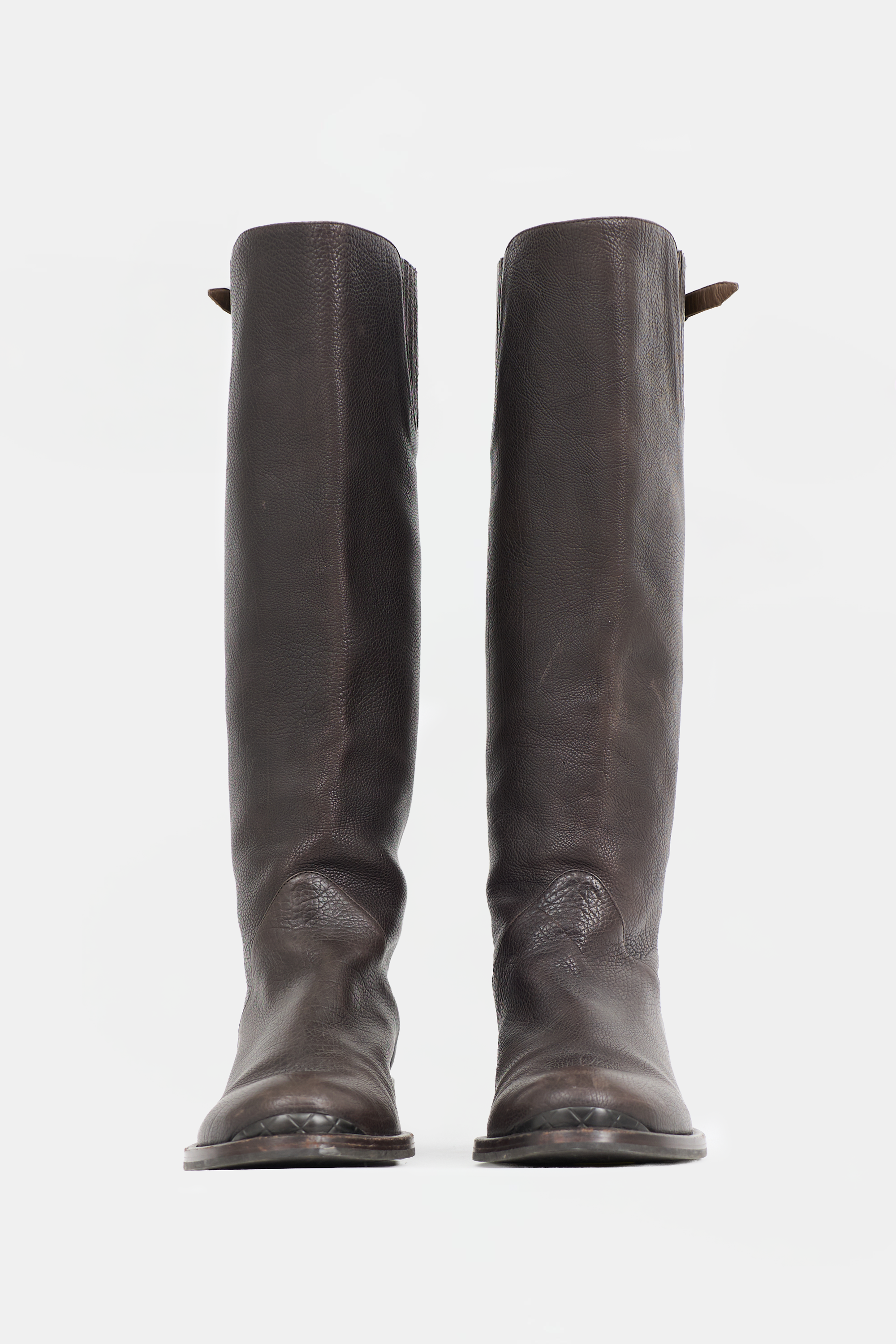 Pre-owned Bottega Veneta brown leather knee high boots featuring rounded toe, covered elastic panel at outer shaft, buckle detail at back topline, and tonal stacked heel.