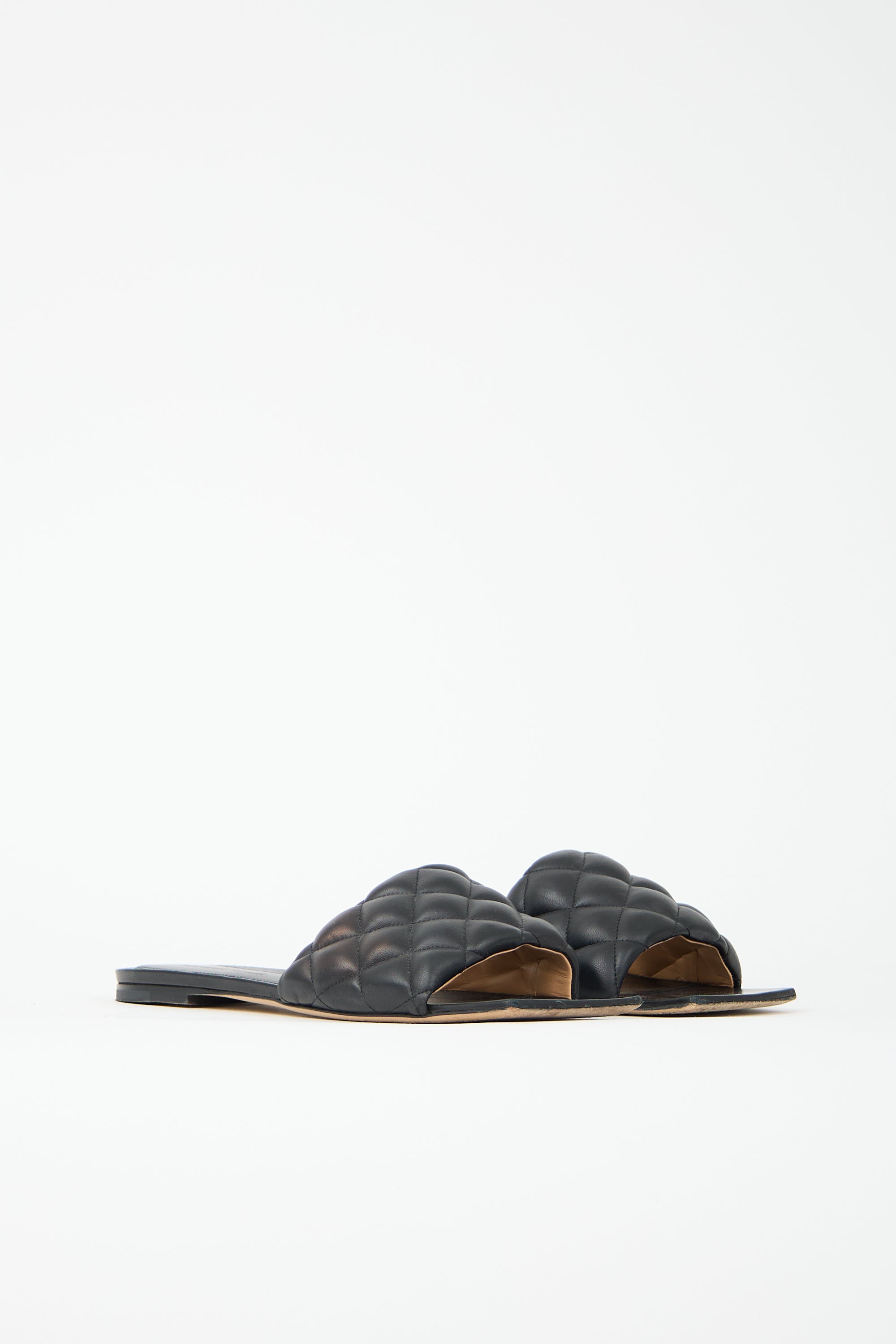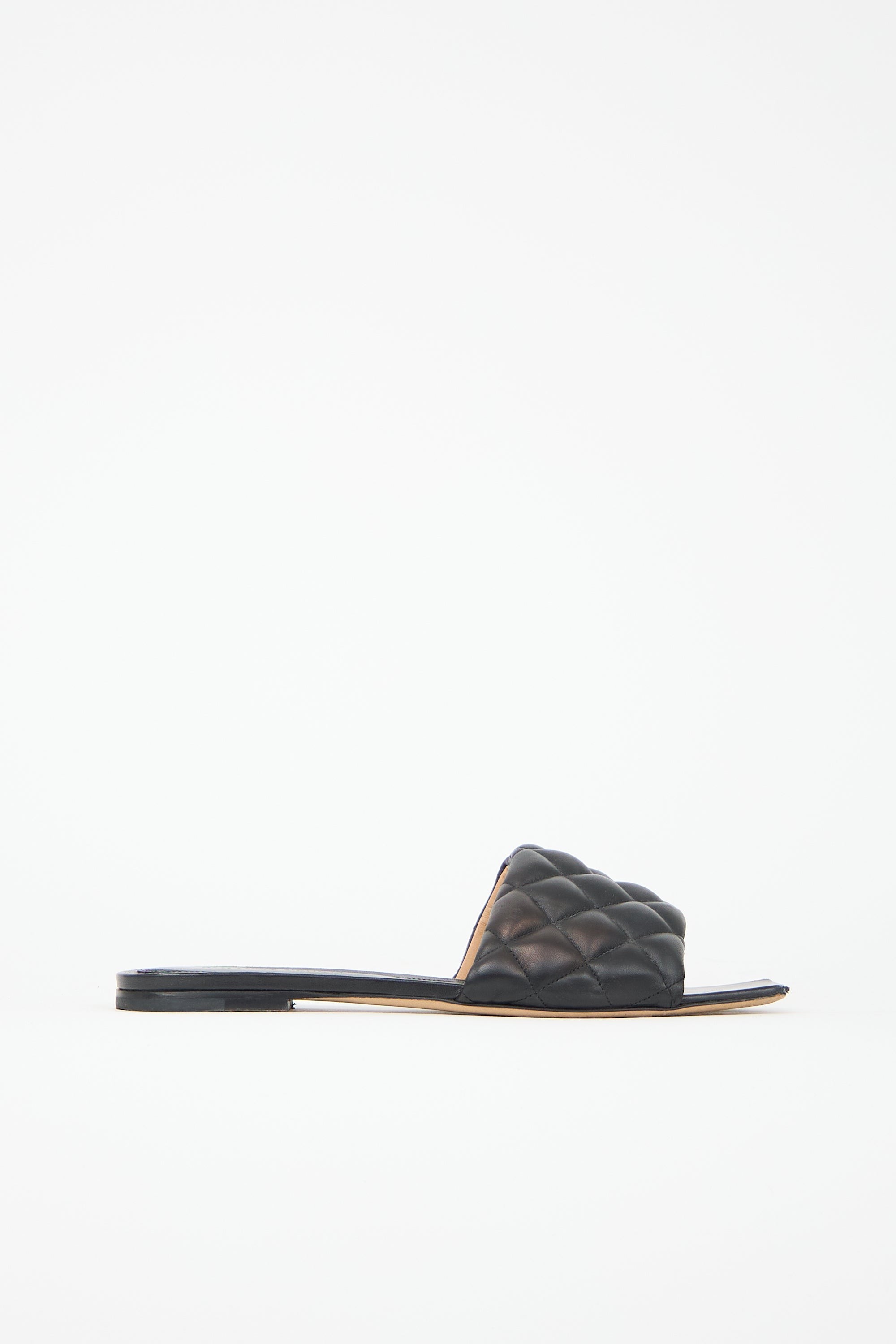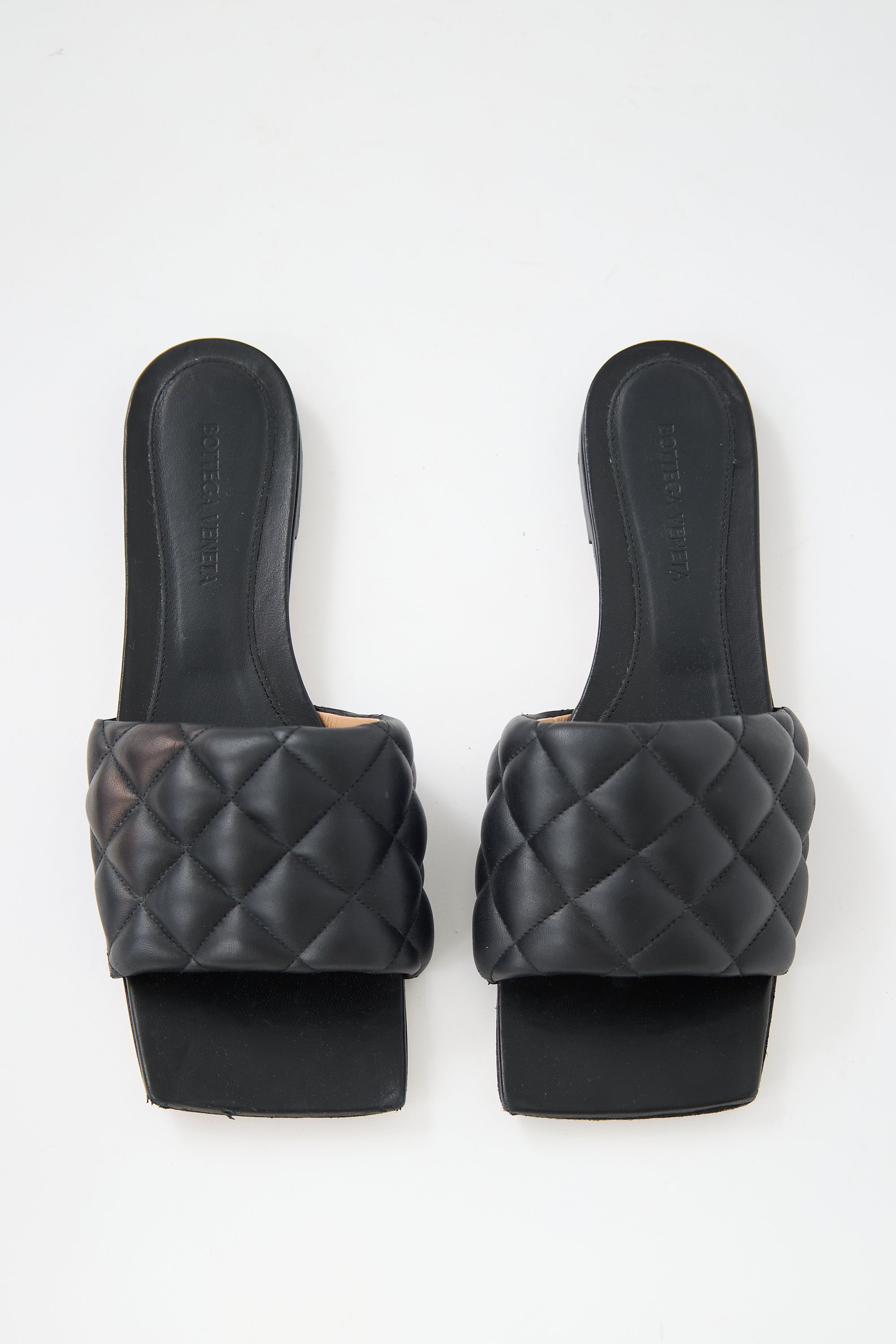 Pre-owned Bottega Veneta black leather Padded Flat Sandals featuring open square toe and diamond quilted vamp.