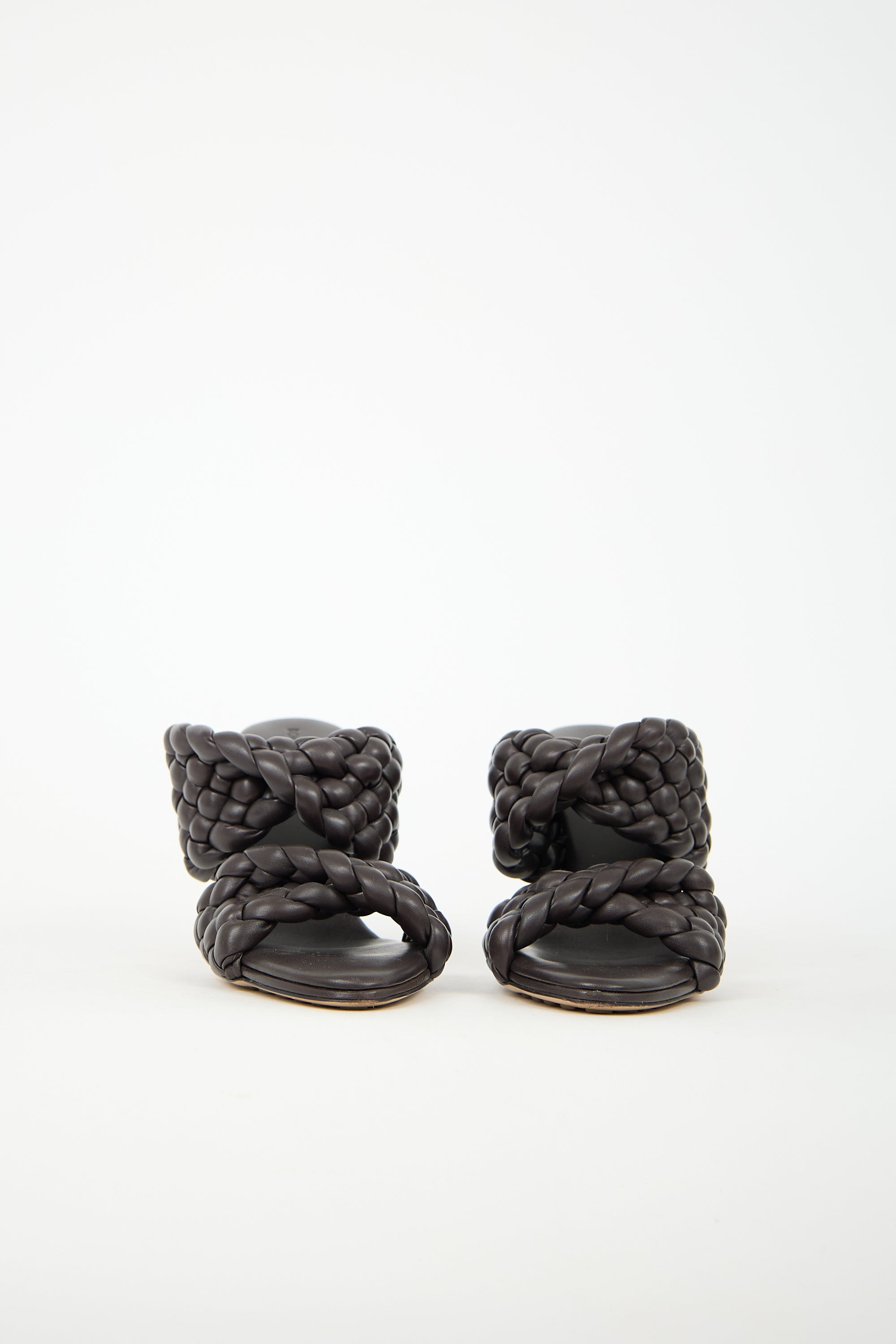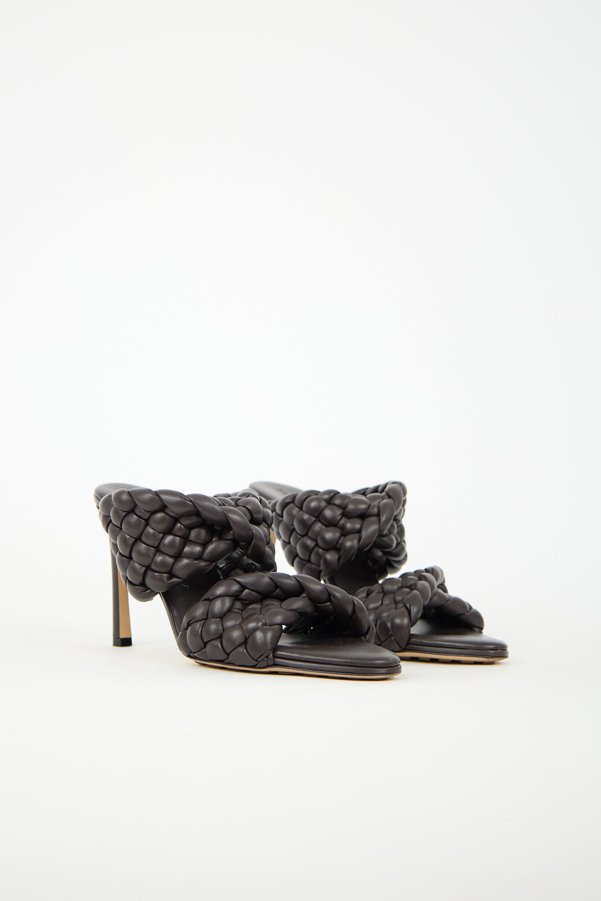 Pre-owned Bottega Veneta brown leather Curve sandals featuring almond toe, padded upper, signature Intrecciato woven straps with twist detail, and covered stiletto heel.