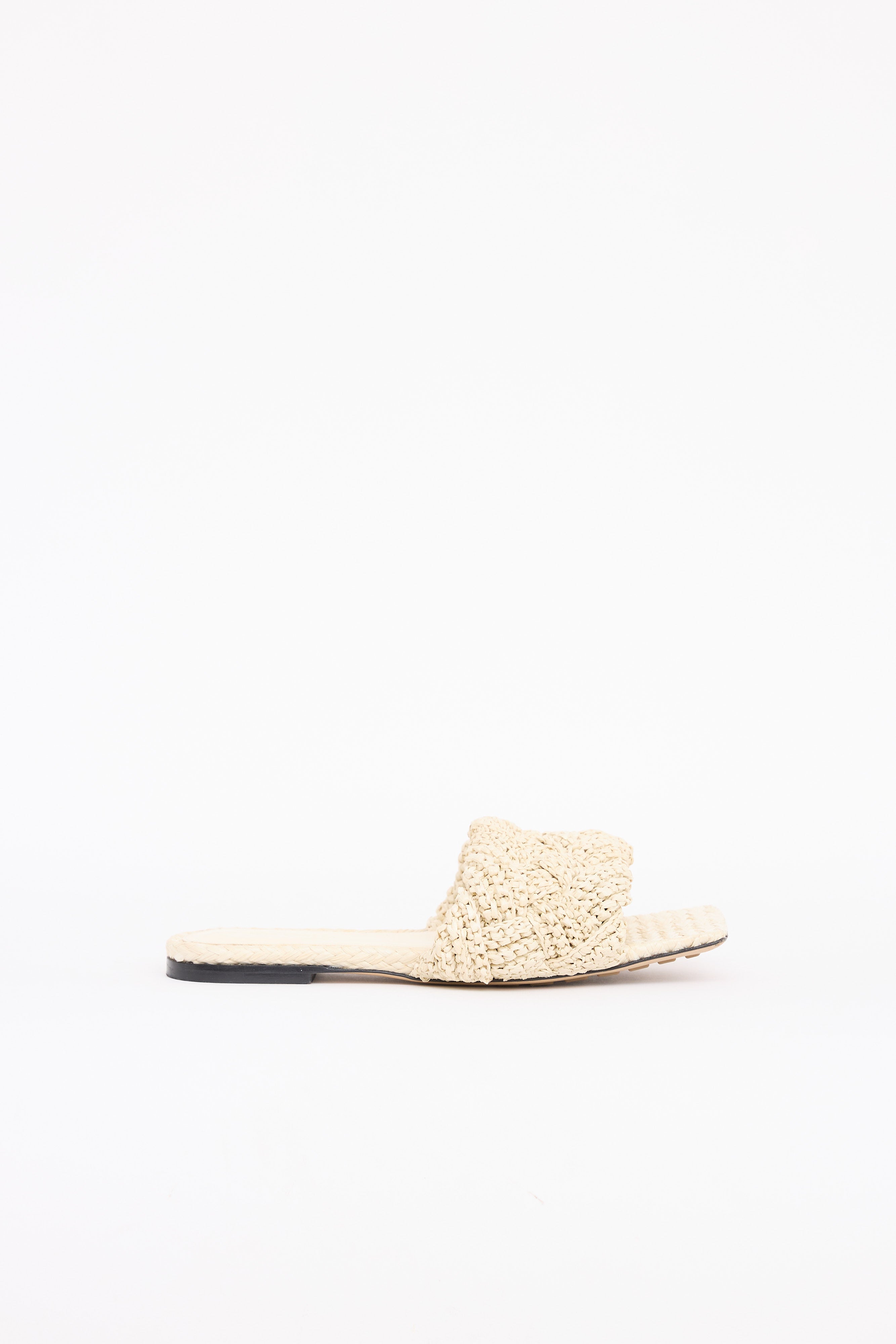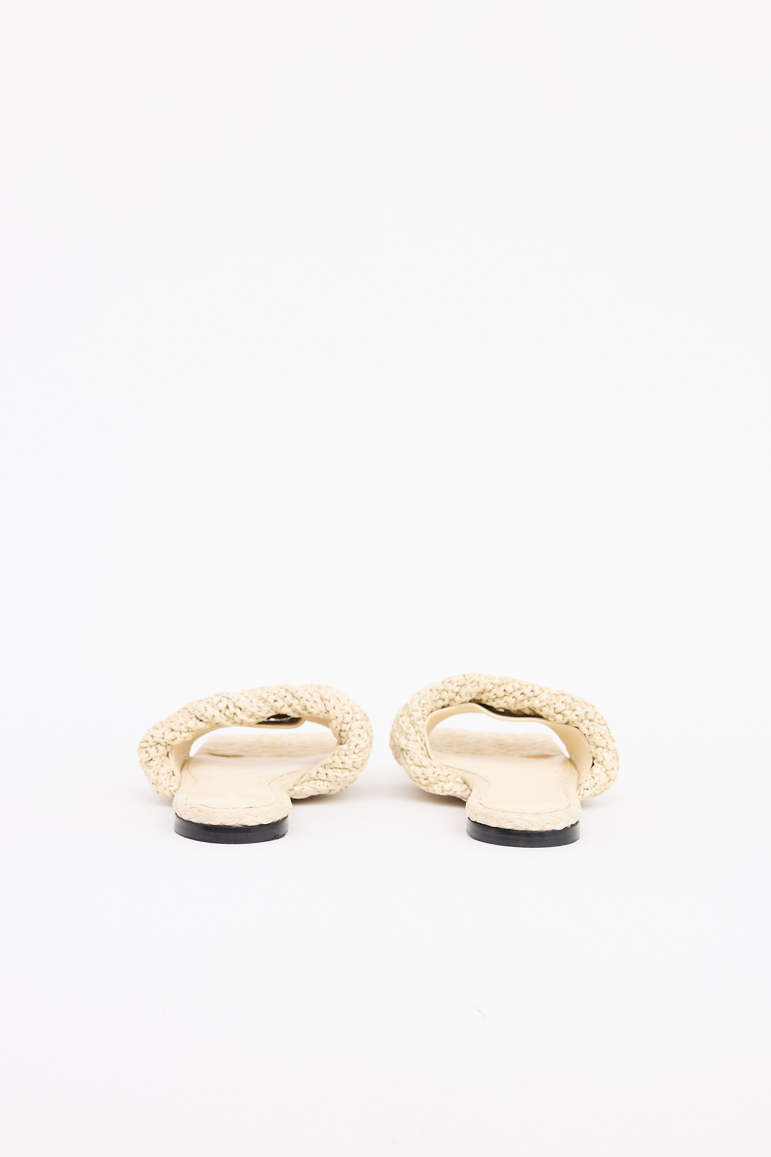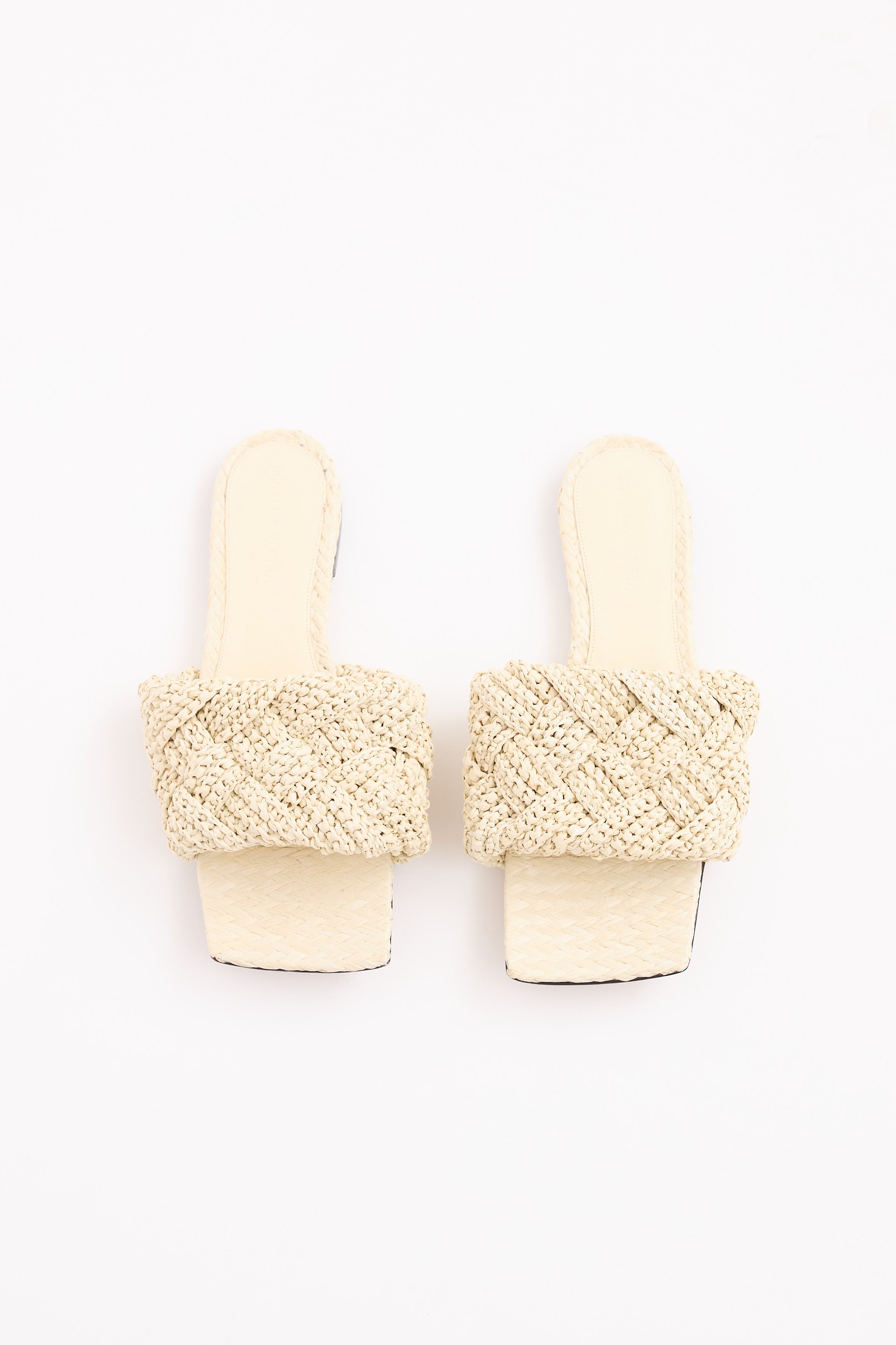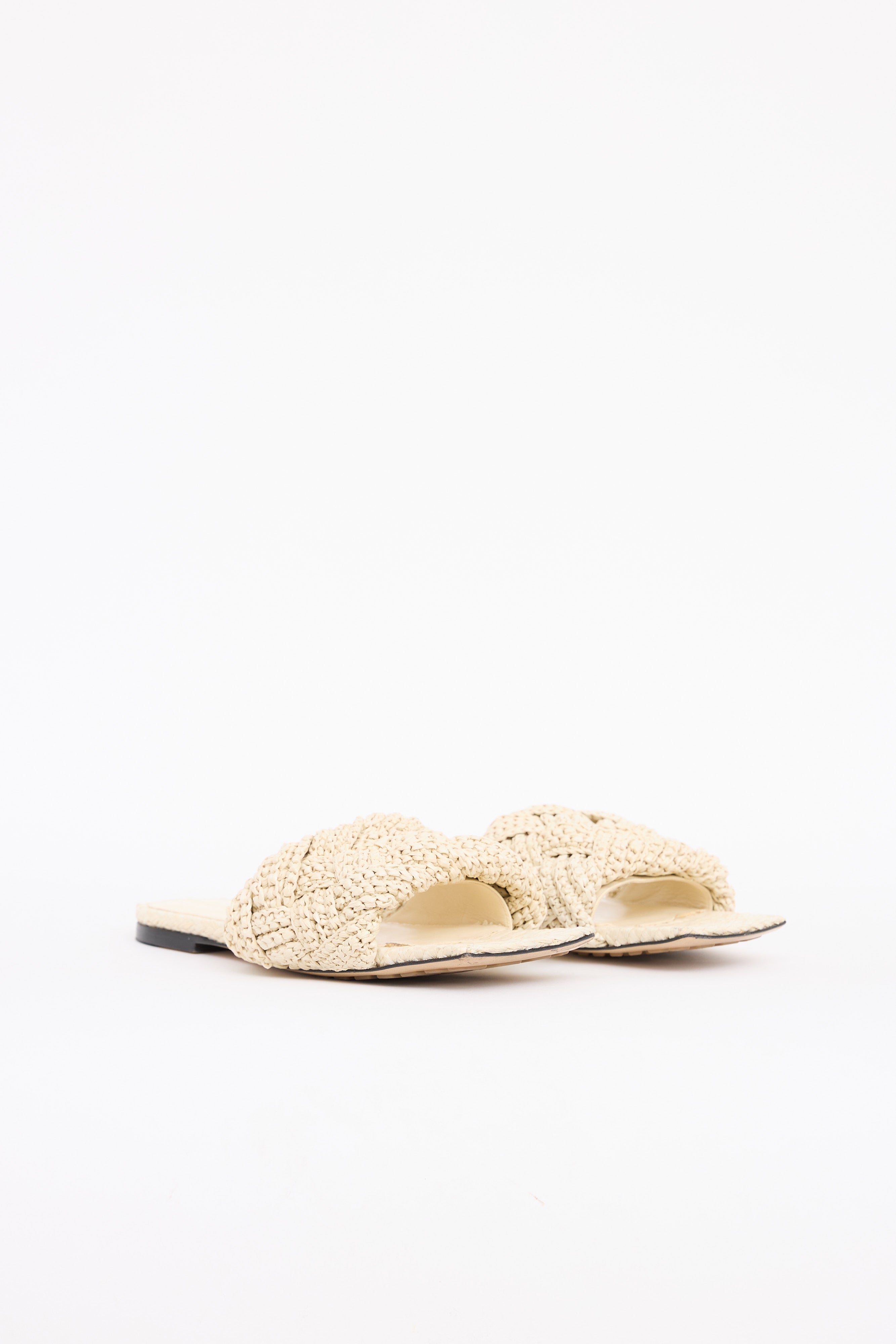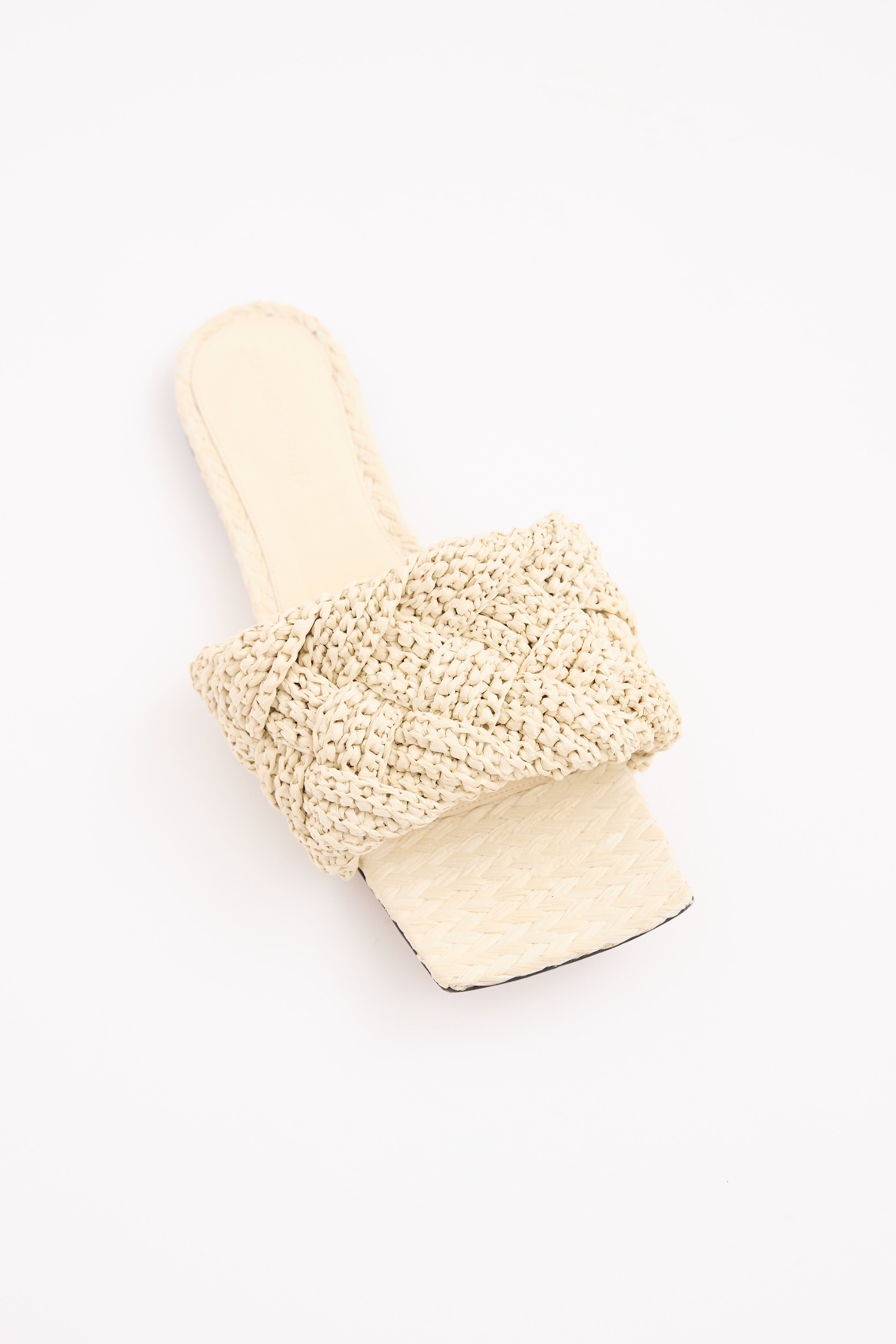 Pre-owned Bottega Veneta cream Raffia sandals featuring square toe, woven strap on upper and insole and treaded outsole.