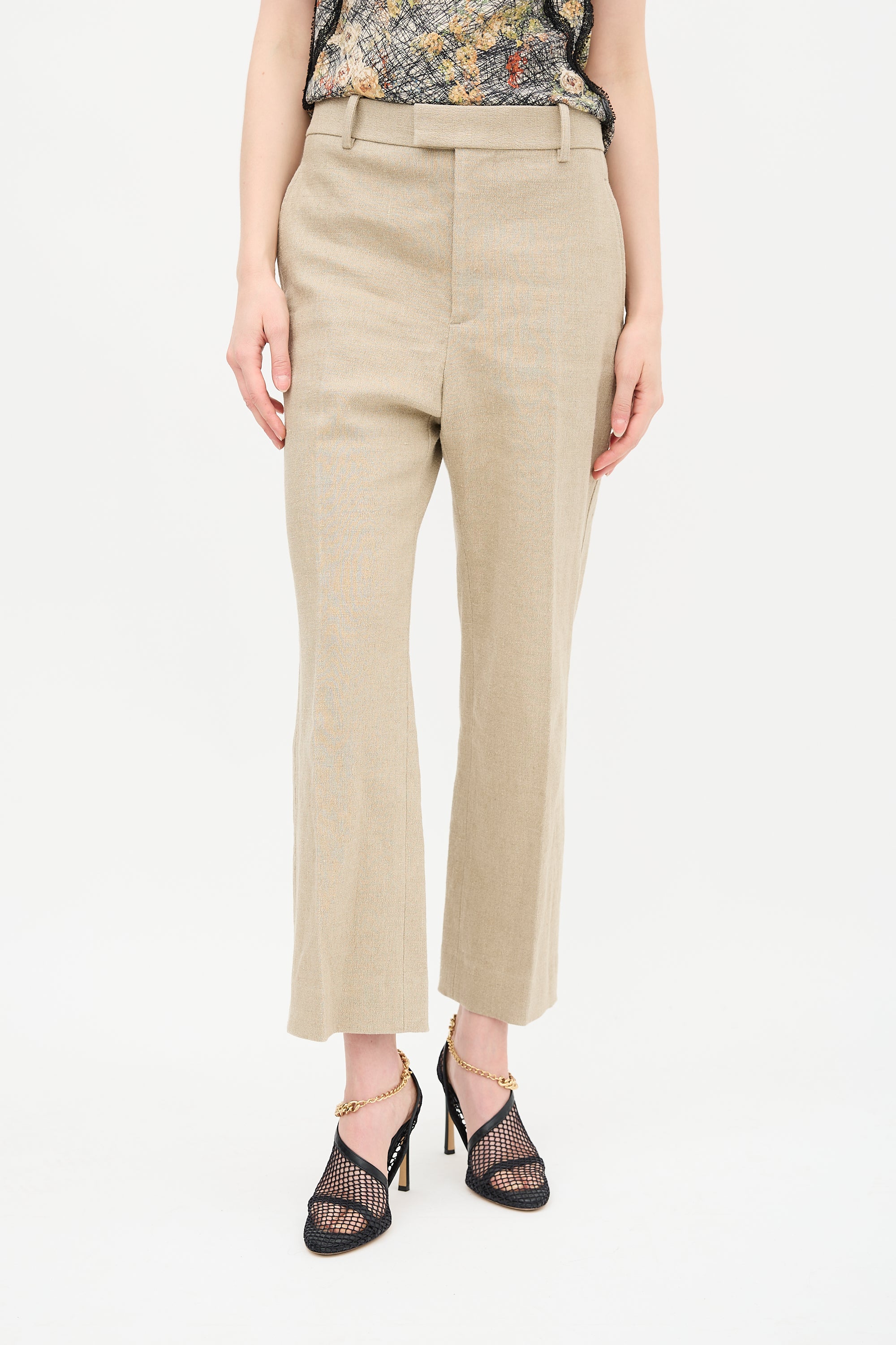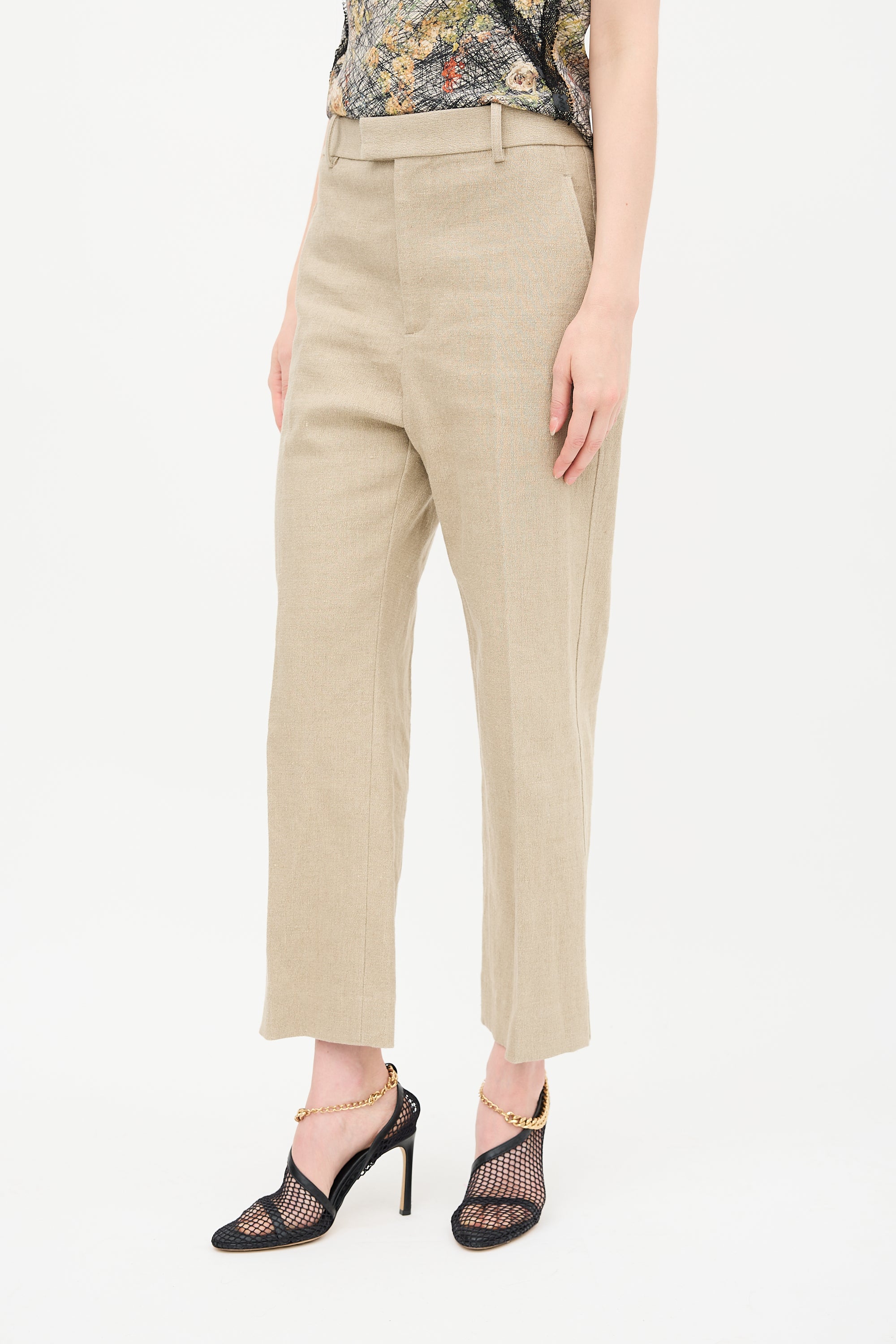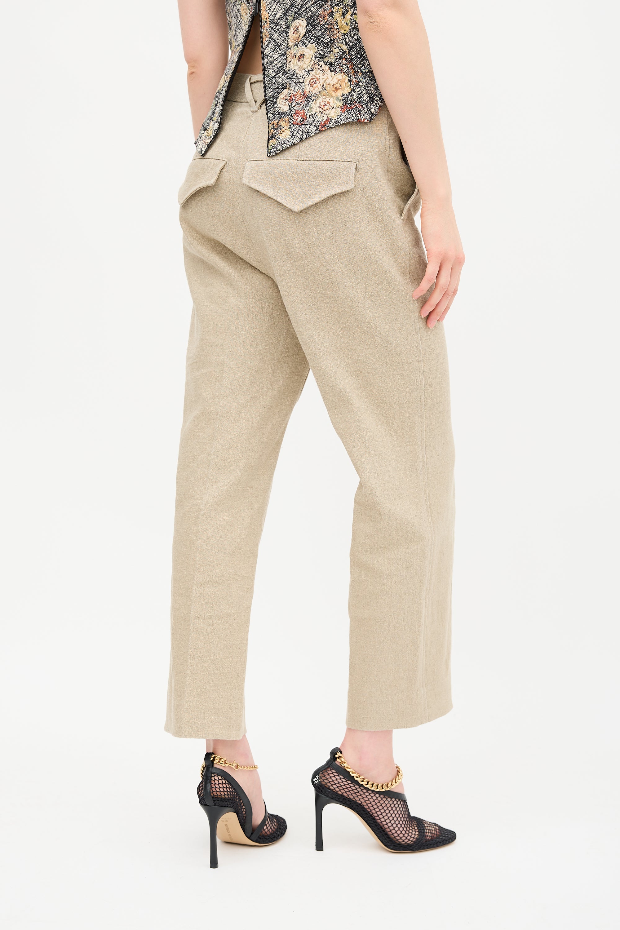Pre-owned Bottega Veneta Spring/Summer 2021 Salon 01 beige linen blend trousers featuring high waist, back triangle belt loop detail, straight leg, four pocket styling, and zip fly.