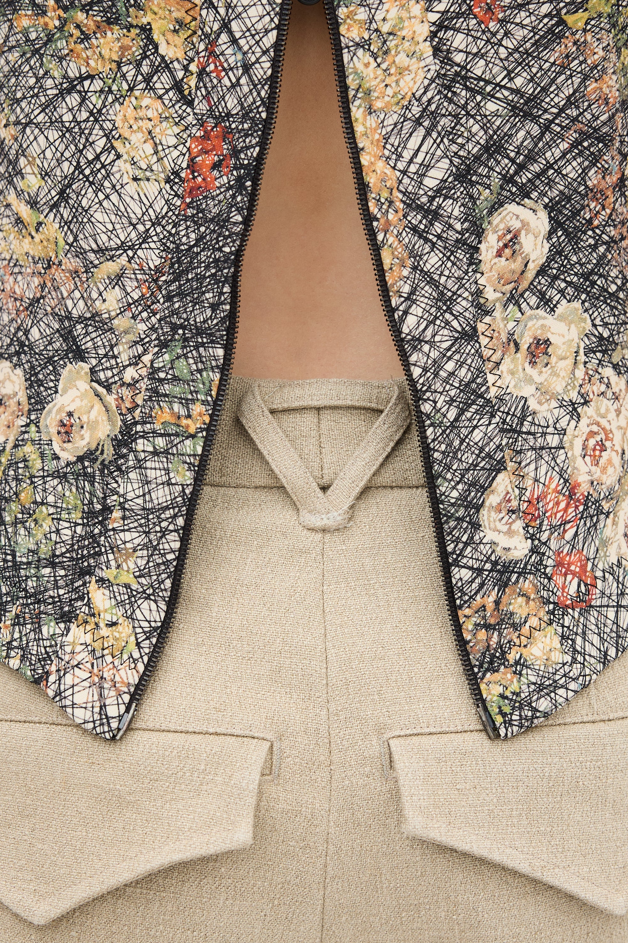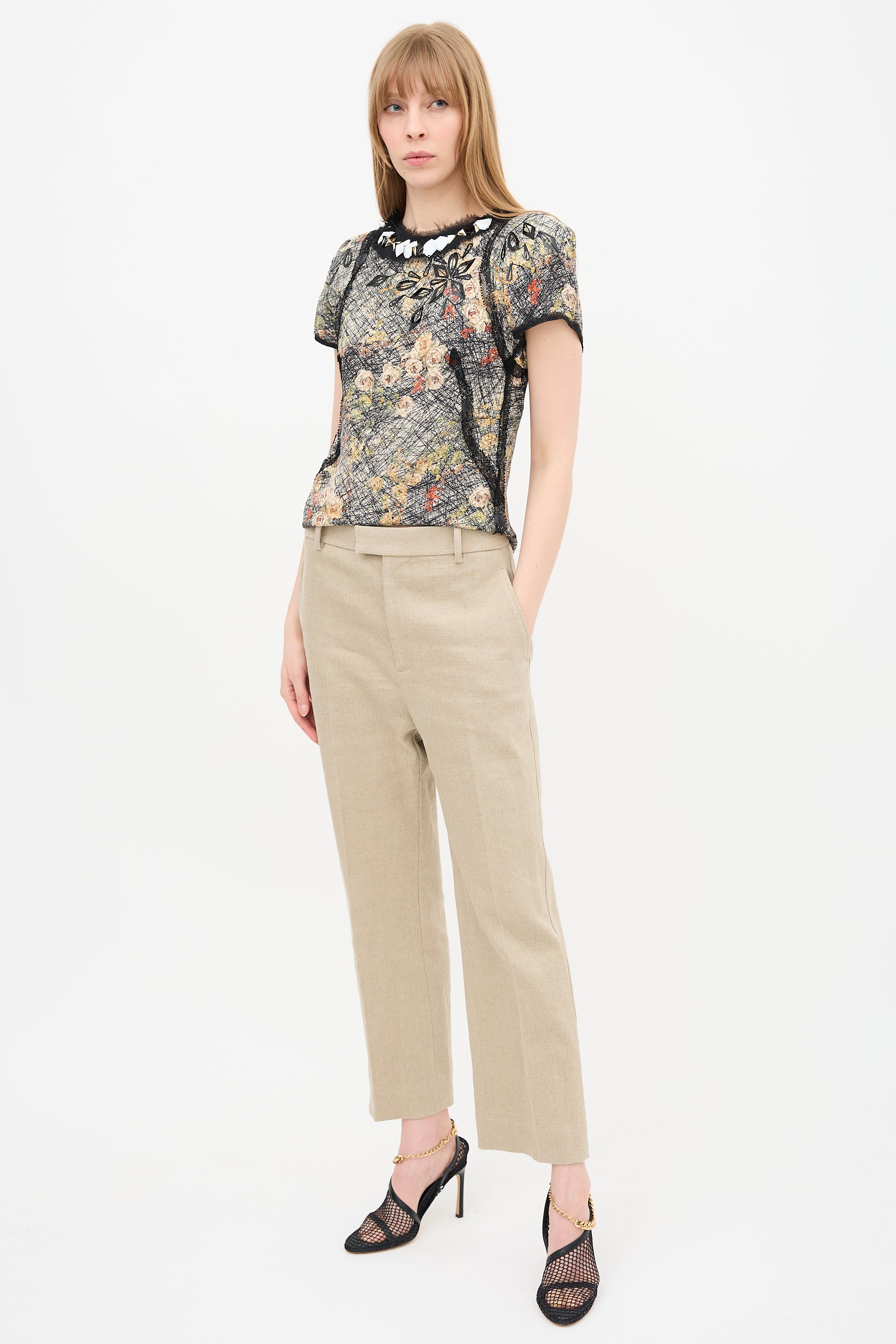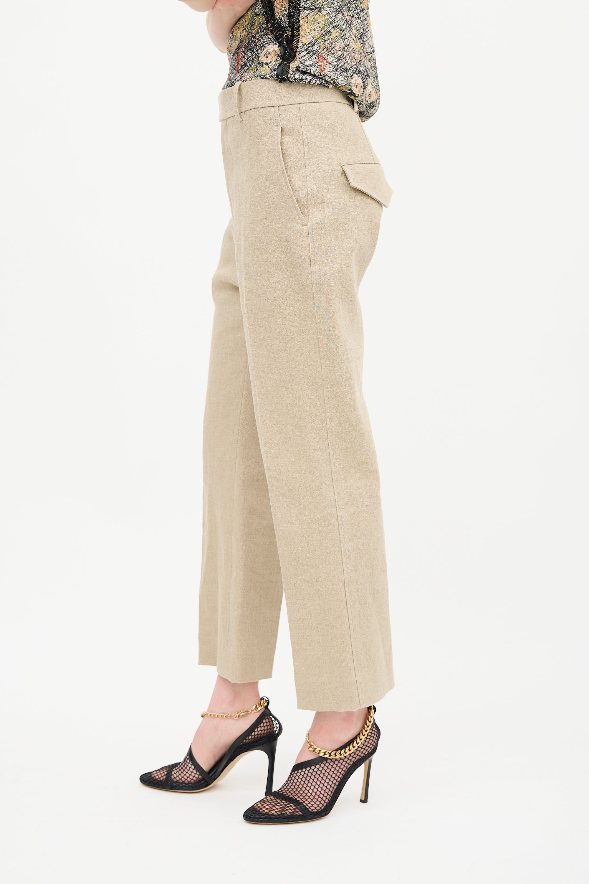 Pre-owned Bottega Veneta Spring/Summer 2021 Salon 01 beige linen blend trousers featuring high waist, back triangle belt loop detail, straight leg, four pocket styling, and zip fly.